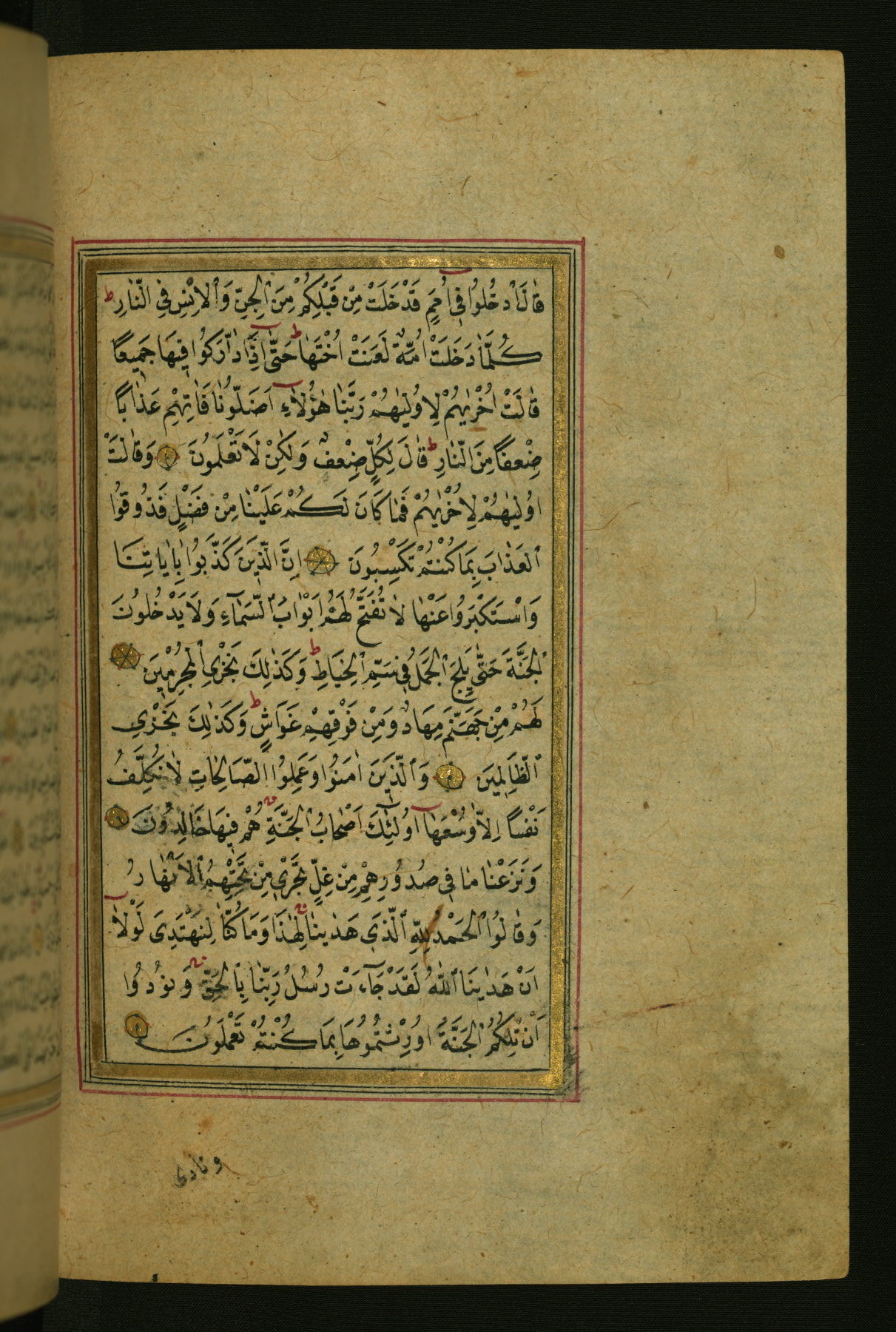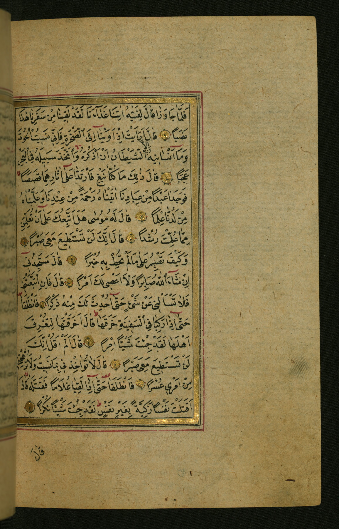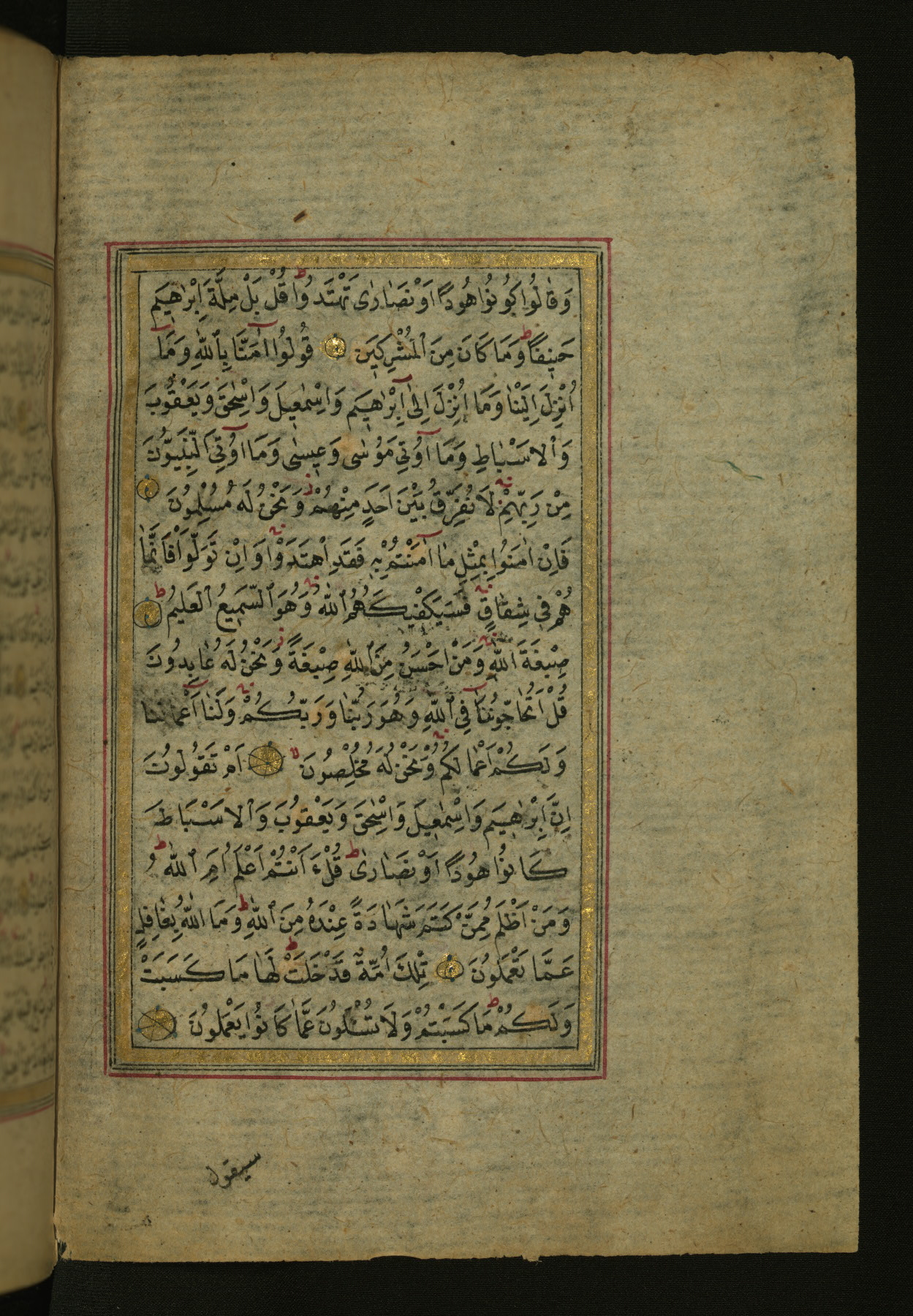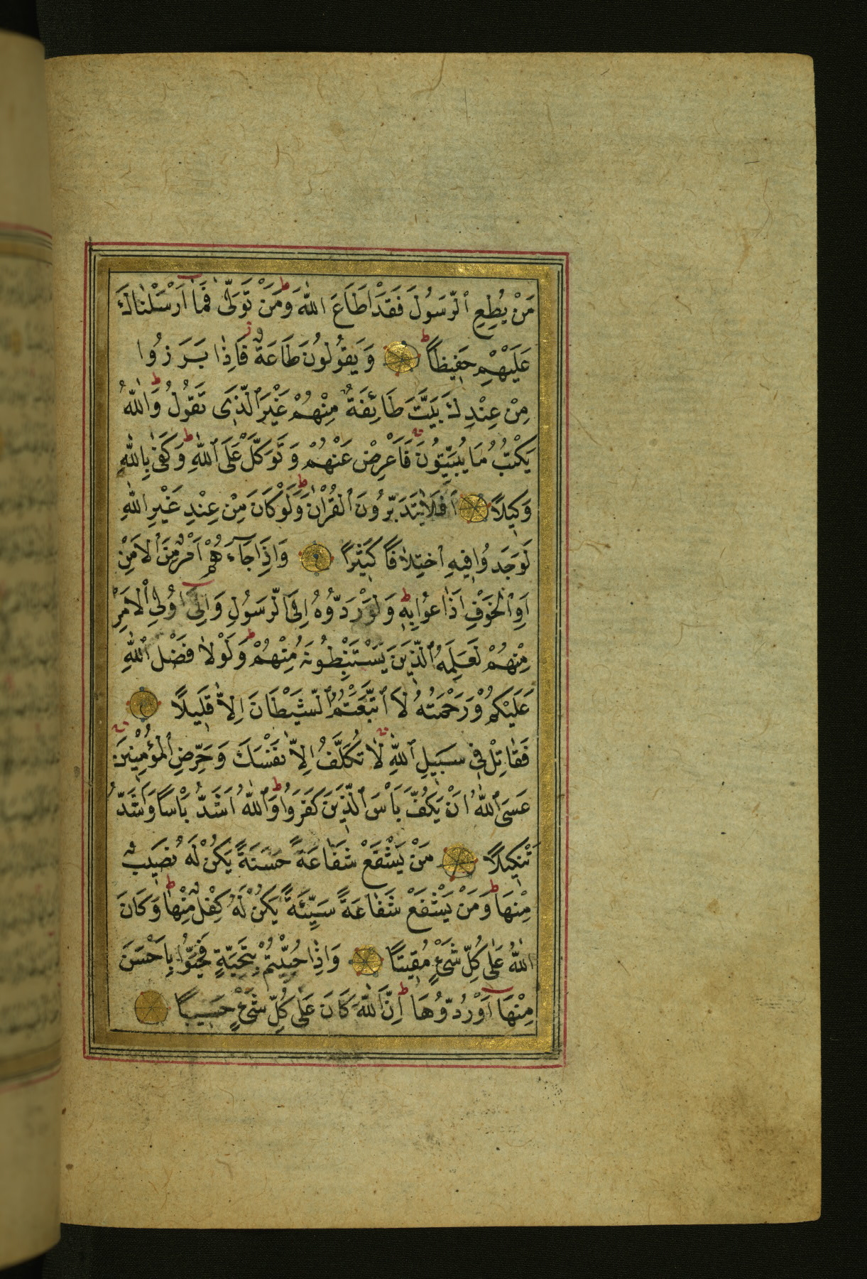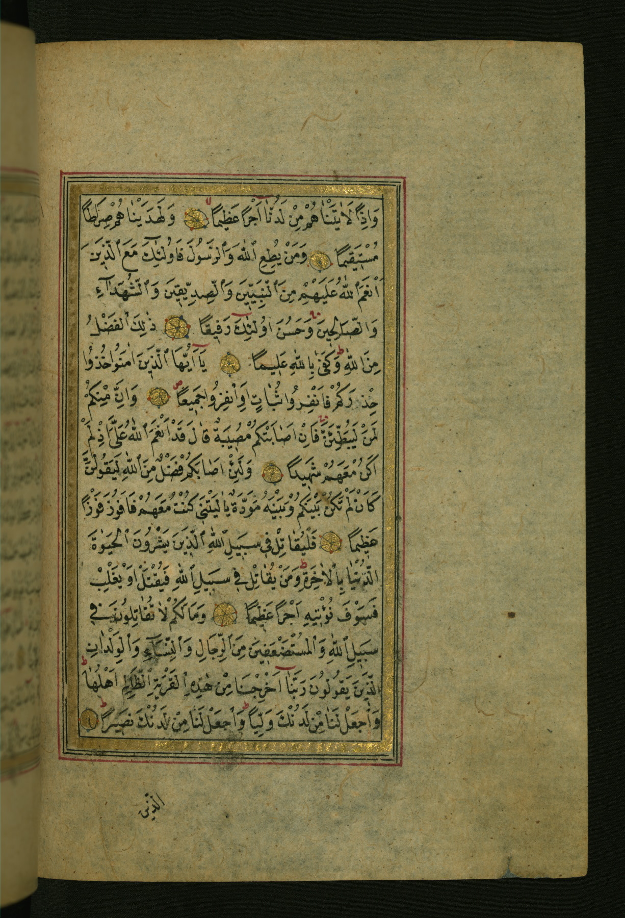 This small, illuminated single-volume copy of the Qurʾan was produced in Ottoman Turkey in 1282 AH / 1865-6 CE by Muḥammad ibn Muṣṭafá Izmīrī, a pupil of al-Rudūsī. The colophon in ijāzah script indicates that the present codex is the twenty-first copy executed by him (fol. 304b). The manuscript opens with an illuminated double-page incipit with the verses of chapters 1 (Sūrat al-fātiḥah) and 2 (Sūrat al-baqarah) (fols. 1b-2a). The text is written in naskh script in black ink with reading marks in red. Verses are separated by illuminated discs with colored dots and chapter headings are in riqāʿ script in white ink. Polychrome medallions in the margins indicate textual divisions and prostration. The binding of black leather is contemporary with the manuscript and decorated with a tooled and gold-painted geometric design enclosed by gold frames on the upper and lower boards.