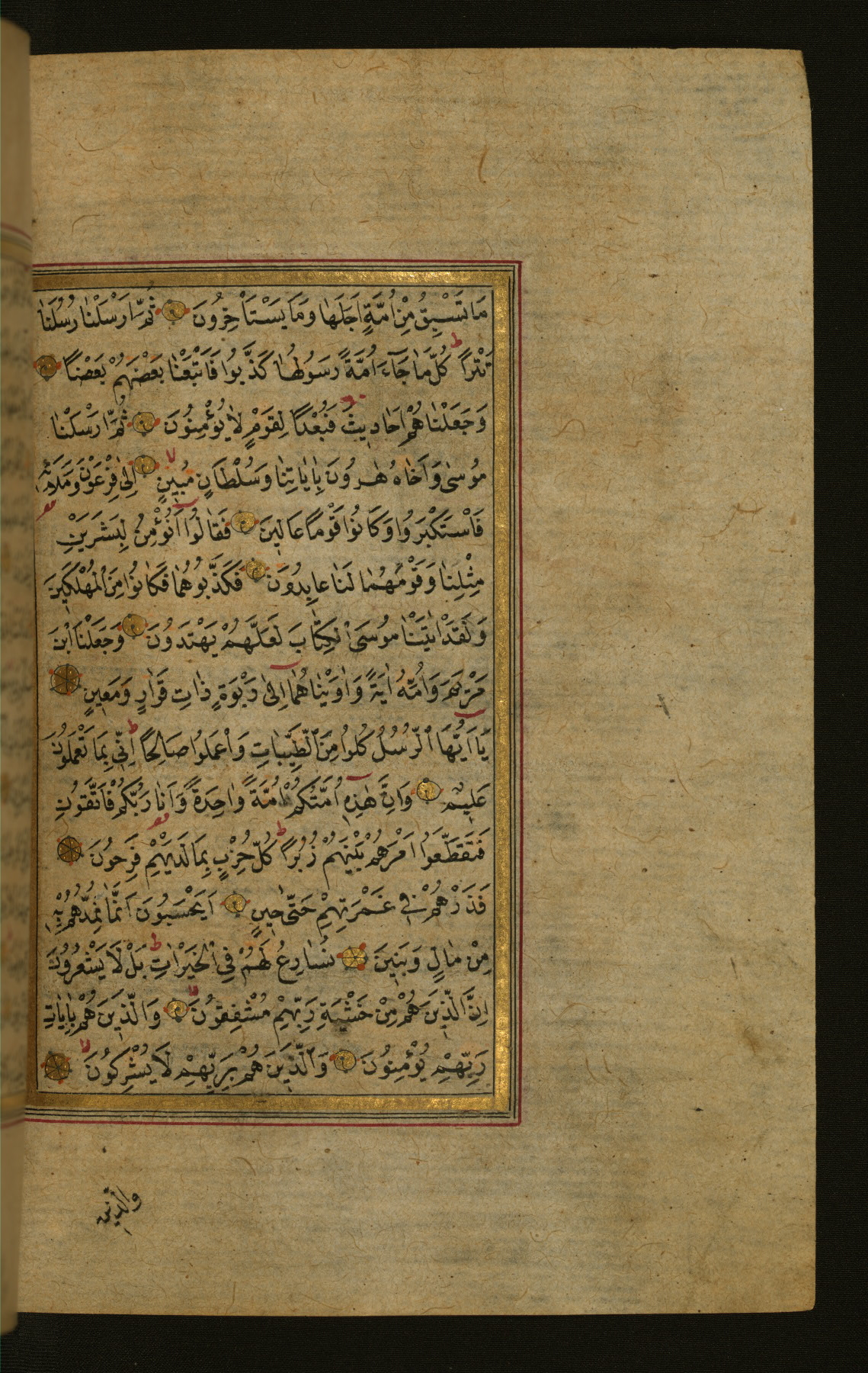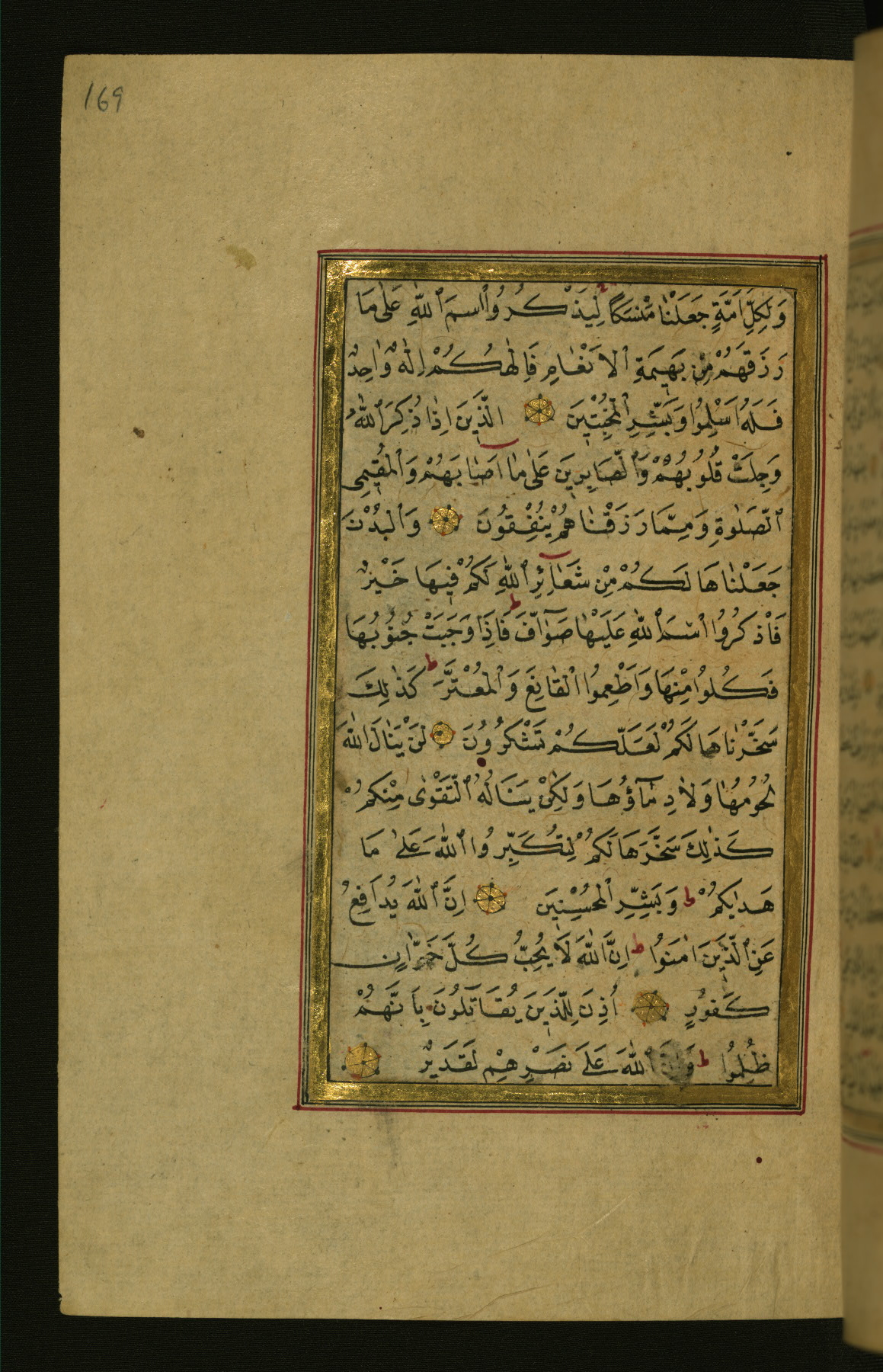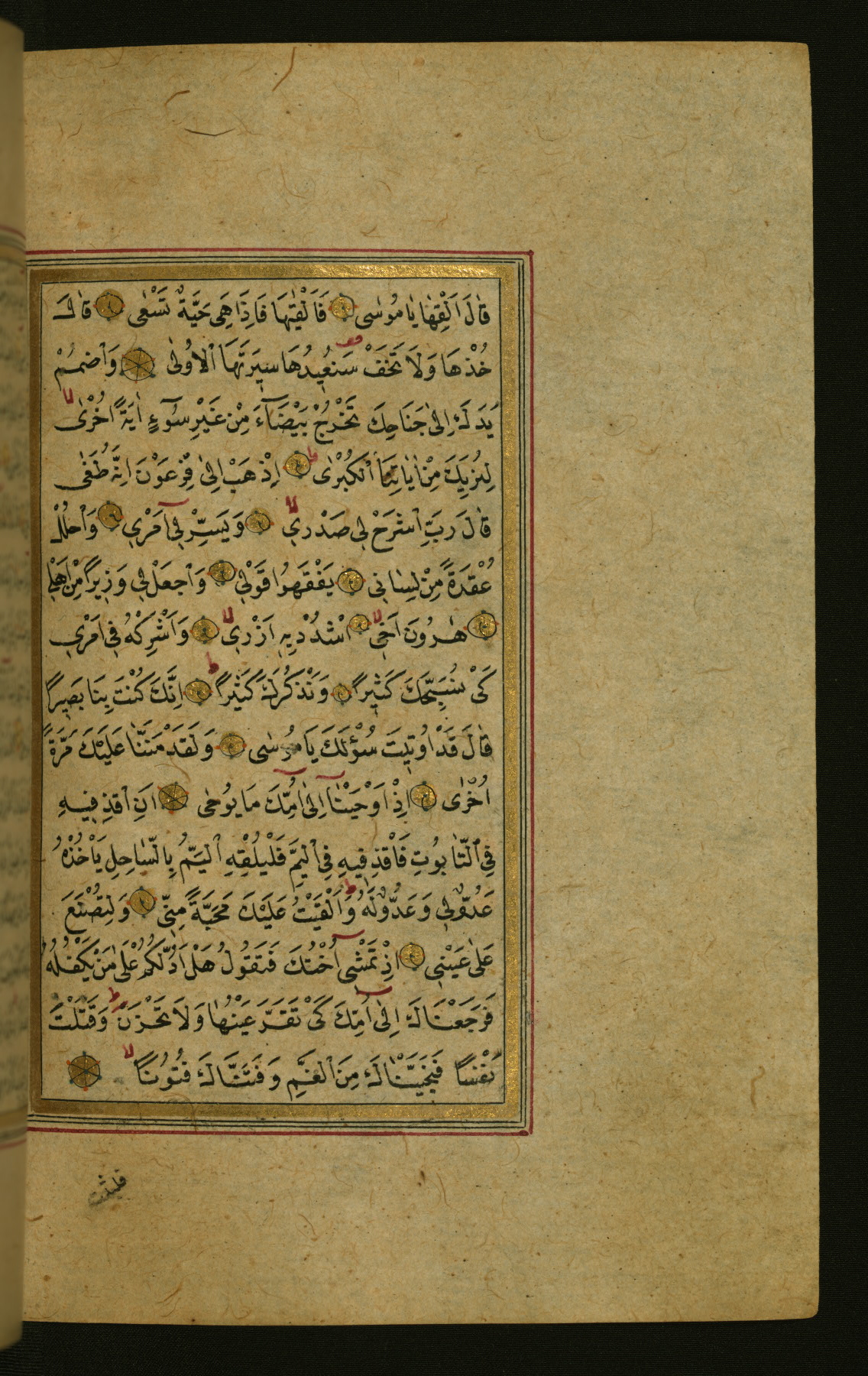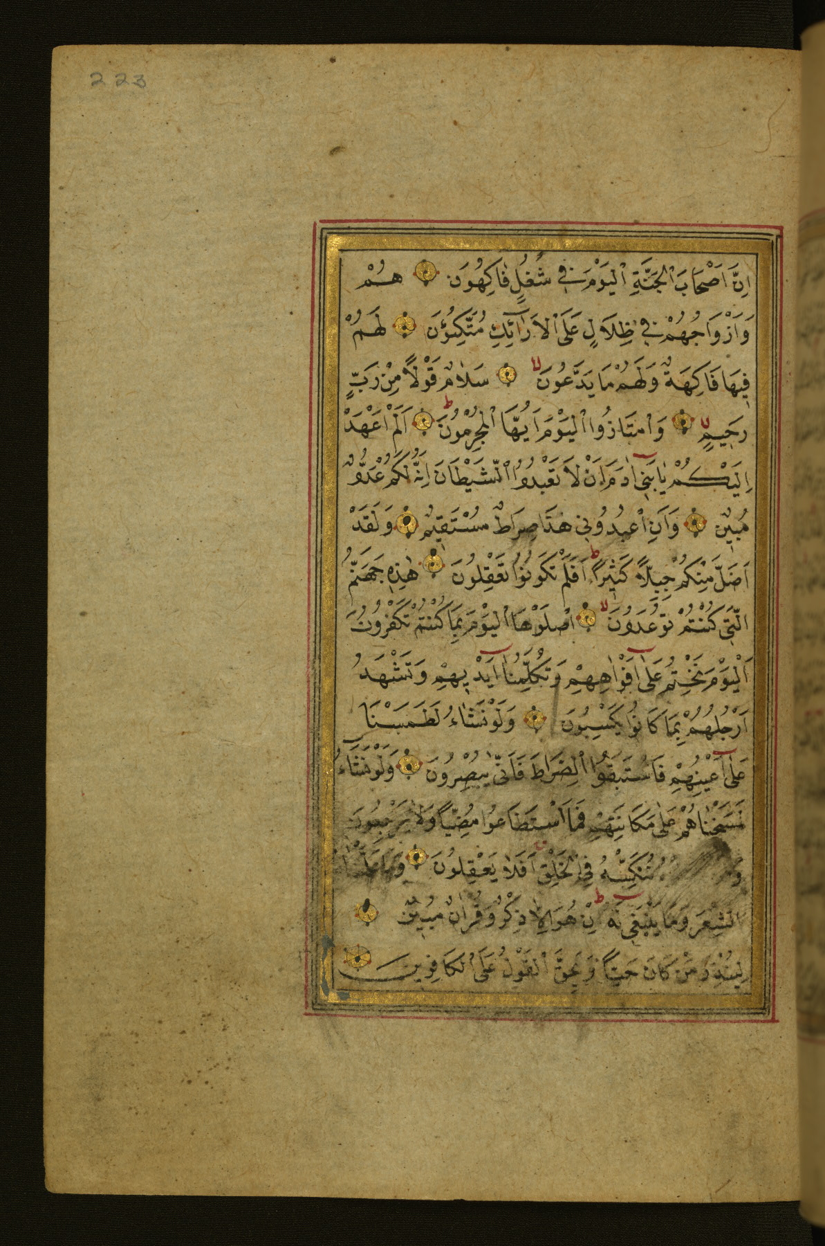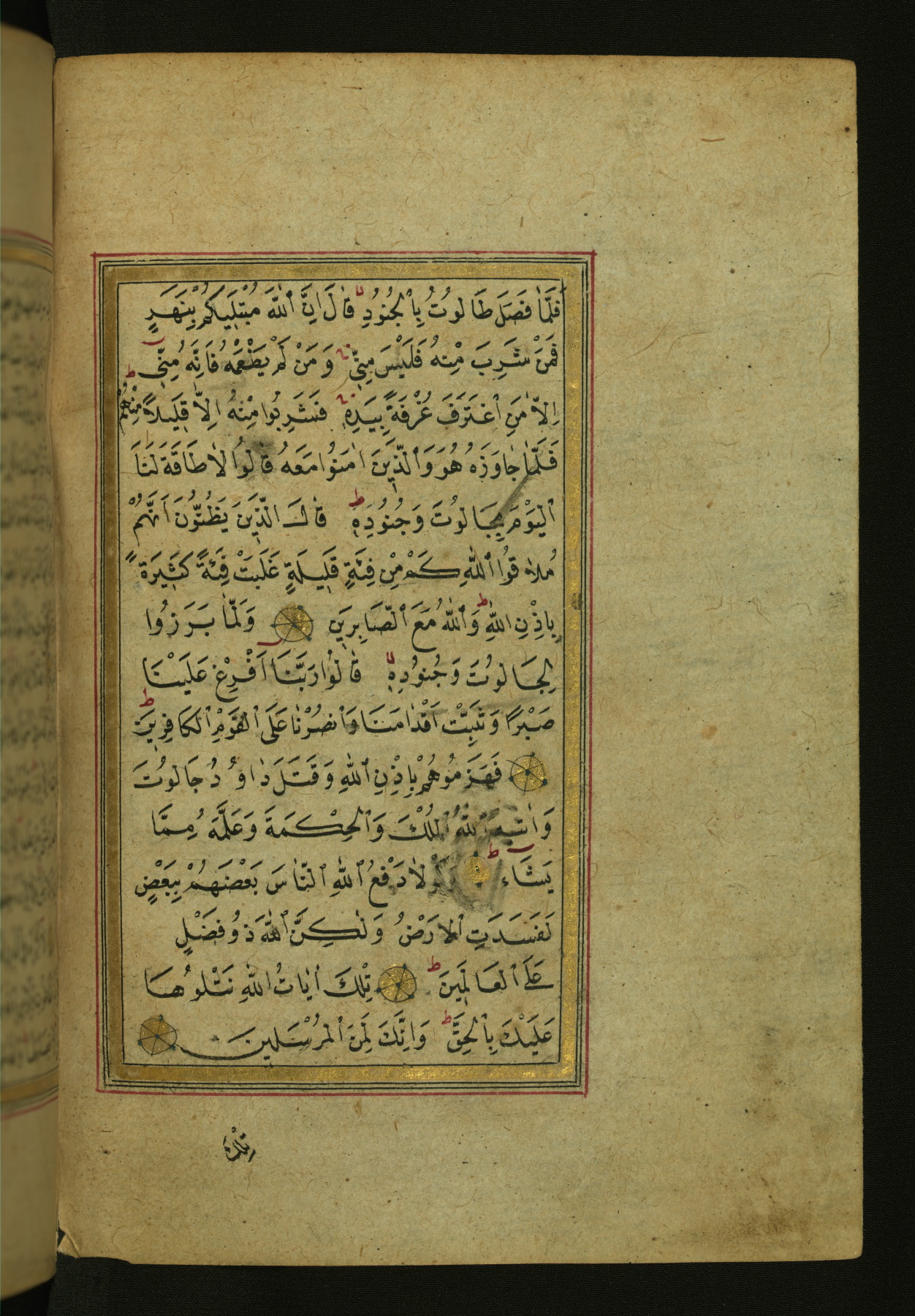 This small, illuminated single-volume copy of the Qurʾan was produced in Ottoman Turkey in 1282 AH / 1865-6 CE by Muḥammad ibn Muṣṭafá Izmīrī, a pupil of al-Rudūsī. The colophon in ijāzah script indicates that the present codex is the twenty-first copy executed by him (fol. 304b). The manuscript opens with an illuminated double-page incipit with the verses of chapters 1 (Sūrat al-fātiḥah) and 2 (Sūrat al-baqarah) (fols. 1b-2a). The text is written in naskh script in black ink with reading marks in red. Verses are separated by illuminated discs with colored dots and chapter headings are in riqāʿ script in white ink. Polychrome medallions in the margins indicate textual divisions and prostration. The binding of black leather is contemporary with the manuscript and decorated with a tooled and gold-painted geometric design enclosed by gold frames on the upper and lower boards.