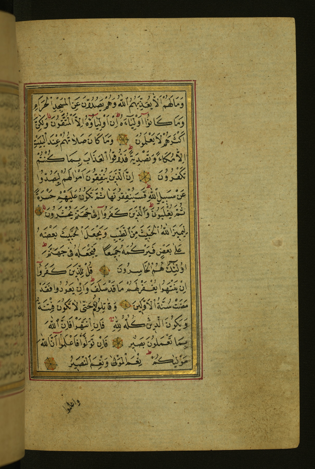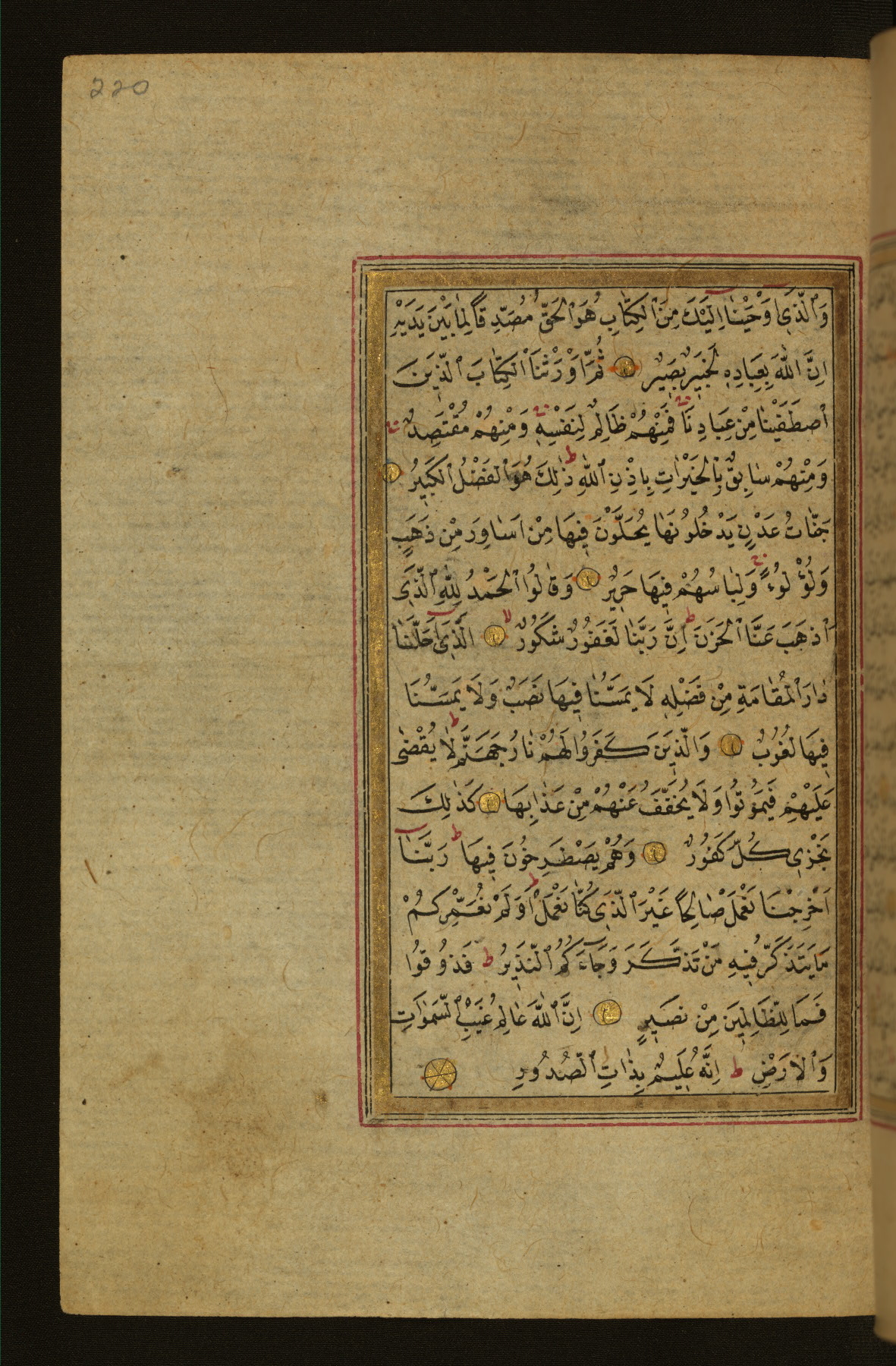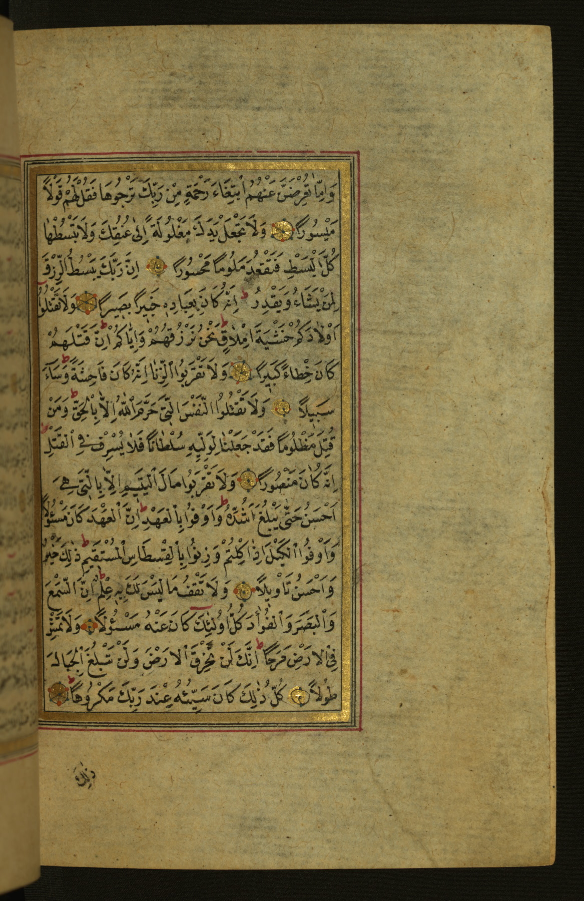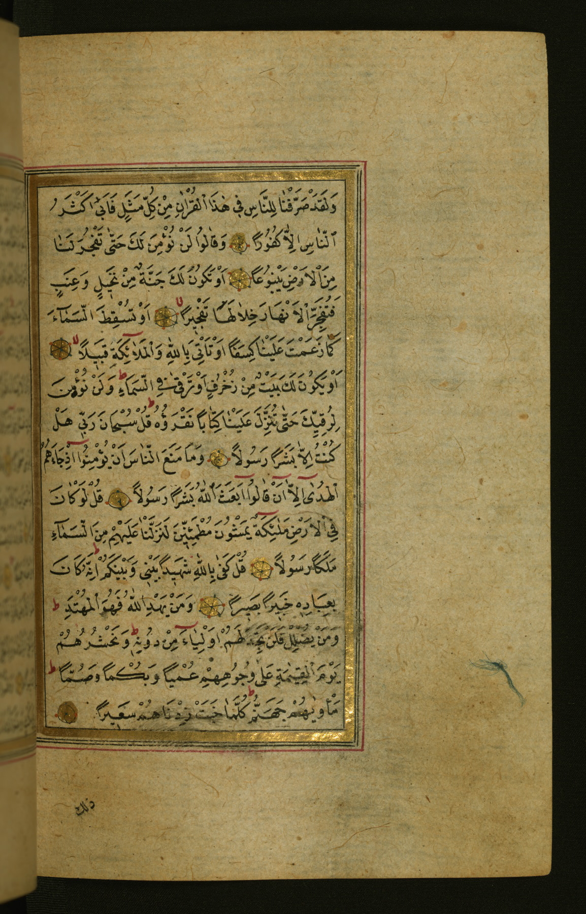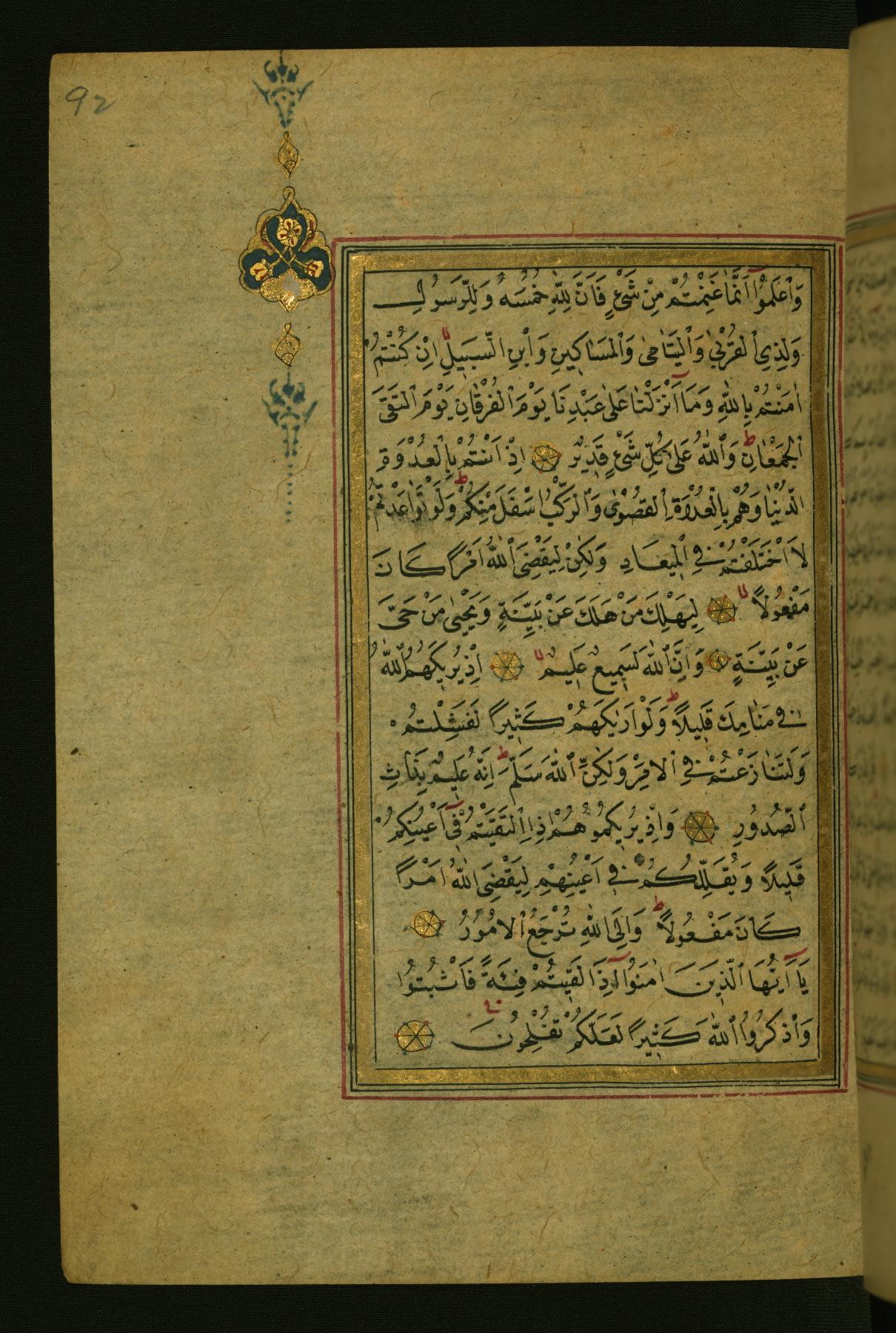 This small, illuminated single-volume copy of the Qurʾan was produced in Ottoman Turkey in 1282 AH / 1865-6 CE by Muḥammad ibn Muṣṭafá Izmīrī, a pupil of al-Rudūsī. The colophon in ijāzah script indicates that the present codex is the twenty-first copy executed by him (fol. 304b). The manuscript opens with an illuminated double-page incipit with the verses of chapters 1 (Sūrat al-fātiḥah) and 2 (Sūrat al-baqarah) (fols. 1b-2a). The text is written in naskh script in black ink with reading marks in red. Verses are separated by illuminated discs with colored dots and chapter headings are in riqāʿ script in white ink. Polychrome medallions in the margins indicate textual divisions and prostration. The binding of black leather is contemporary with the manuscript and decorated with a tooled and gold-painted geometric design enclosed by gold frames on the upper and lower boards.