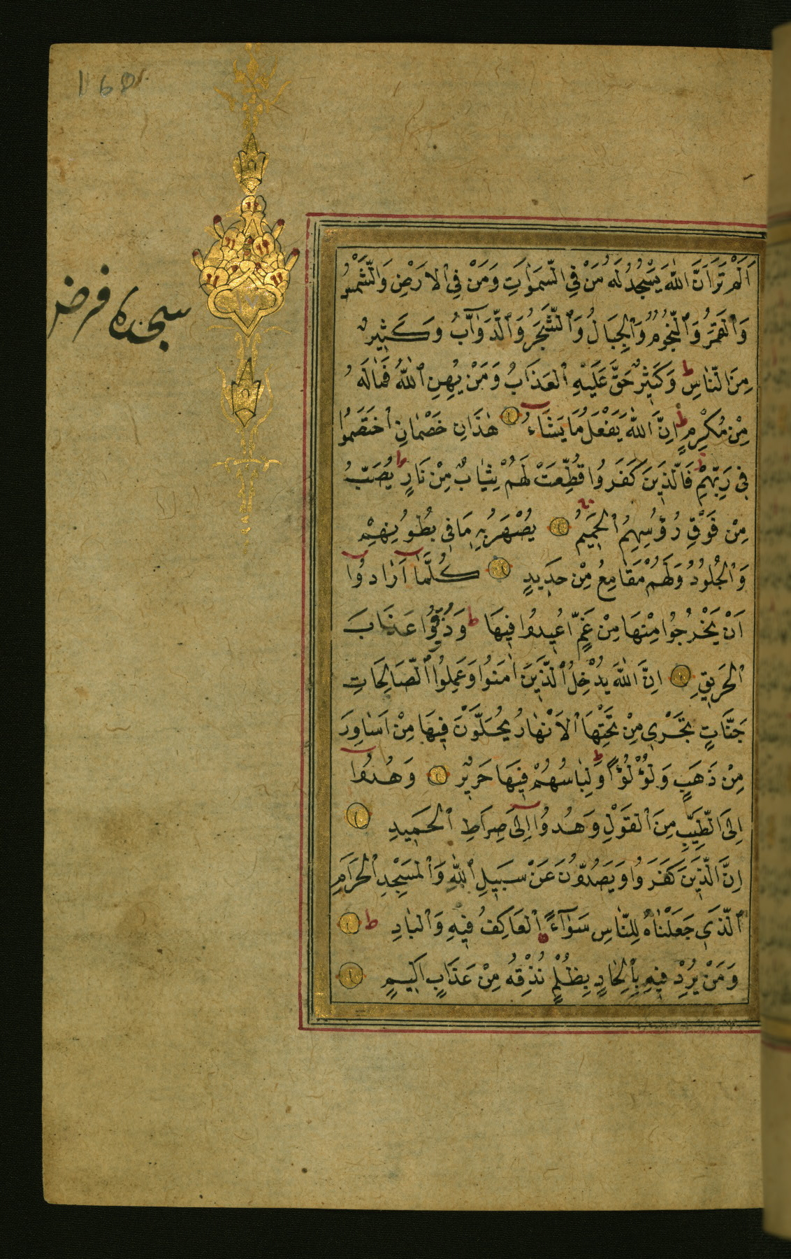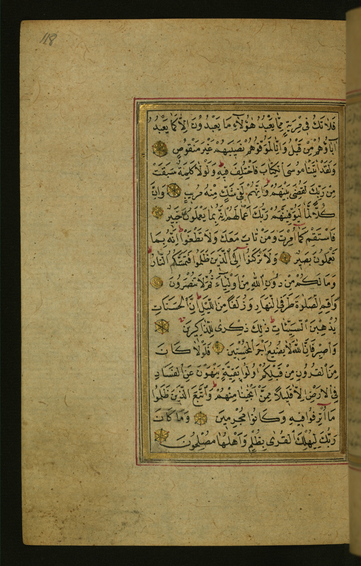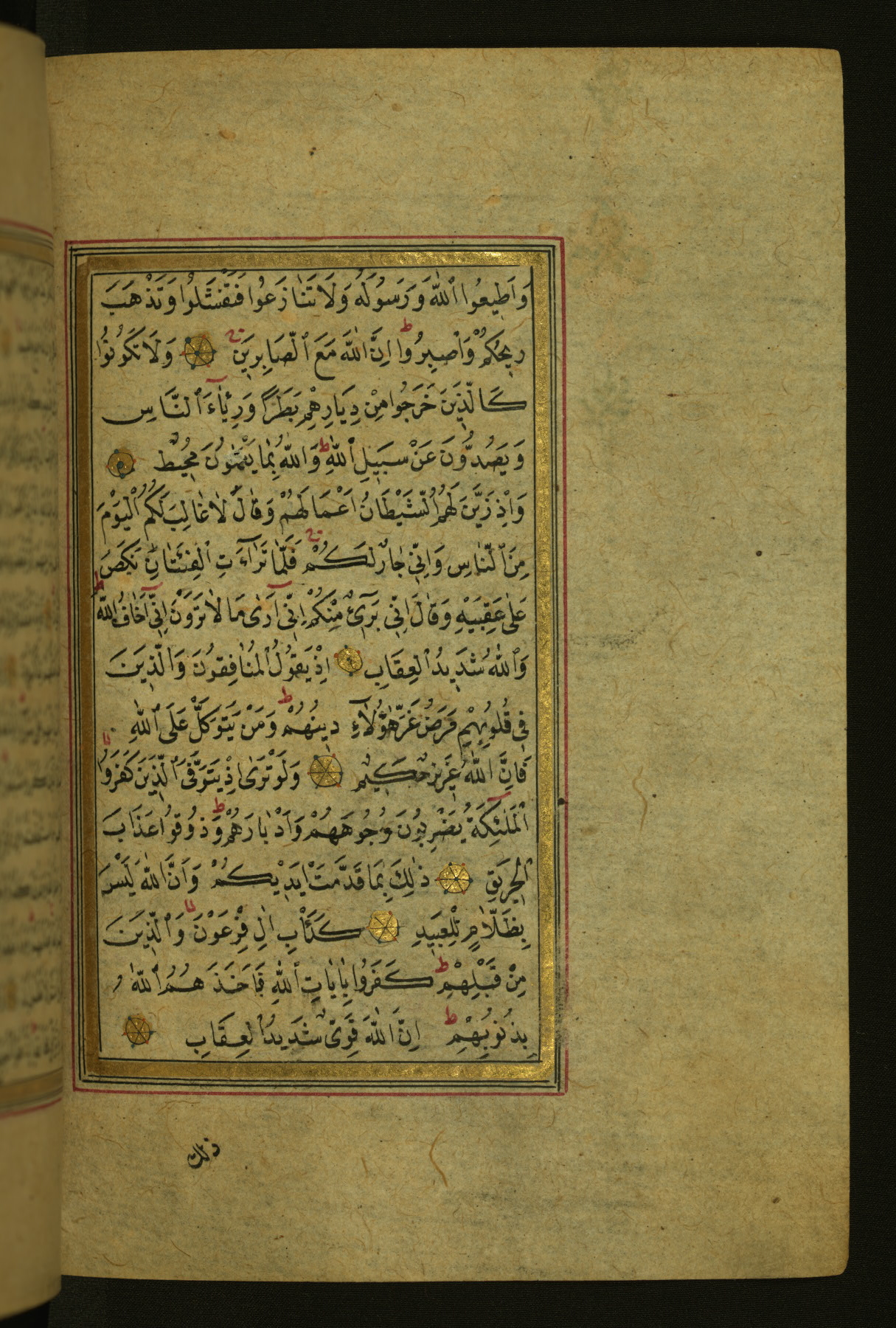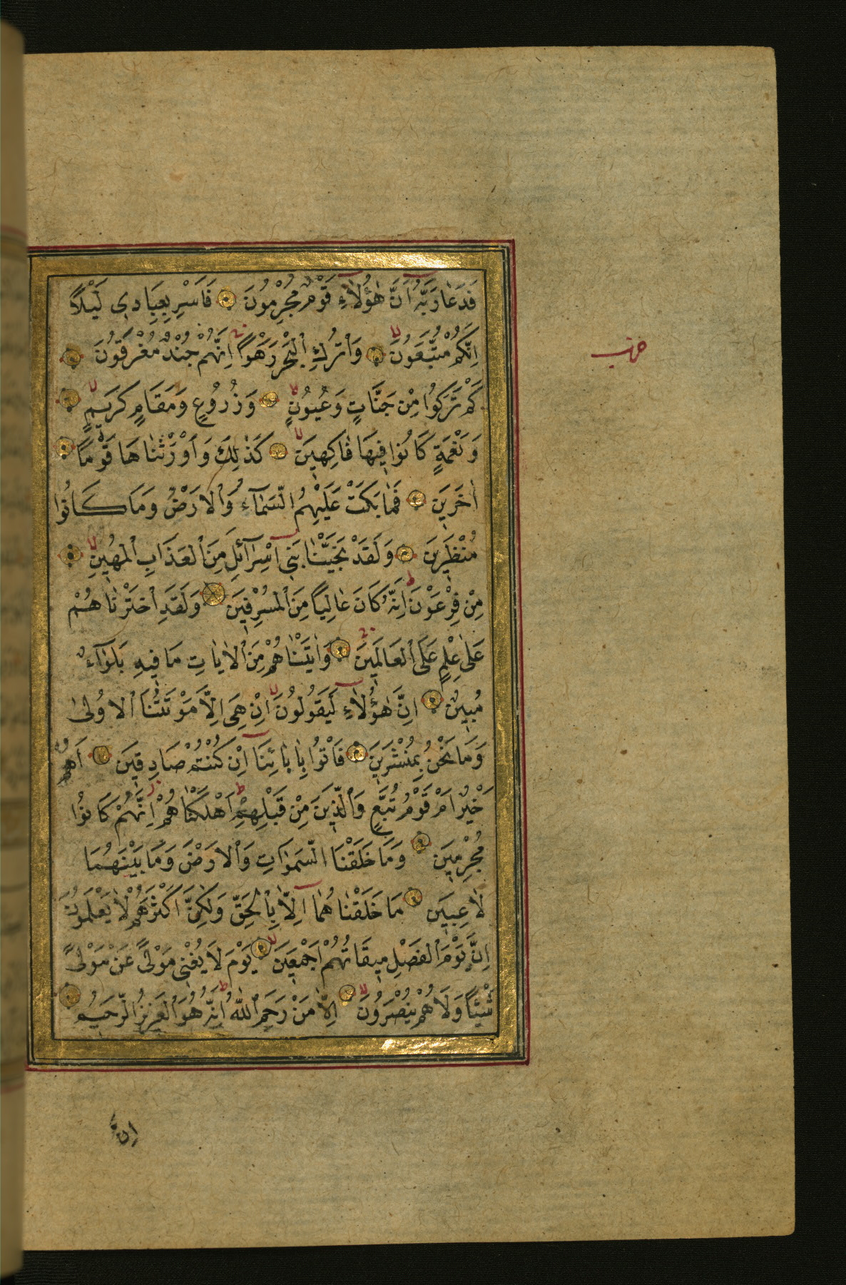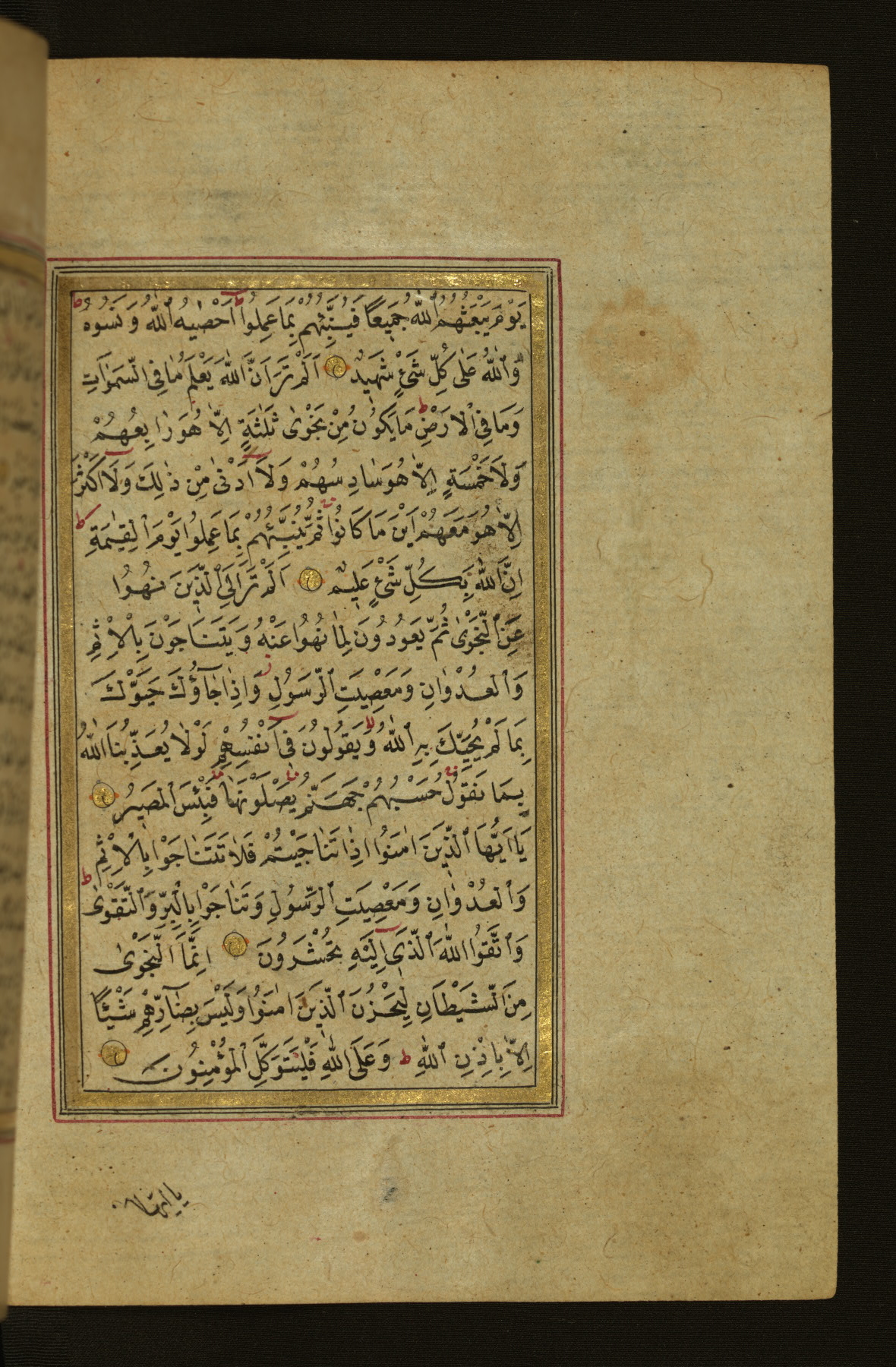 This small, illuminated single-volume copy of the Qurʾan was produced in Ottoman Turkey in 1282 AH / 1865-6 CE by Muḥammad ibn Muṣṭafá Izmīrī, a pupil of al-Rudūsī. The colophon in ijāzah script indicates that the present codex is the twenty-first copy executed by him (fol. 304b). The manuscript opens with an illuminated double-page incipit with the verses of chapters 1 (Sūrat al-fātiḥah) and 2 (Sūrat al-baqarah) (fols. 1b-2a). The text is written in naskh script in black ink with reading marks in red. Verses are separated by illuminated discs with colored dots and chapter headings are in riqāʿ script in white ink. Polychrome medallions in the margins indicate textual divisions and prostration. The binding of black leather is contemporary with the manuscript and decorated with a tooled and gold-painted geometric design enclosed by gold frames on the upper and lower boards.