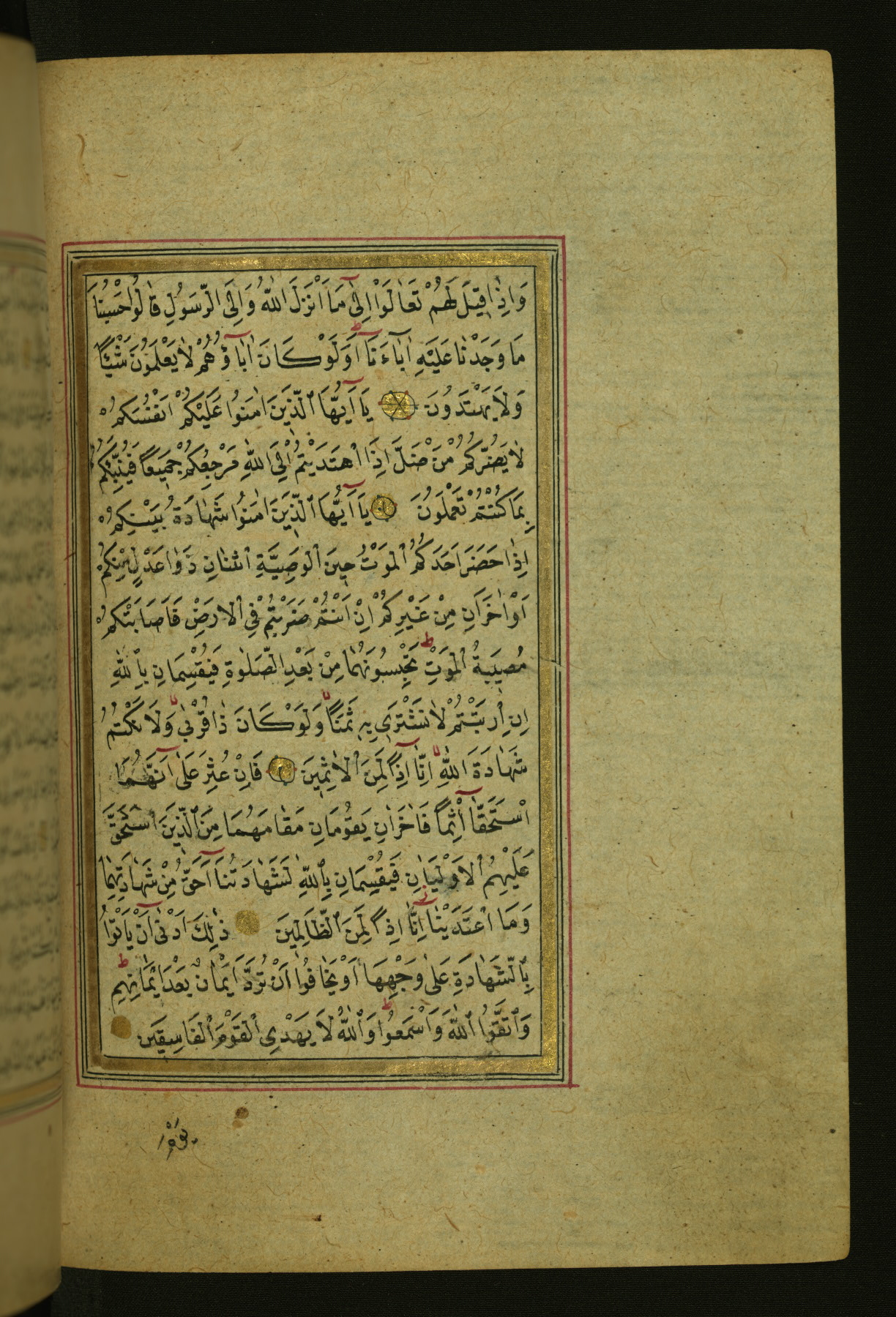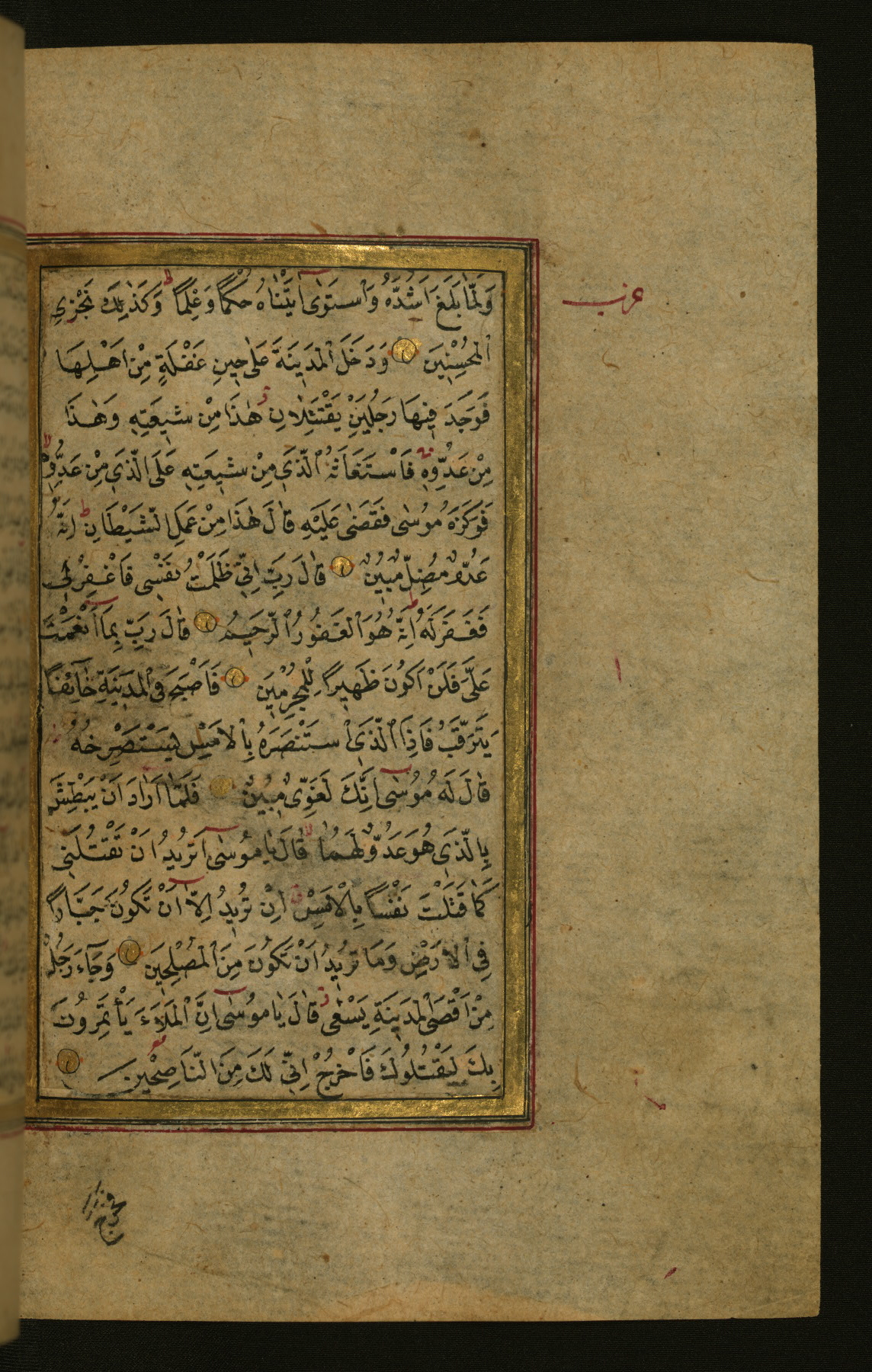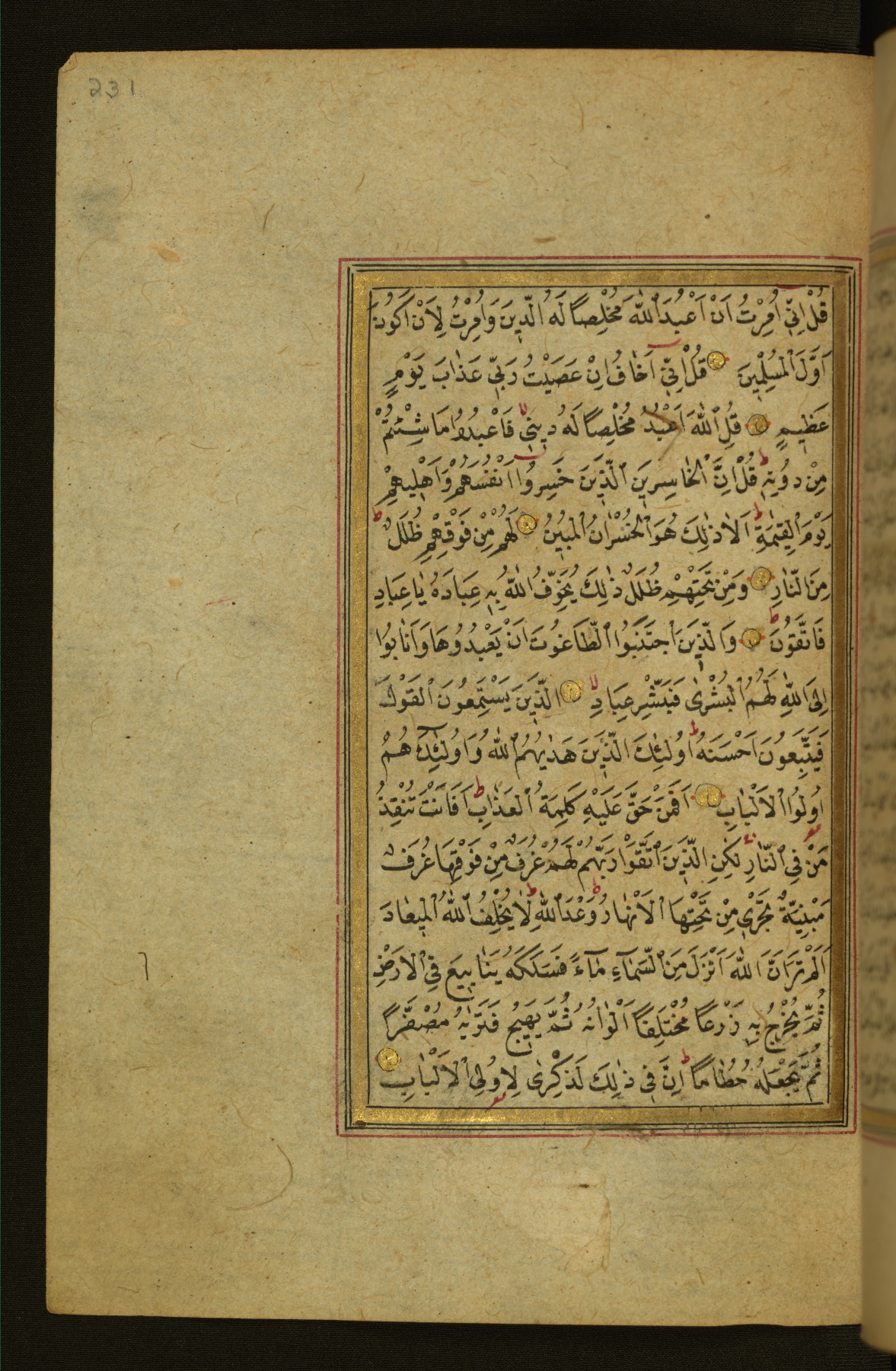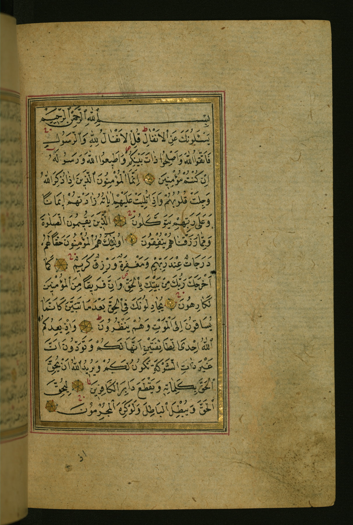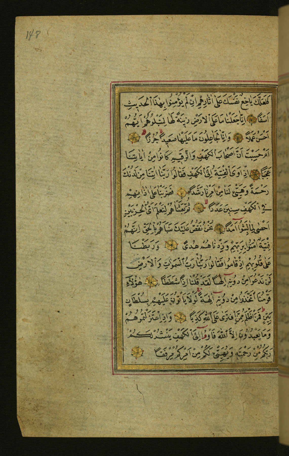 This small, illuminated single-volume copy of the Qurʾan was produced in Ottoman Turkey in 1282 AH / 1865-6 CE by Muḥammad ibn Muṣṭafá Izmīrī, a pupil of al-Rudūsī. The colophon in ijāzah script indicates that the present codex is the twenty-first copy executed by him (fol. 304b). The manuscript opens with an illuminated double-page incipit with the verses of chapters 1 (Sūrat al-fātiḥah) and 2 (Sūrat al-baqarah) (fols. 1b-2a). The text is written in naskh script in black ink with reading marks in red. Verses are separated by illuminated discs with colored dots and chapter headings are in riqāʿ script in white ink. Polychrome medallions in the margins indicate textual divisions and prostration. The binding of black leather is contemporary with the manuscript and decorated with a tooled and gold-painted geometric design enclosed by gold frames on the upper and lower boards.