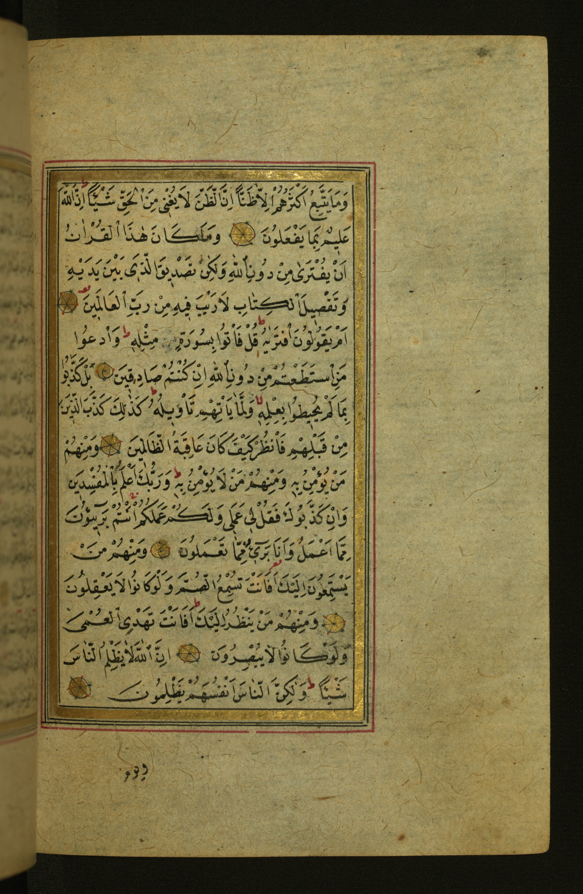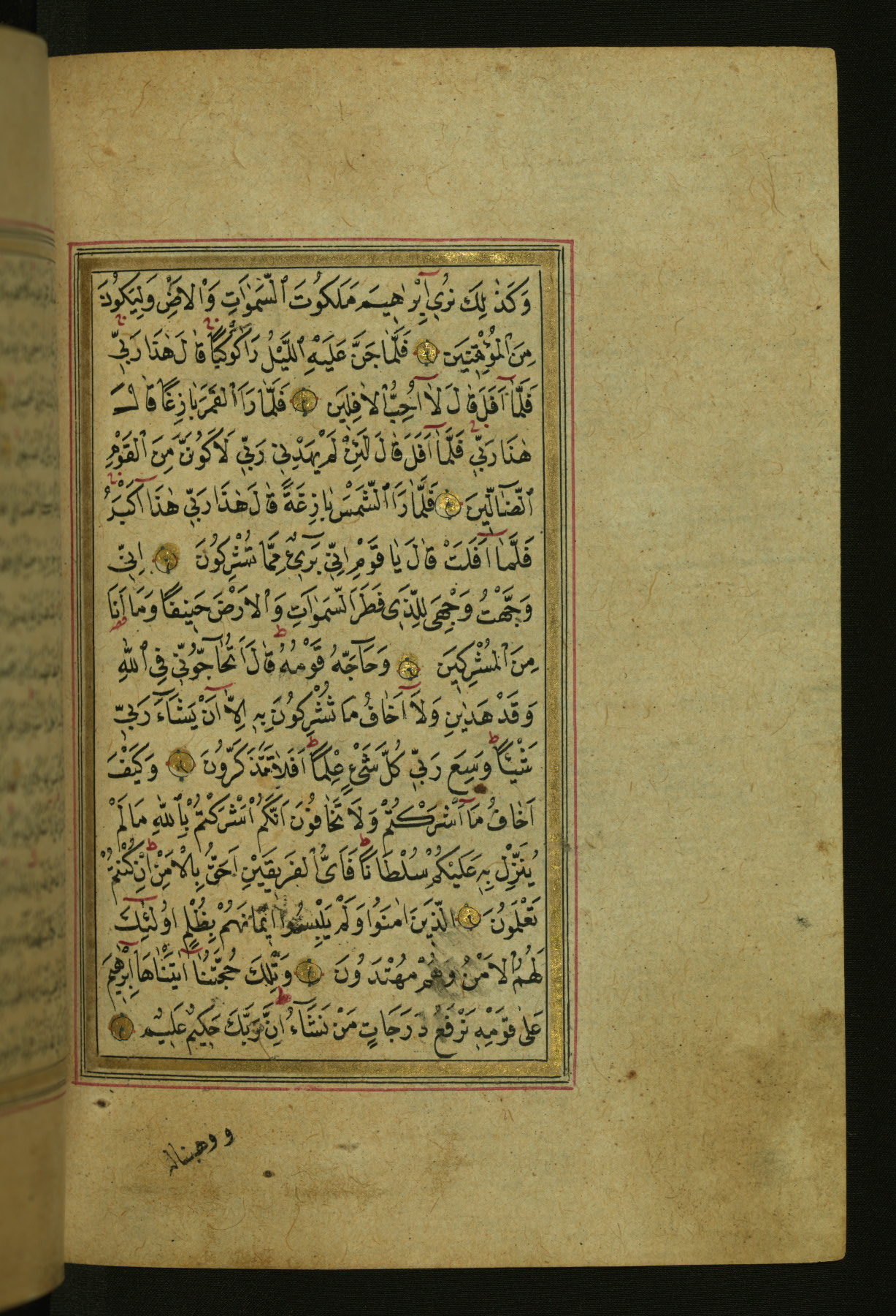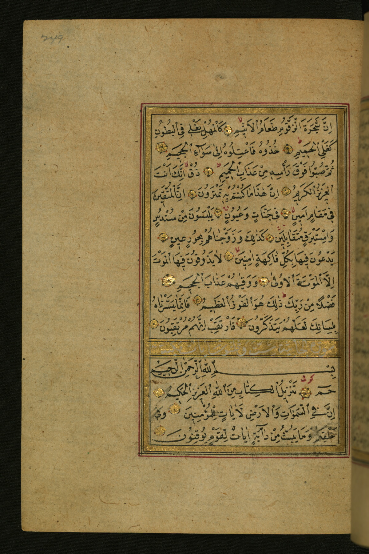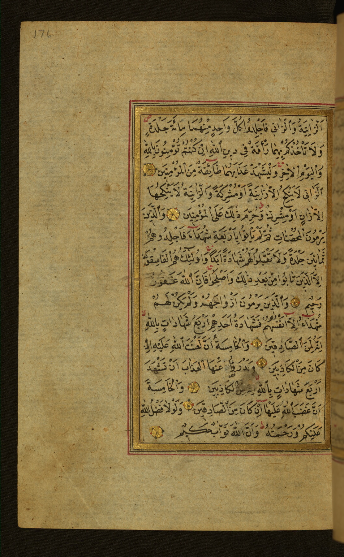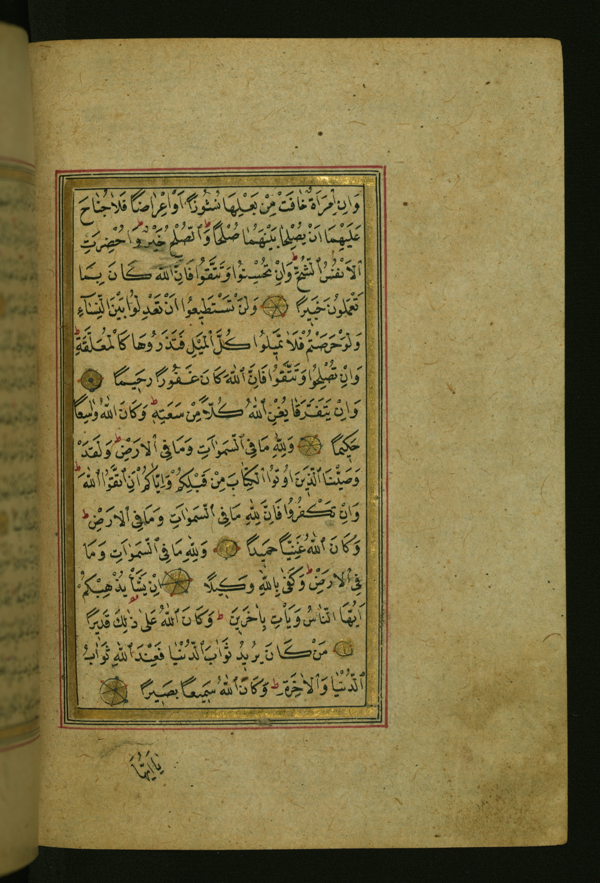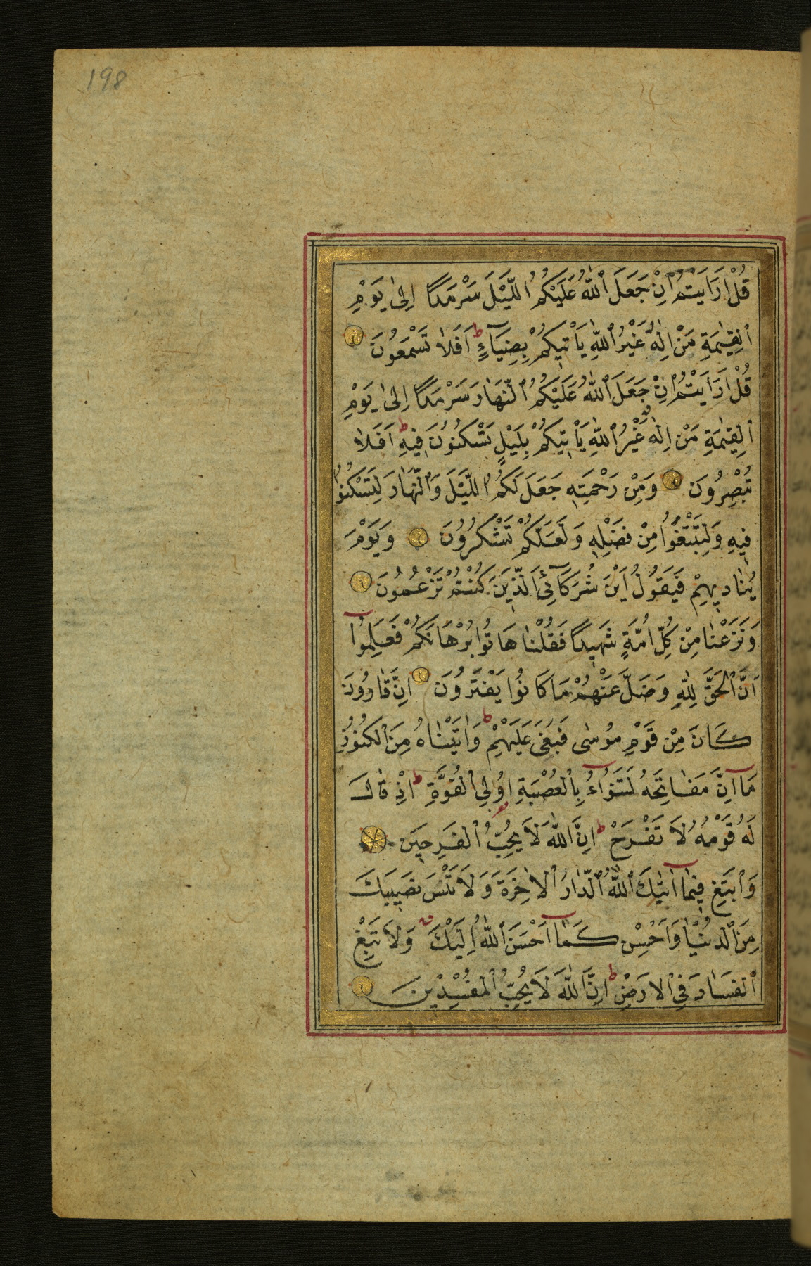 This small, illuminated single-volume copy of the Qurʾan was produced in Ottoman Turkey in 1282 AH / 1865-6 CE by Muḥammad ibn Muṣṭafá Izmīrī, a pupil of al-Rudūsī. The colophon in ijāzah script indicates that the present codex is the twenty-first copy executed by him (fol. 304b). The manuscript opens with an illuminated double-page incipit with the verses of chapters 1 (Sūrat al-fātiḥah) and 2 (Sūrat al-baqarah) (fols. 1b-2a). The text is written in naskh script in black ink with reading marks in red. Verses are separated by illuminated discs with colored dots and chapter headings are in riqāʿ script in white ink. Polychrome medallions in the margins indicate textual divisions and prostration. The binding of black leather is contemporary with the manuscript and decorated with a tooled and gold-painted geometric design enclosed by gold frames on the upper and lower boards.