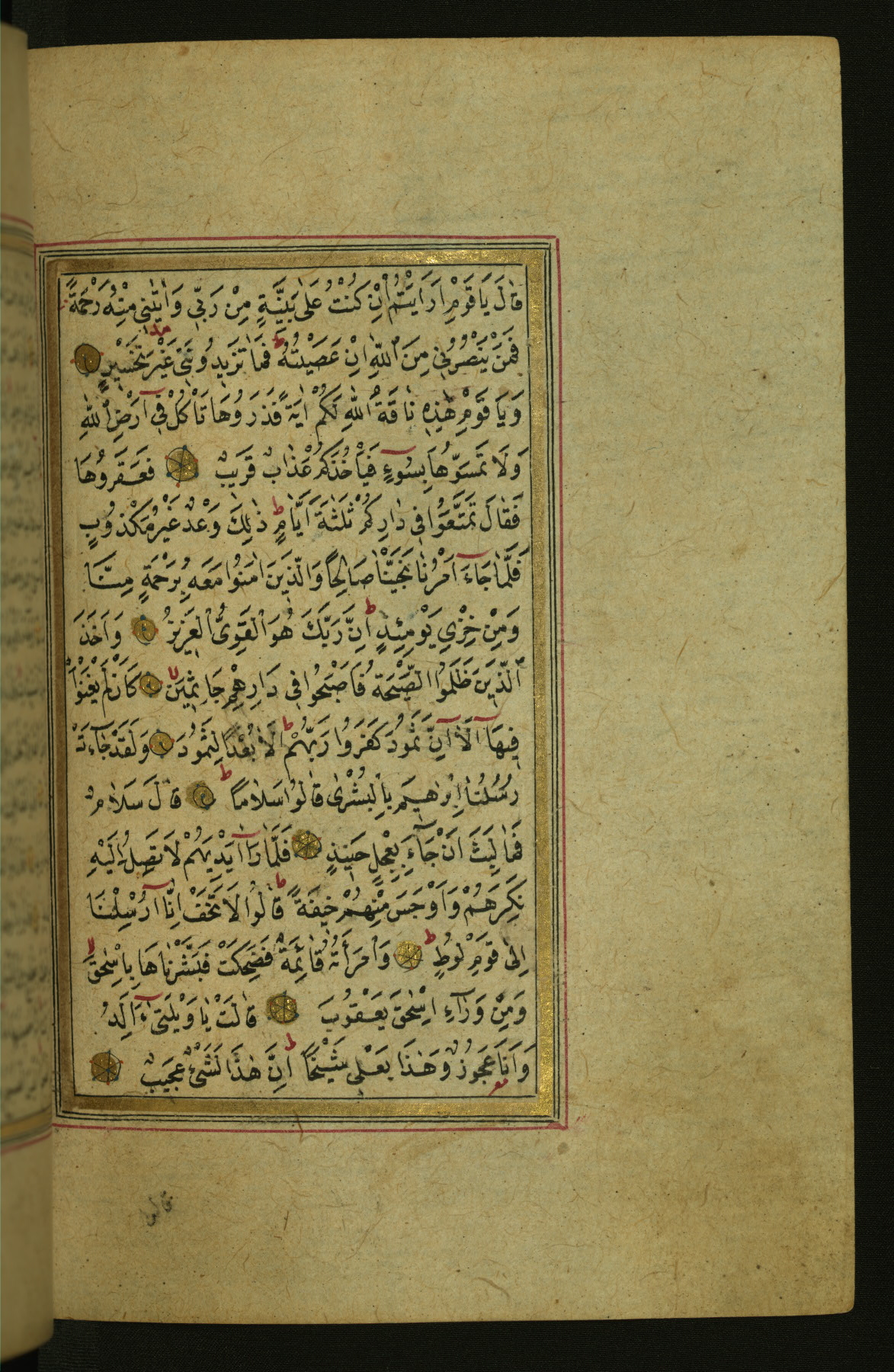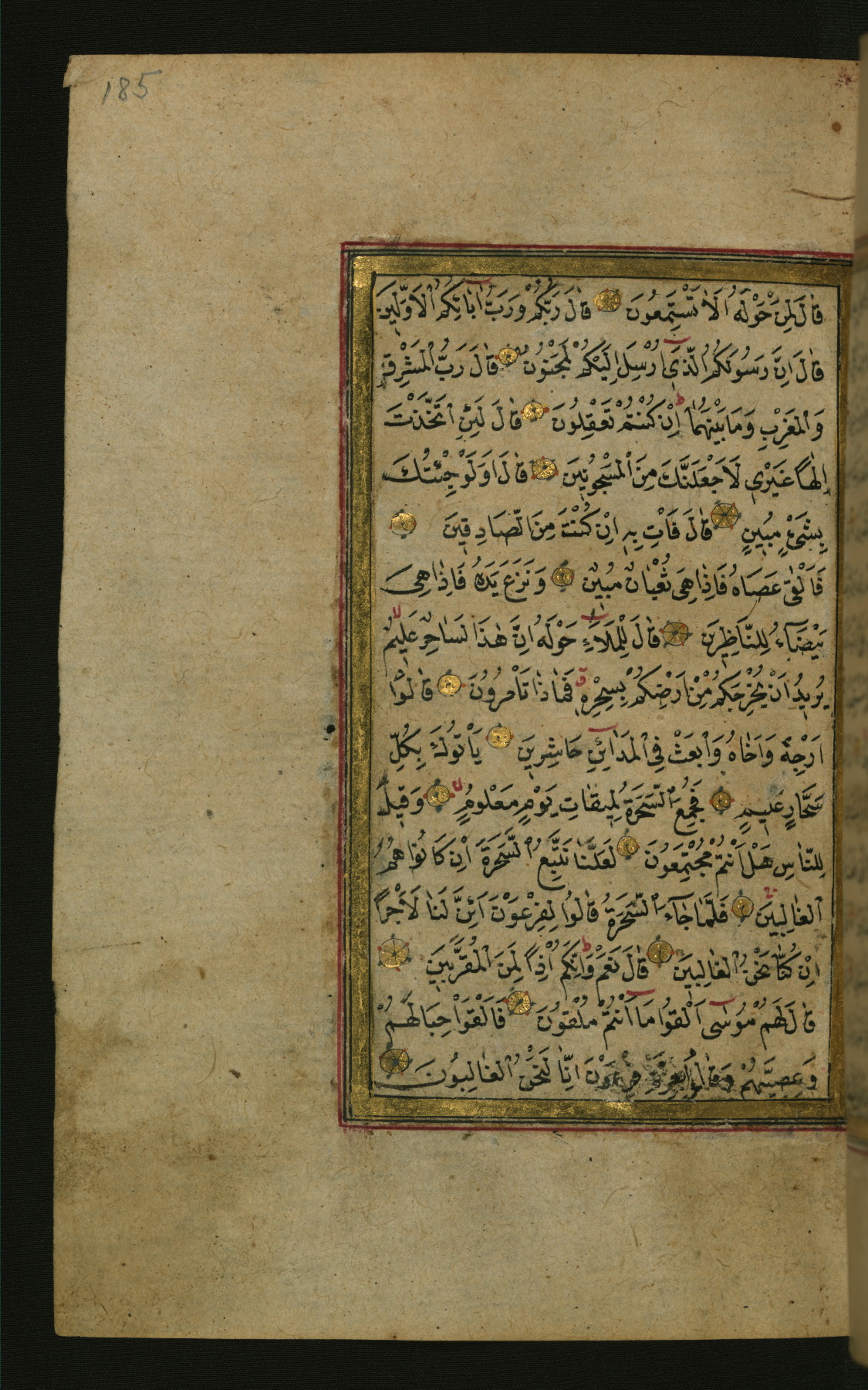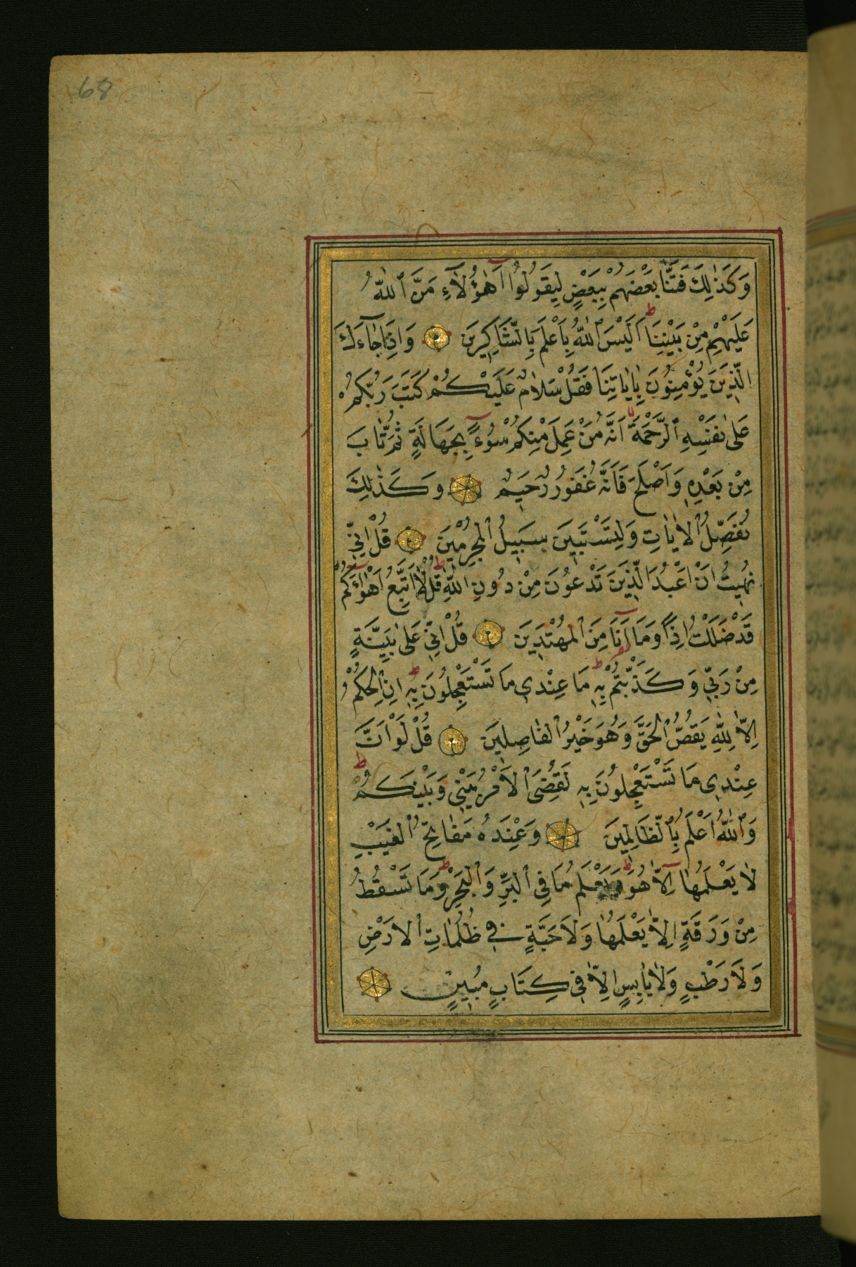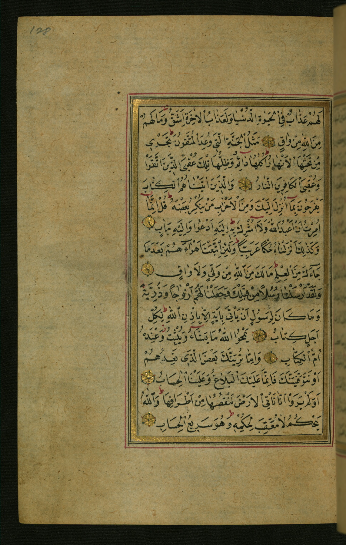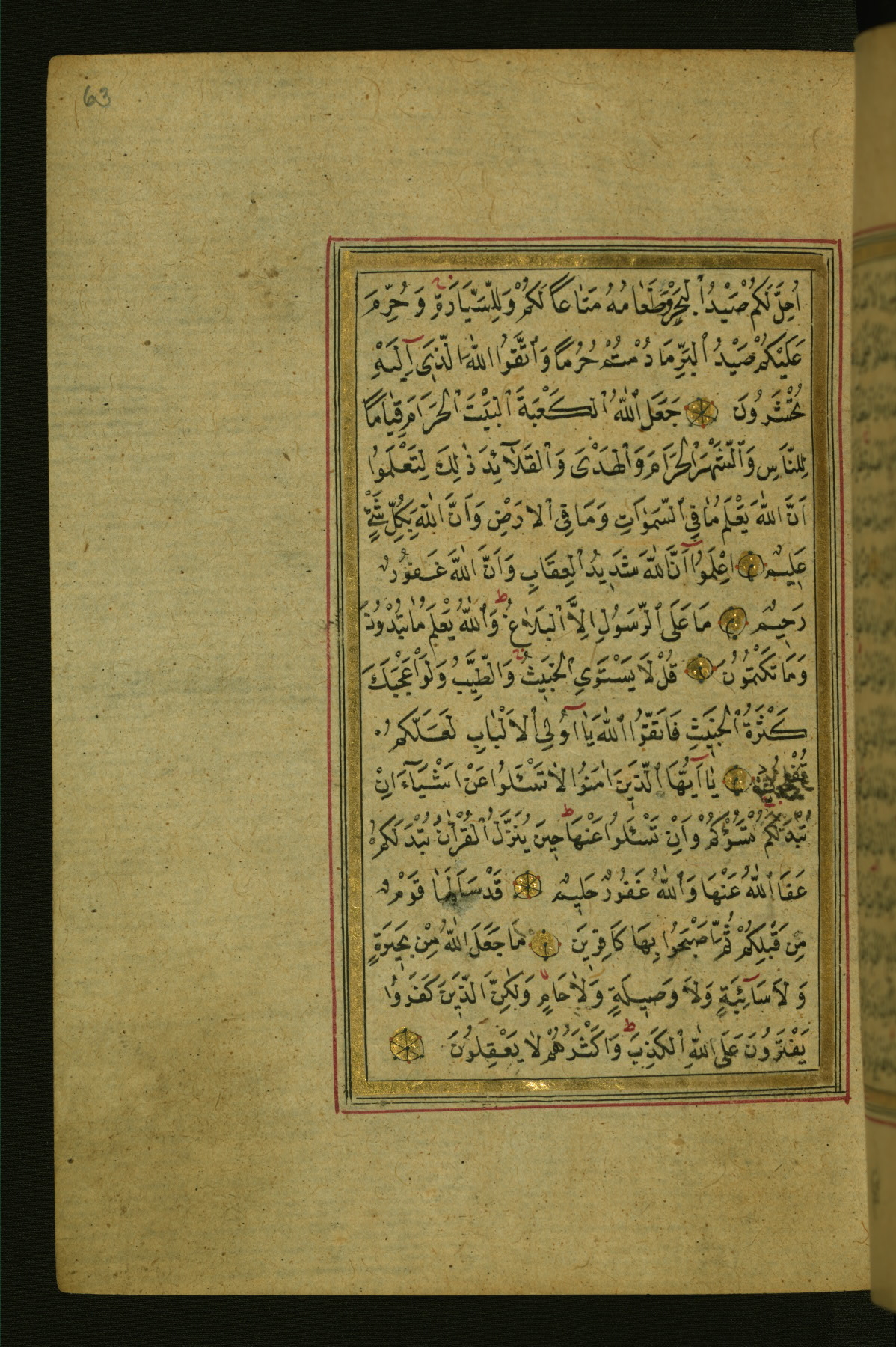 This small, illuminated single-volume copy of the Qurʾan was produced in Ottoman Turkey in 1282 AH / 1865-6 CE by Muḥammad ibn Muṣṭafá Izmīrī, a pupil of al-Rudūsī. The colophon in ijāzah script indicates that the present codex is the twenty-first copy executed by him (fol. 304b). The manuscript opens with an illuminated double-page incipit with the verses of chapters 1 (Sūrat al-fātiḥah) and 2 (Sūrat al-baqarah) (fols. 1b-2a). The text is written in naskh script in black ink with reading marks in red. Verses are separated by illuminated discs with colored dots and chapter headings are in riqāʿ script in white ink. Polychrome medallions in the margins indicate textual divisions and prostration. The binding of black leather is contemporary with the manuscript and decorated with a tooled and gold-painted geometric design enclosed by gold frames on the upper and lower boards.