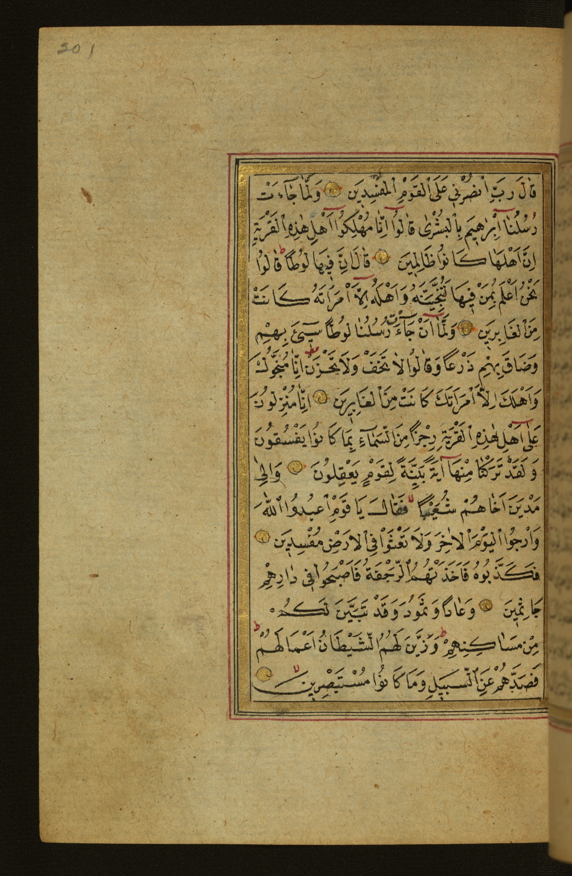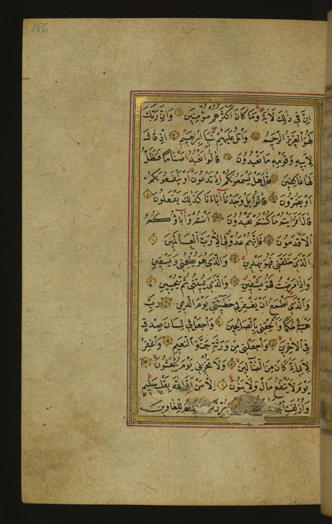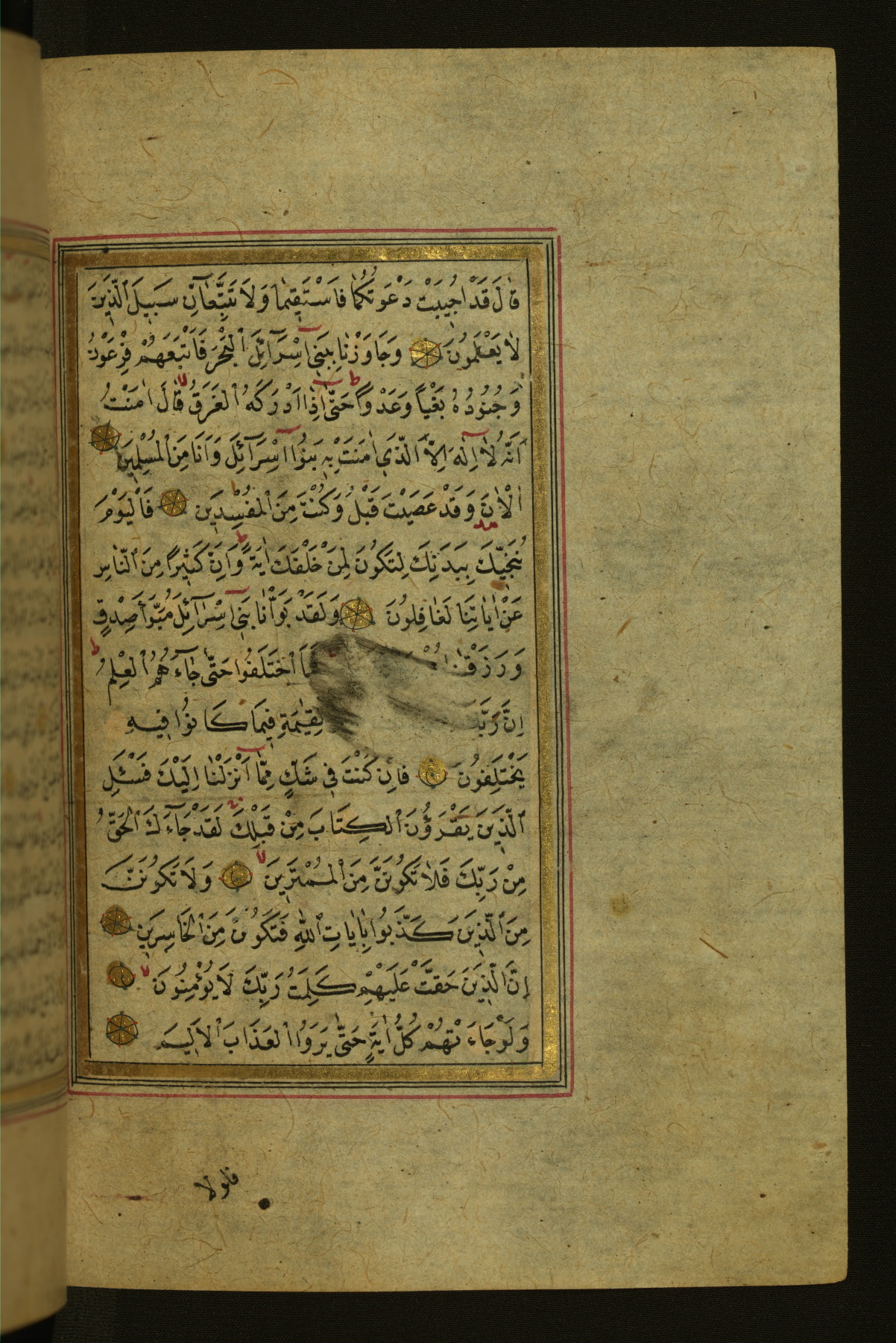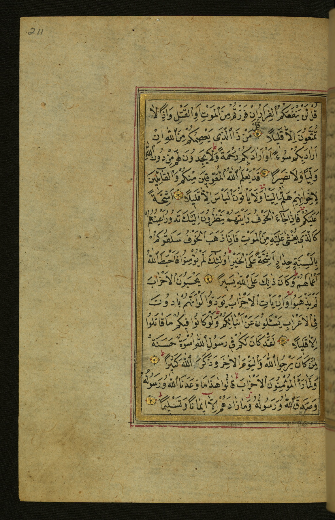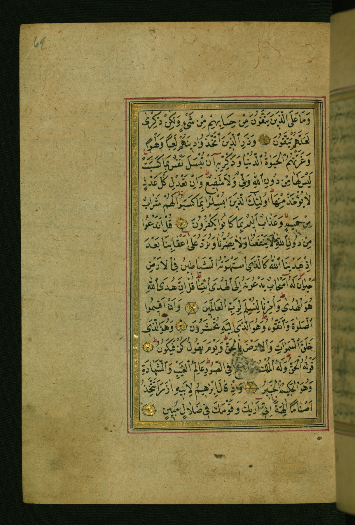 This small, illuminated single-volume copy of the Qurʾan was produced in Ottoman Turkey in 1282 AH / 1865-6 CE by Muḥammad ibn Muṣṭafá Izmīrī, a pupil of al-Rudūsī. The colophon in ijāzah script indicates that the present codex is the twenty-first copy executed by him (fol. 304b). The manuscript opens with an illuminated double-page incipit with the verses of chapters 1 (Sūrat al-fātiḥah) and 2 (Sūrat al-baqarah) (fols. 1b-2a). The text is written in naskh script in black ink with reading marks in red. Verses are separated by illuminated discs with colored dots and chapter headings are in riqāʿ script in white ink. Polychrome medallions in the margins indicate textual divisions and prostration. The binding of black leather is contemporary with the manuscript and decorated with a tooled and gold-painted geometric design enclosed by gold frames on the upper and lower boards.
