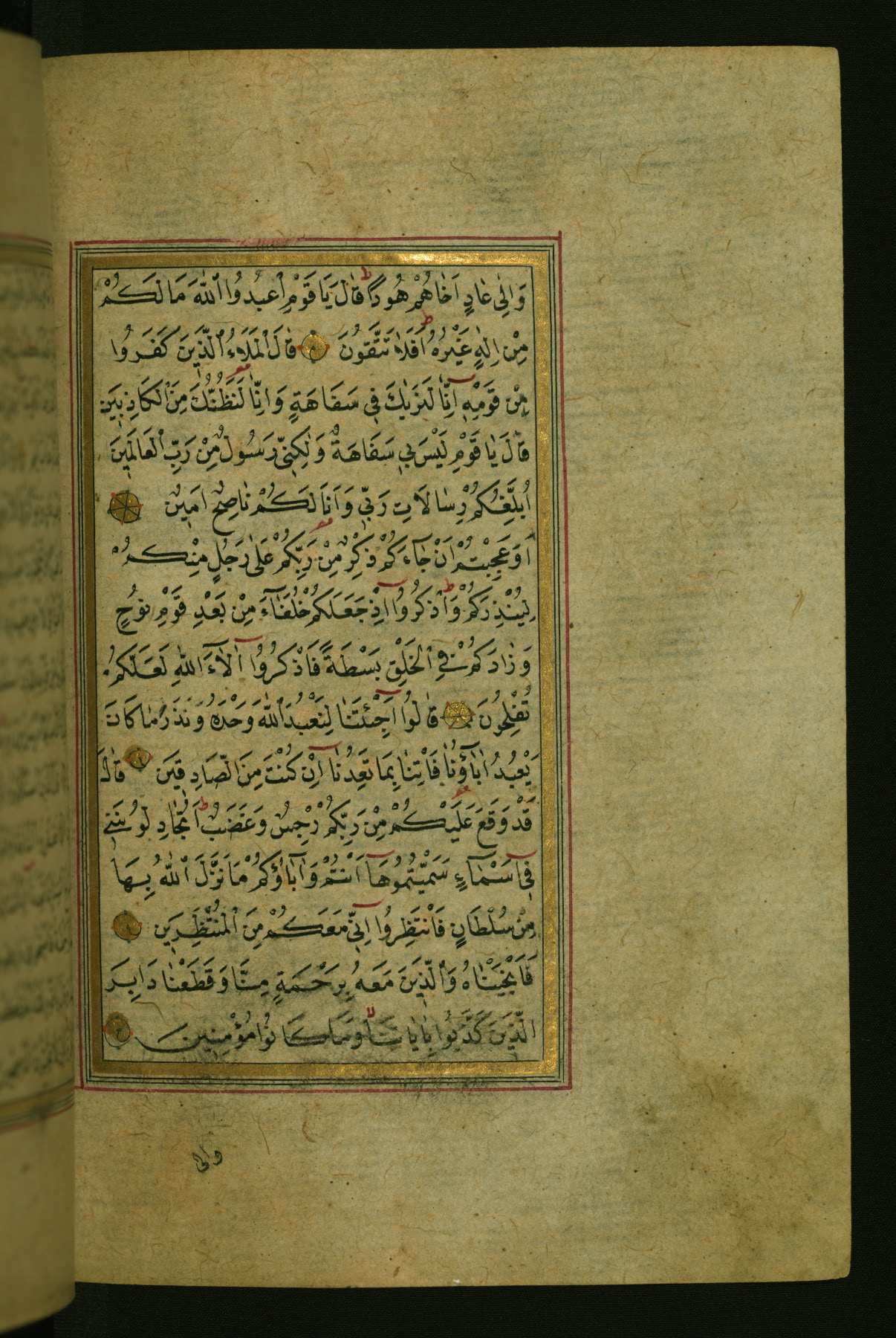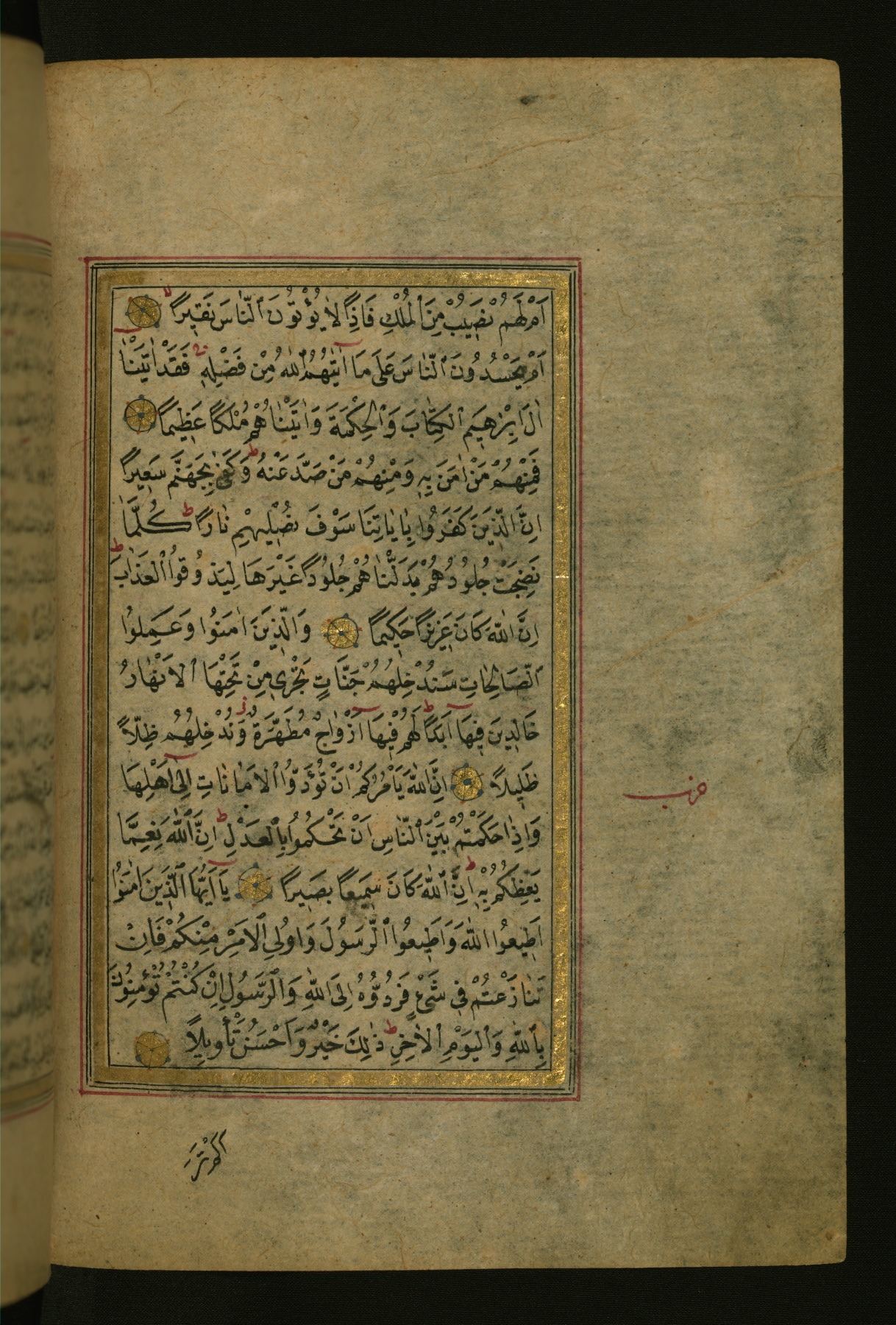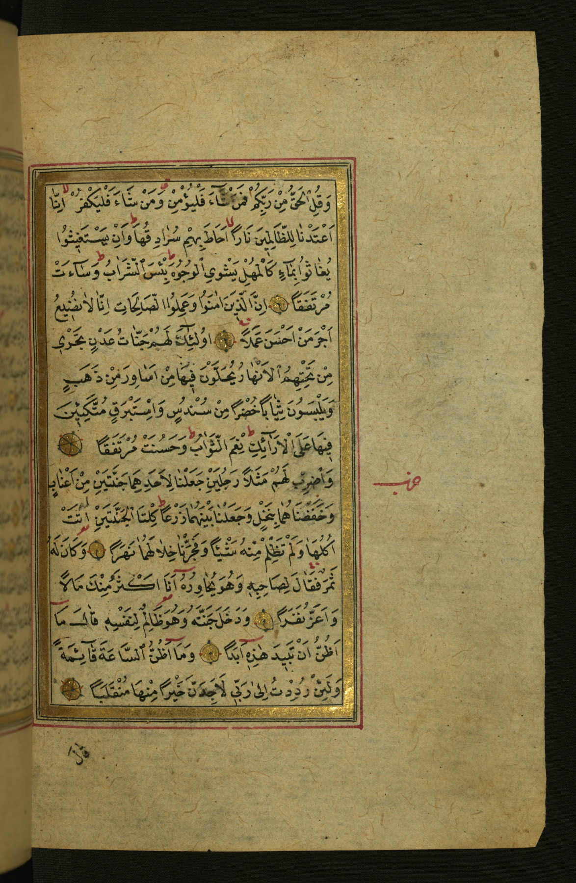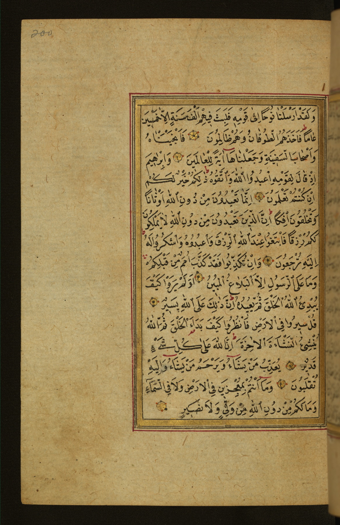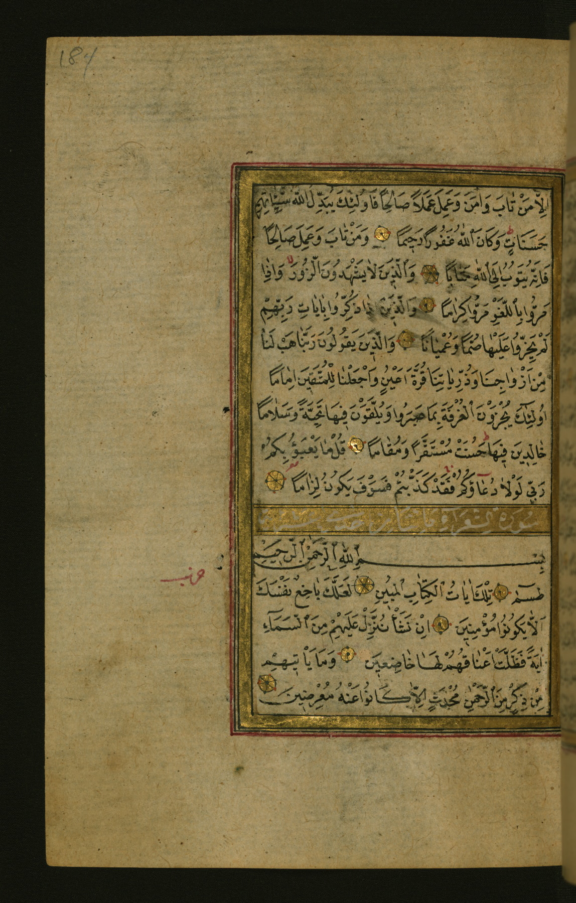 This small, illuminated single-volume copy of the Qurʾan was produced in Ottoman Turkey in 1282 AH / 1865-6 CE by Muḥammad ibn Muṣṭafá Izmīrī, a pupil of al-Rudūsī. The colophon in ijāzah script indicates that the present codex is the twenty-first copy executed by him (fol. 304b). The manuscript opens with an illuminated double-page incipit with the verses of chapters 1 (Sūrat al-fātiḥah) and 2 (Sūrat al-baqarah) (fols. 1b-2a). The text is written in naskh script in black ink with reading marks in red. Verses are separated by illuminated discs with colored dots and chapter headings are in riqāʿ script in white ink. Polychrome medallions in the margins indicate textual divisions and prostration. The binding of black leather is contemporary with the manuscript and decorated with a tooled and gold-painted geometric design enclosed by gold frames on the upper and lower boards.