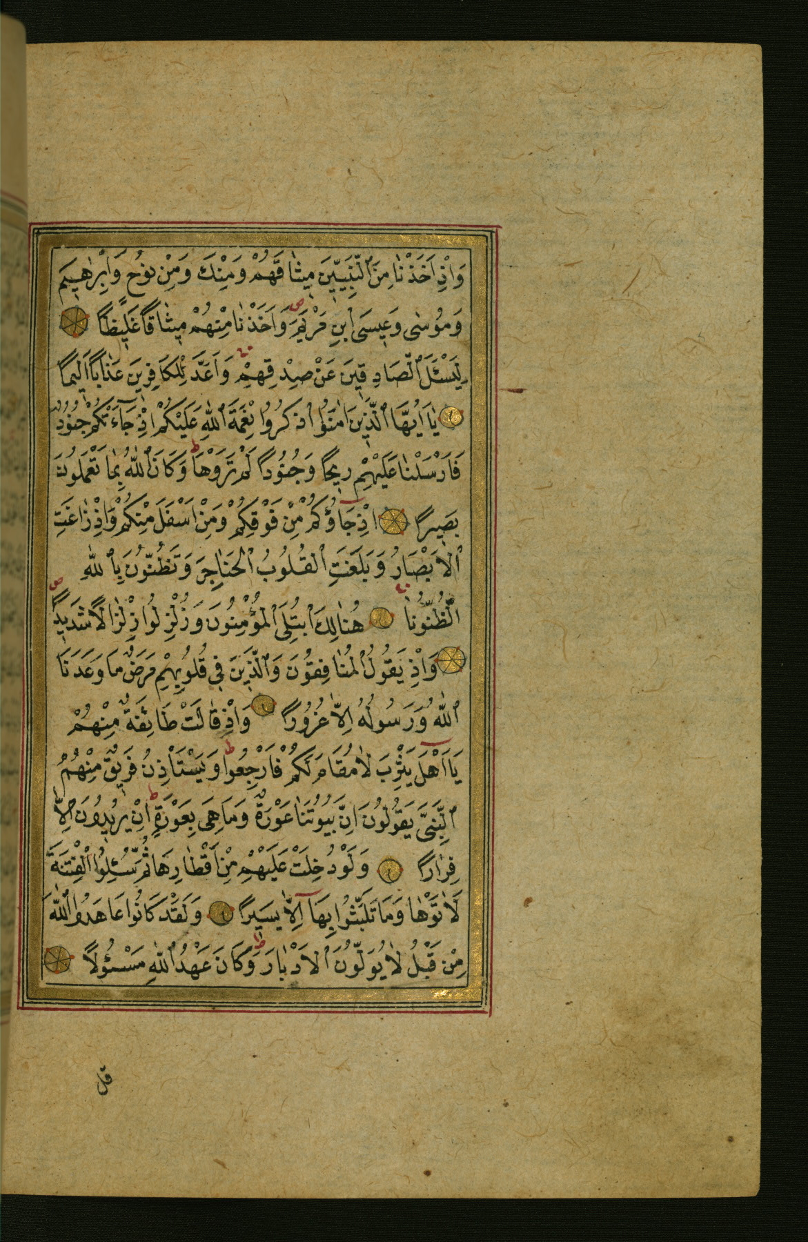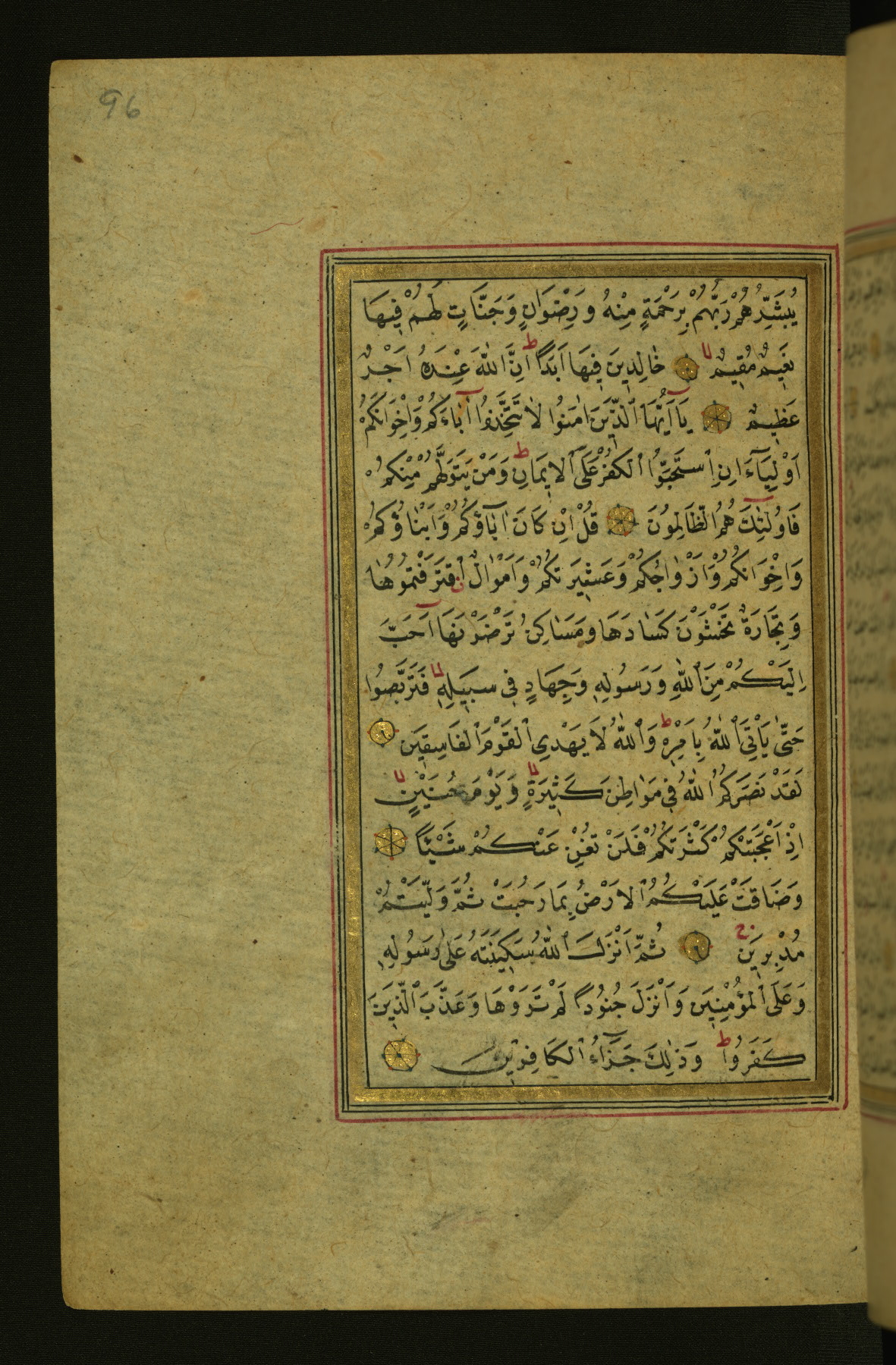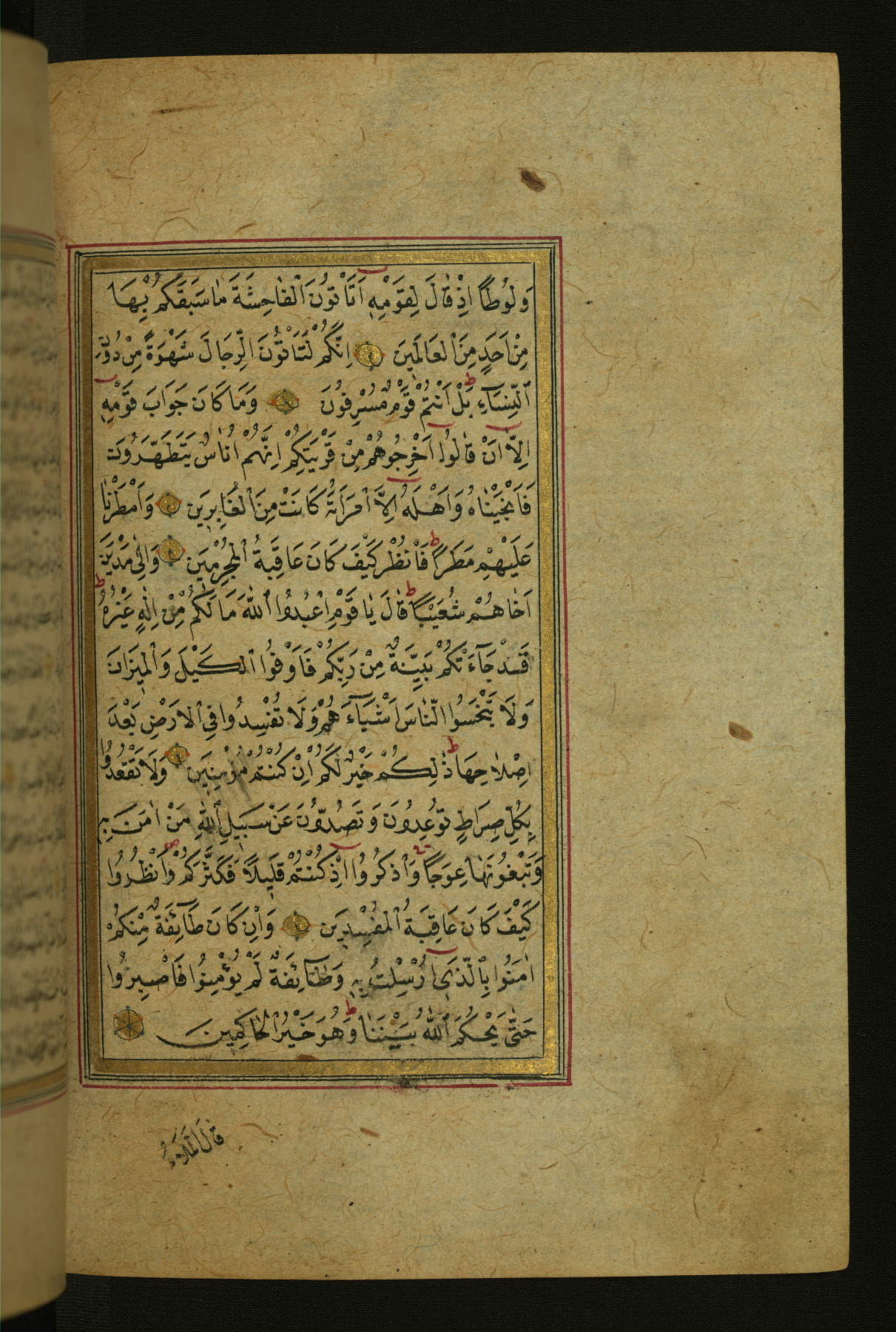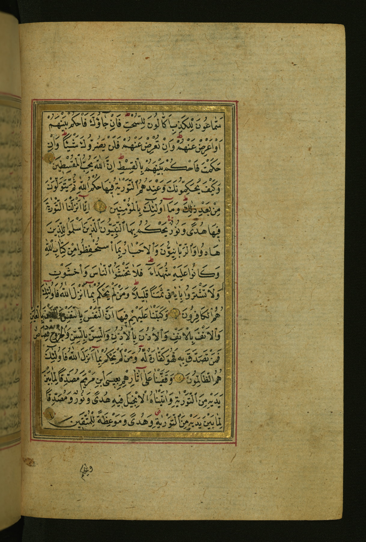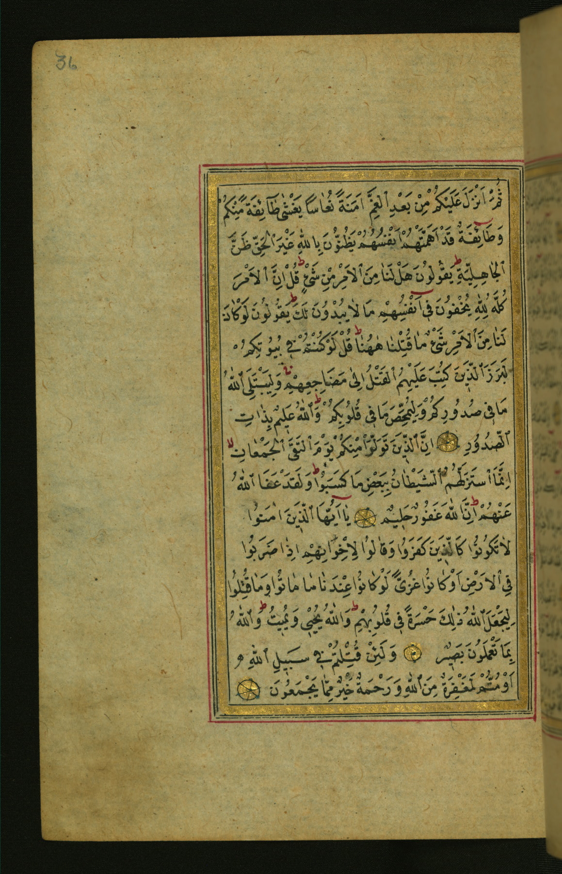 This small, illuminated single-volume copy of the Qurʾan was produced in Ottoman Turkey in 1282 AH / 1865-6 CE by Muḥammad ibn Muṣṭafá Izmīrī, a pupil of al-Rudūsī. The colophon in ijāzah script indicates that the present codex is the twenty-first copy executed by him (fol. 304b). The manuscript opens with an illuminated double-page incipit with the verses of chapters 1 (Sūrat al-fātiḥah) and 2 (Sūrat al-baqarah) (fols. 1b-2a). The text is written in naskh script in black ink with reading marks in red. Verses are separated by illuminated discs with colored dots and chapter headings are in riqāʿ script in white ink. Polychrome medallions in the margins indicate textual divisions and prostration. The binding of black leather is contemporary with the manuscript and decorated with a tooled and gold-painted geometric design enclosed by gold frames on the upper and lower boards.
