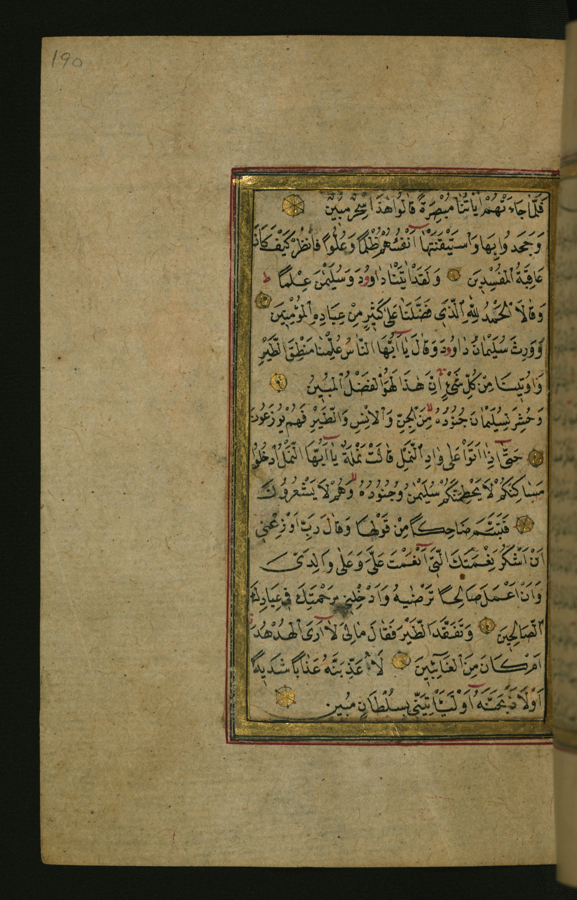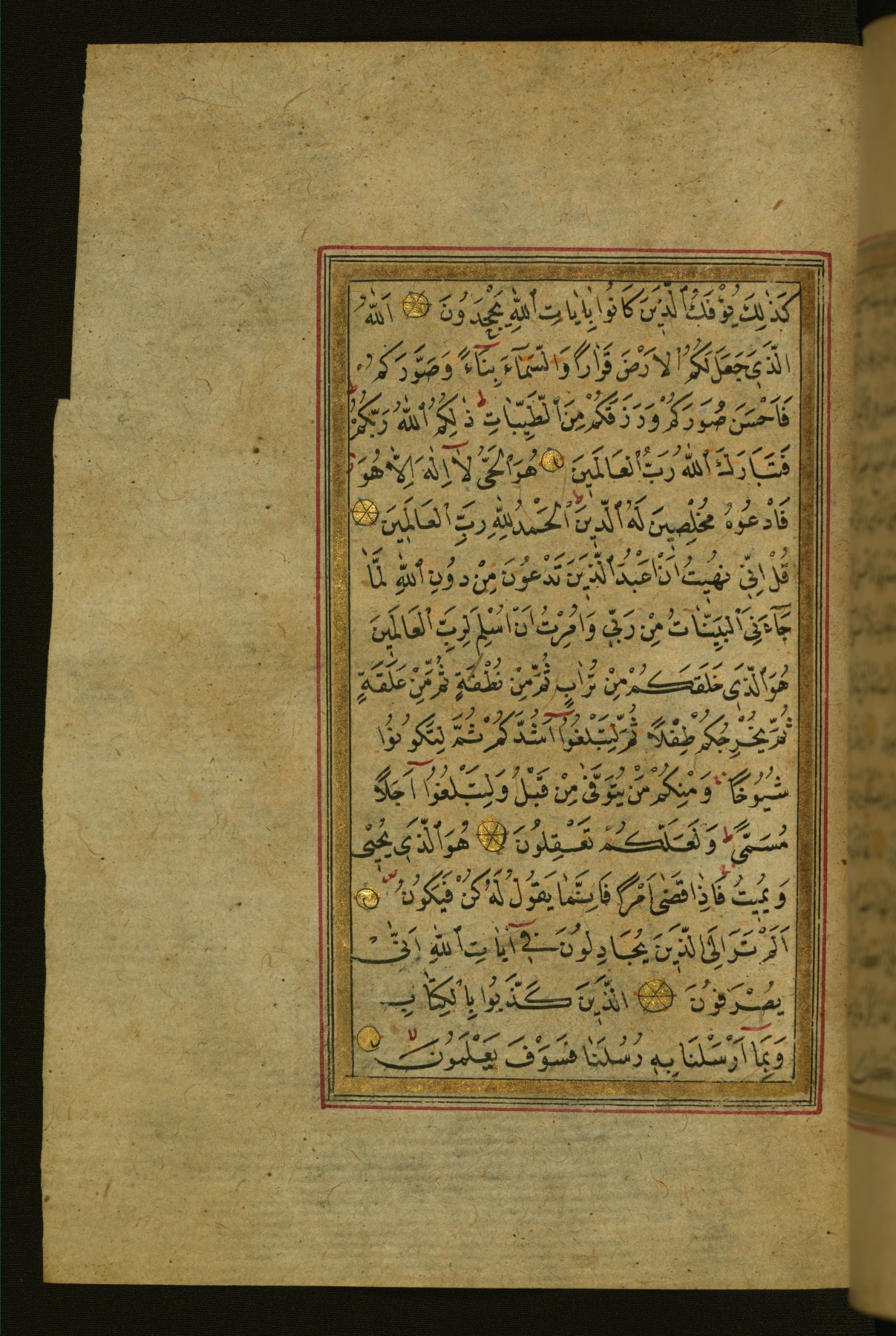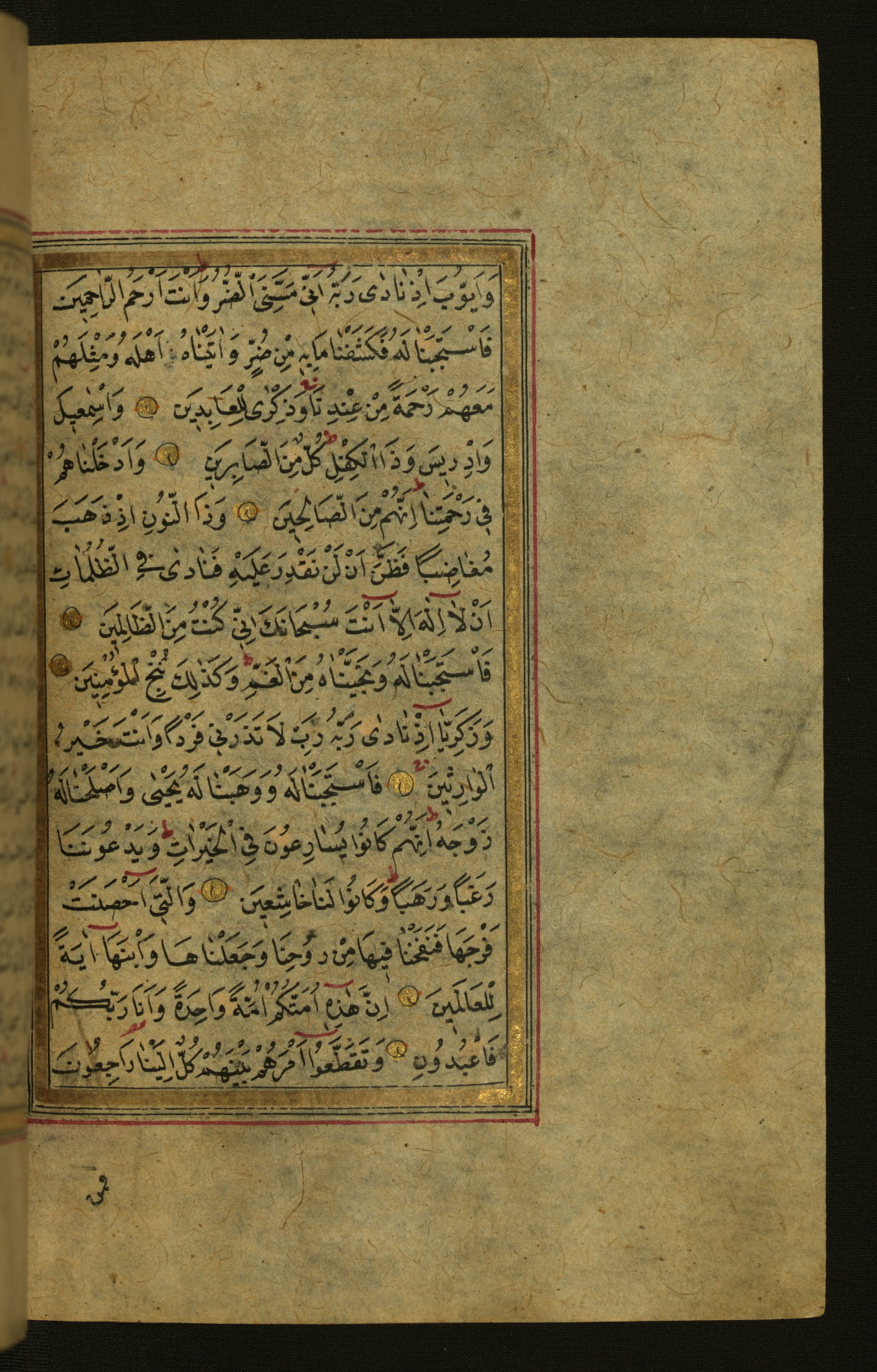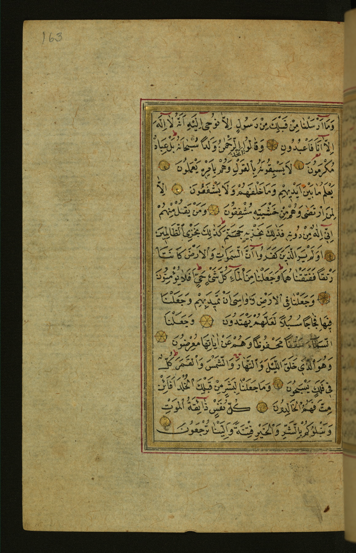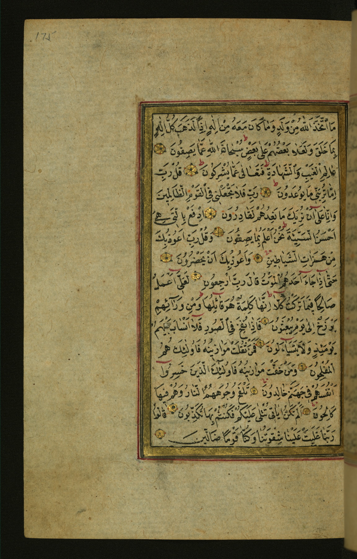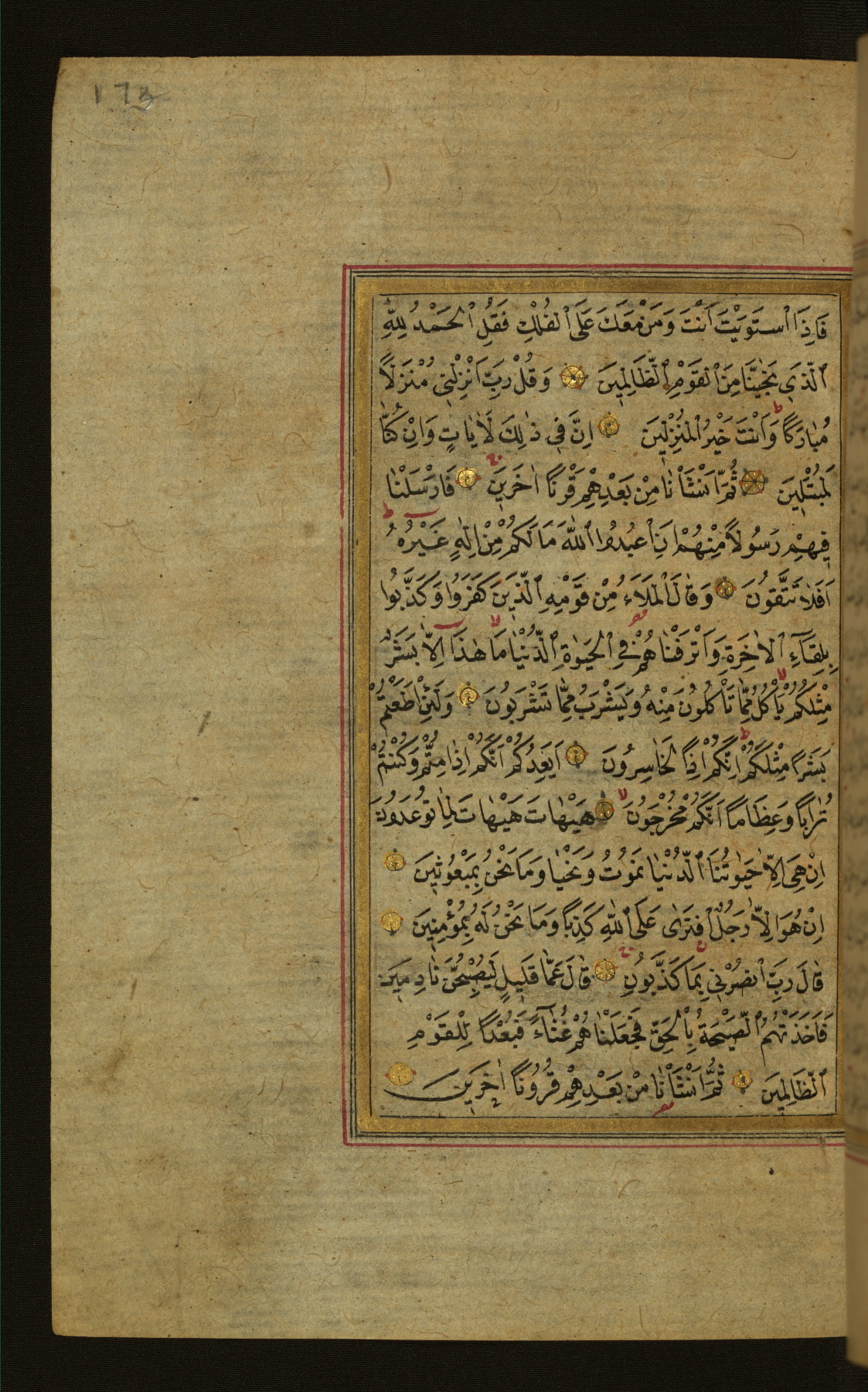 This small, illuminated single-volume copy of the Qurʾan was produced in Ottoman Turkey in 1282 AH / 1865-6 CE by Muḥammad ibn Muṣṭafá Izmīrī, a pupil of al-Rudūsī. The colophon in ijāzah script indicates that the present codex is the twenty-first copy executed by him (fol. 304b). The manuscript opens with an illuminated double-page incipit with the verses of chapters 1 (Sūrat al-fātiḥah) and 2 (Sūrat al-baqarah) (fols. 1b-2a). The text is written in naskh script in black ink with reading marks in red. Verses are separated by illuminated discs with colored dots and chapter headings are in riqāʿ script in white ink. Polychrome medallions in the margins indicate textual divisions and prostration. The binding of black leather is contemporary with the manuscript and decorated with a tooled and gold-painted geometric design enclosed by gold frames on the upper and lower boards.
