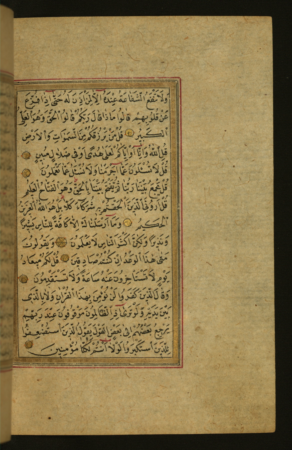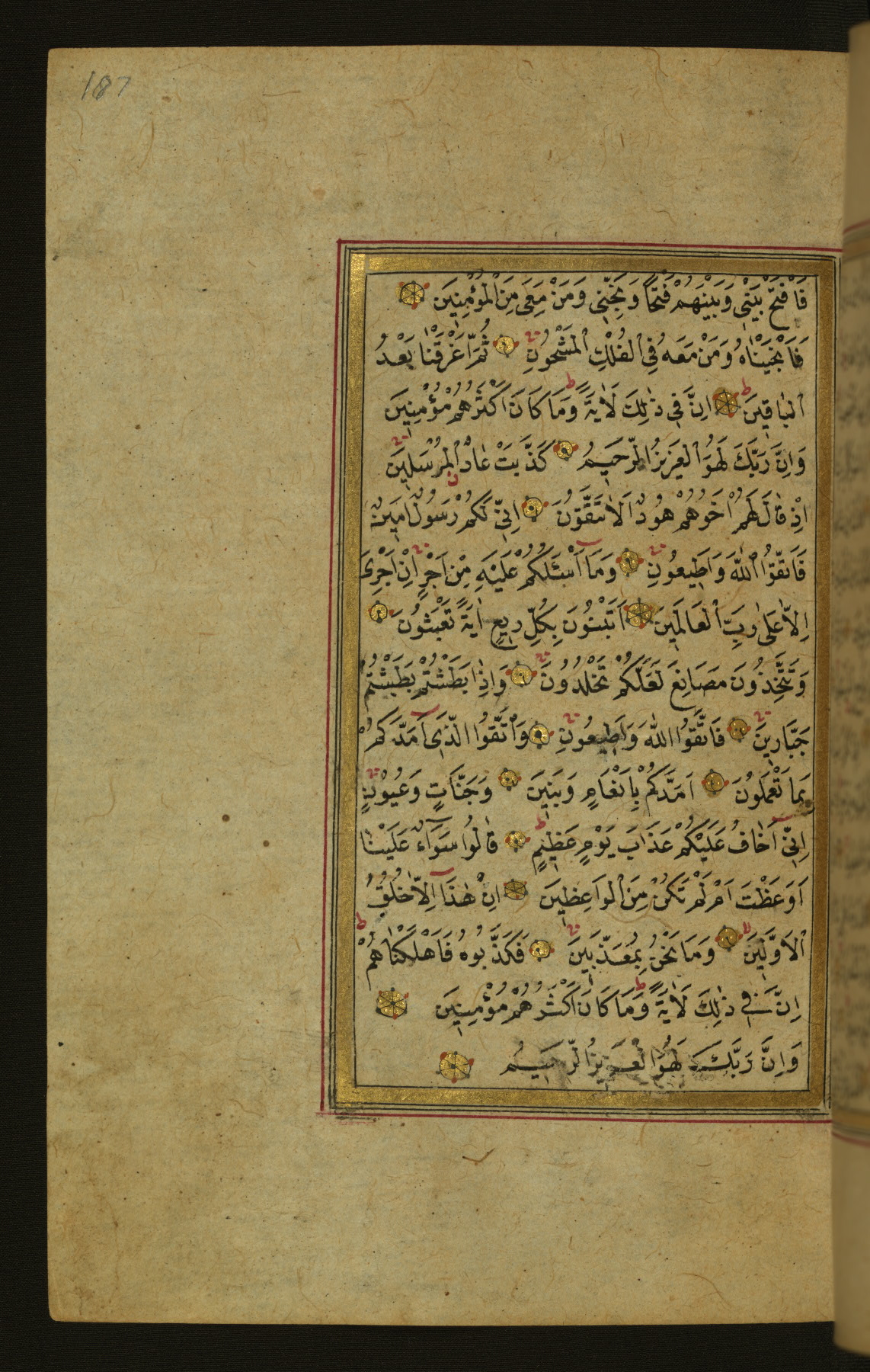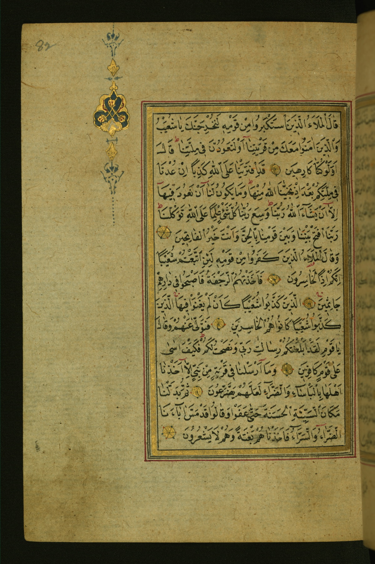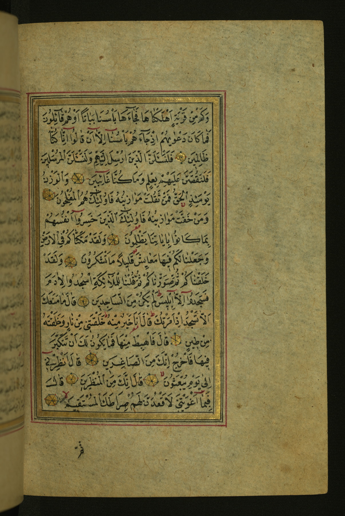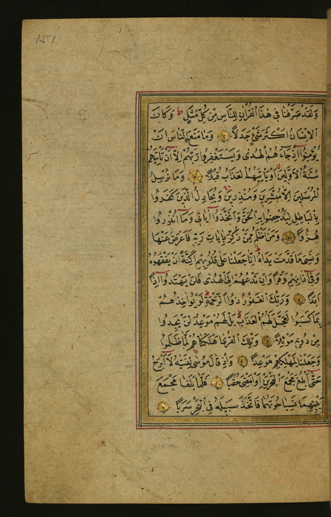 This small, illuminated single-volume copy of the Qurʾan was produced in Ottoman Turkey in 1282 AH / 1865-6 CE by Muḥammad ibn Muṣṭafá Izmīrī, a pupil of al-Rudūsī. The colophon in ijāzah script indicates that the present codex is the twenty-first copy executed by him (fol. 304b). The manuscript opens with an illuminated double-page incipit with the verses of chapters 1 (Sūrat al-fātiḥah) and 2 (Sūrat al-baqarah) (fols. 1b-2a). The text is written in naskh script in black ink with reading marks in red. Verses are separated by illuminated discs with colored dots and chapter headings are in riqāʿ script in white ink. Polychrome medallions in the margins indicate textual divisions and prostration. The binding of black leather is contemporary with the manuscript and decorated with a tooled and gold-painted geometric design enclosed by gold frames on the upper and lower boards.