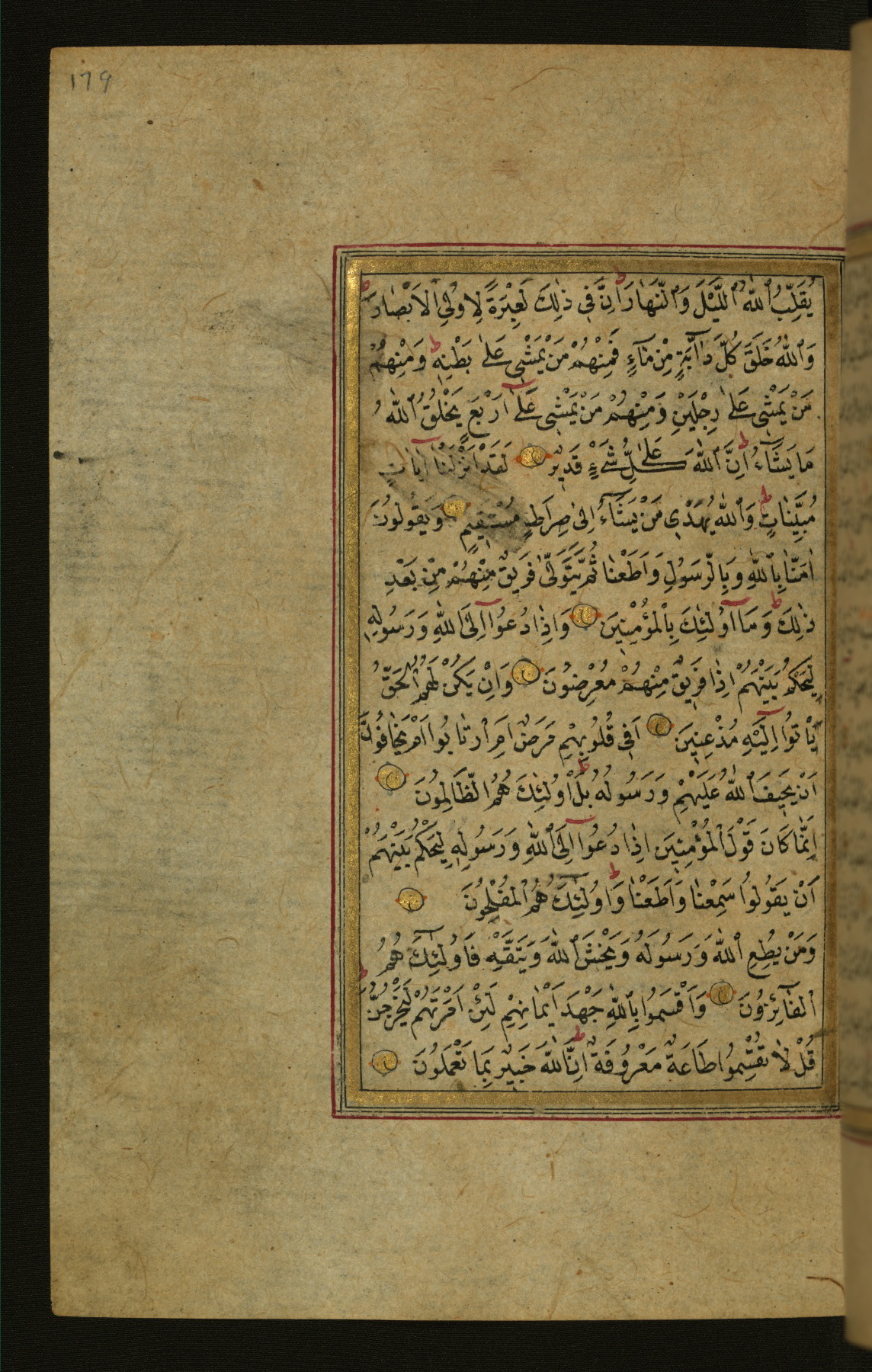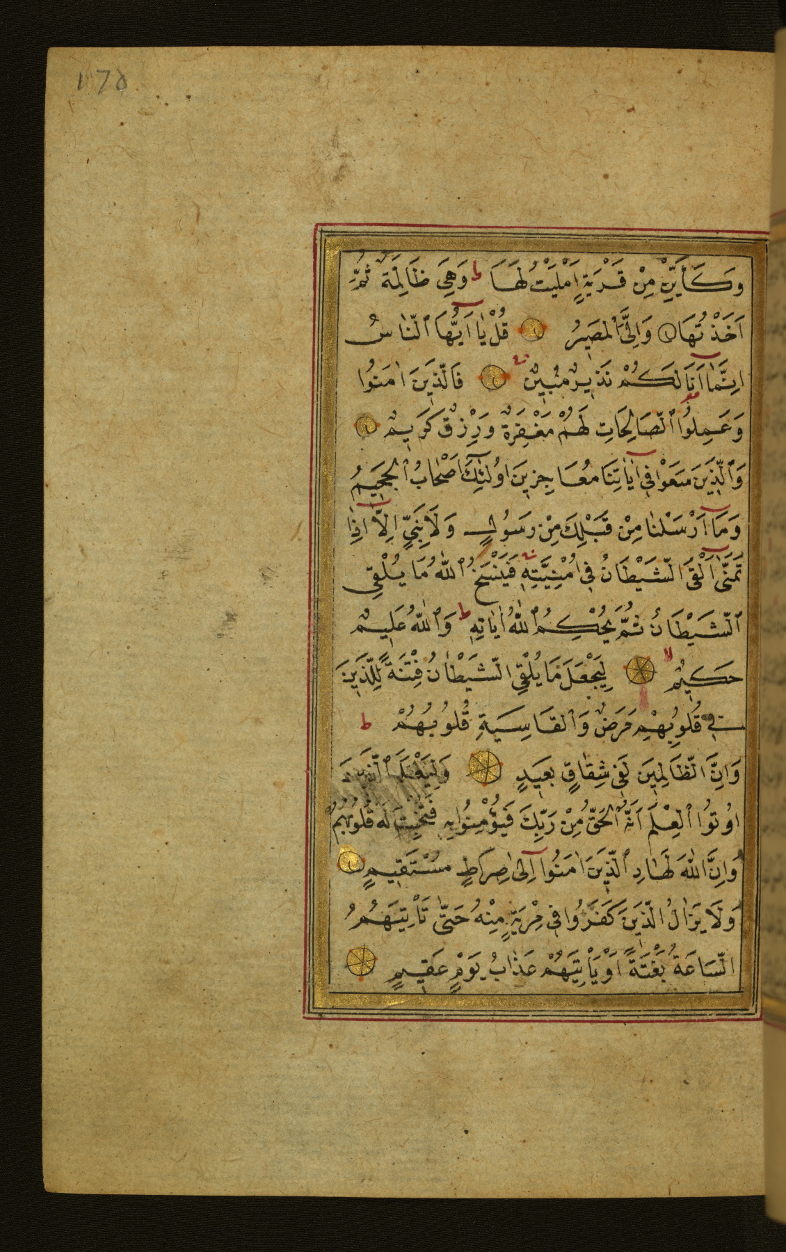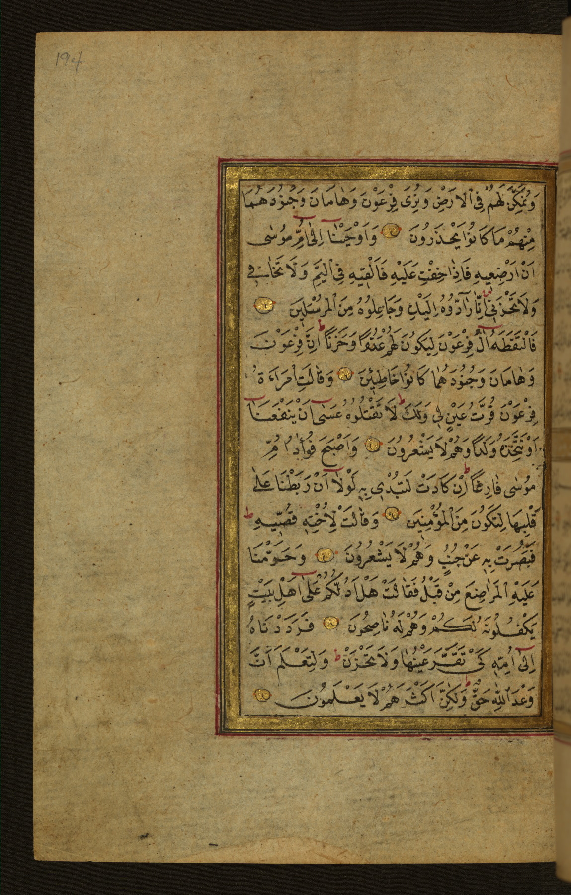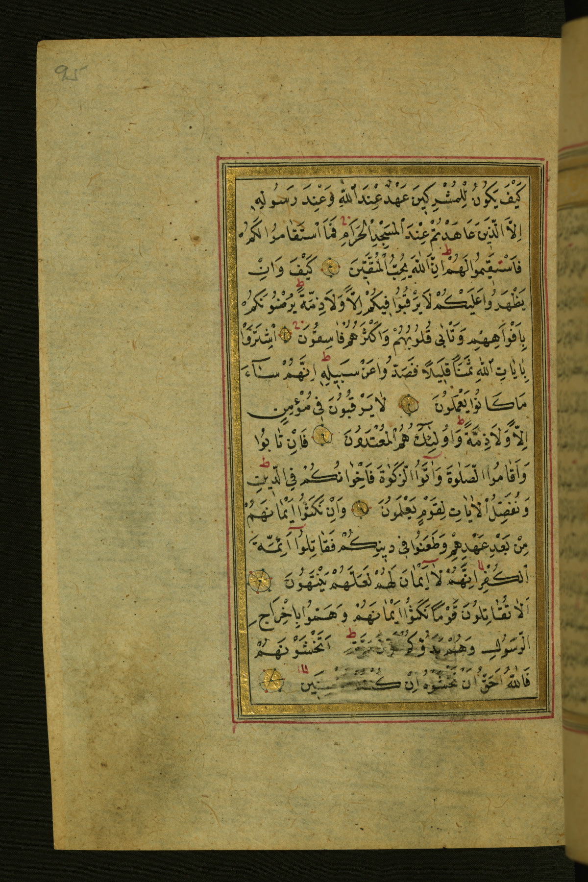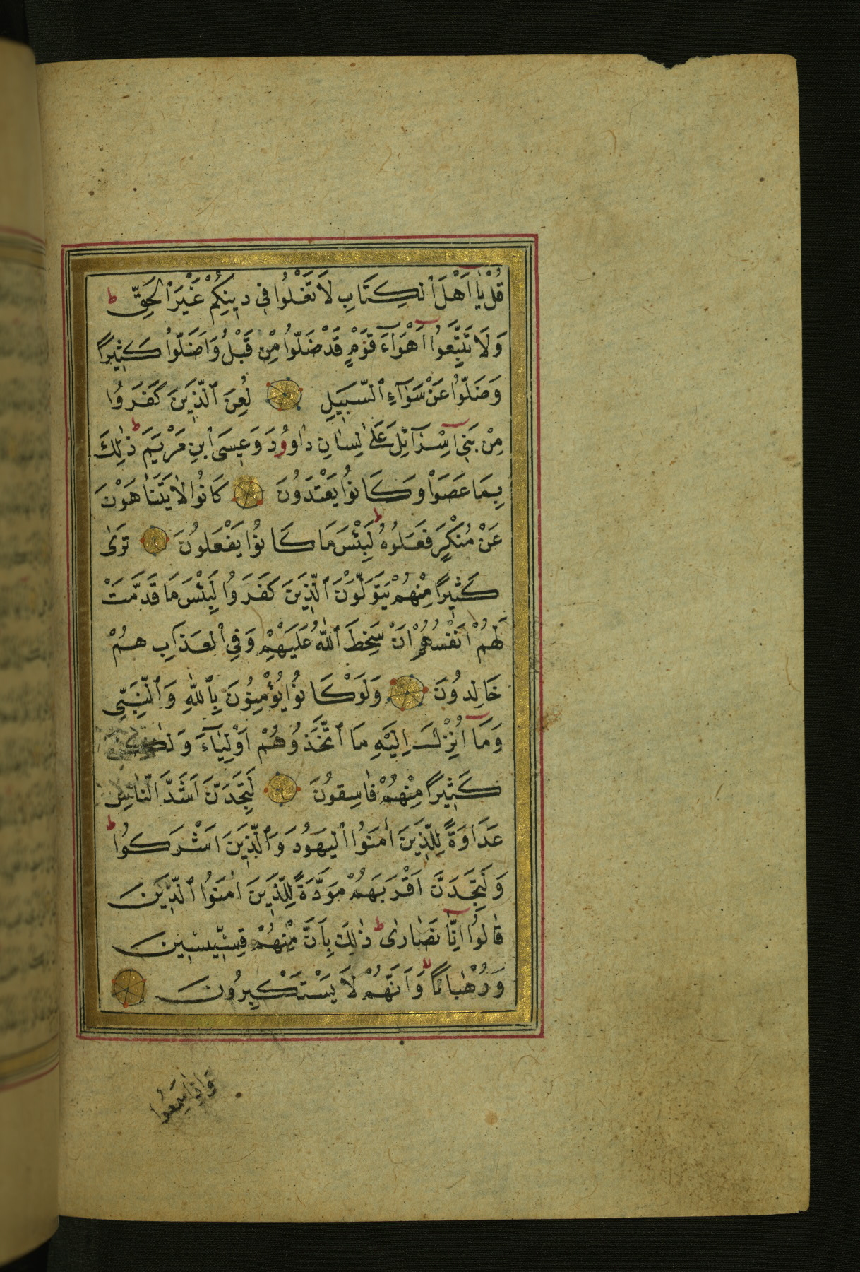 This small, illuminated single-volume copy of the Qurʾan was produced in Ottoman Turkey in 1282 AH / 1865-6 CE by Muḥammad ibn Muṣṭafá Izmīrī, a pupil of al-Rudūsī. The colophon in ijāzah script indicates that the present codex is the twenty-first copy executed by him (fol. 304b). The manuscript opens with an illuminated double-page incipit with the verses of chapters 1 (Sūrat al-fātiḥah) and 2 (Sūrat al-baqarah) (fols. 1b-2a). The text is written in naskh script in black ink with reading marks in red. Verses are separated by illuminated discs with colored dots and chapter headings are in riqāʿ script in white ink. Polychrome medallions in the margins indicate textual divisions and prostration. The binding of black leather is contemporary with the manuscript and decorated with a tooled and gold-painted geometric design enclosed by gold frames on the upper and lower boards.