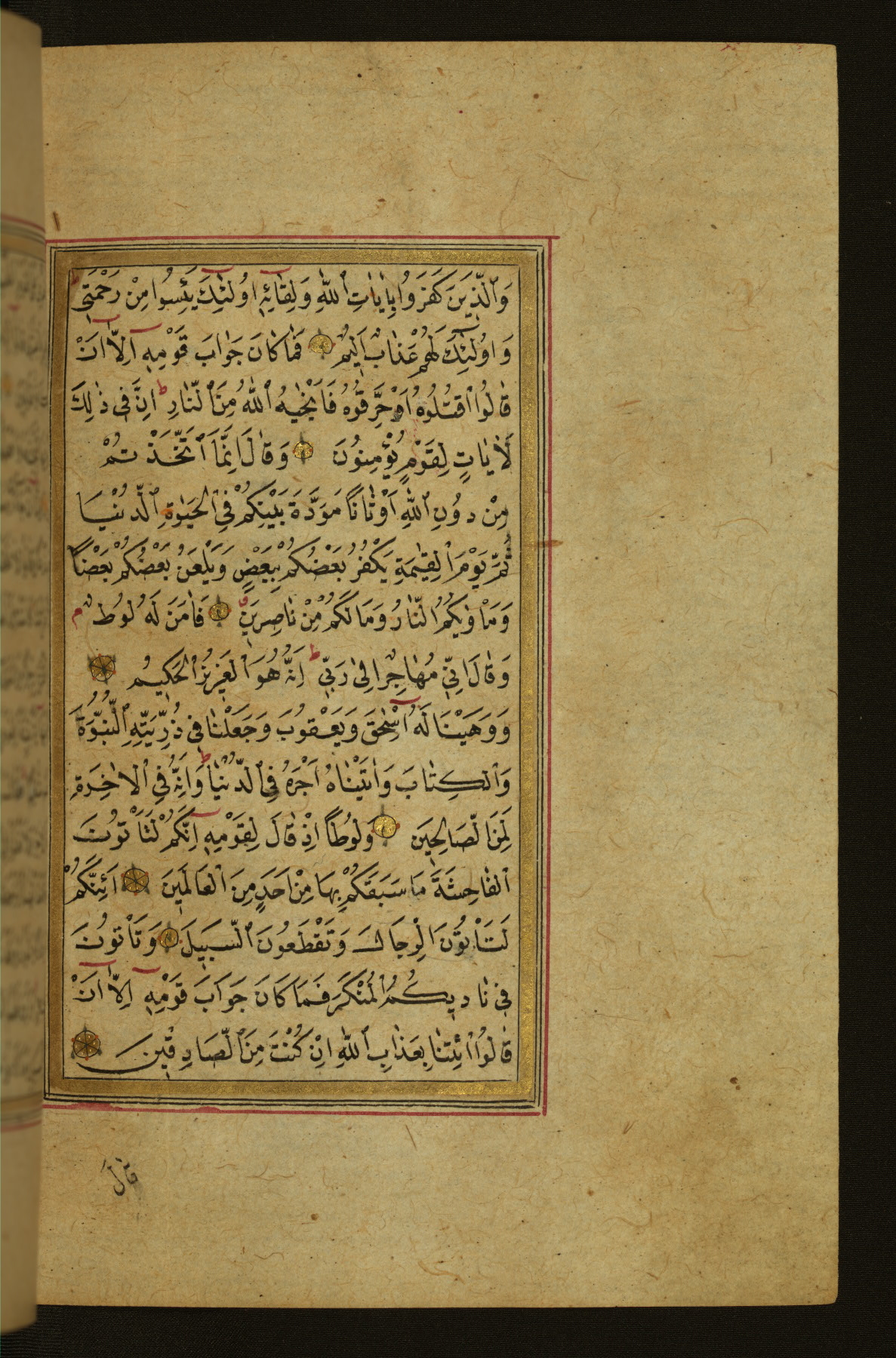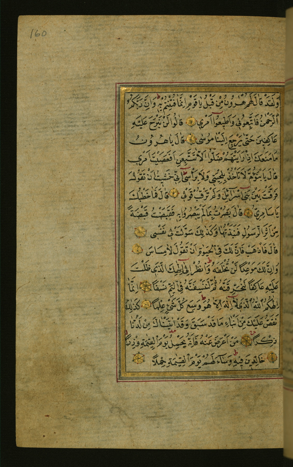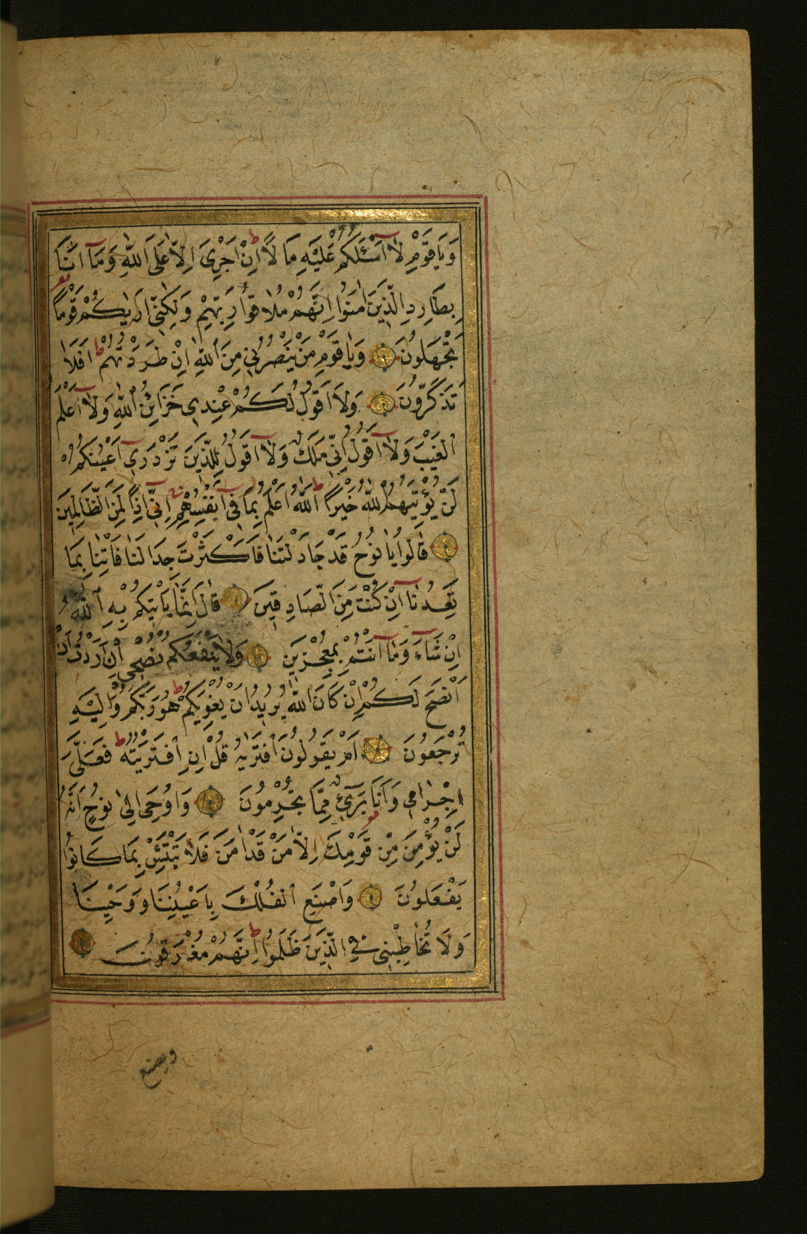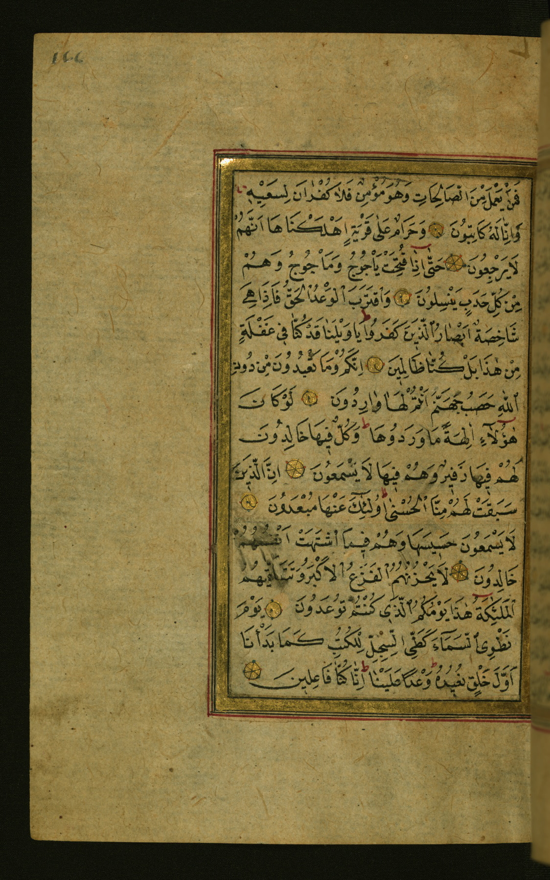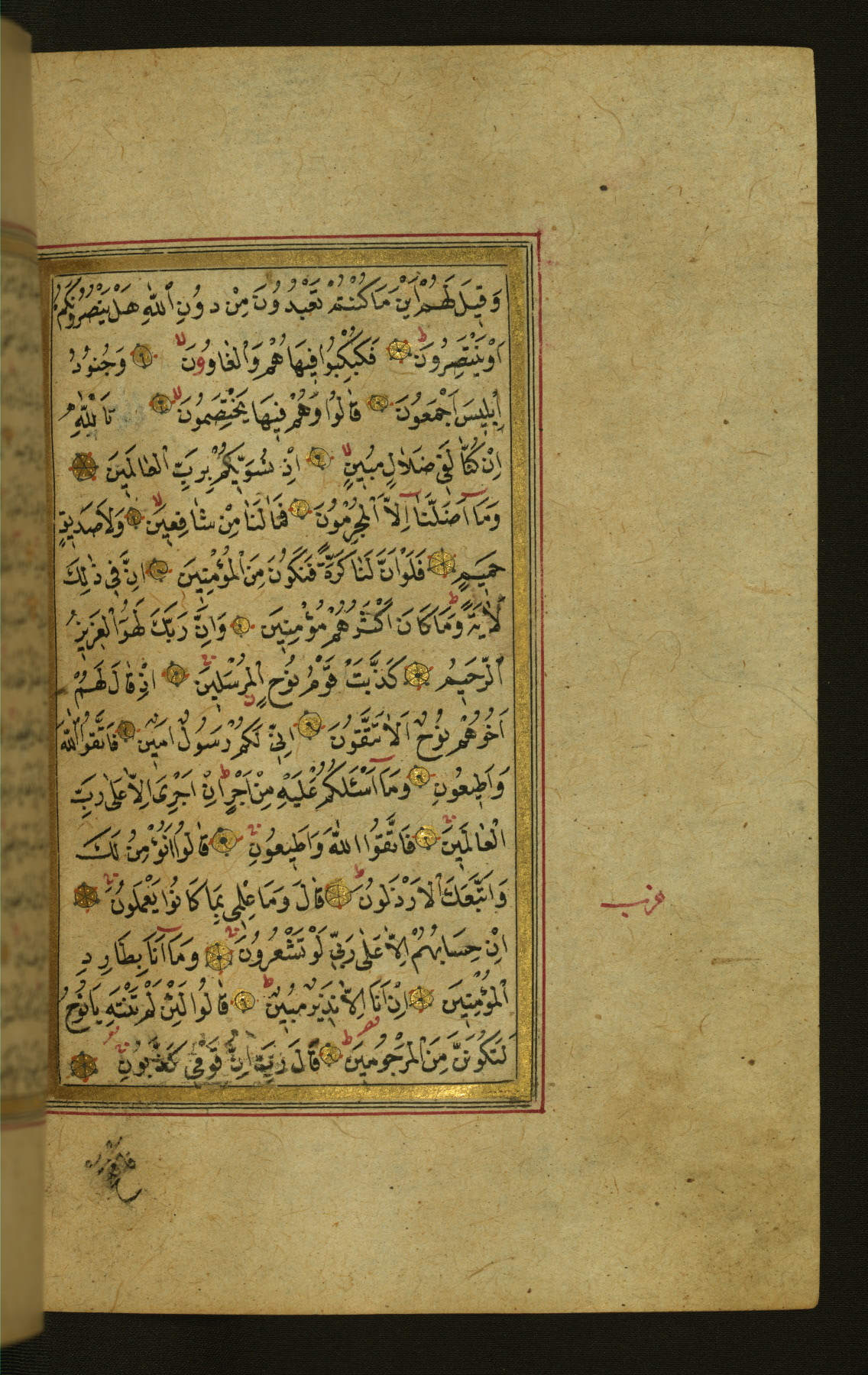 This small, illuminated single-volume copy of the Qurʾan was produced in Ottoman Turkey in 1282 AH / 1865-6 CE by Muḥammad ibn Muṣṭafá Izmīrī, a pupil of al-Rudūsī. The colophon in ijāzah script indicates that the present codex is the twenty-first copy executed by him (fol. 304b). The manuscript opens with an illuminated double-page incipit with the verses of chapters 1 (Sūrat al-fātiḥah) and 2 (Sūrat al-baqarah) (fols. 1b-2a). The text is written in naskh script in black ink with reading marks in red. Verses are separated by illuminated discs with colored dots and chapter headings are in riqāʿ script in white ink. Polychrome medallions in the margins indicate textual divisions and prostration. The binding of black leather is contemporary with the manuscript and decorated with a tooled and gold-painted geometric design enclosed by gold frames on the upper and lower boards.
