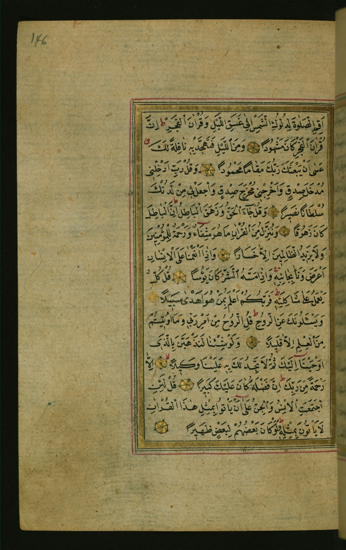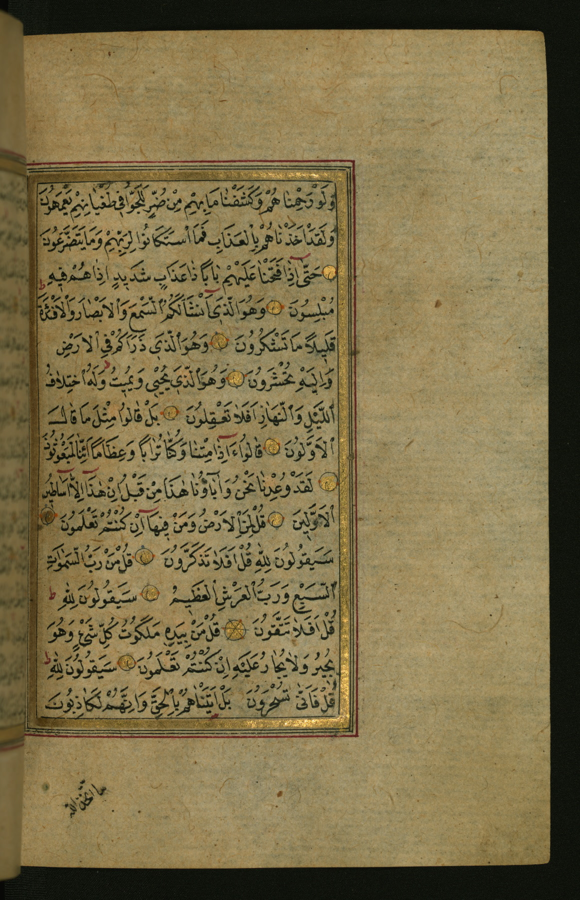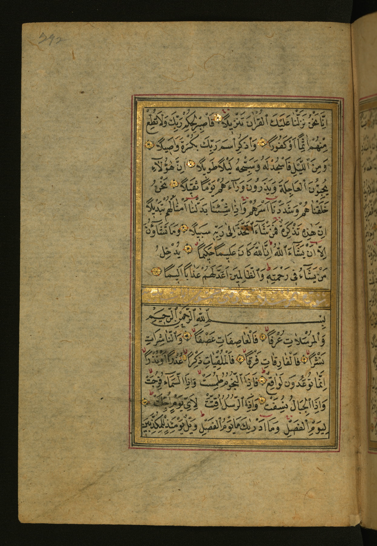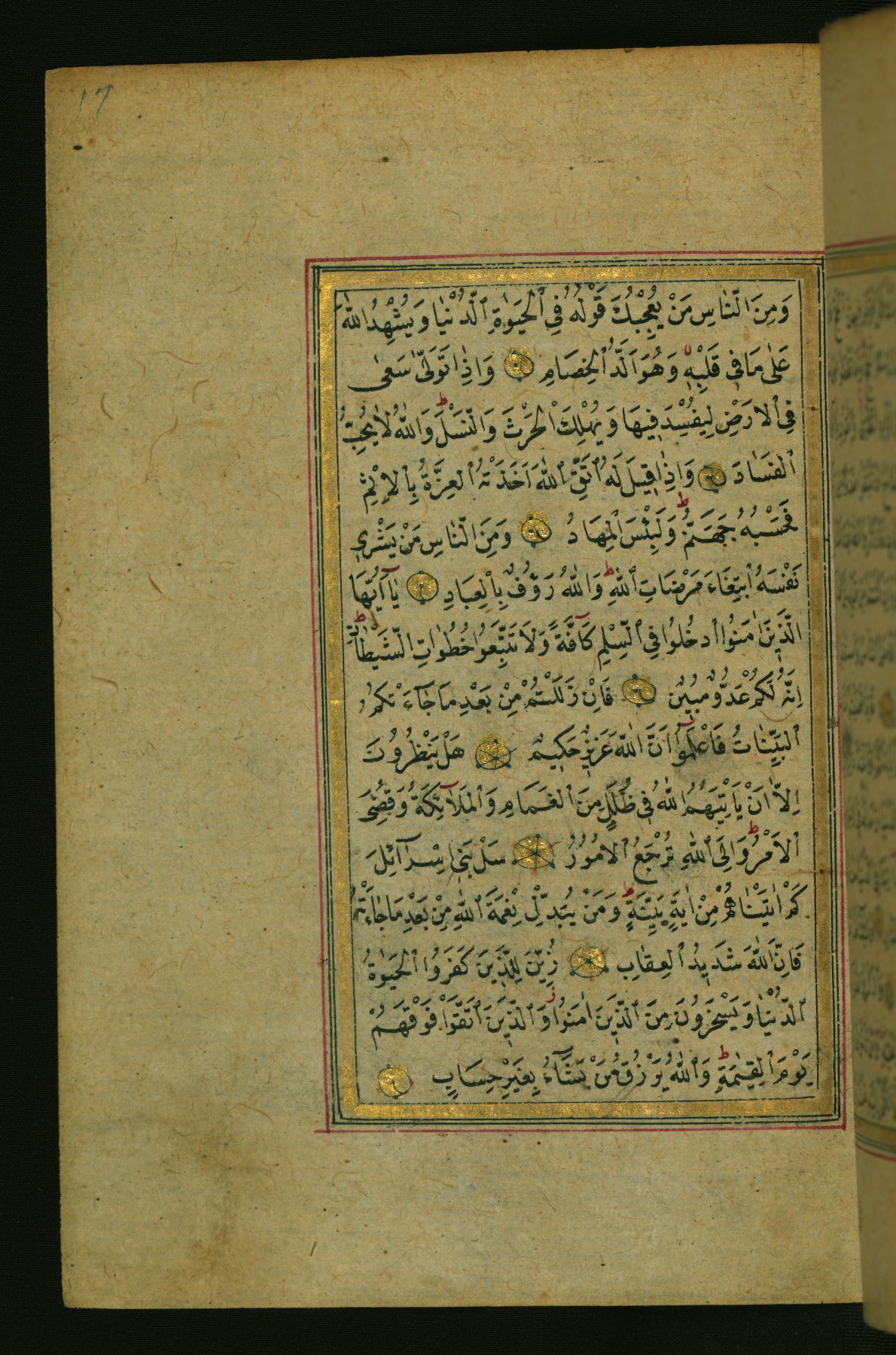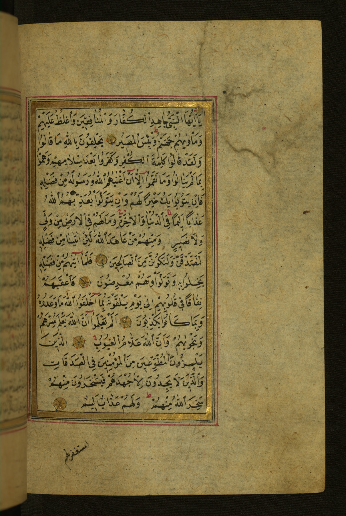 This small, illuminated single-volume copy of the Qurʾan was produced in Ottoman Turkey in 1282 AH / 1865-6 CE by Muḥammad ibn Muṣṭafá Izmīrī, a pupil of al-Rudūsī. The colophon in ijāzah script indicates that the present codex is the twenty-first copy executed by him (fol. 304b). The manuscript opens with an illuminated double-page incipit with the verses of chapters 1 (Sūrat al-fātiḥah) and 2 (Sūrat al-baqarah) (fols. 1b-2a). The text is written in naskh script in black ink with reading marks in red. Verses are separated by illuminated discs with colored dots and chapter headings are in riqāʿ script in white ink. Polychrome medallions in the margins indicate textual divisions and prostration. The binding of black leather is contemporary with the manuscript and decorated with a tooled and gold-painted geometric design enclosed by gold frames on the upper and lower boards.