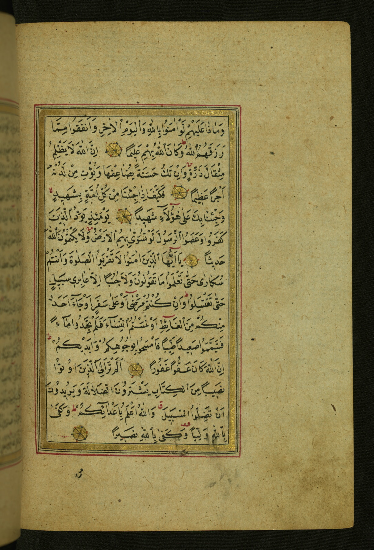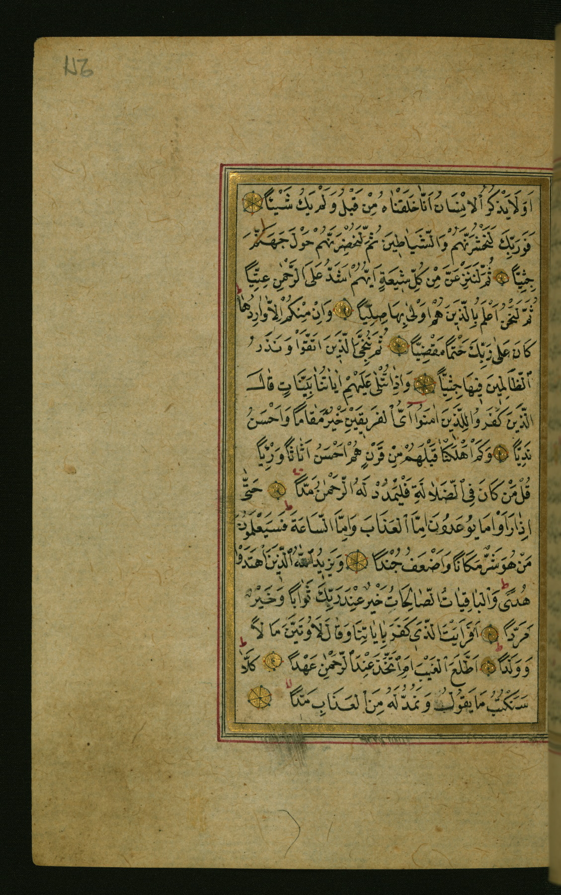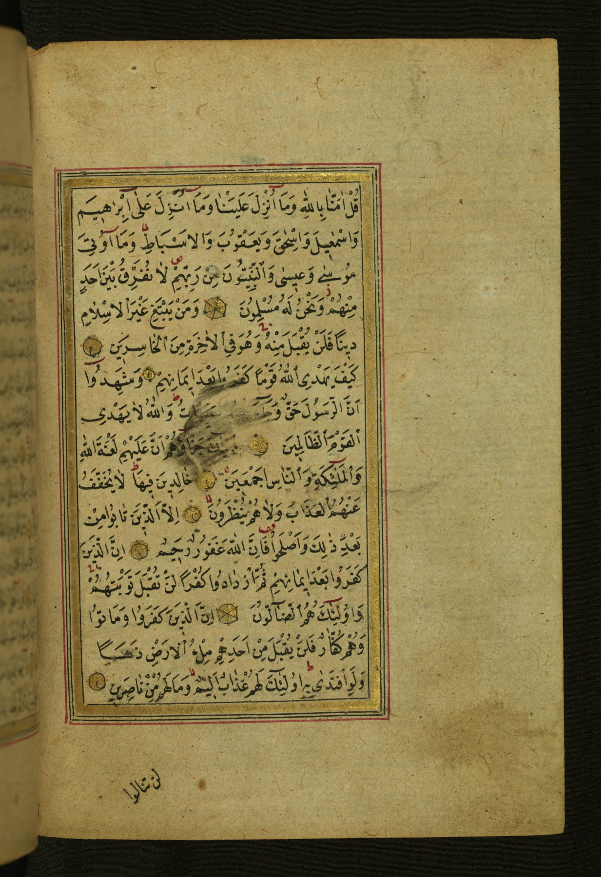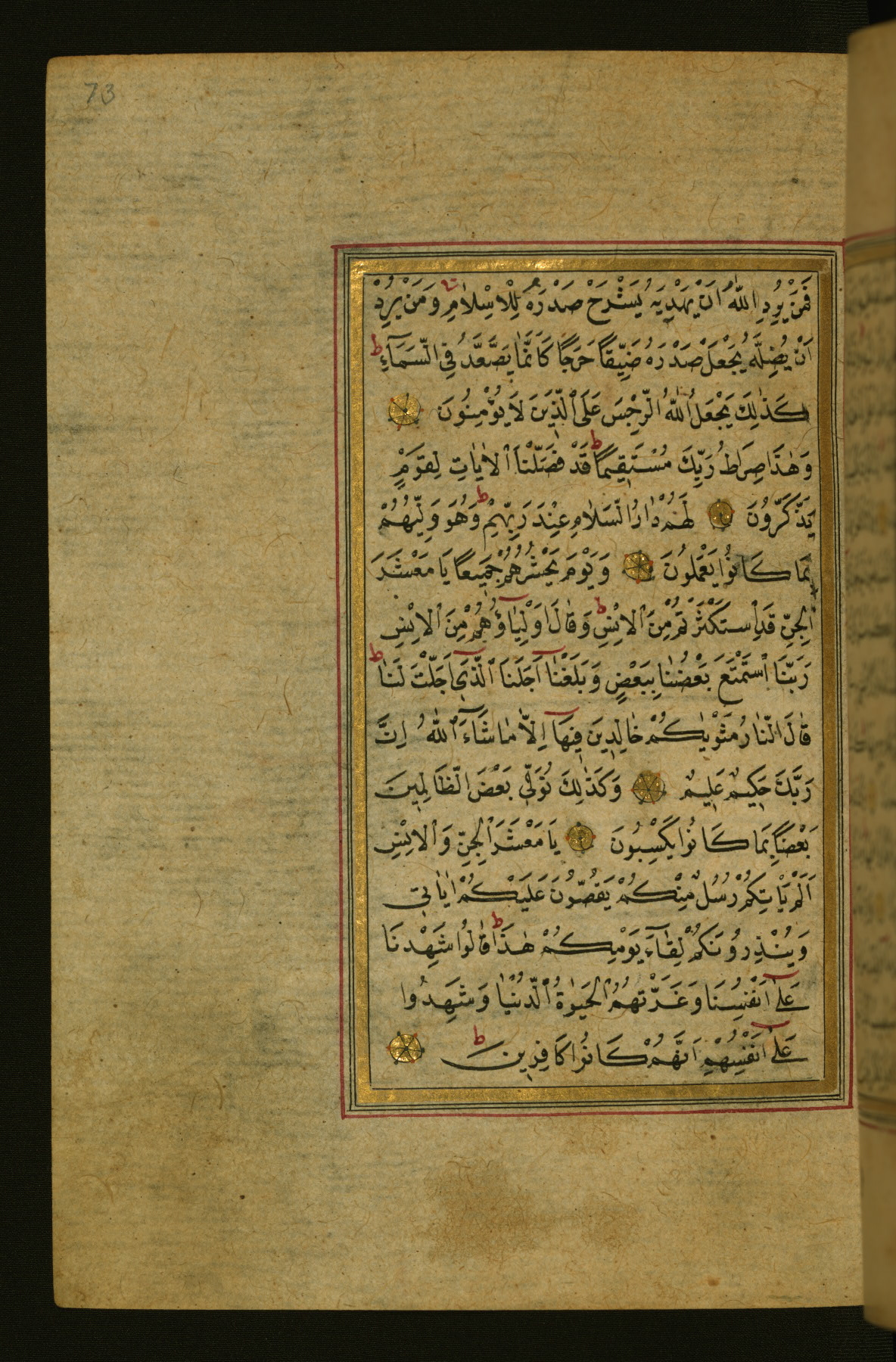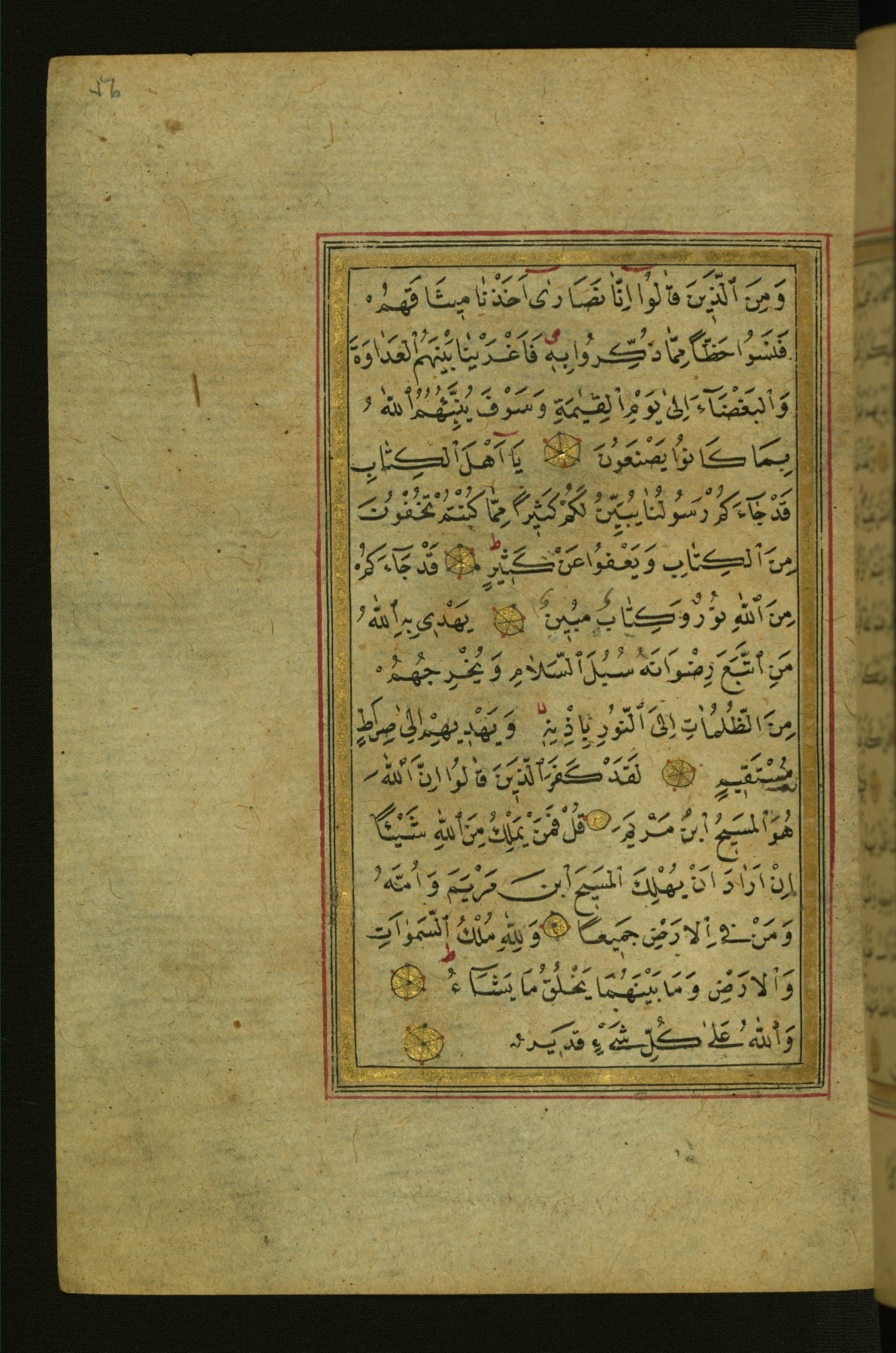 This small, illuminated single-volume copy of the Qurʾan was produced in Ottoman Turkey in 1282 AH / 1865-6 CE by Muḥammad ibn Muṣṭafá Izmīrī, a pupil of al-Rudūsī. The colophon in ijāzah script indicates that the present codex is the twenty-first copy executed by him (fol. 304b). The manuscript opens with an illuminated double-page incipit with the verses of chapters 1 (Sūrat al-fātiḥah) and 2 (Sūrat al-baqarah) (fols. 1b-2a). The text is written in naskh script in black ink with reading marks in red. Verses are separated by illuminated discs with colored dots and chapter headings are in riqāʿ script in white ink. Polychrome medallions in the margins indicate textual divisions and prostration. The binding of black leather is contemporary with the manuscript and decorated with a tooled and gold-painted geometric design enclosed by gold frames on the upper and lower boards.