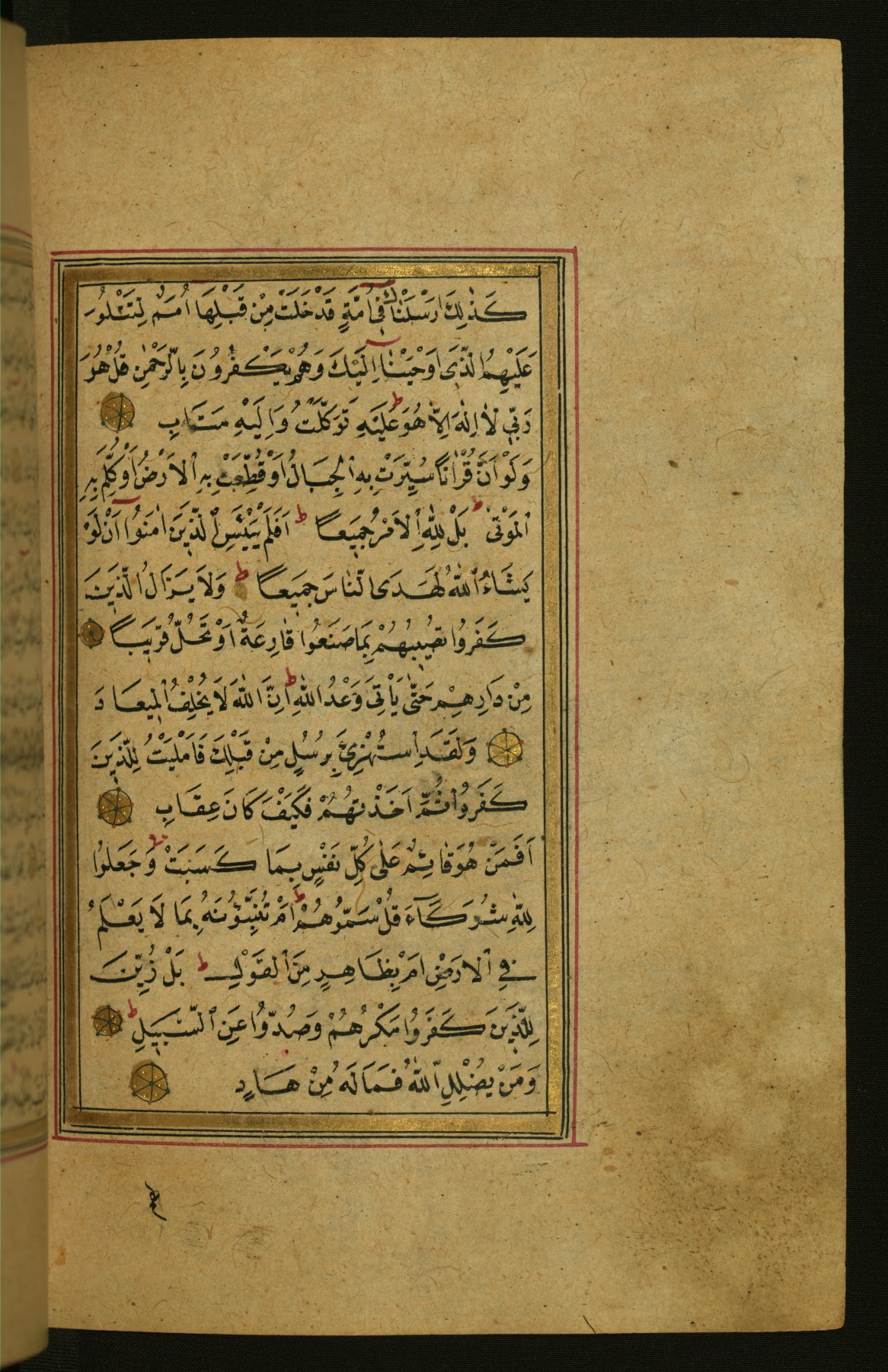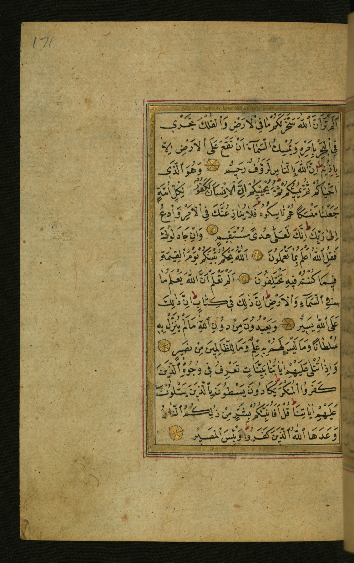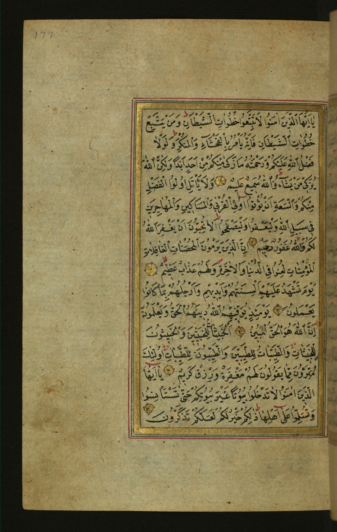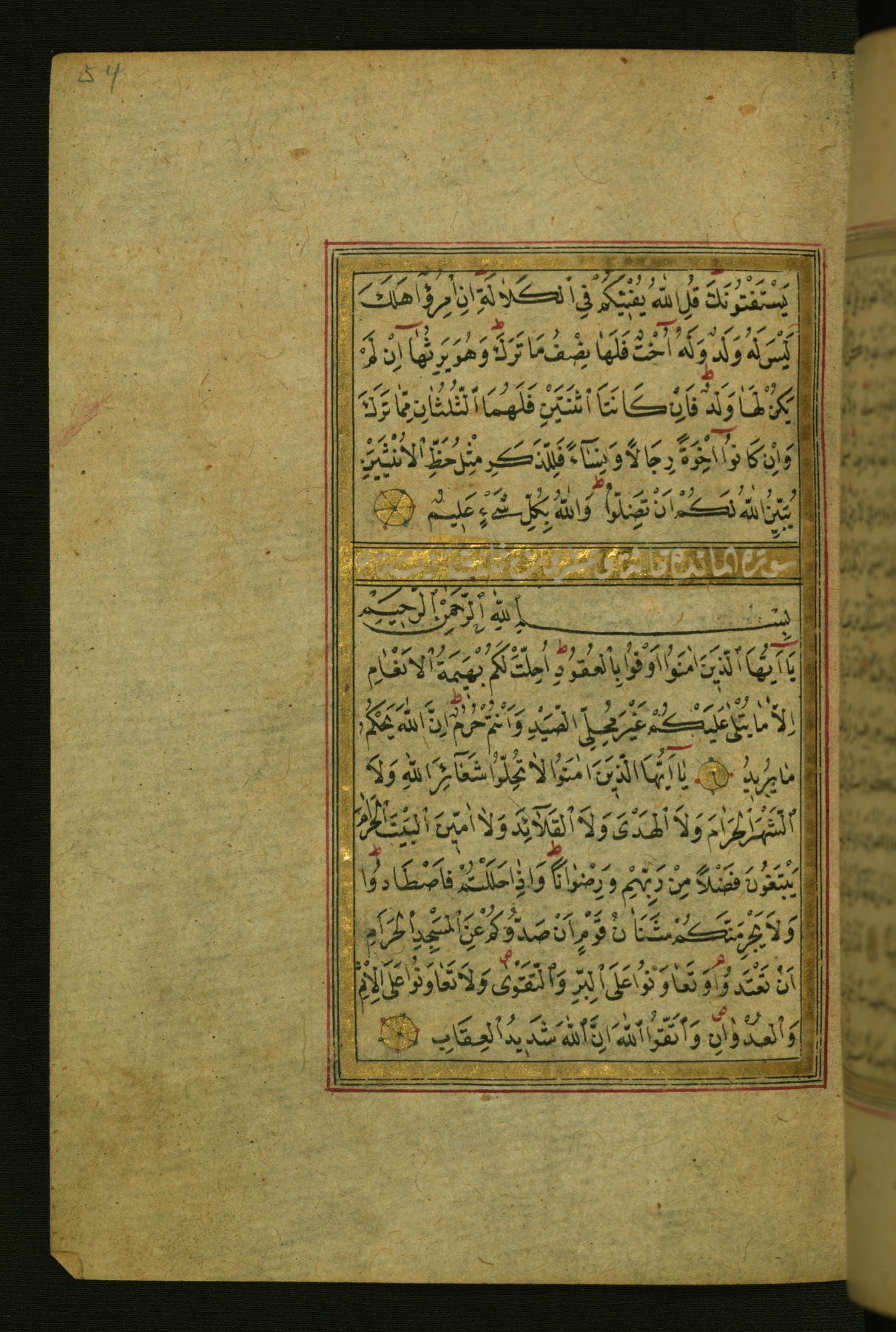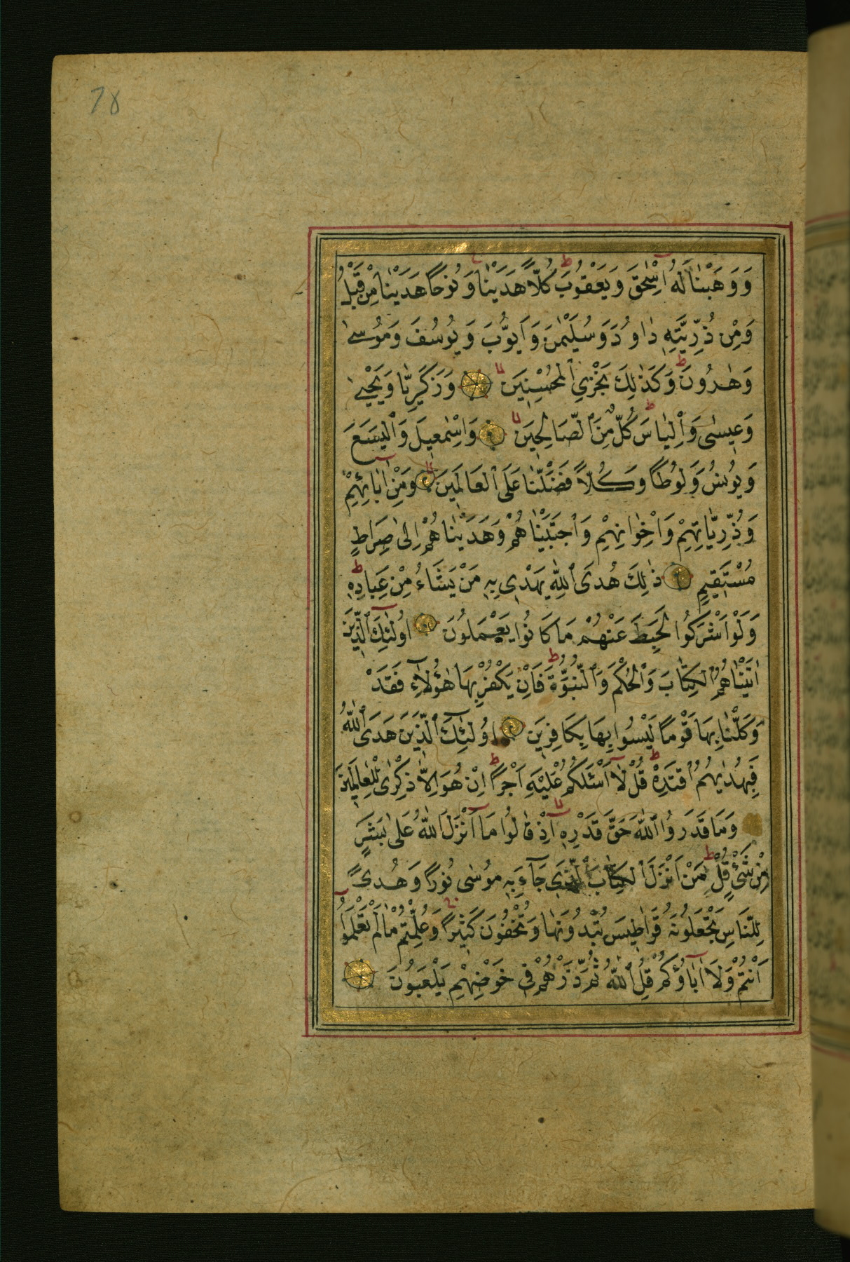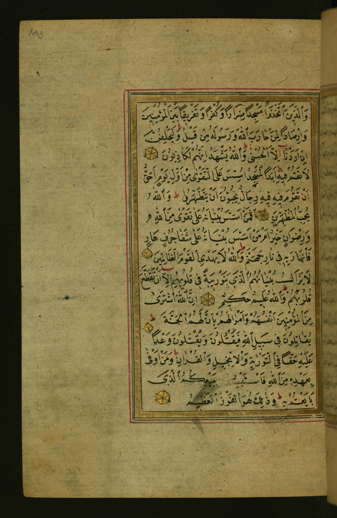 This small, illuminated single-volume copy of the Qurʾan was produced in Ottoman Turkey in 1282 AH / 1865-6 CE by Muḥammad ibn Muṣṭafá Izmīrī, a pupil of al-Rudūsī. The colophon in ijāzah script indicates that the present codex is the twenty-first copy executed by him (fol. 304b). The manuscript opens with an illuminated double-page incipit with the verses of chapters 1 (Sūrat al-fātiḥah) and 2 (Sūrat al-baqarah) (fols. 1b-2a). The text is written in naskh script in black ink with reading marks in red. Verses are separated by illuminated discs with colored dots and chapter headings are in riqāʿ script in white ink. Polychrome medallions in the margins indicate textual divisions and prostration. The binding of black leather is contemporary with the manuscript and decorated with a tooled and gold-painted geometric design enclosed by gold frames on the upper and lower boards.