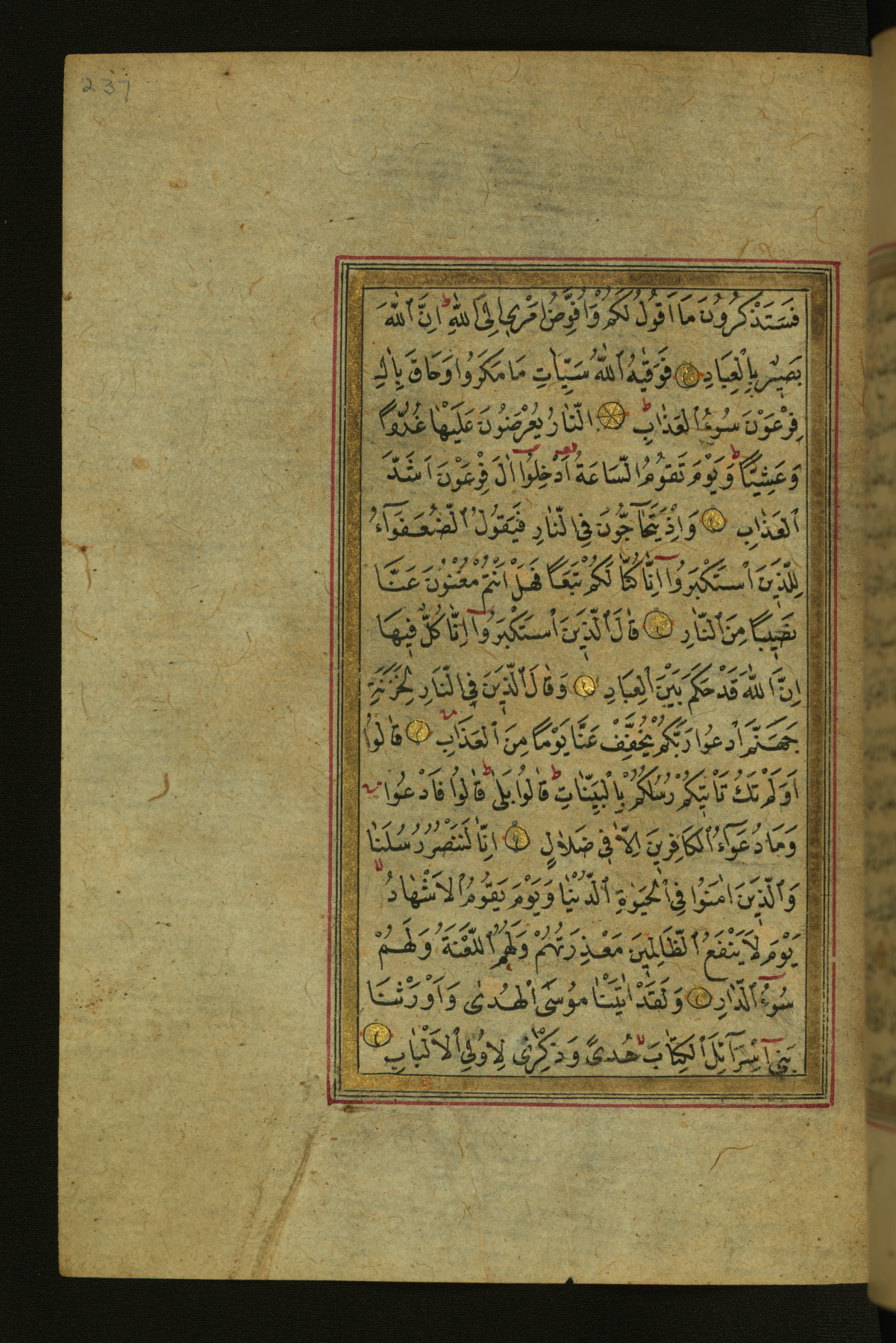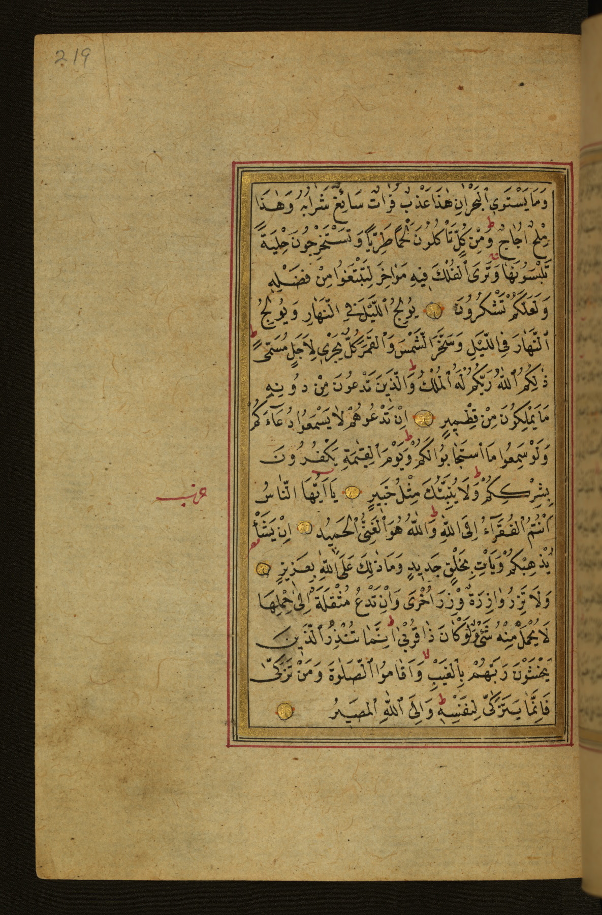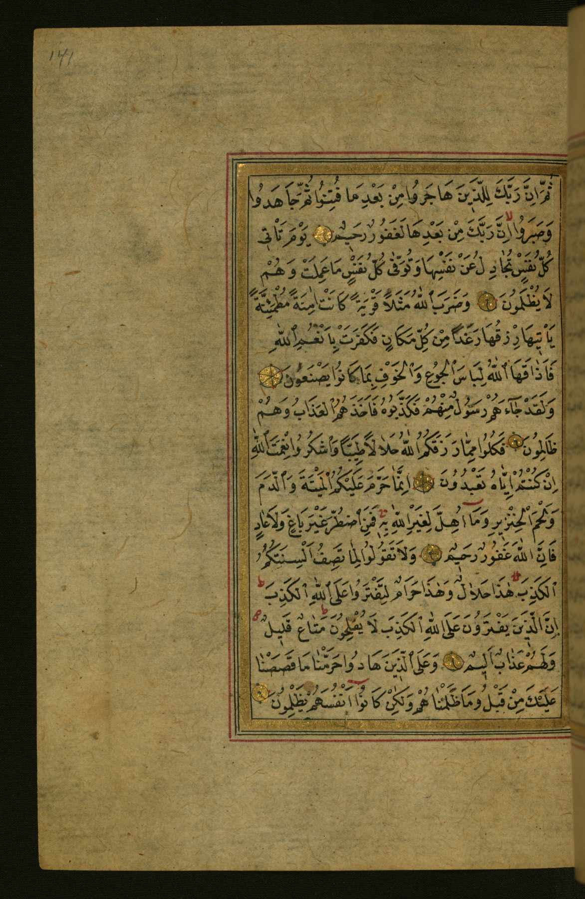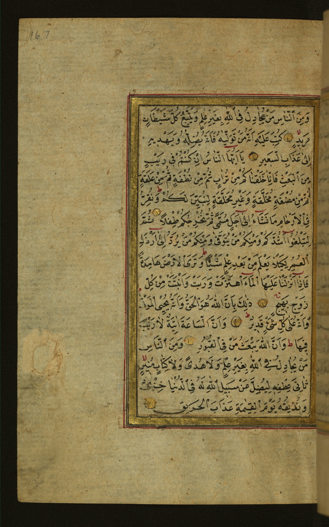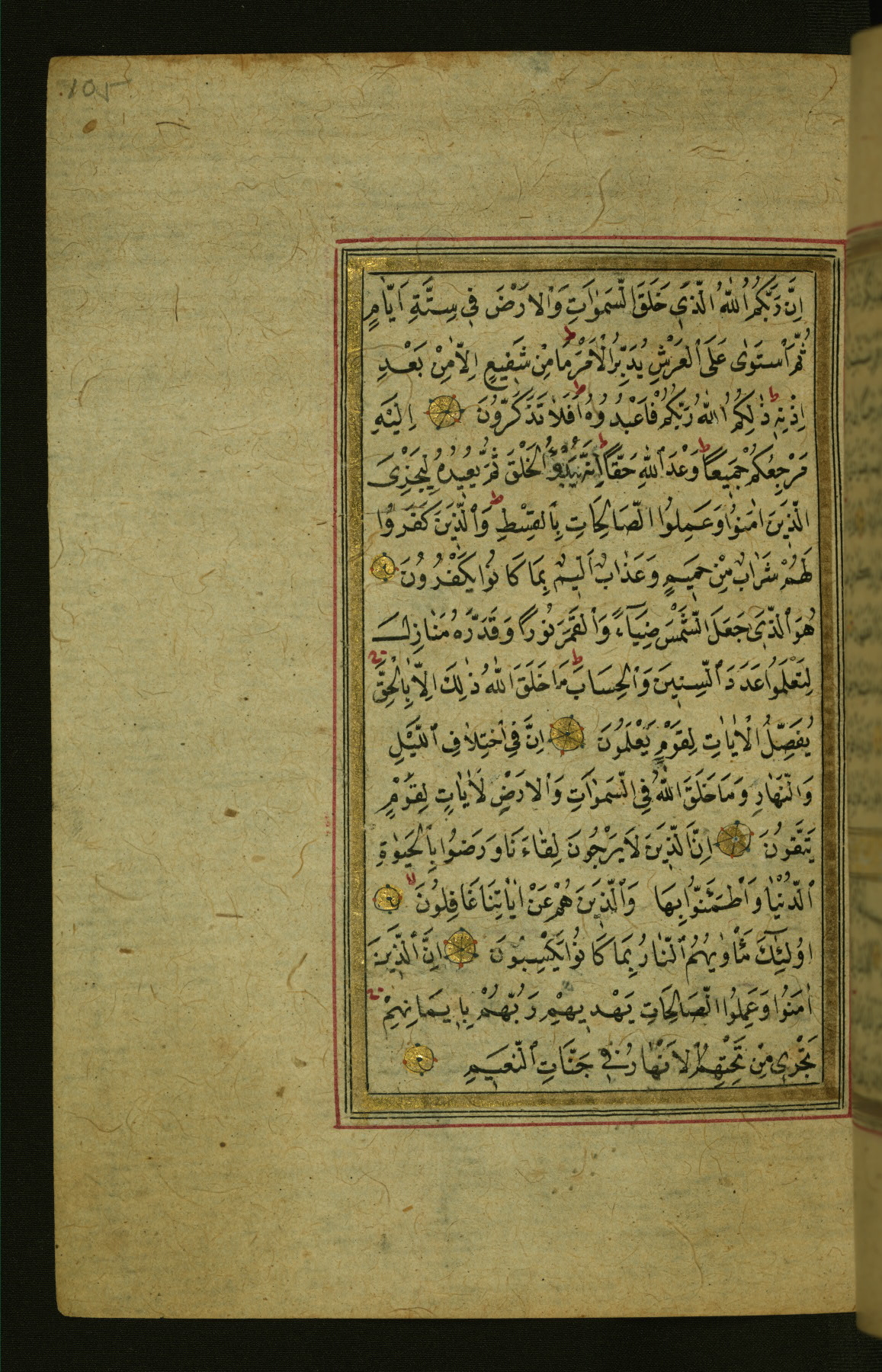 This small, illuminated single-volume copy of the Qurʾan was produced in Ottoman Turkey in 1282 AH / 1865-6 CE by Muḥammad ibn Muṣṭafá Izmīrī, a pupil of al-Rudūsī. The colophon in ijāzah script indicates that the present codex is the twenty-first copy executed by him (fol. 304b). The manuscript opens with an illuminated double-page incipit with the verses of chapters 1 (Sūrat al-fātiḥah) and 2 (Sūrat al-baqarah) (fols. 1b-2a). The text is written in naskh script in black ink with reading marks in red. Verses are separated by illuminated discs with colored dots and chapter headings are in riqāʿ script in white ink. Polychrome medallions in the margins indicate textual divisions and prostration. The binding of black leather is contemporary with the manuscript and decorated with a tooled and gold-painted geometric design enclosed by gold frames on the upper and lower boards.