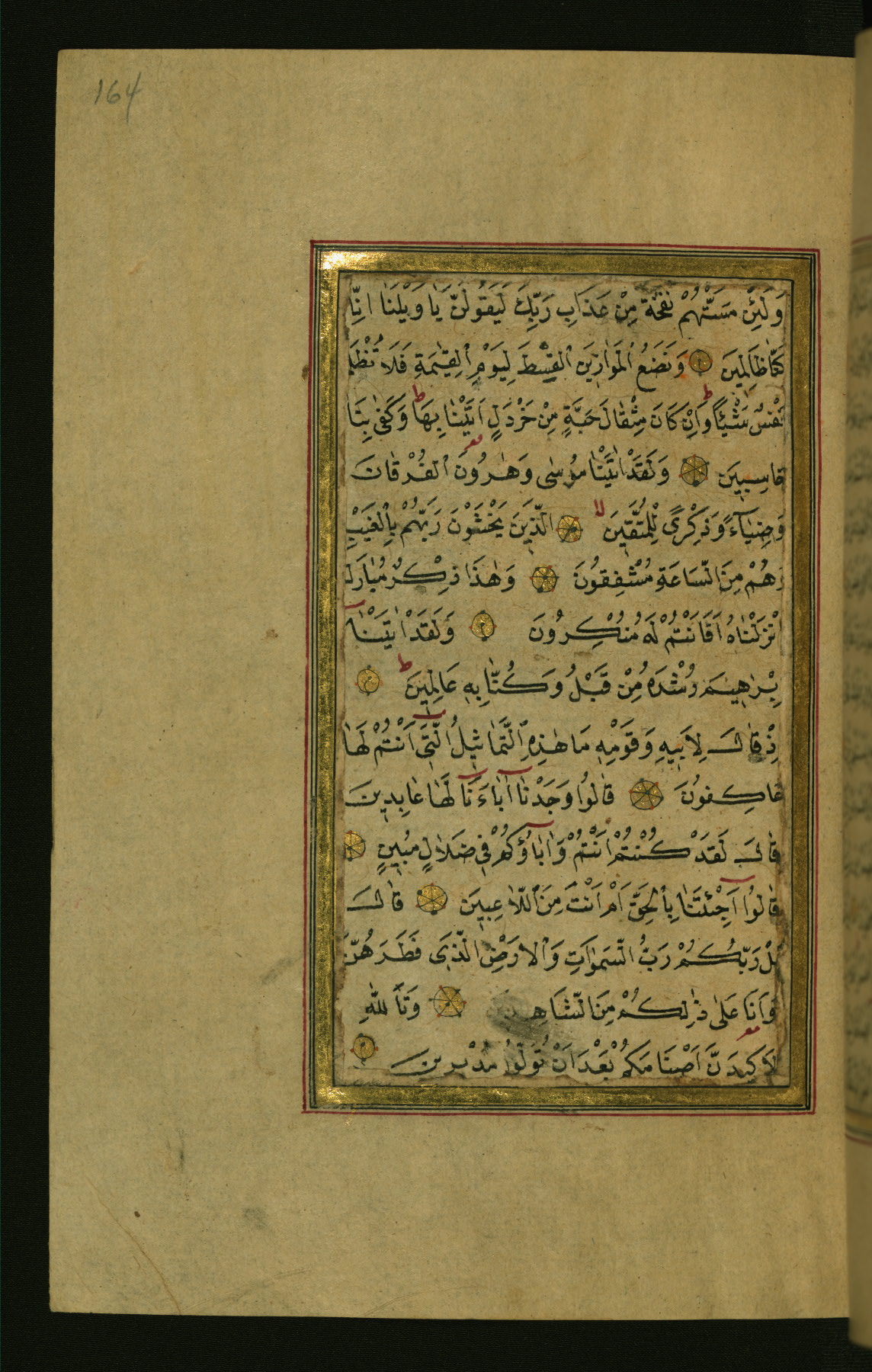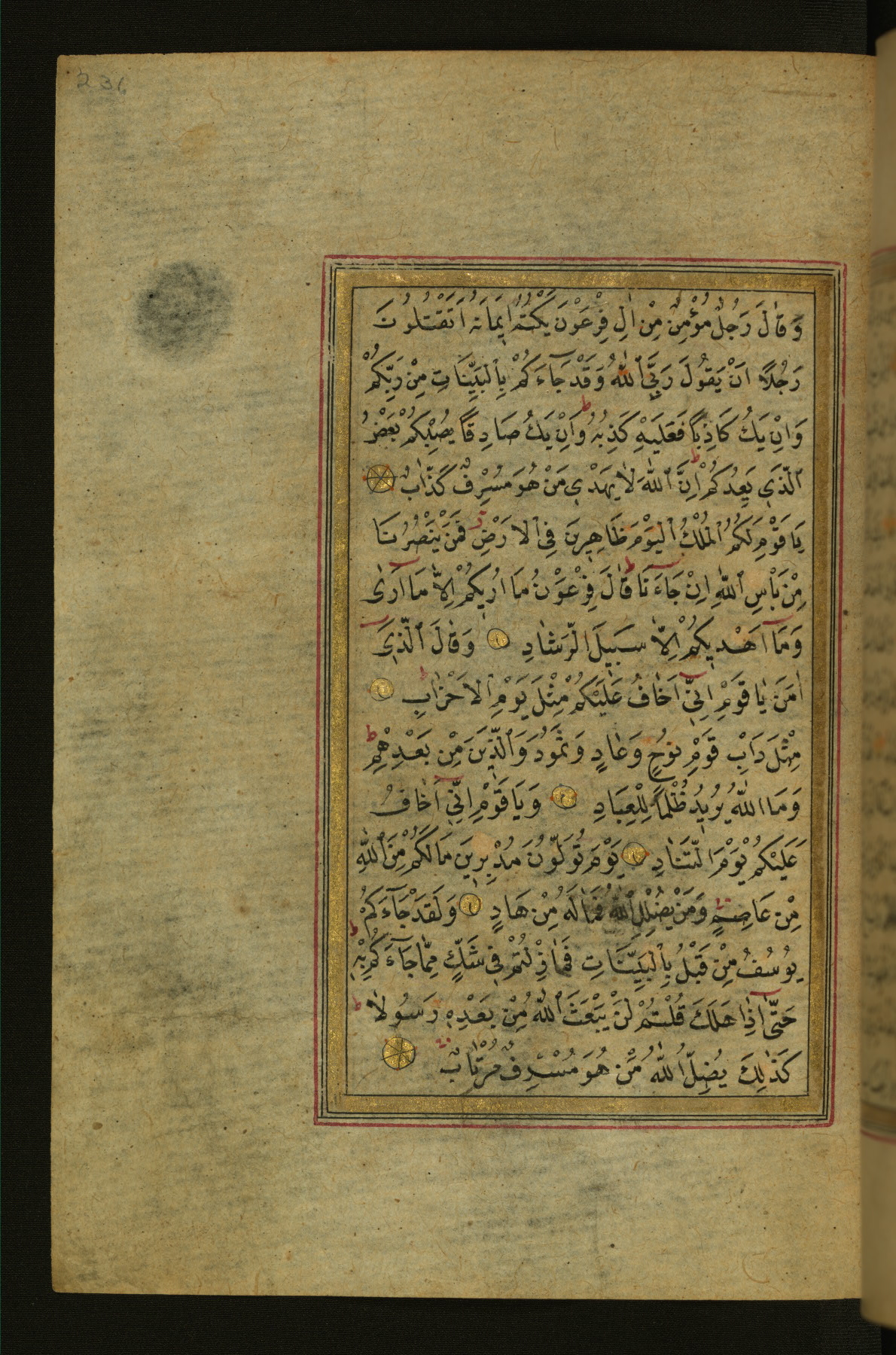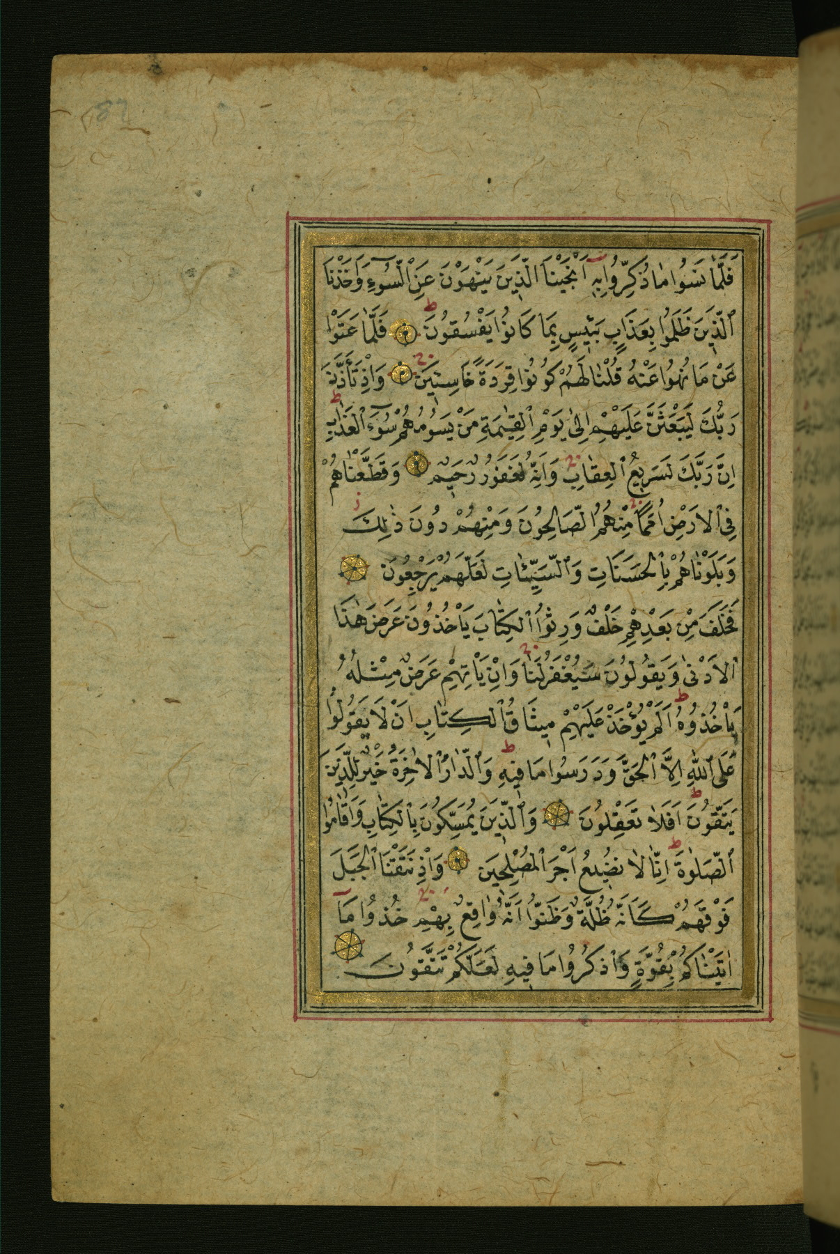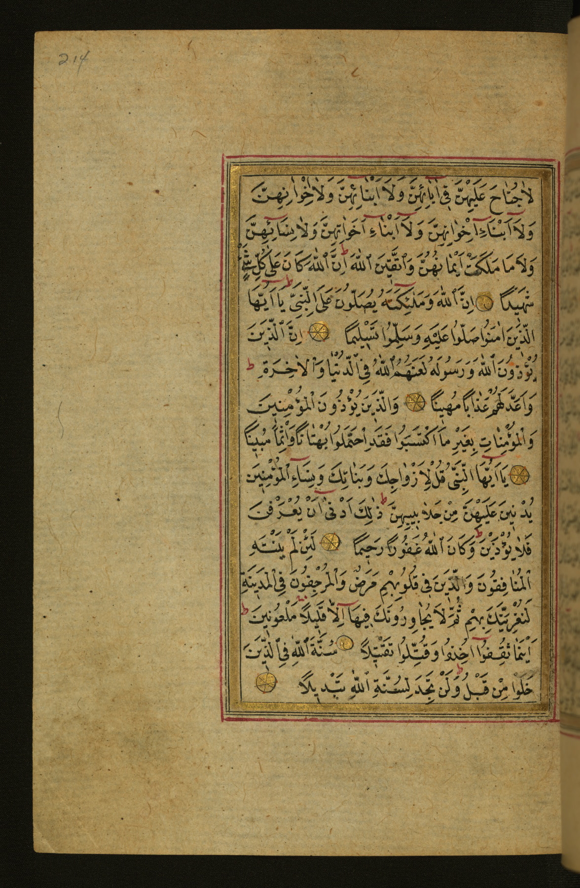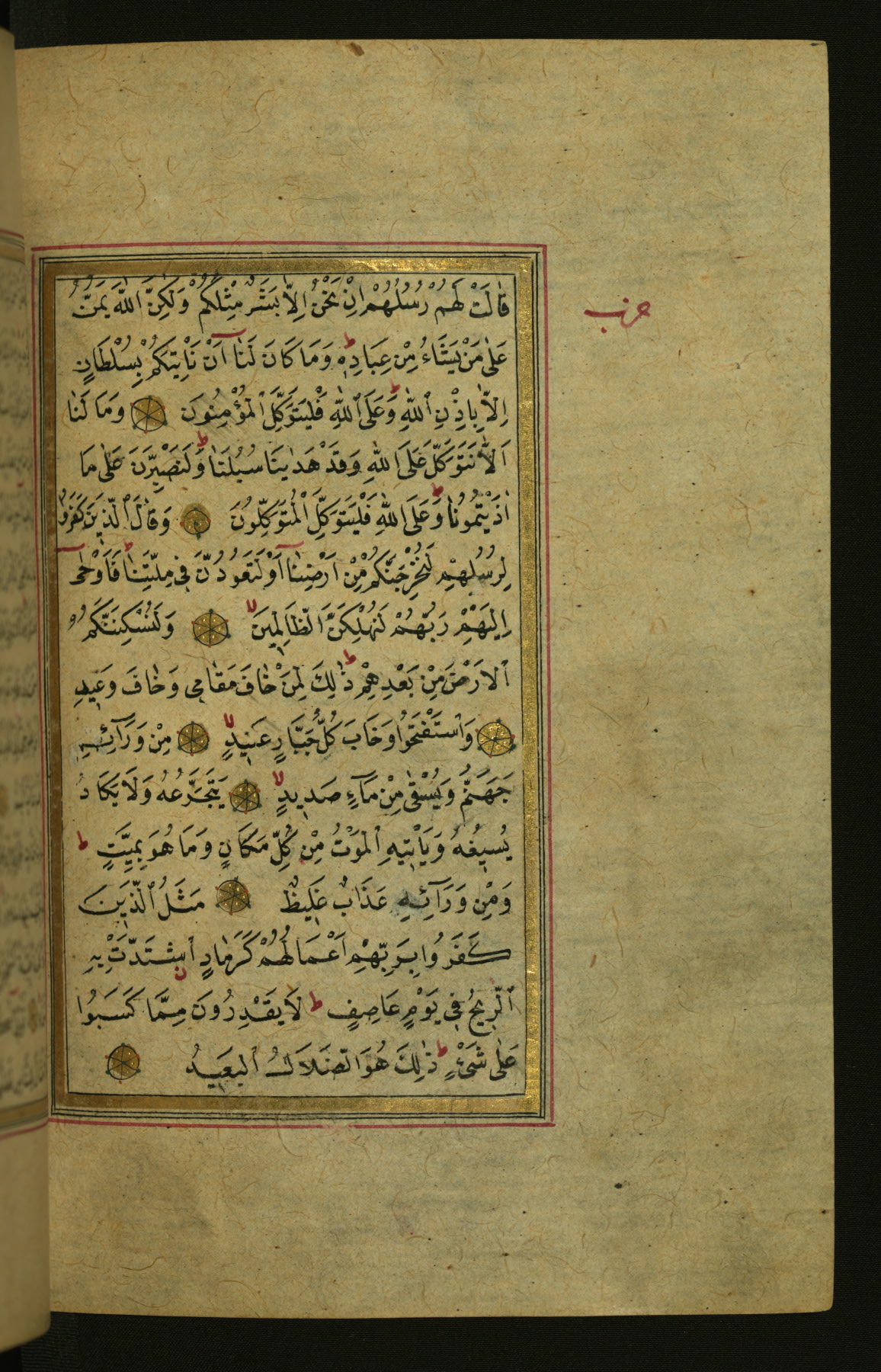 This small, illuminated single-volume copy of the Qurʾan was produced in Ottoman Turkey in 1282 AH / 1865-6 CE by Muḥammad ibn Muṣṭafá Izmīrī, a pupil of al-Rudūsī. The colophon in ijāzah script indicates that the present codex is the twenty-first copy executed by him (fol. 304b). The manuscript opens with an illuminated double-page incipit with the verses of chapters 1 (Sūrat al-fātiḥah) and 2 (Sūrat al-baqarah) (fols. 1b-2a). The text is written in naskh script in black ink with reading marks in red. Verses are separated by illuminated discs with colored dots and chapter headings are in riqāʿ script in white ink. Polychrome medallions in the margins indicate textual divisions and prostration. The binding of black leather is contemporary with the manuscript and decorated with a tooled and gold-painted geometric design enclosed by gold frames on the upper and lower boards.