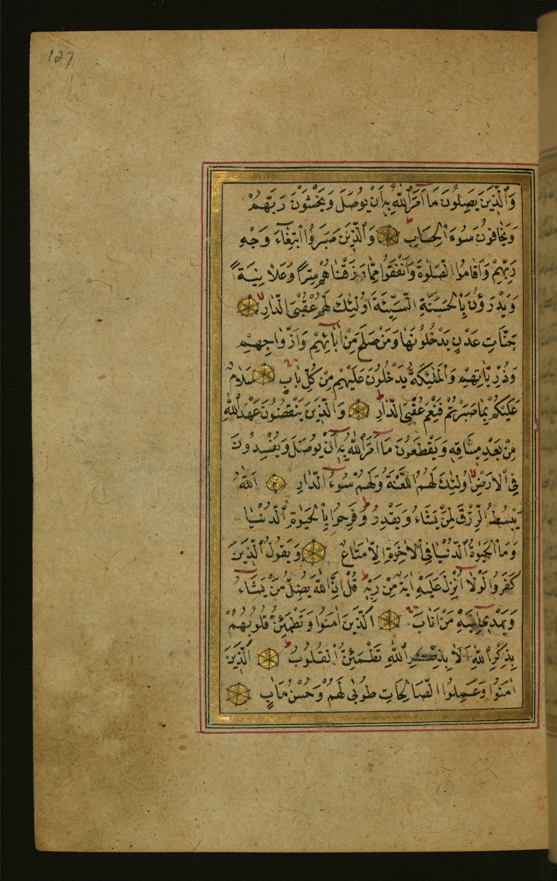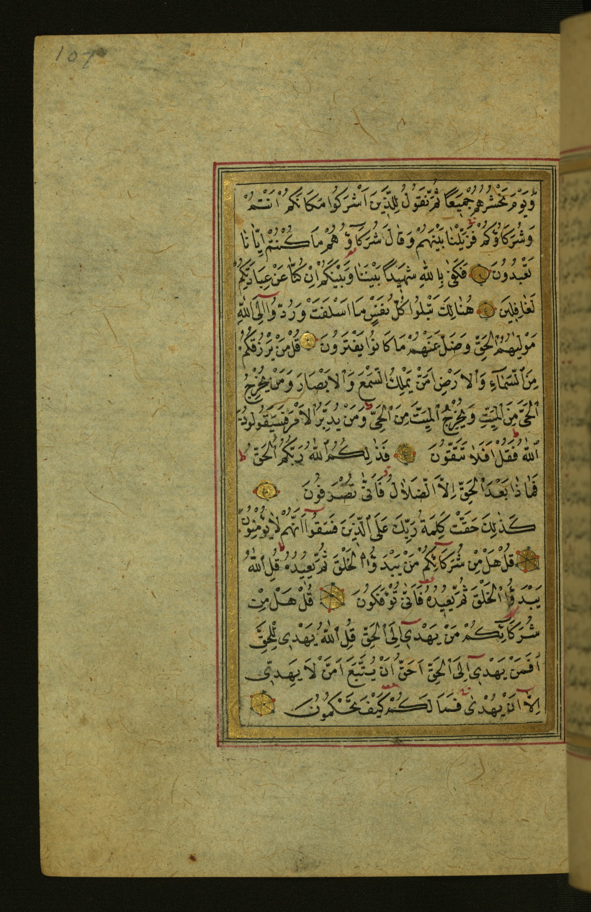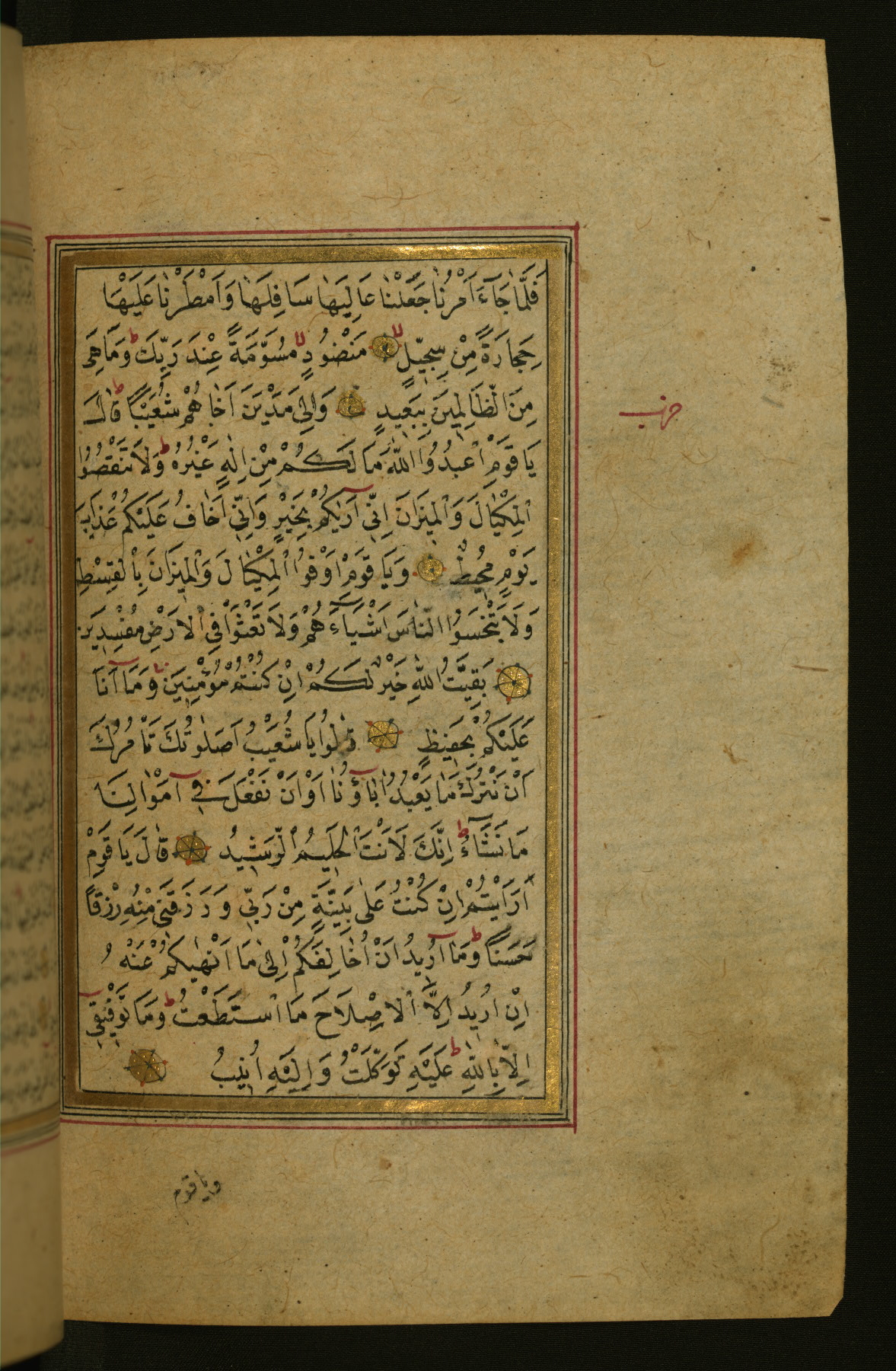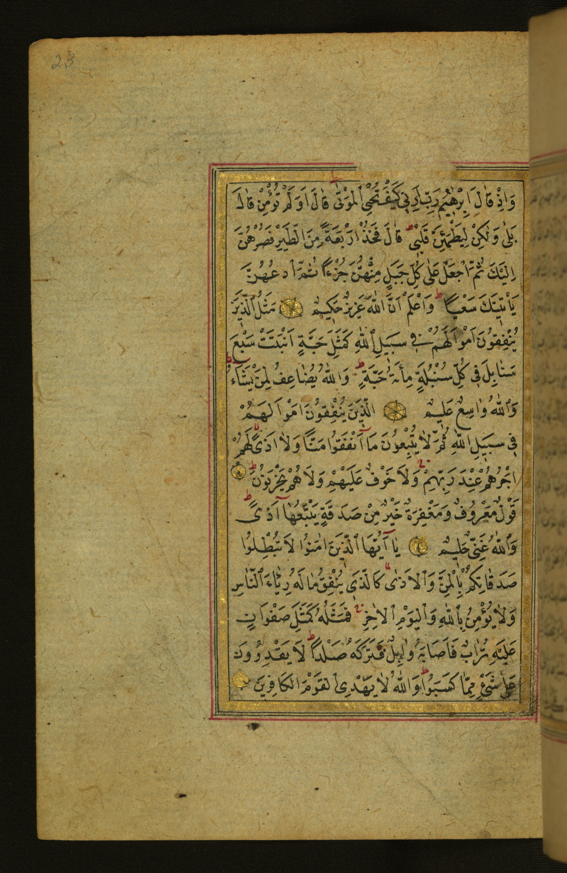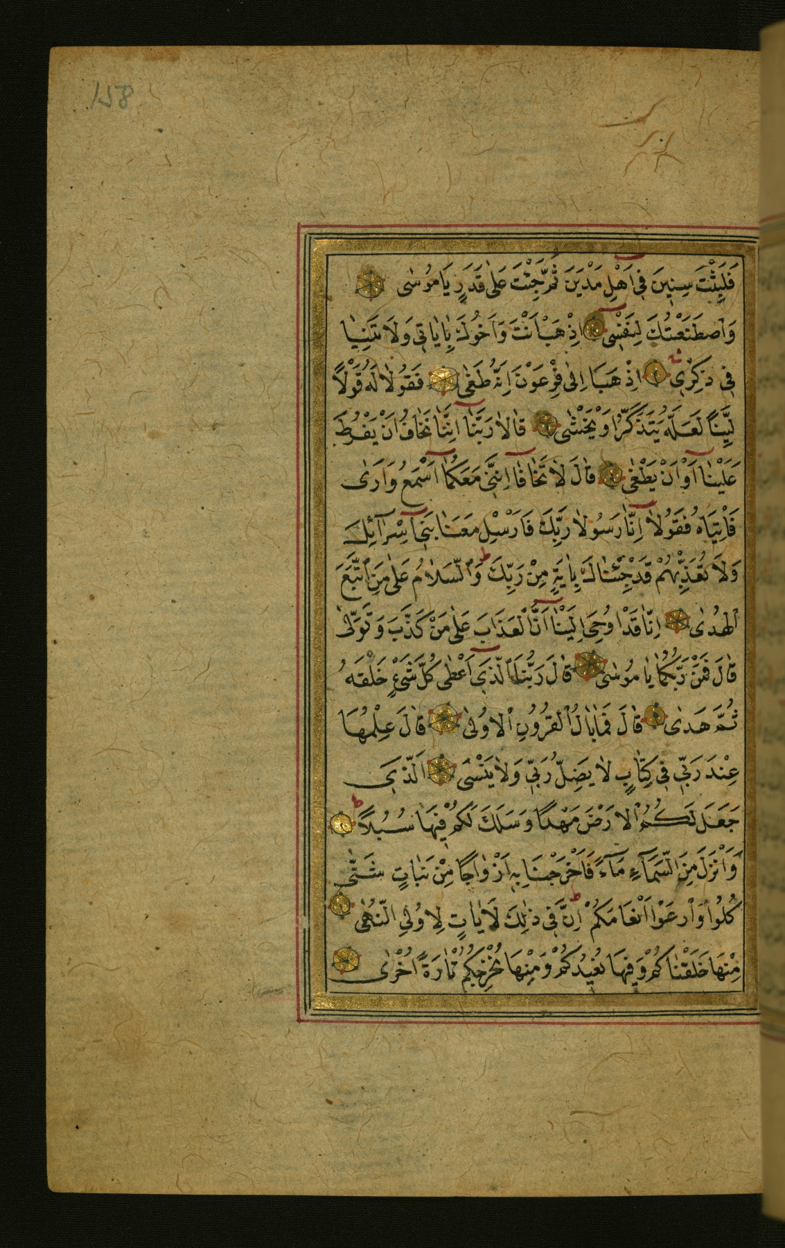 This small, illuminated single-volume copy of the Qurʾan was produced in Ottoman Turkey in 1282 AH / 1865-6 CE by Muḥammad ibn Muṣṭafá Izmīrī, a pupil of al-Rudūsī. The colophon in ijāzah script indicates that the present codex is the twenty-first copy executed by him (fol. 304b). The manuscript opens with an illuminated double-page incipit with the verses of chapters 1 (Sūrat al-fātiḥah) and 2 (Sūrat al-baqarah) (fols. 1b-2a). The text is written in naskh script in black ink with reading marks in red. Verses are separated by illuminated discs with colored dots and chapter headings are in riqāʿ script in white ink. Polychrome medallions in the margins indicate textual divisions and prostration. The binding of black leather is contemporary with the manuscript and decorated with a tooled and gold-painted geometric design enclosed by gold frames on the upper and lower boards.