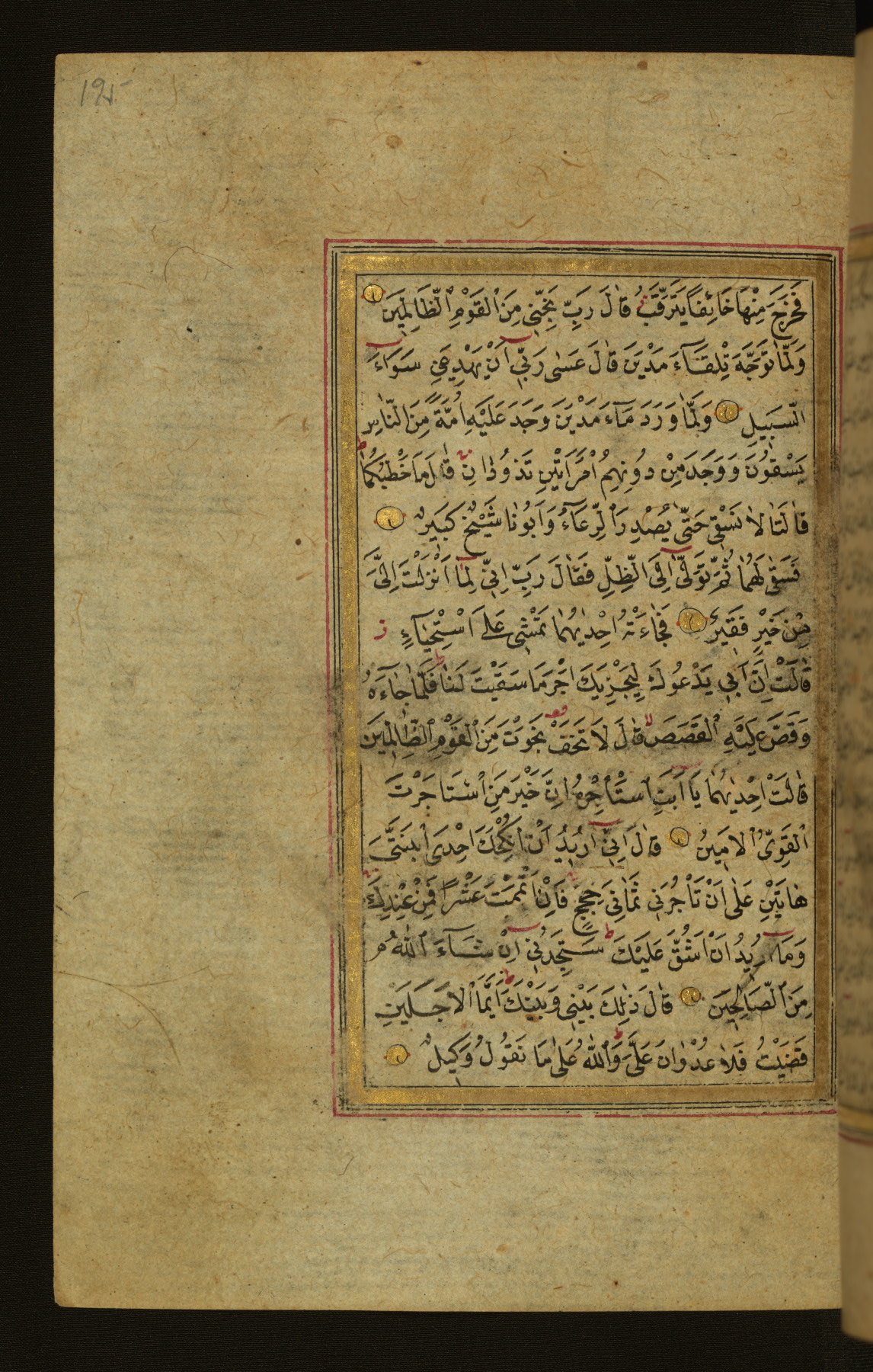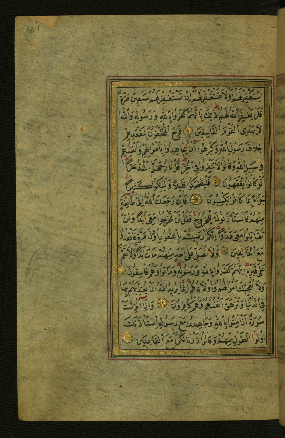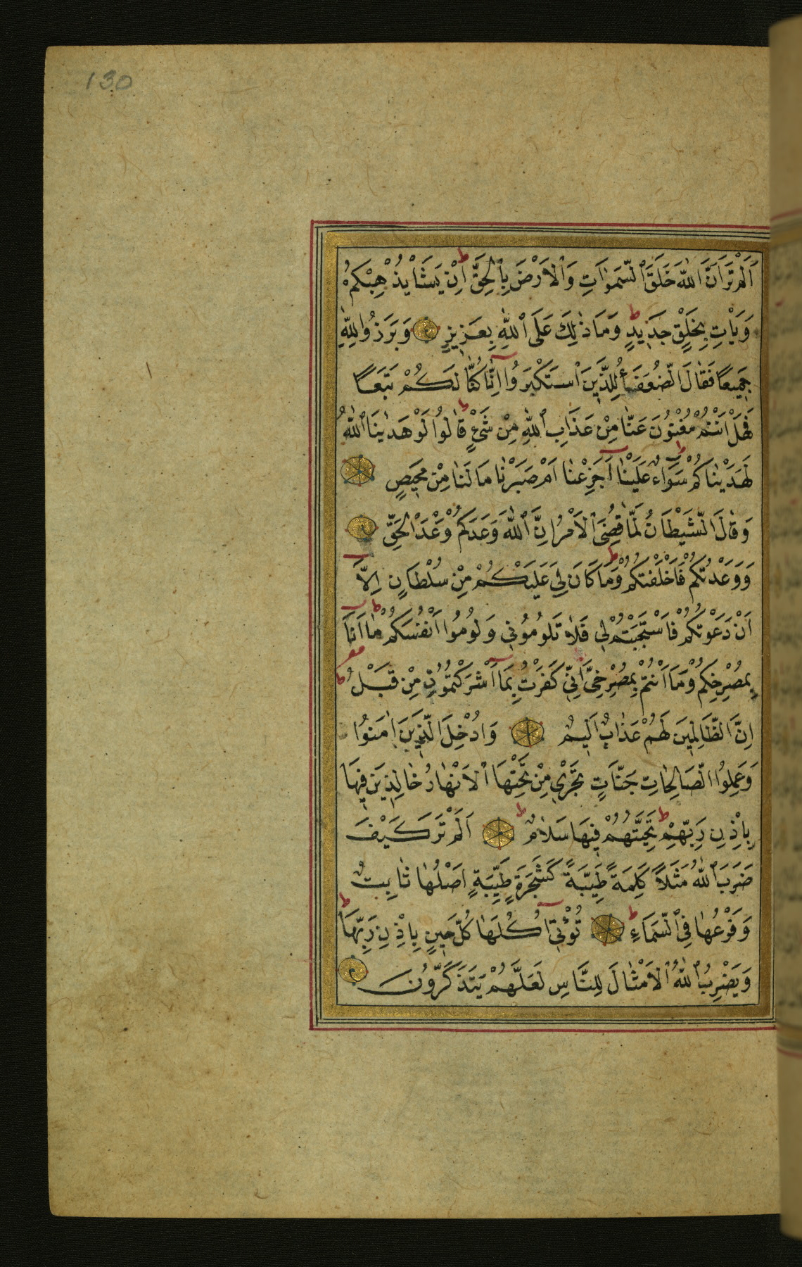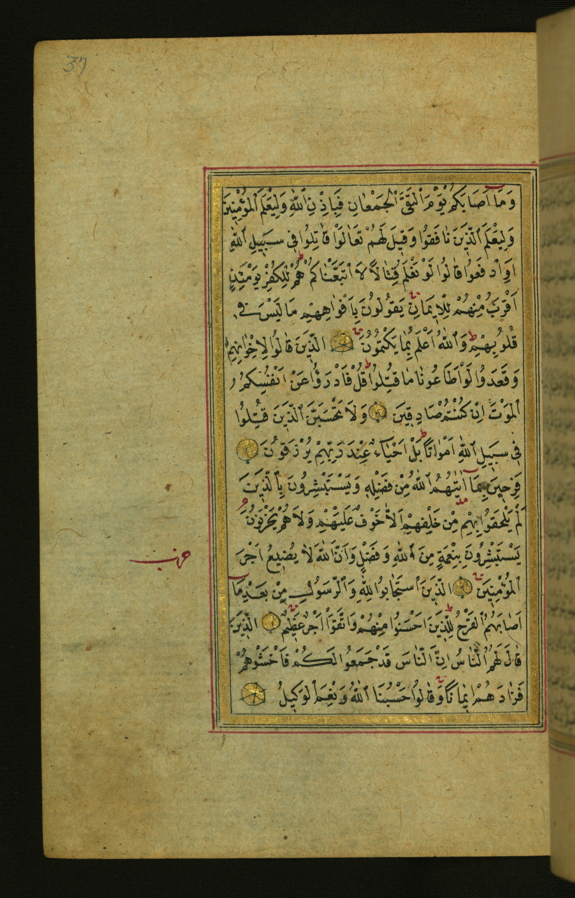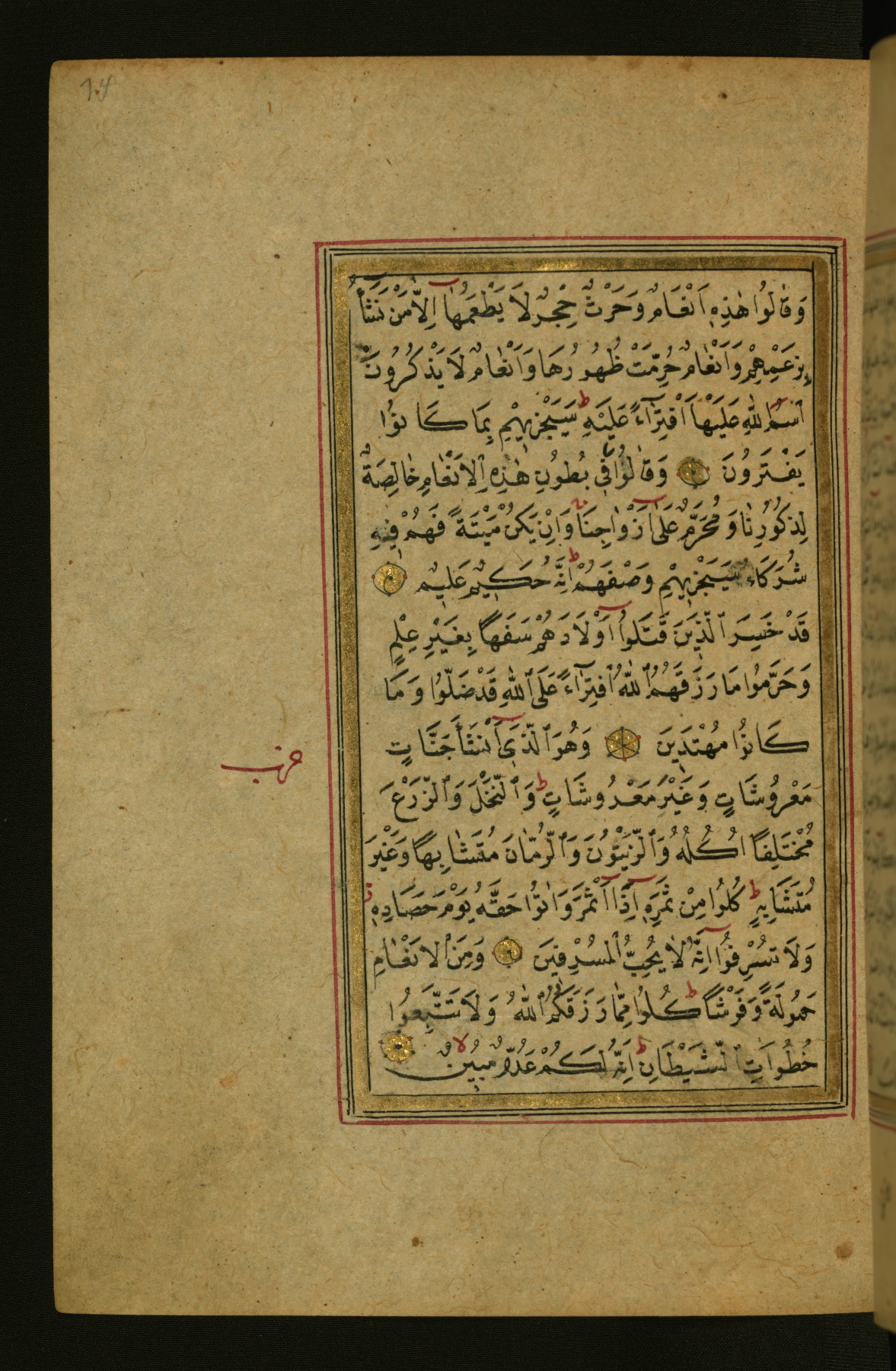 This small, illuminated single-volume copy of the Qurʾan was produced in Ottoman Turkey in 1282 AH / 1865-6 CE by Muḥammad ibn Muṣṭafá Izmīrī, a pupil of al-Rudūsī. The colophon in ijāzah script indicates that the present codex is the twenty-first copy executed by him (fol. 304b). The manuscript opens with an illuminated double-page incipit with the verses of chapters 1 (Sūrat al-fātiḥah) and 2 (Sūrat al-baqarah) (fols. 1b-2a). The text is written in naskh script in black ink with reading marks in red. Verses are separated by illuminated discs with colored dots and chapter headings are in riqāʿ script in white ink. Polychrome medallions in the margins indicate textual divisions and prostration. The binding of black leather is contemporary with the manuscript and decorated with a tooled and gold-painted geometric design enclosed by gold frames on the upper and lower boards.