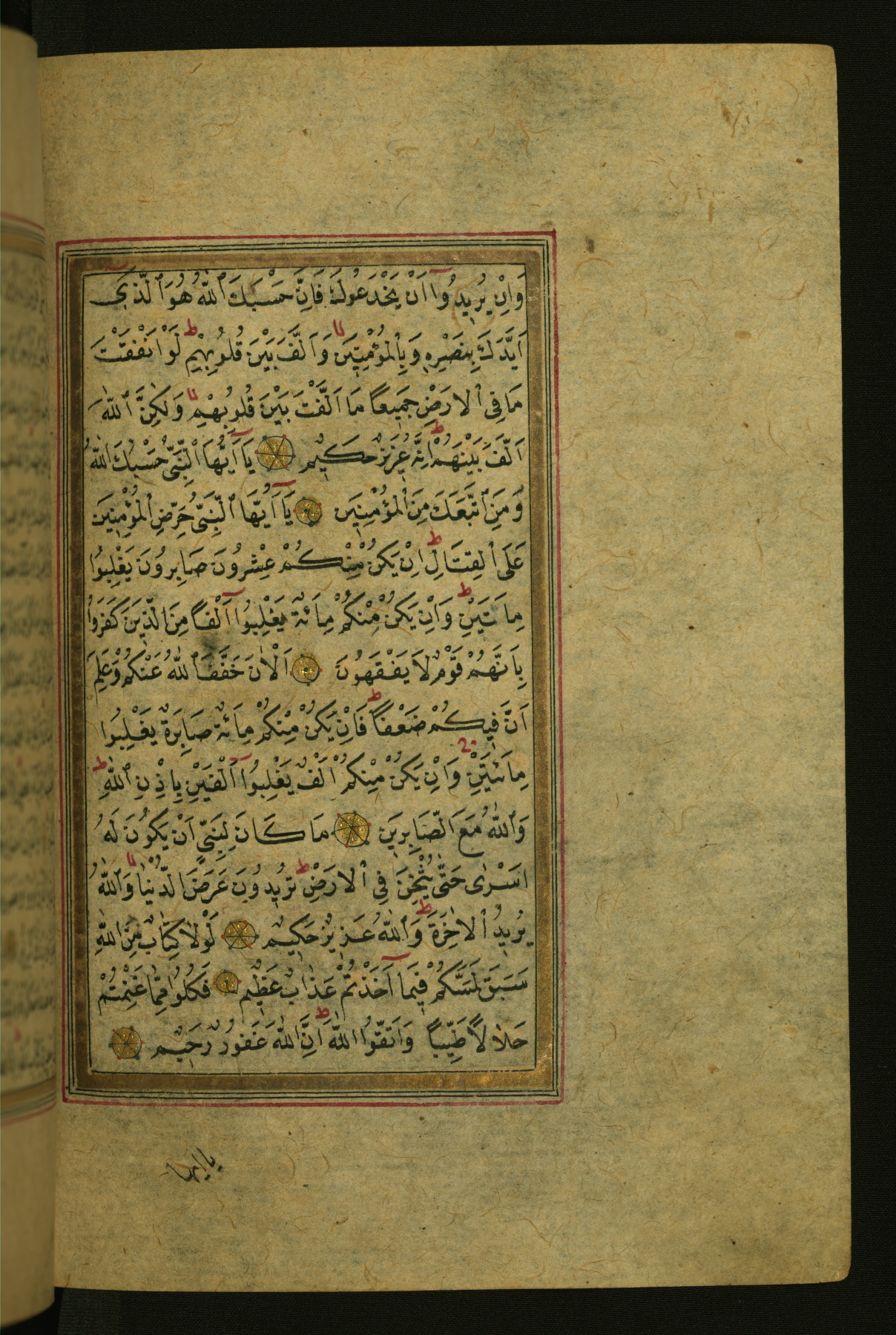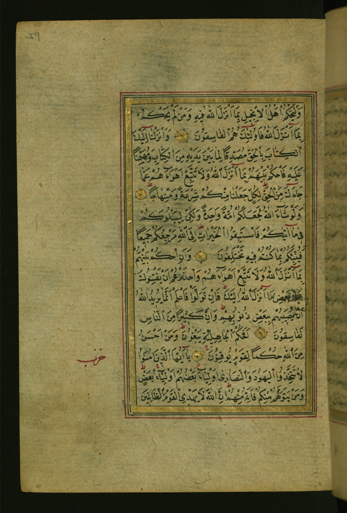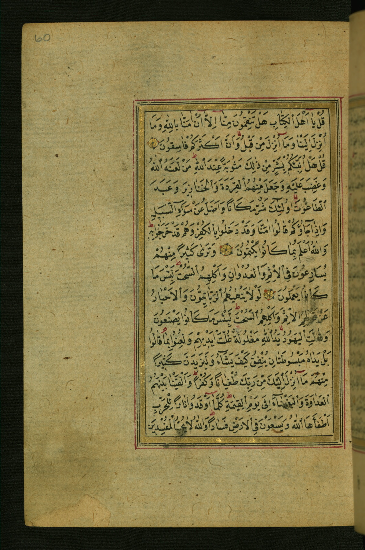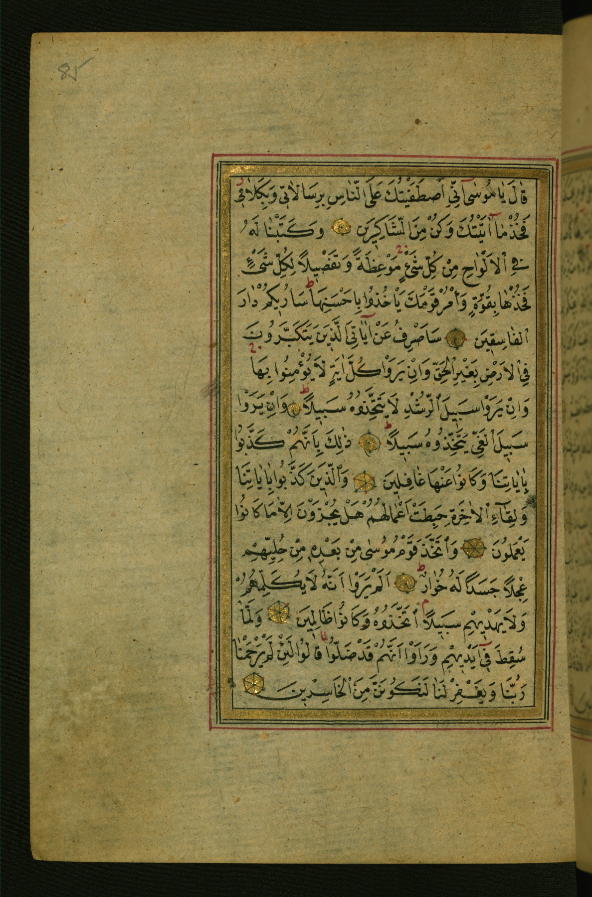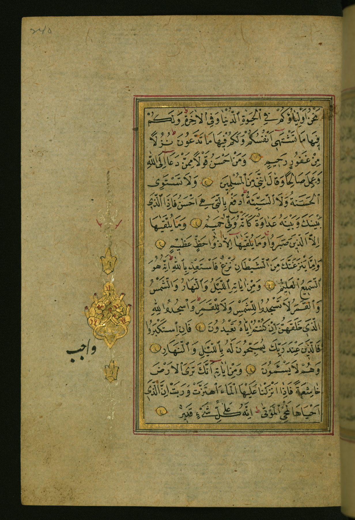 This small, illuminated single-volume copy of the Qurʾan was produced in Ottoman Turkey in 1282 AH / 1865-6 CE by Muḥammad ibn Muṣṭafá Izmīrī, a pupil of al-Rudūsī. The colophon in ijāzah script indicates that the present codex is the twenty-first copy executed by him (fol. 304b). The manuscript opens with an illuminated double-page incipit with the verses of chapters 1 (Sūrat al-fātiḥah) and 2 (Sūrat al-baqarah) (fols. 1b-2a). The text is written in naskh script in black ink with reading marks in red. Verses are separated by illuminated discs with colored dots and chapter headings are in riqāʿ script in white ink. Polychrome medallions in the margins indicate textual divisions and prostration. The binding of black leather is contemporary with the manuscript and decorated with a tooled and gold-painted geometric design enclosed by gold frames on the upper and lower boards.