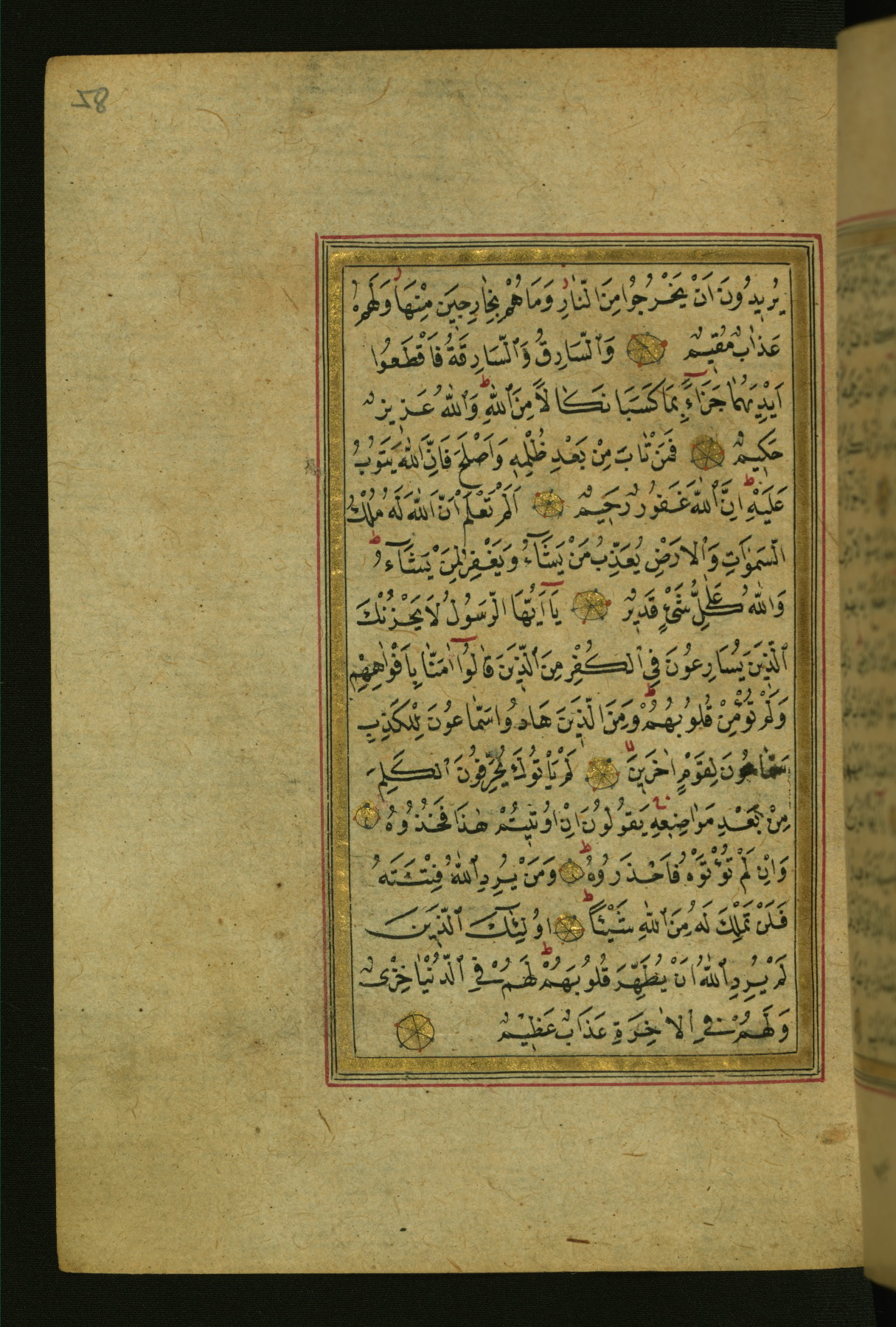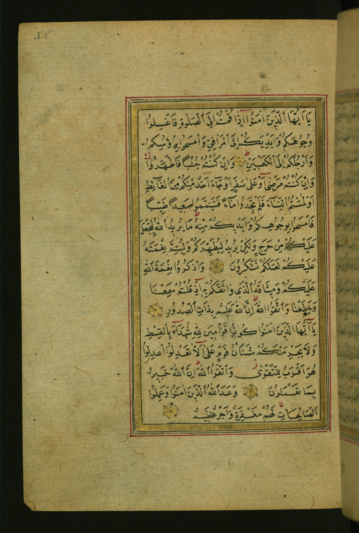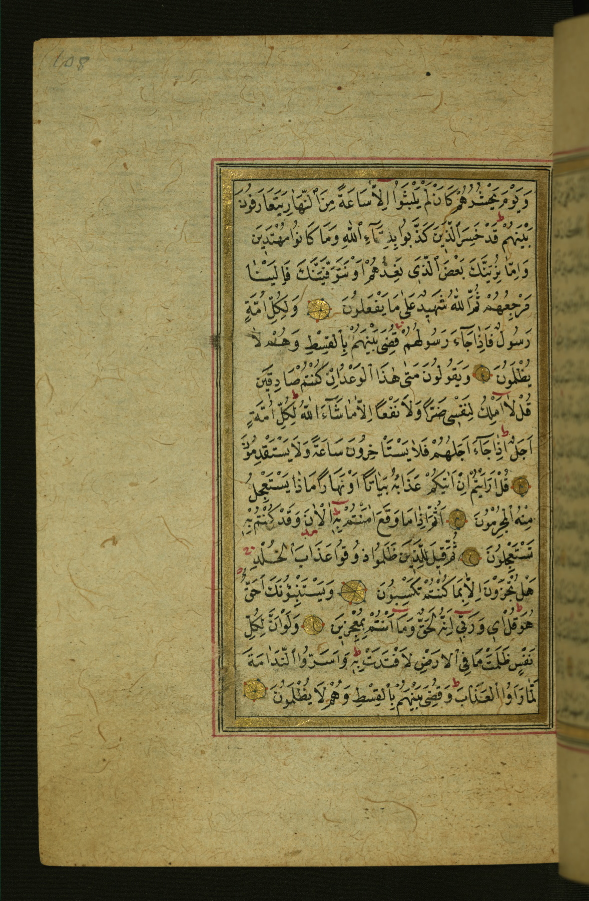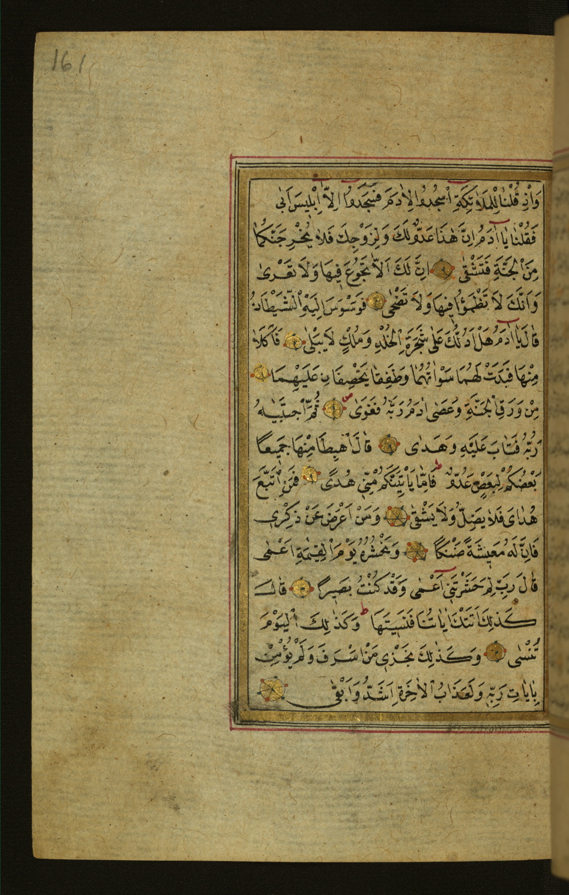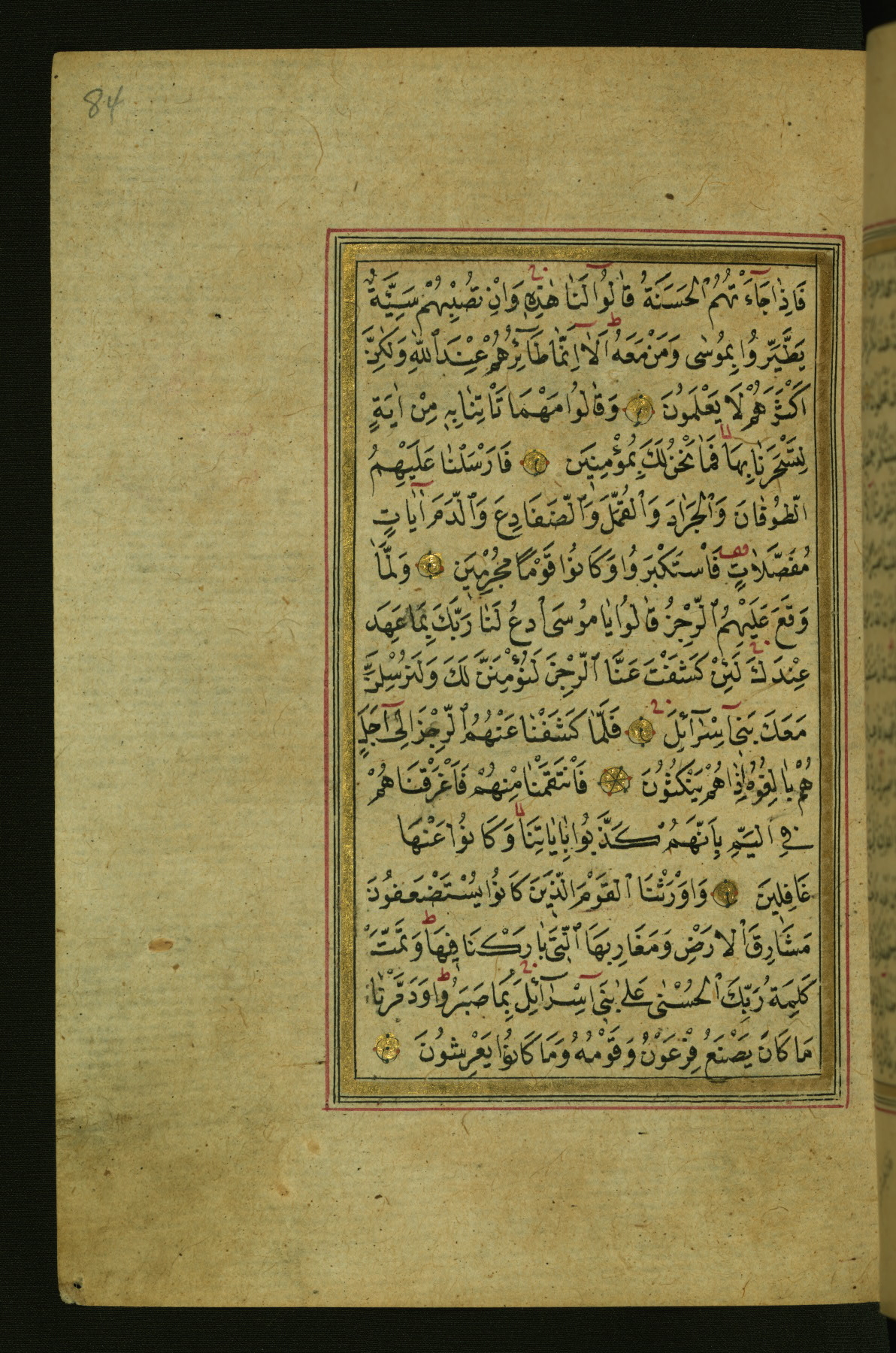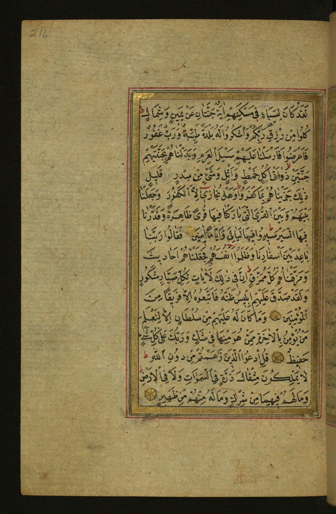 This small, illuminated single-volume copy of the Qurʾan was produced in Ottoman Turkey in 1282 AH / 1865-6 CE by Muḥammad ibn Muṣṭafá Izmīrī, a pupil of al-Rudūsī. The colophon in ijāzah script indicates that the present codex is the twenty-first copy executed by him (fol. 304b). The manuscript opens with an illuminated double-page incipit with the verses of chapters 1 (Sūrat al-fātiḥah) and 2 (Sūrat al-baqarah) (fols. 1b-2a). The text is written in naskh script in black ink with reading marks in red. Verses are separated by illuminated discs with colored dots and chapter headings are in riqāʿ script in white ink. Polychrome medallions in the margins indicate textual divisions and prostration. The binding of black leather is contemporary with the manuscript and decorated with a tooled and gold-painted geometric design enclosed by gold frames on the upper and lower boards.