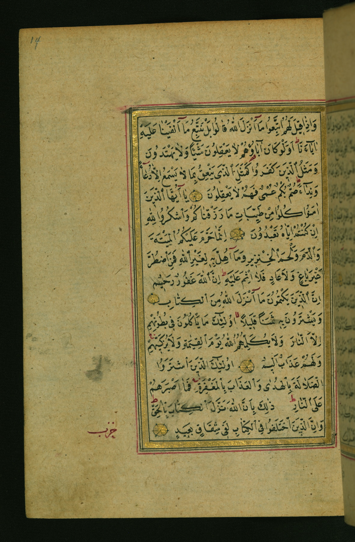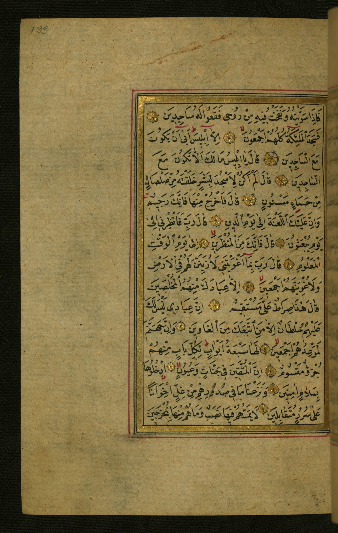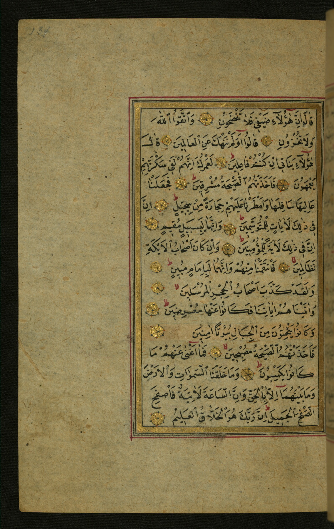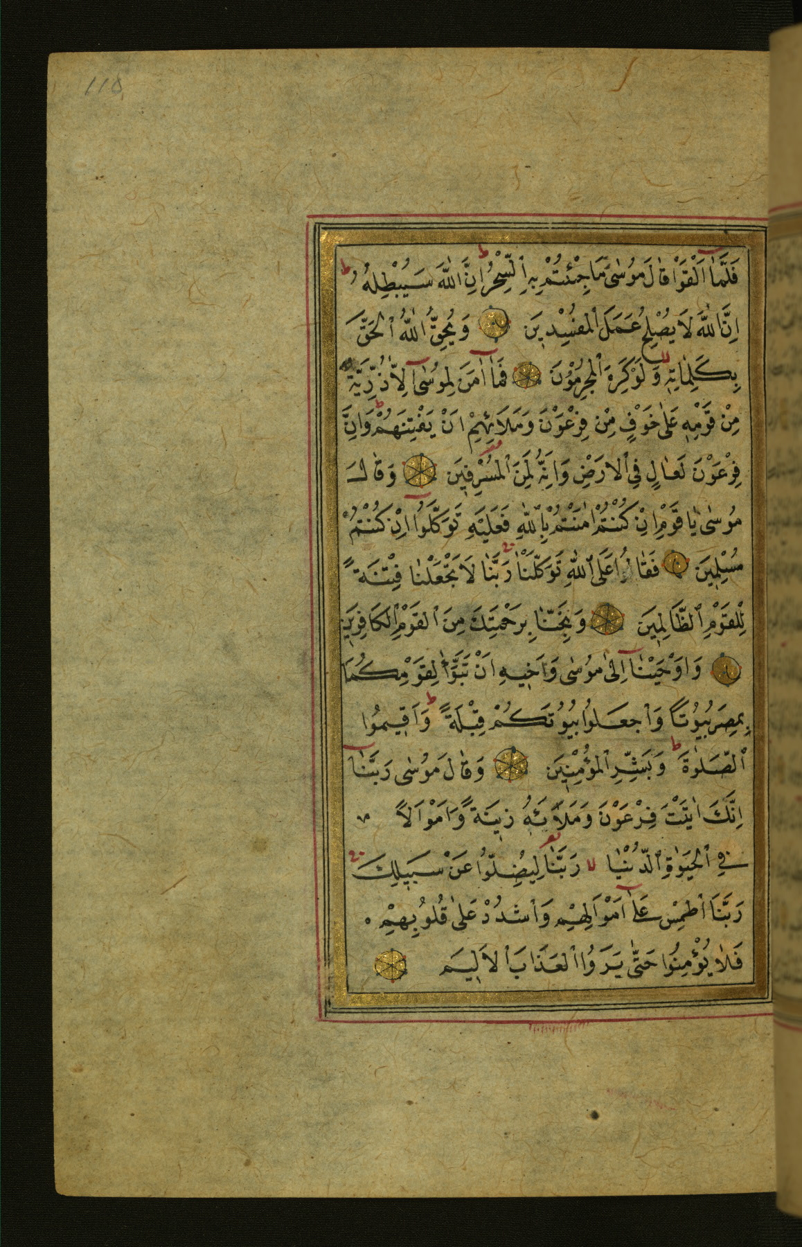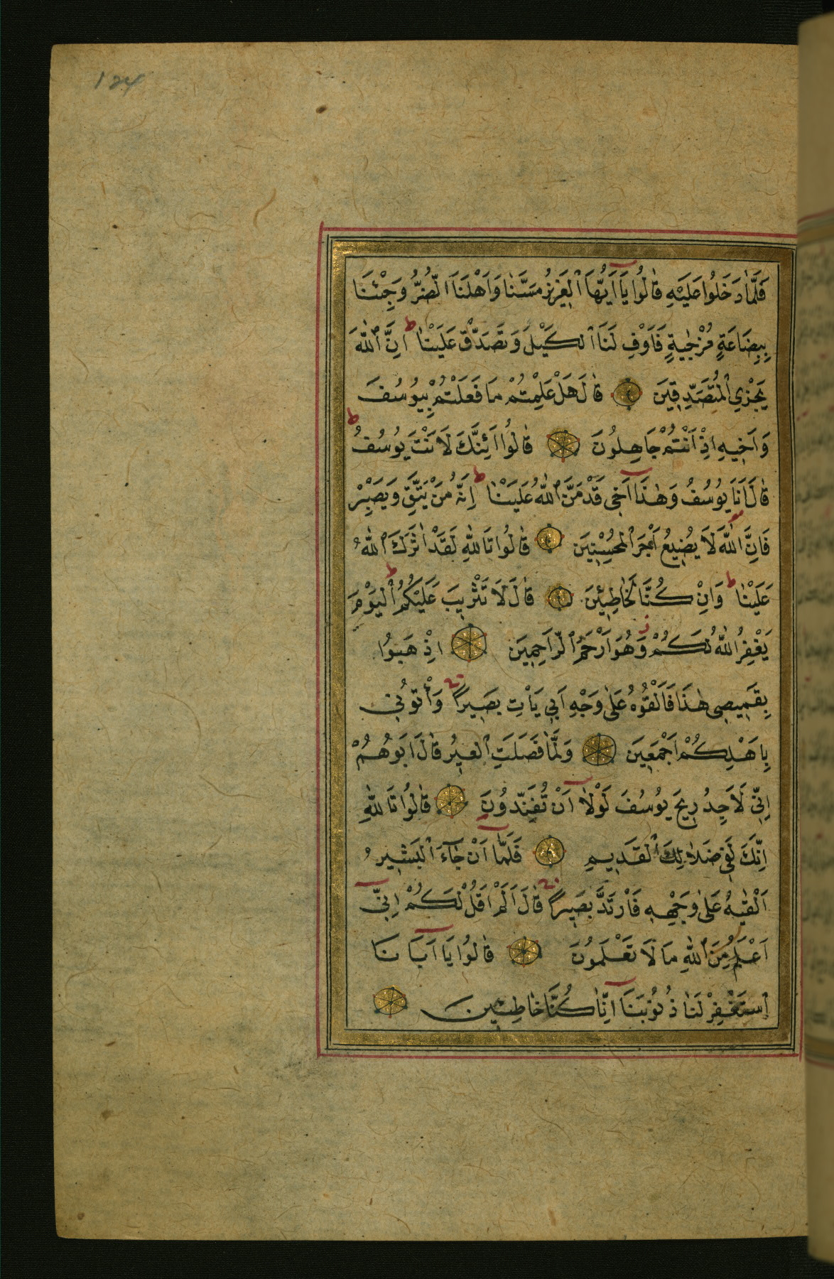 This small, illuminated single-volume copy of the Qurʾan was produced in Ottoman Turkey in 1282 AH / 1865-6 CE by Muḥammad ibn Muṣṭafá Izmīrī, a pupil of al-Rudūsī. The colophon in ijāzah script indicates that the present codex is the twenty-first copy executed by him (fol. 304b). The manuscript opens with an illuminated double-page incipit with the verses of chapters 1 (Sūrat al-fātiḥah) and 2 (Sūrat al-baqarah) (fols. 1b-2a). The text is written in naskh script in black ink with reading marks in red. Verses are separated by illuminated discs with colored dots and chapter headings are in riqāʿ script in white ink. Polychrome medallions in the margins indicate textual divisions and prostration. The binding of black leather is contemporary with the manuscript and decorated with a tooled and gold-painted geometric design enclosed by gold frames on the upper and lower boards.