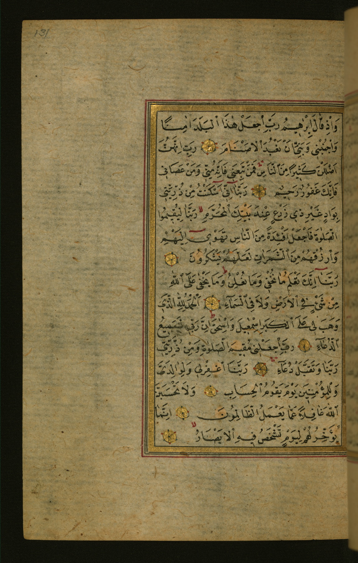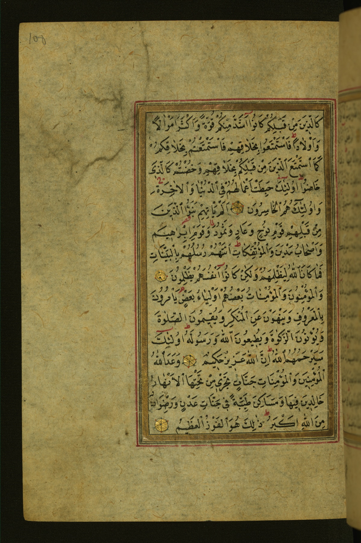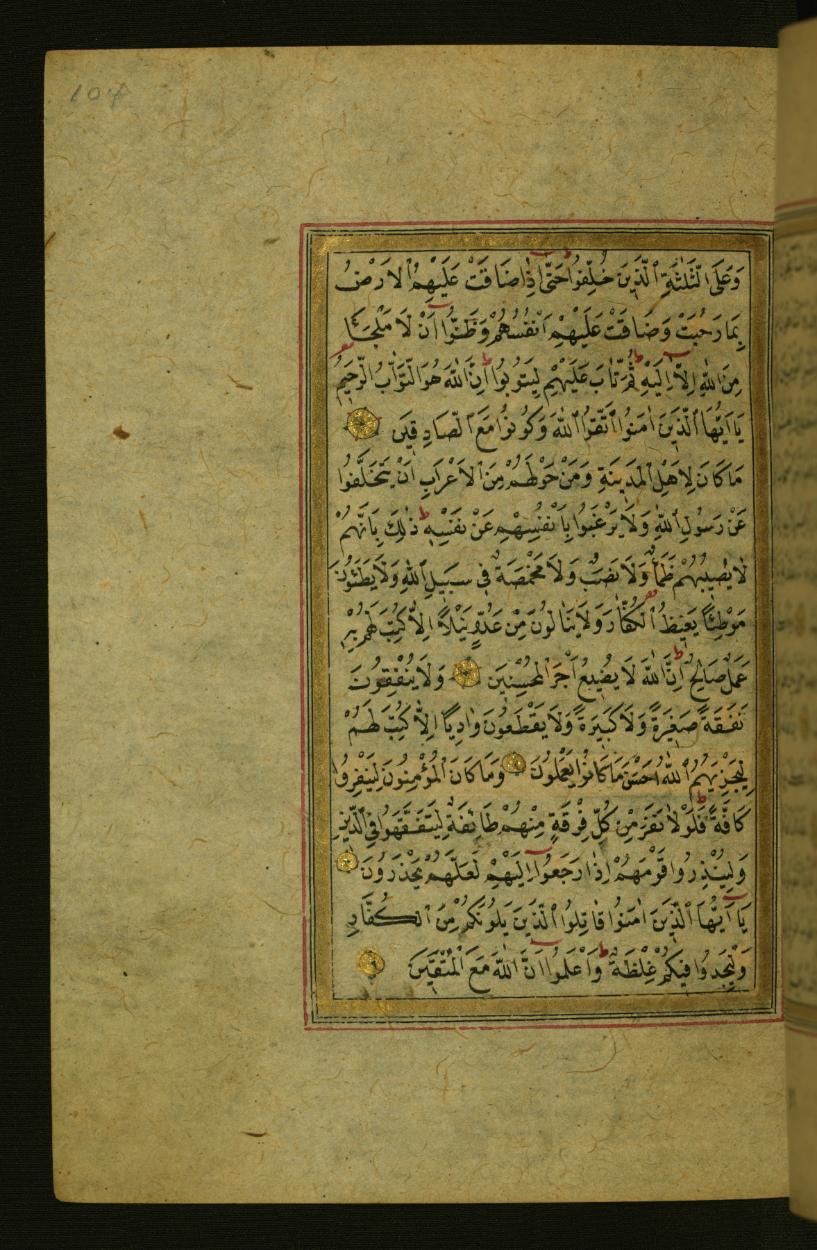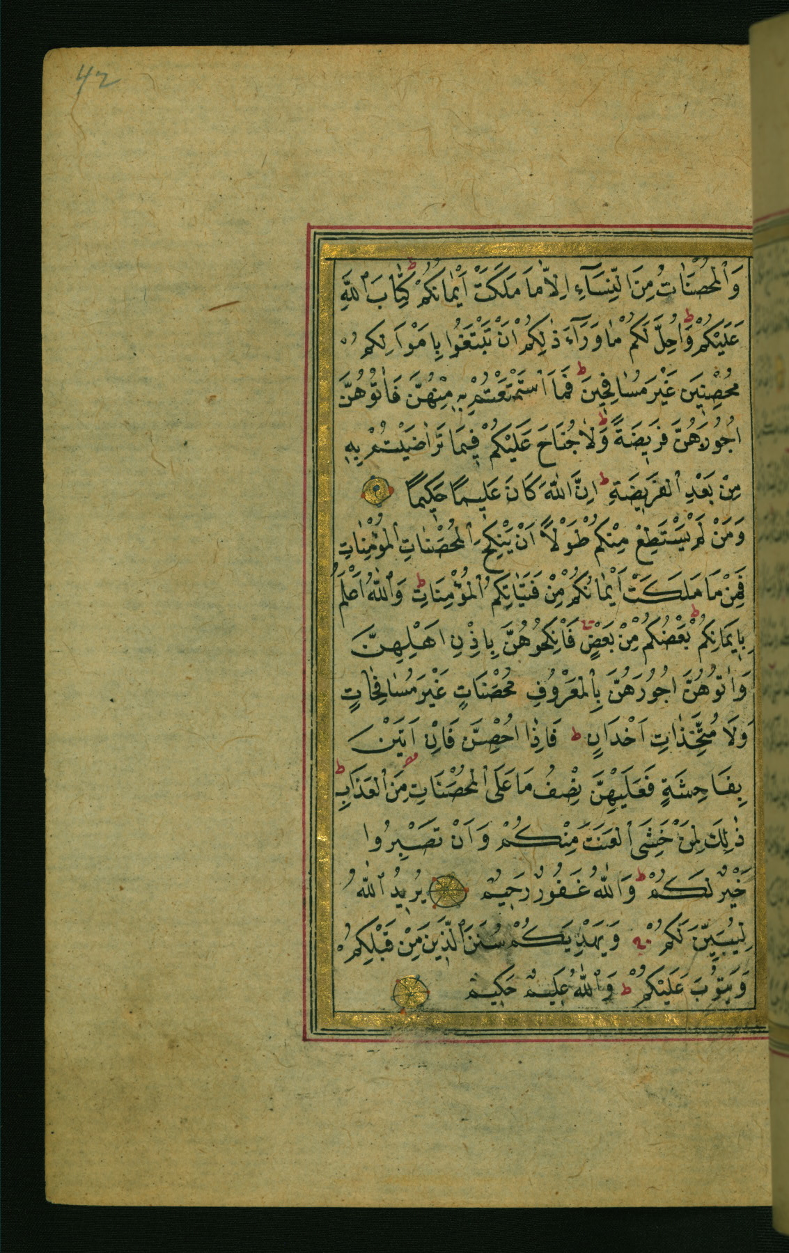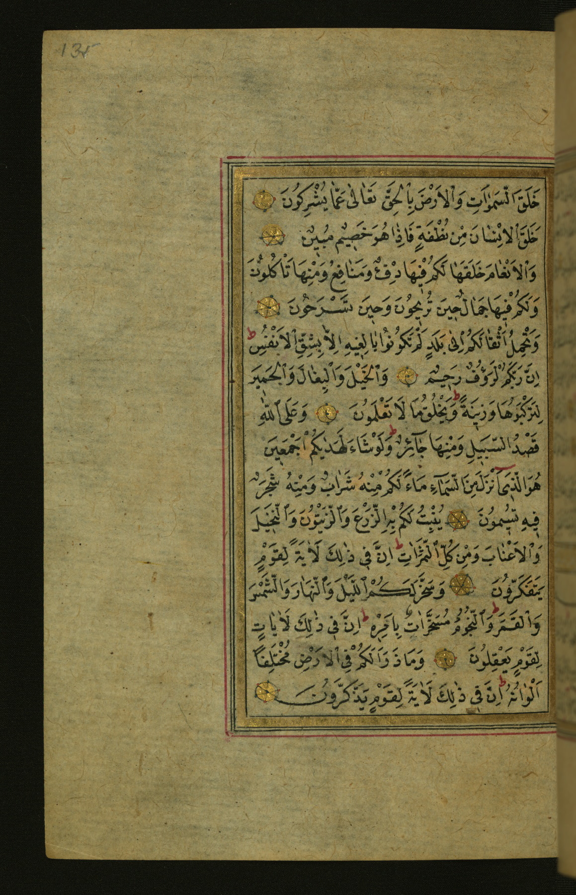 This small, illuminated single-volume copy of the Qurʾan was produced in Ottoman Turkey in 1282 AH / 1865-6 CE by Muḥammad ibn Muṣṭafá Izmīrī, a pupil of al-Rudūsī. The colophon in ijāzah script indicates that the present codex is the twenty-first copy executed by him (fol. 304b). The manuscript opens with an illuminated double-page incipit with the verses of chapters 1 (Sūrat al-fātiḥah) and 2 (Sūrat al-baqarah) (fols. 1b-2a). The text is written in naskh script in black ink with reading marks in red. Verses are separated by illuminated discs with colored dots and chapter headings are in riqāʿ script in white ink. Polychrome medallions in the margins indicate textual divisions and prostration. The binding of black leather is contemporary with the manuscript and decorated with a tooled and gold-painted geometric design enclosed by gold frames on the upper and lower boards.