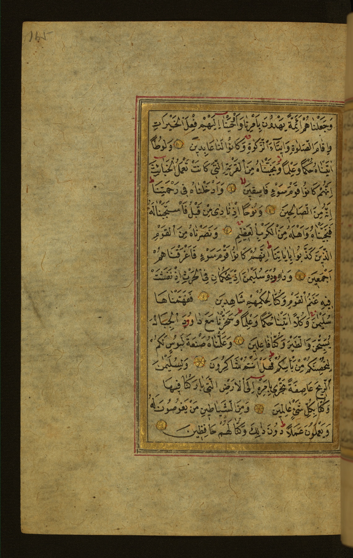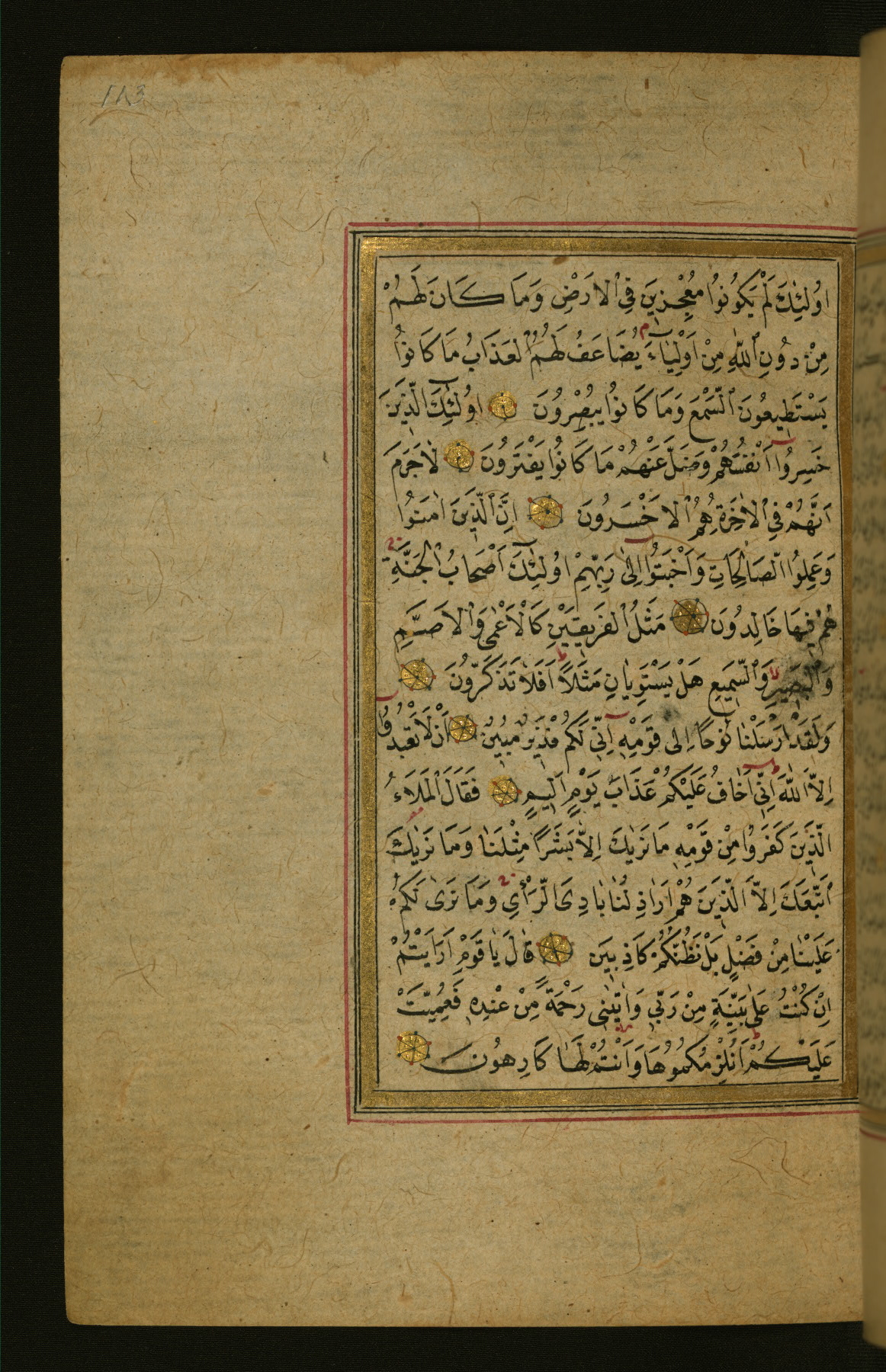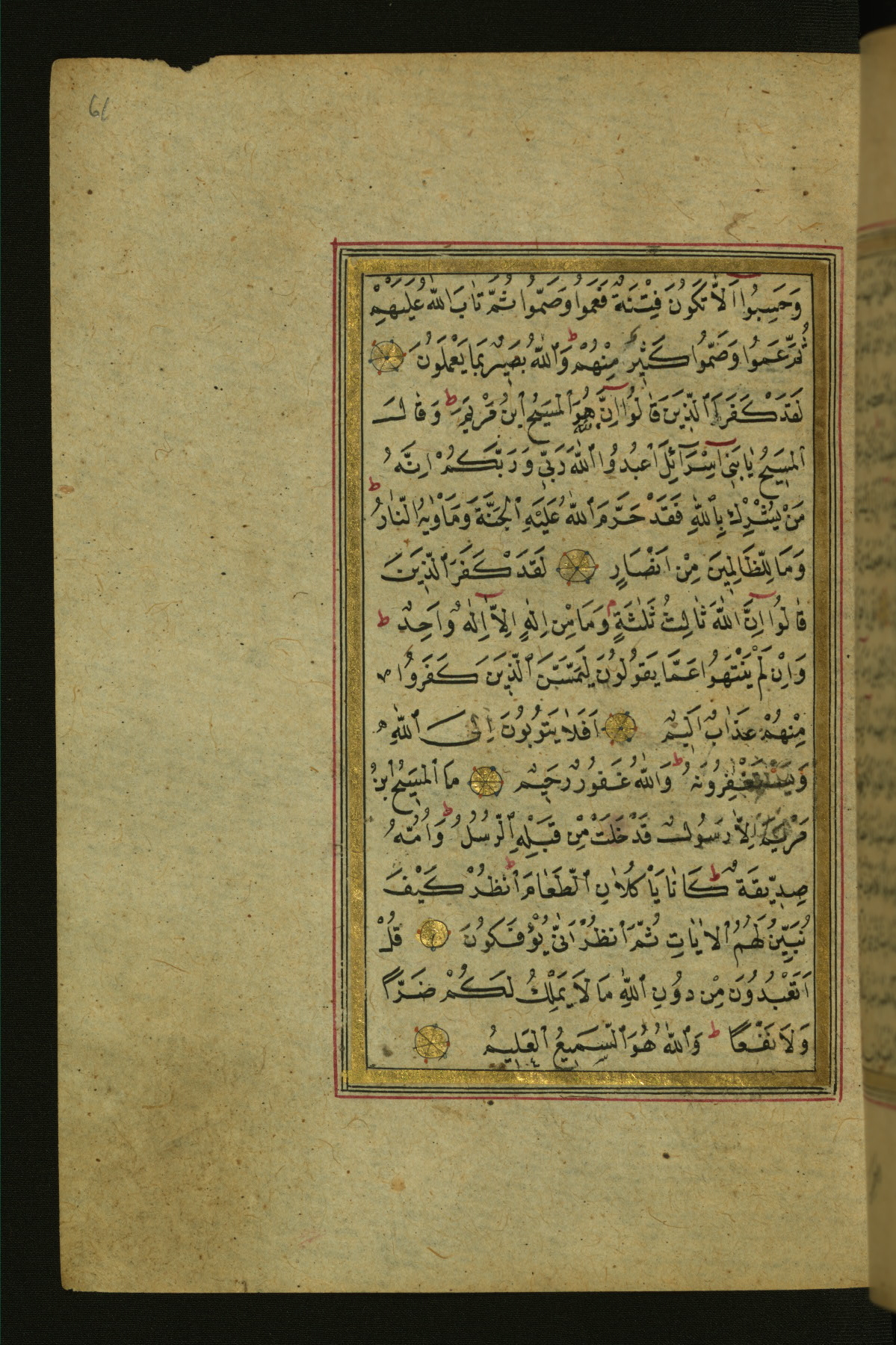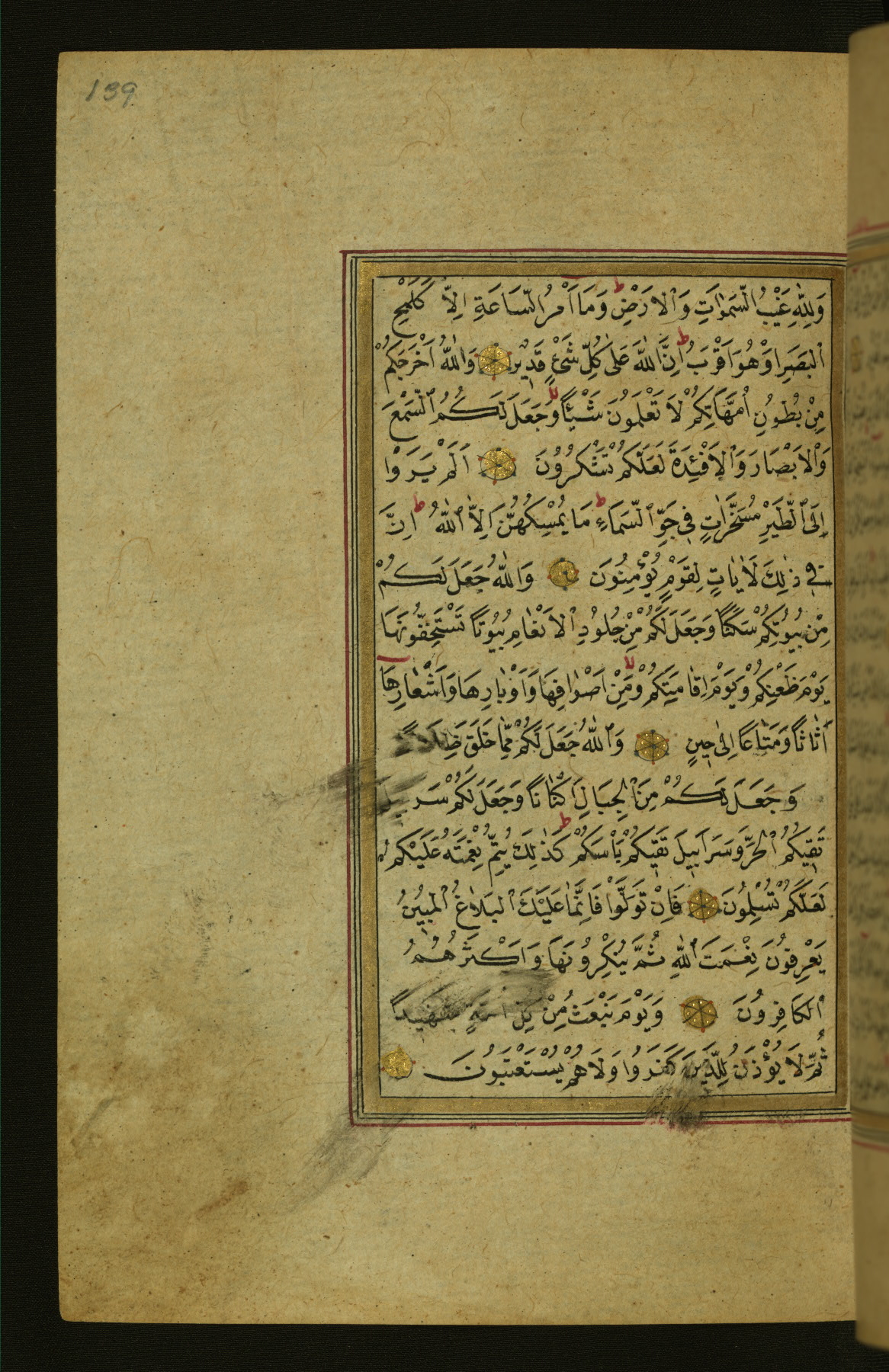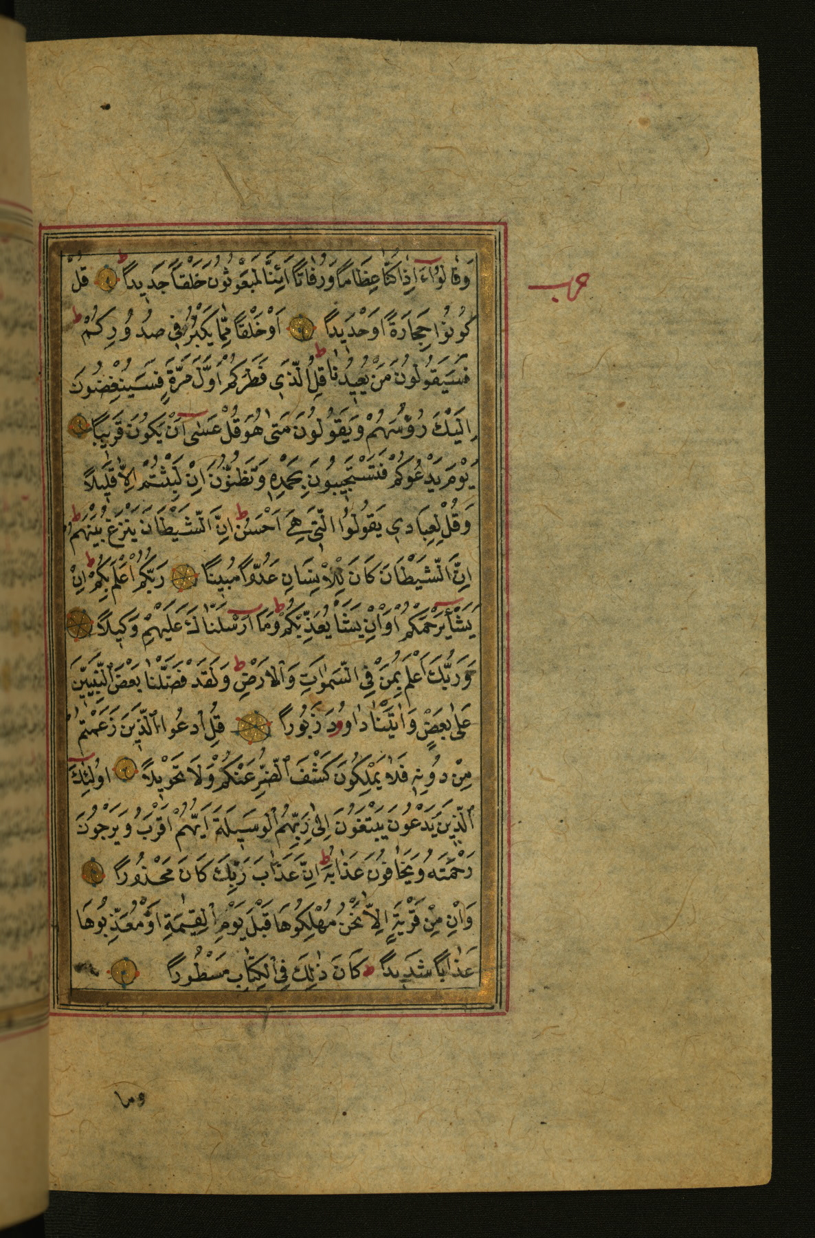 This small, illuminated single-volume copy of the Qurʾan was produced in Ottoman Turkey in 1282 AH / 1865-6 CE by Muḥammad ibn Muṣṭafá Izmīrī, a pupil of al-Rudūsī. The colophon in ijāzah script indicates that the present codex is the twenty-first copy executed by him (fol. 304b). The manuscript opens with an illuminated double-page incipit with the verses of chapters 1 (Sūrat al-fātiḥah) and 2 (Sūrat al-baqarah) (fols. 1b-2a). The text is written in naskh script in black ink with reading marks in red. Verses are separated by illuminated discs with colored dots and chapter headings are in riqāʿ script in white ink. Polychrome medallions in the margins indicate textual divisions and prostration. The binding of black leather is contemporary with the manuscript and decorated with a tooled and gold-painted geometric design enclosed by gold frames on the upper and lower boards.