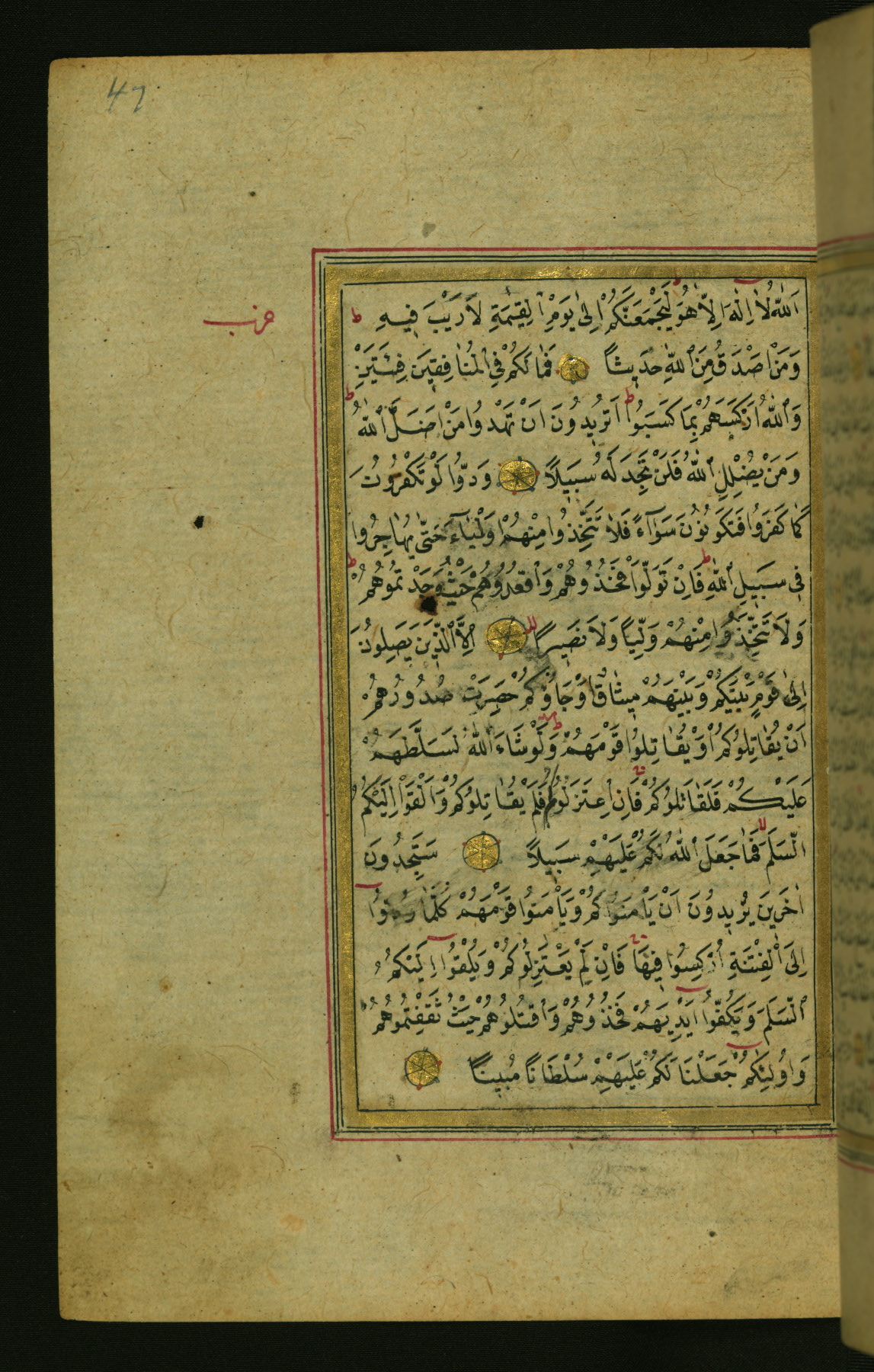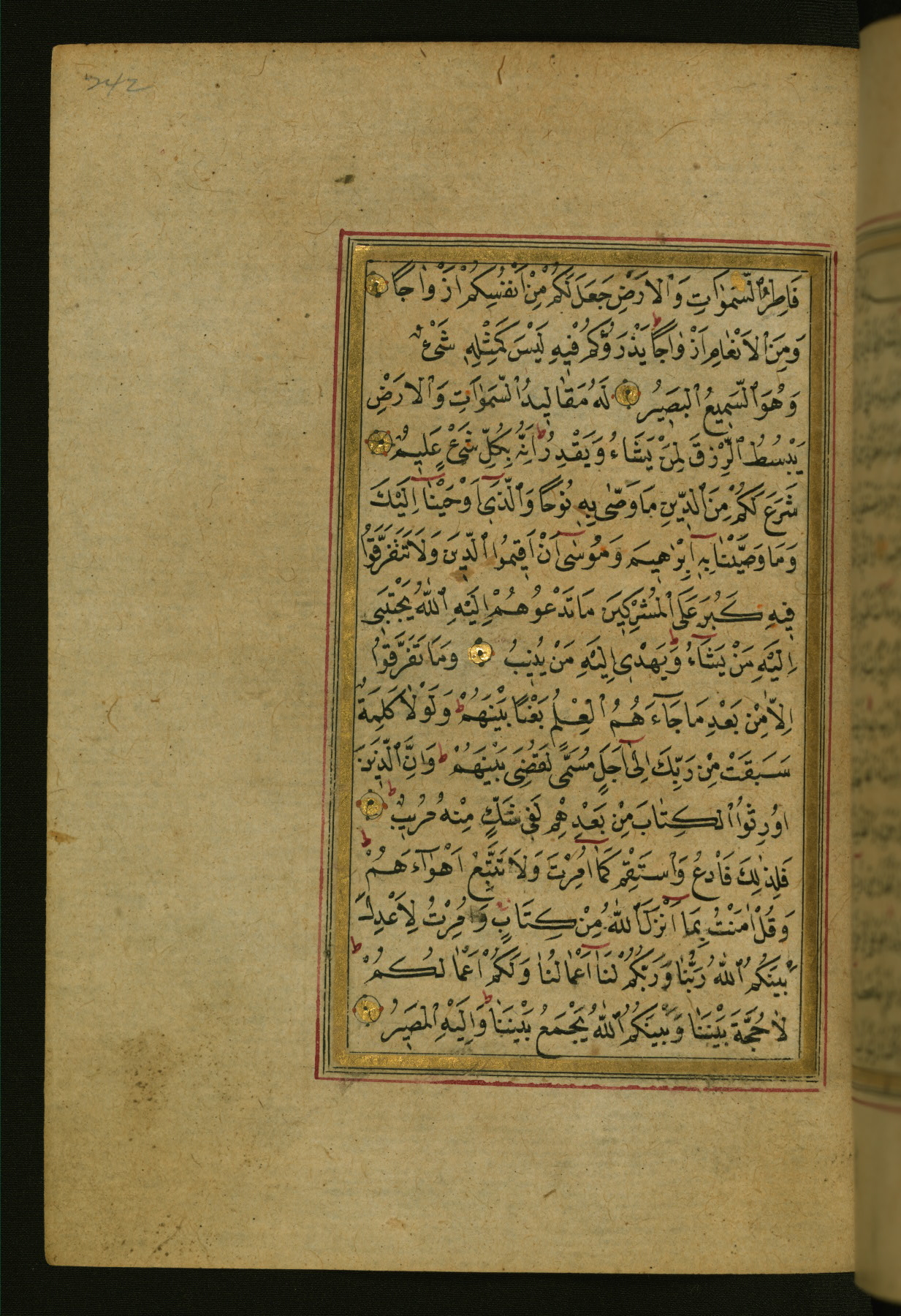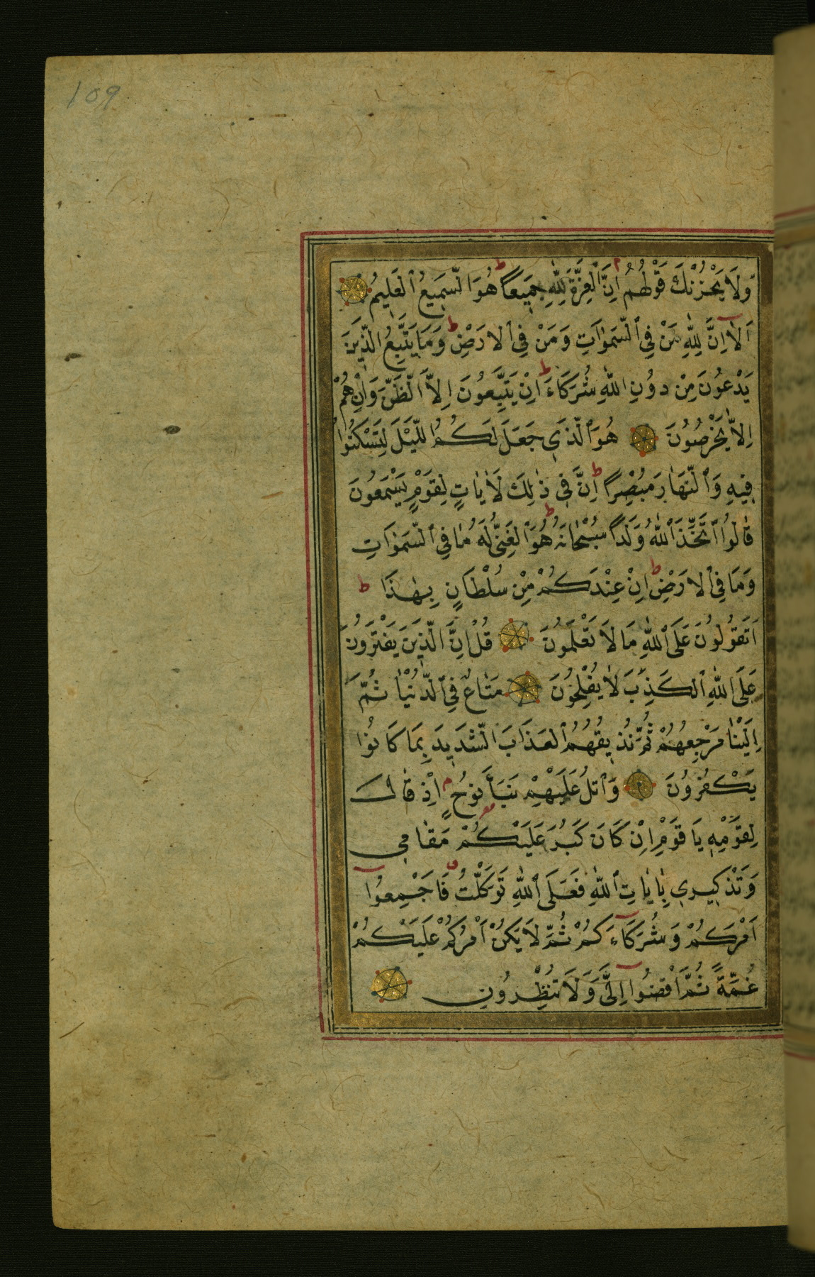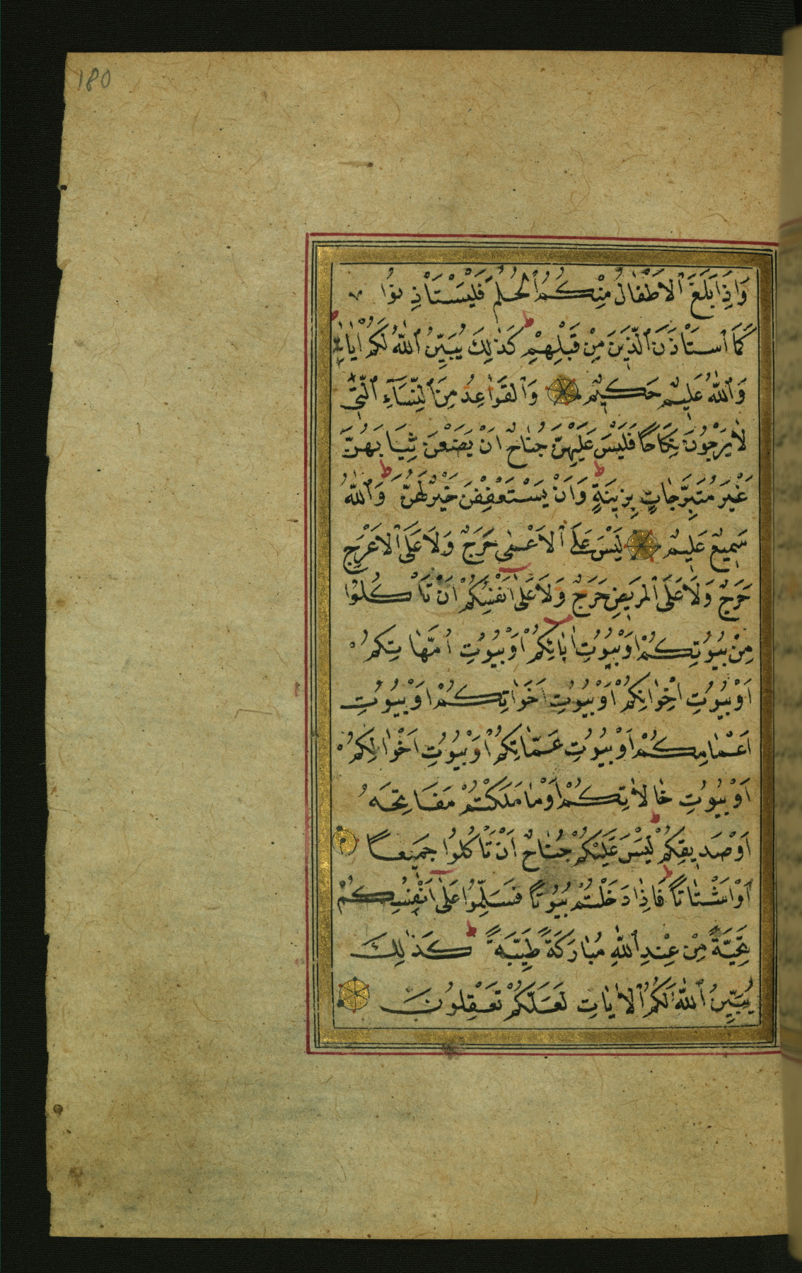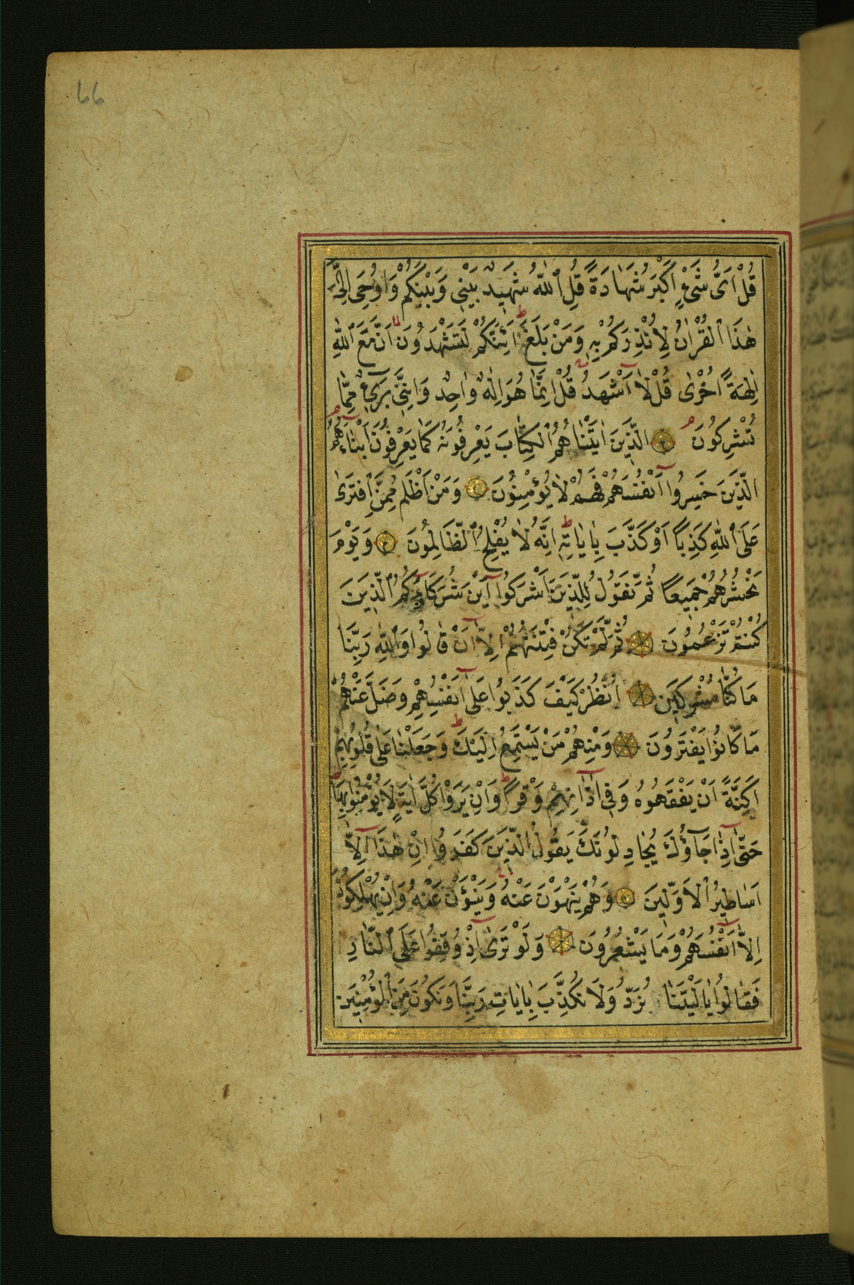 This small, illuminated single-volume copy of the Qurʾan was produced in Ottoman Turkey in 1282 AH / 1865-6 CE by Muḥammad ibn Muṣṭafá Izmīrī, a pupil of al-Rudūsī. The colophon in ijāzah script indicates that the present codex is the twenty-first copy executed by him (fol. 304b). The manuscript opens with an illuminated double-page incipit with the verses of chapters 1 (Sūrat al-fātiḥah) and 2 (Sūrat al-baqarah) (fols. 1b-2a). The text is written in naskh script in black ink with reading marks in red. Verses are separated by illuminated discs with colored dots and chapter headings are in riqāʿ script in white ink. Polychrome medallions in the margins indicate textual divisions and prostration. The binding of black leather is contemporary with the manuscript and decorated with a tooled and gold-painted geometric design enclosed by gold frames on the upper and lower boards.