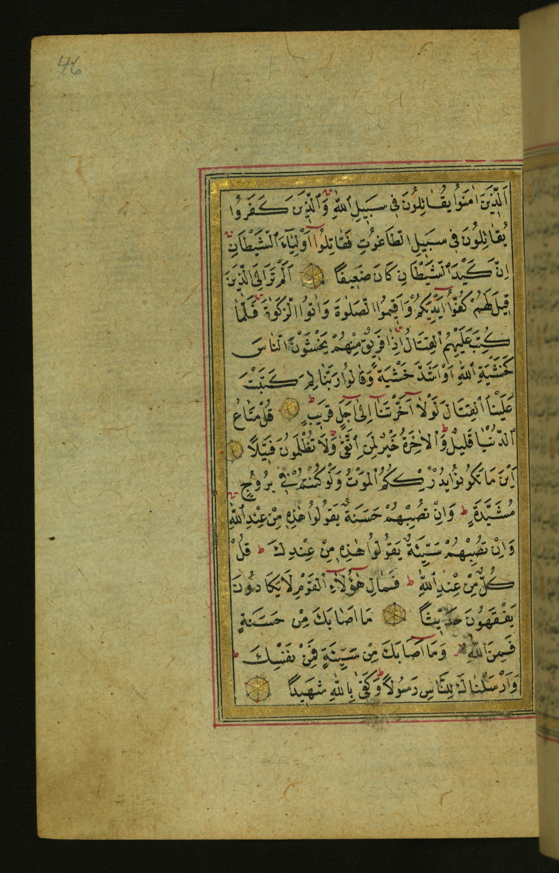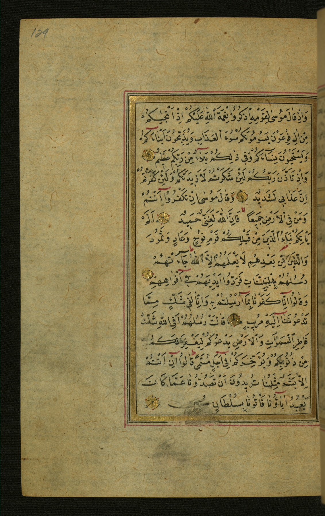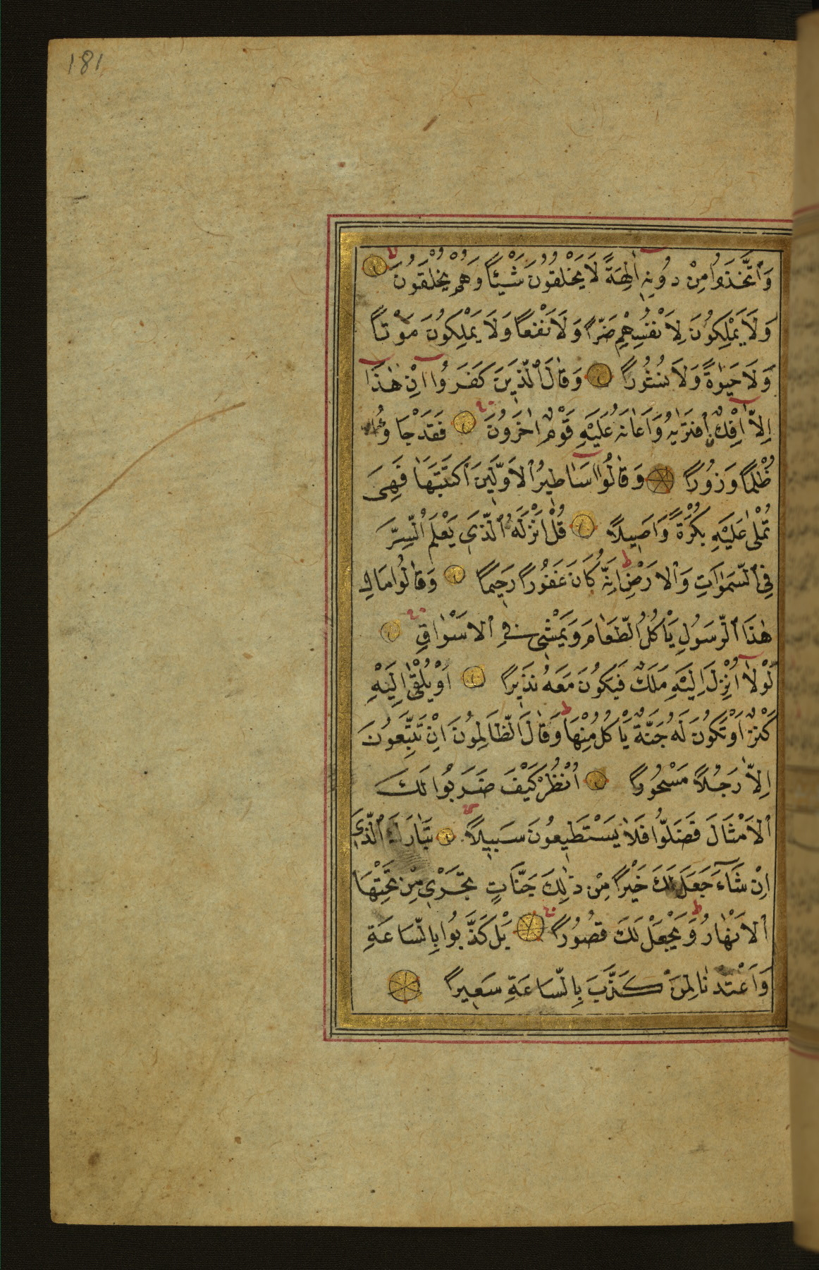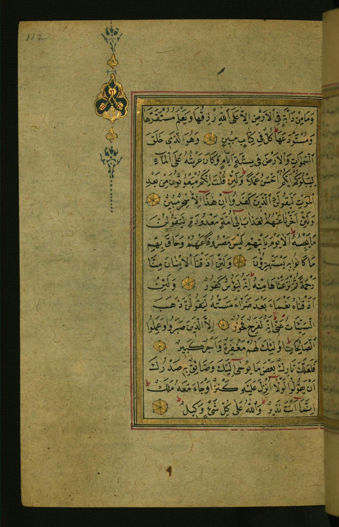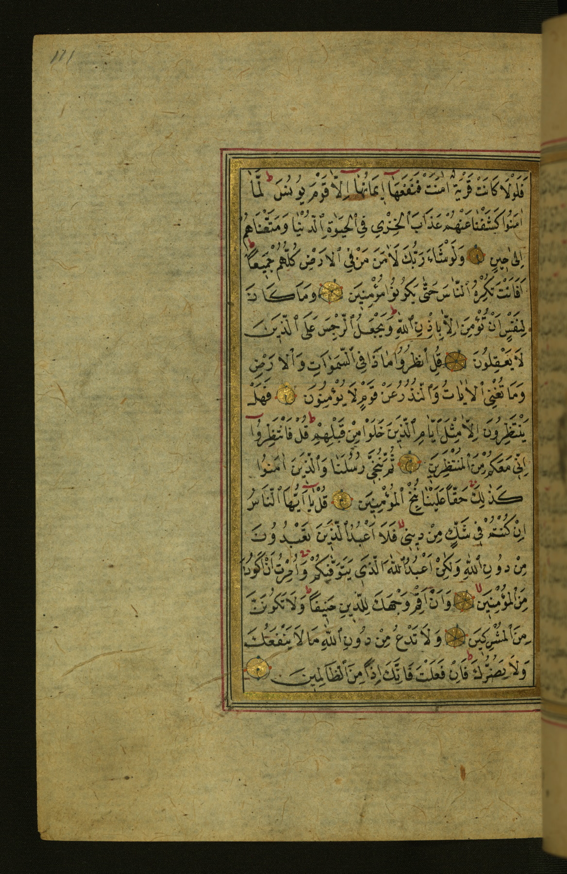 This small, illuminated single-volume copy of the Qurʾan was produced in Ottoman Turkey in 1282 AH / 1865-6 CE by Muḥammad ibn Muṣṭafá Izmīrī, a pupil of al-Rudūsī. The colophon in ijāzah script indicates that the present codex is the twenty-first copy executed by him (fol. 304b). The manuscript opens with an illuminated double-page incipit with the verses of chapters 1 (Sūrat al-fātiḥah) and 2 (Sūrat al-baqarah) (fols. 1b-2a). The text is written in naskh script in black ink with reading marks in red. Verses are separated by illuminated discs with colored dots and chapter headings are in riqāʿ script in white ink. Polychrome medallions in the margins indicate textual divisions and prostration. The binding of black leather is contemporary with the manuscript and decorated with a tooled and gold-painted geometric design enclosed by gold frames on the upper and lower boards.
