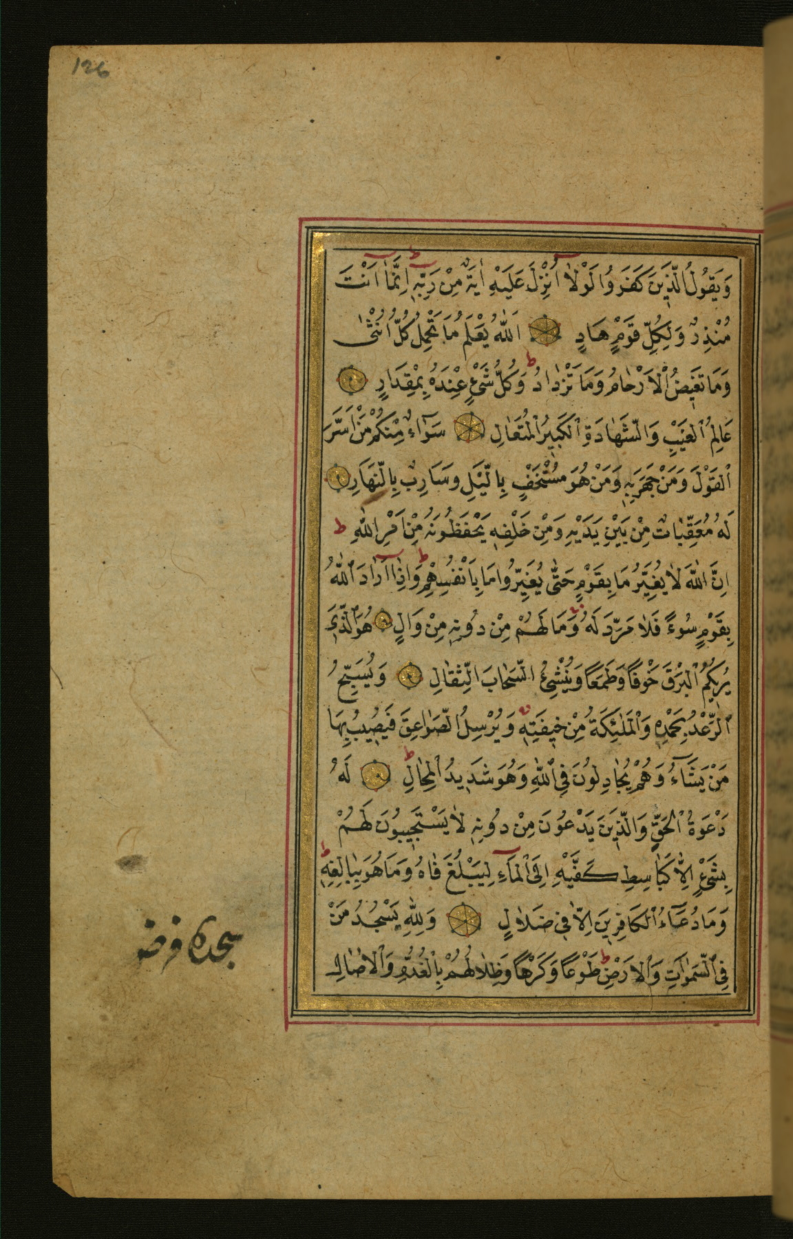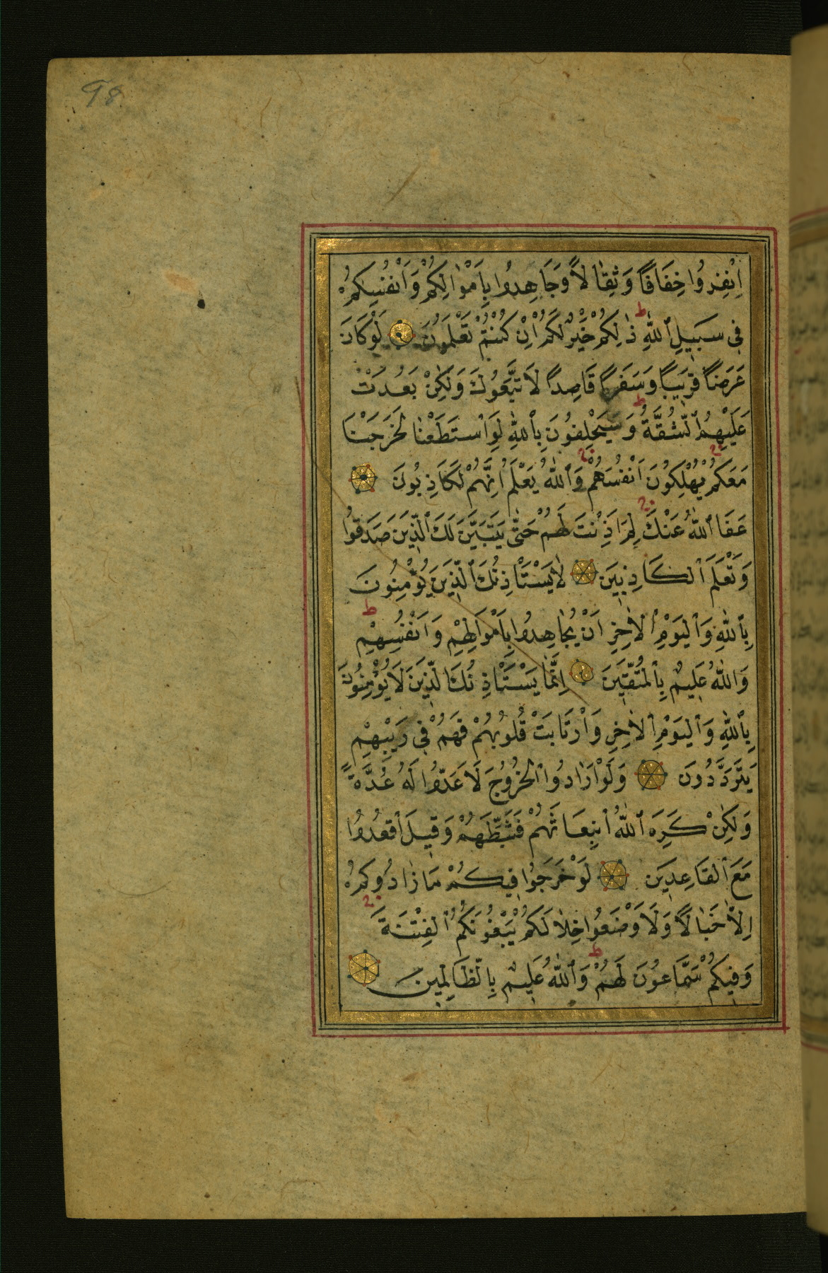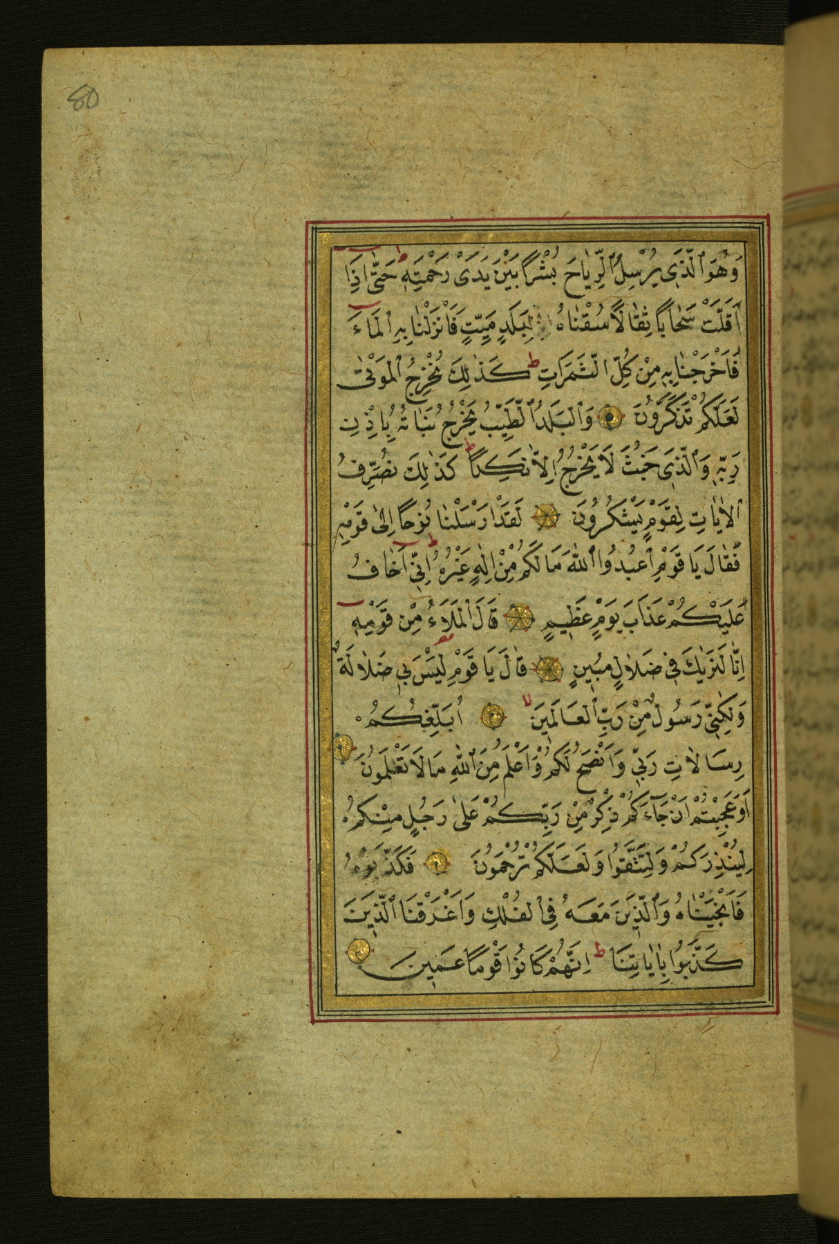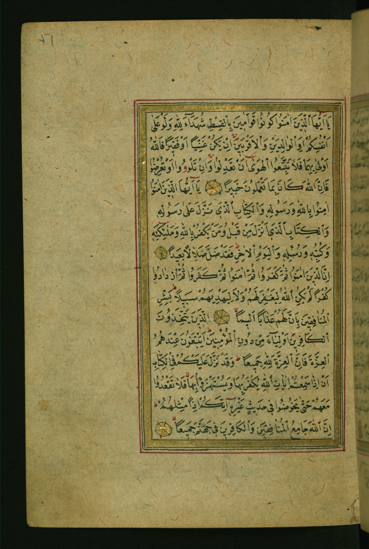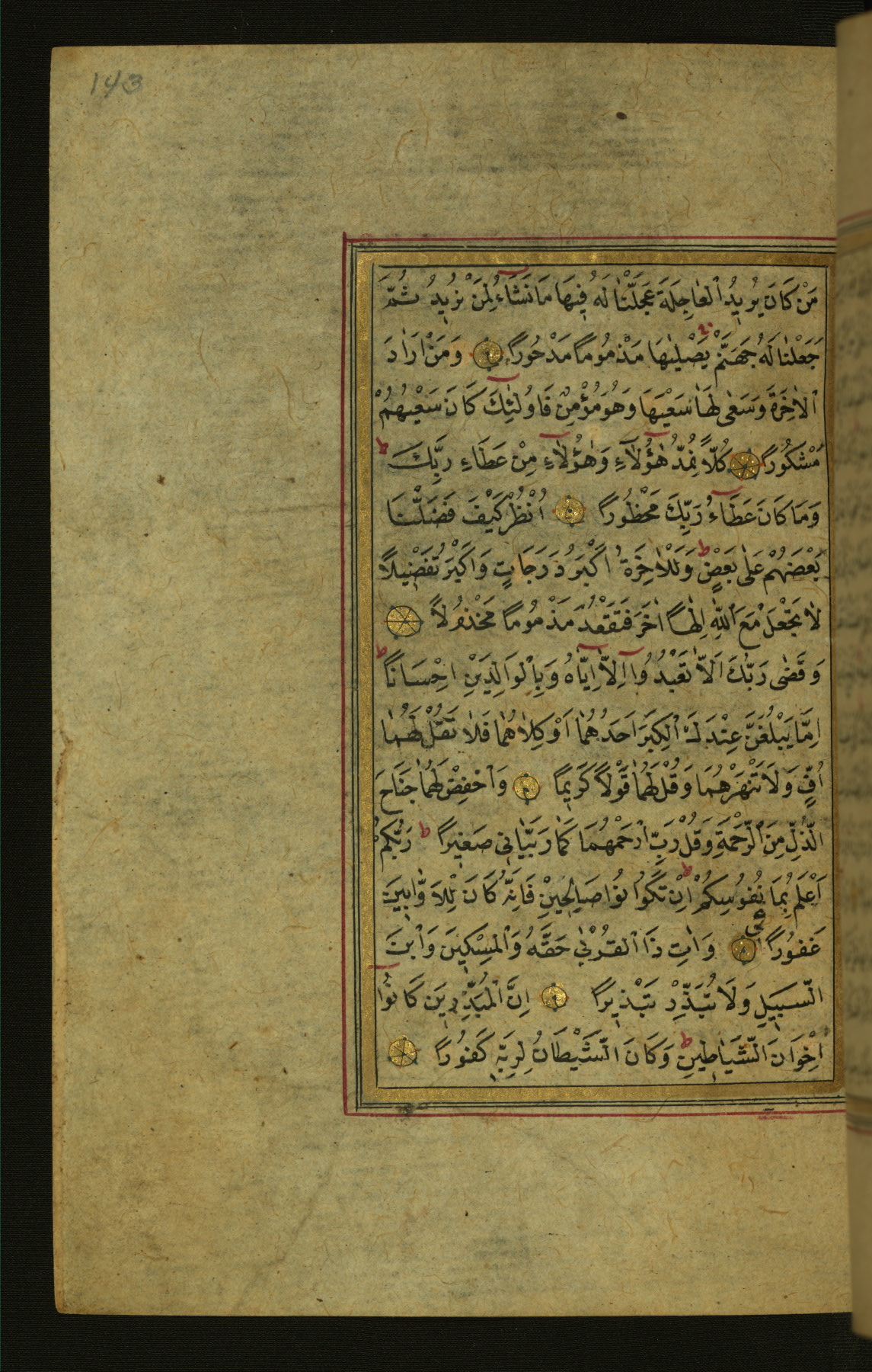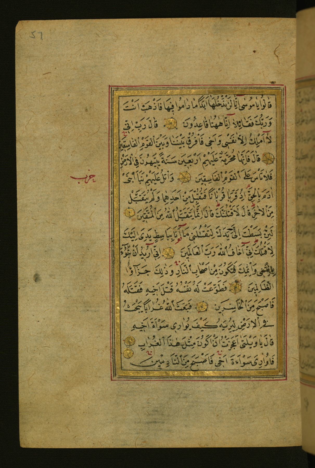 This small, illuminated single-volume copy of the Qurʾan was produced in Ottoman Turkey in 1282 AH / 1865-6 CE by Muḥammad ibn Muṣṭafá Izmīrī, a pupil of al-Rudūsī. The colophon in ijāzah script indicates that the present codex is the twenty-first copy executed by him (fol. 304b). The manuscript opens with an illuminated double-page incipit with the verses of chapters 1 (Sūrat al-fātiḥah) and 2 (Sūrat al-baqarah) (fols. 1b-2a). The text is written in naskh script in black ink with reading marks in red. Verses are separated by illuminated discs with colored dots and chapter headings are in riqāʿ script in white ink. Polychrome medallions in the margins indicate textual divisions and prostration. The binding of black leather is contemporary with the manuscript and decorated with a tooled and gold-painted geometric design enclosed by gold frames on the upper and lower boards.