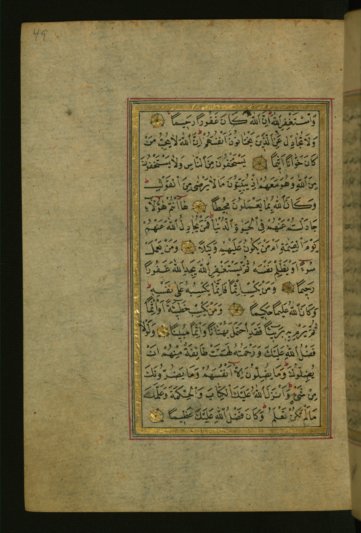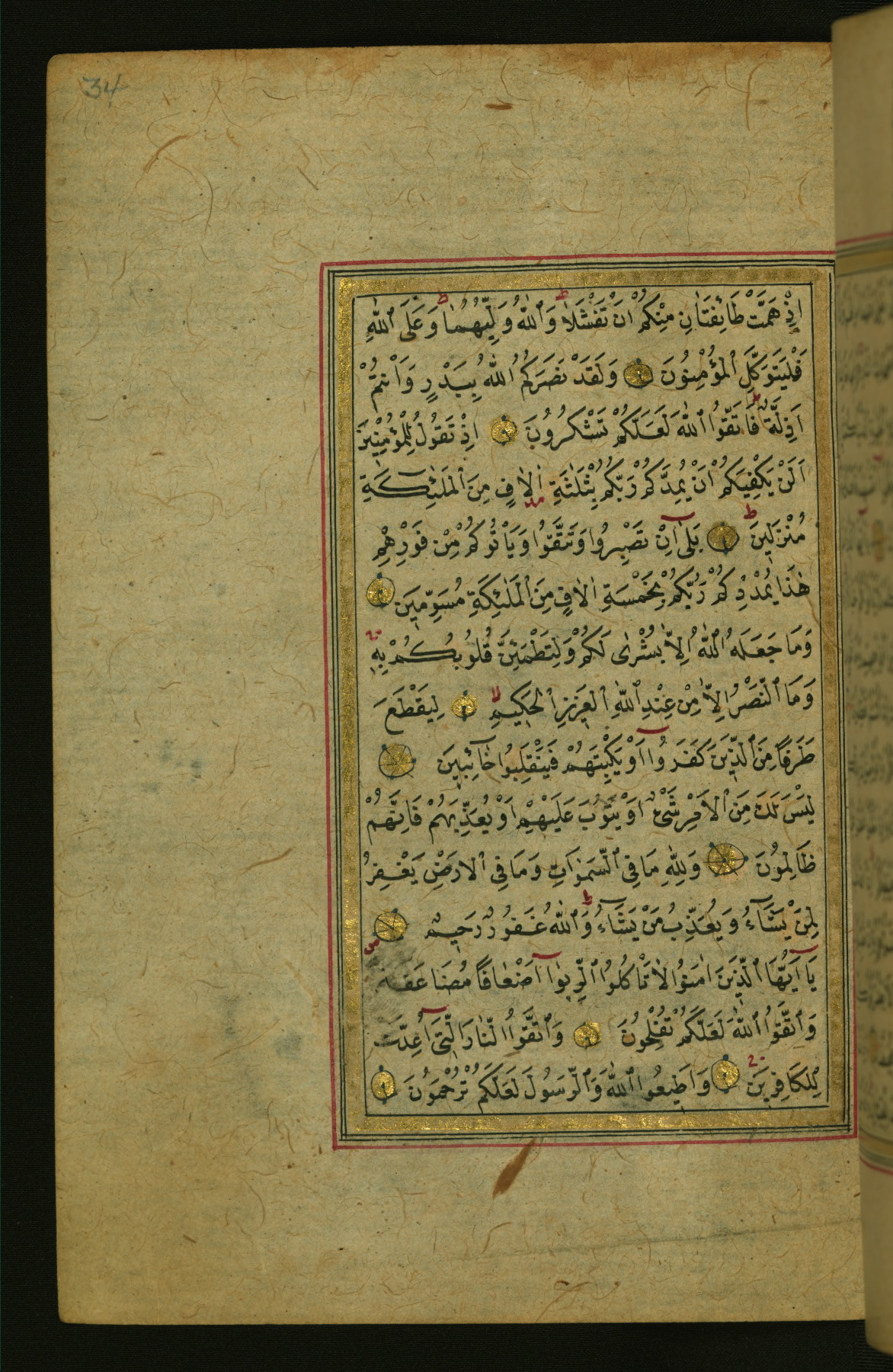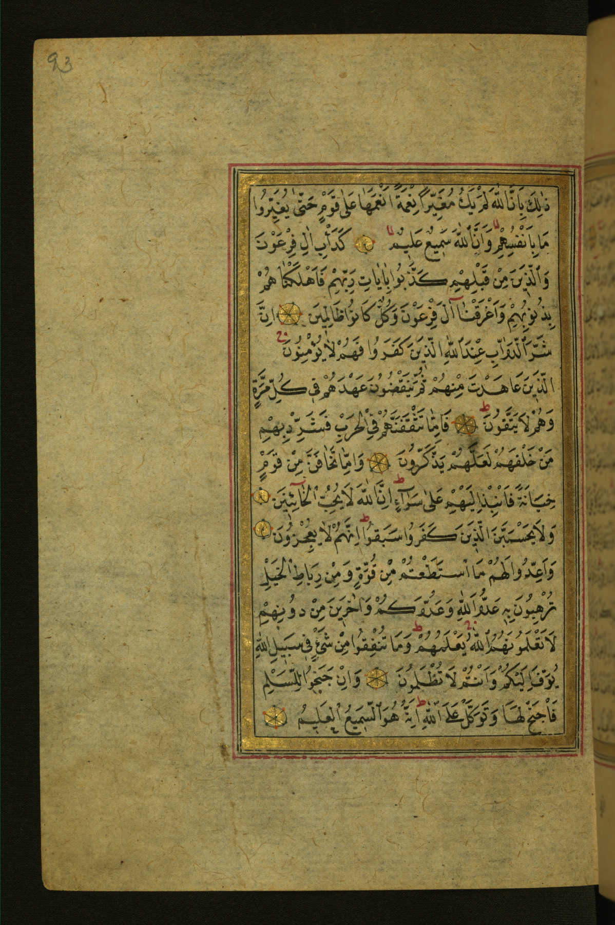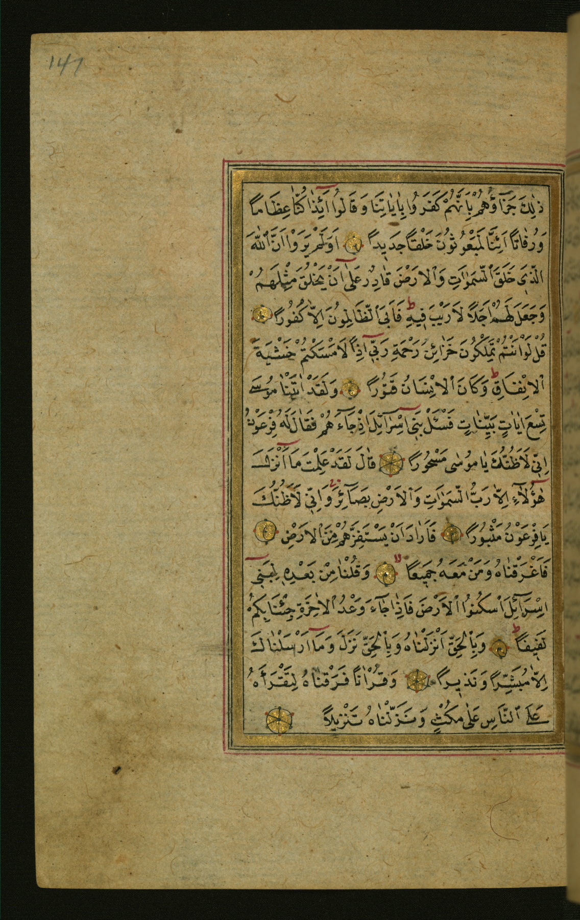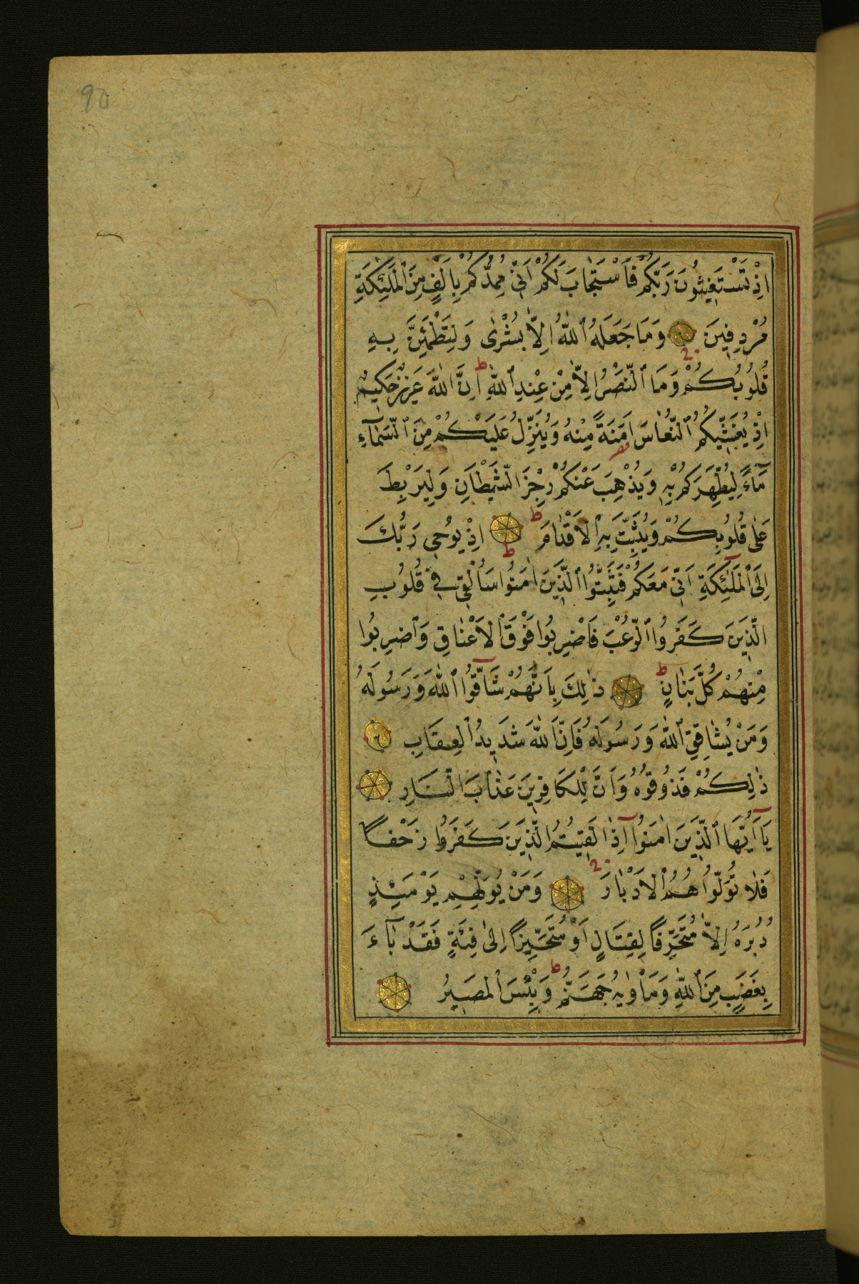 This small, illuminated single-volume copy of the Qurʾan was produced in Ottoman Turkey in 1282 AH / 1865-6 CE by Muḥammad ibn Muṣṭafá Izmīrī, a pupil of al-Rudūsī. The colophon in ijāzah script indicates that the present codex is the twenty-first copy executed by him (fol. 304b). The manuscript opens with an illuminated double-page incipit with the verses of chapters 1 (Sūrat al-fātiḥah) and 2 (Sūrat al-baqarah) (fols. 1b-2a). The text is written in naskh script in black ink with reading marks in red. Verses are separated by illuminated discs with colored dots and chapter headings are in riqāʿ script in white ink. Polychrome medallions in the margins indicate textual divisions and prostration. The binding of black leather is contemporary with the manuscript and decorated with a tooled and gold-painted geometric design enclosed by gold frames on the upper and lower boards.