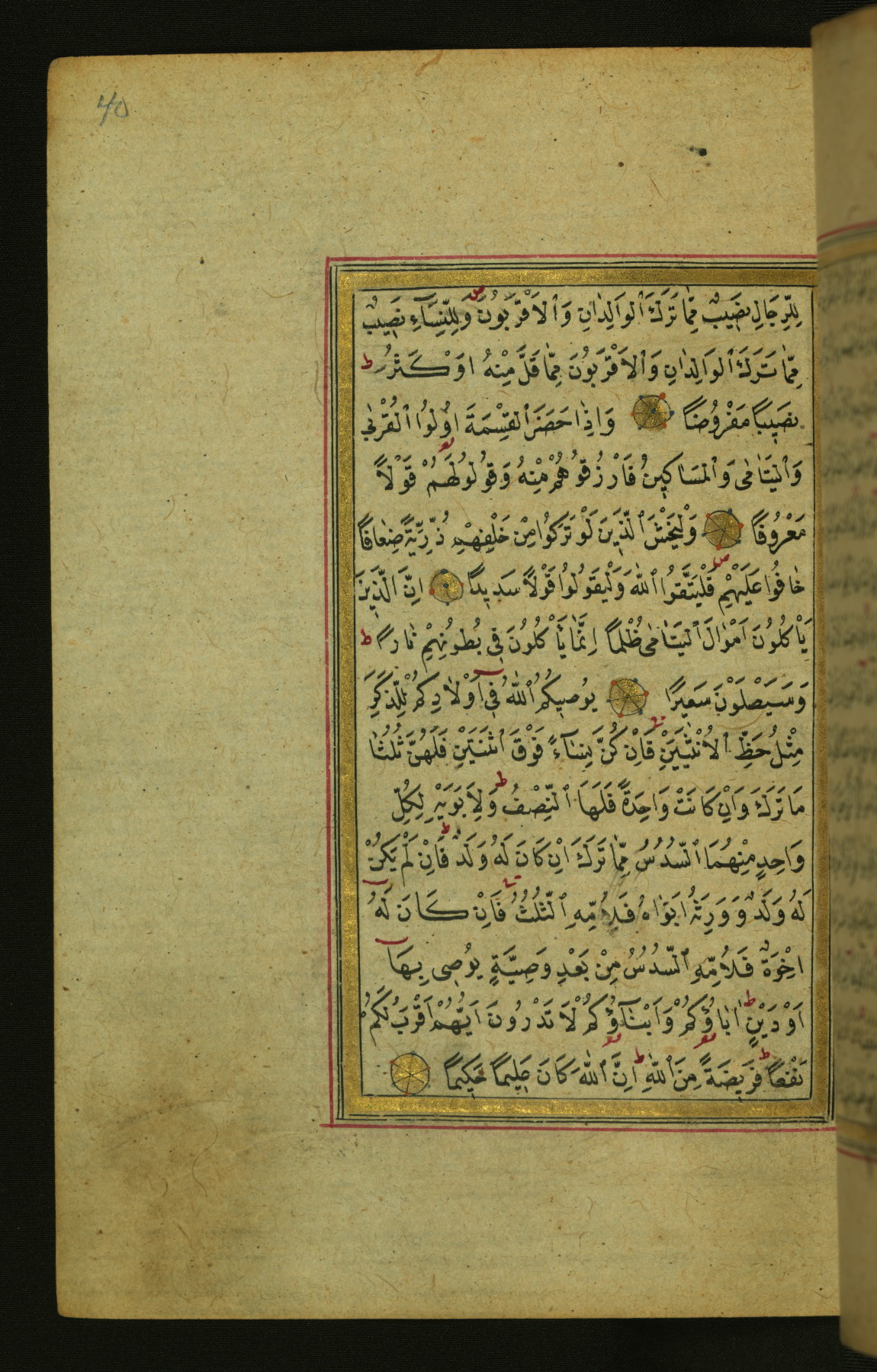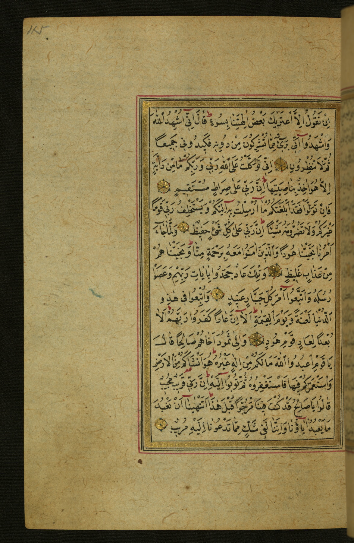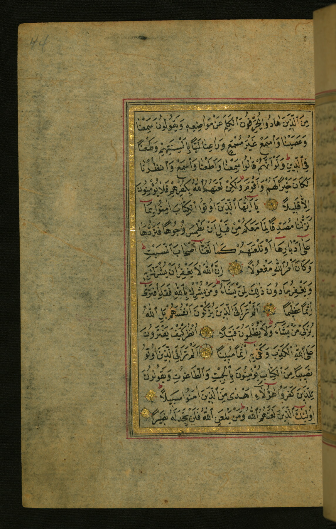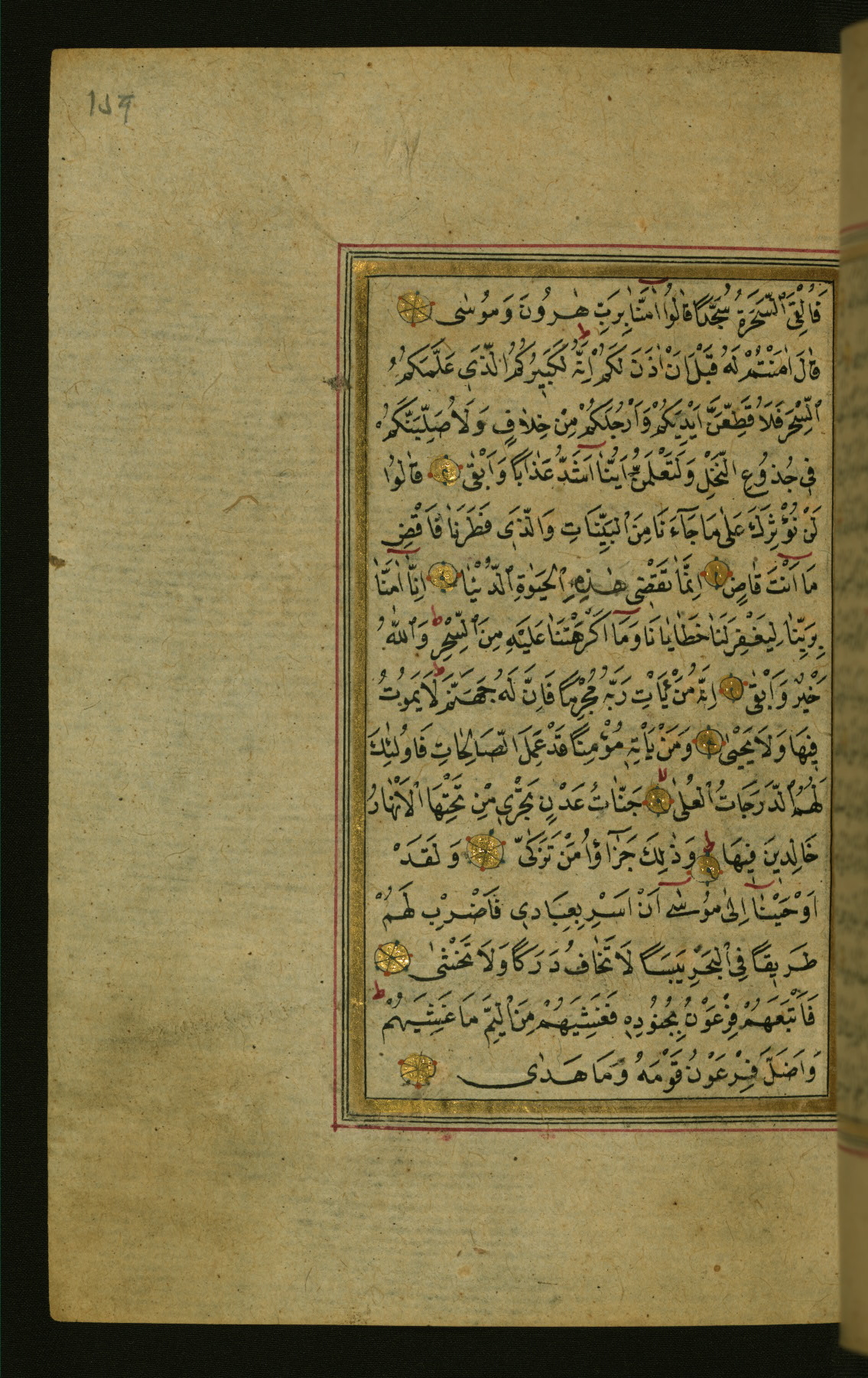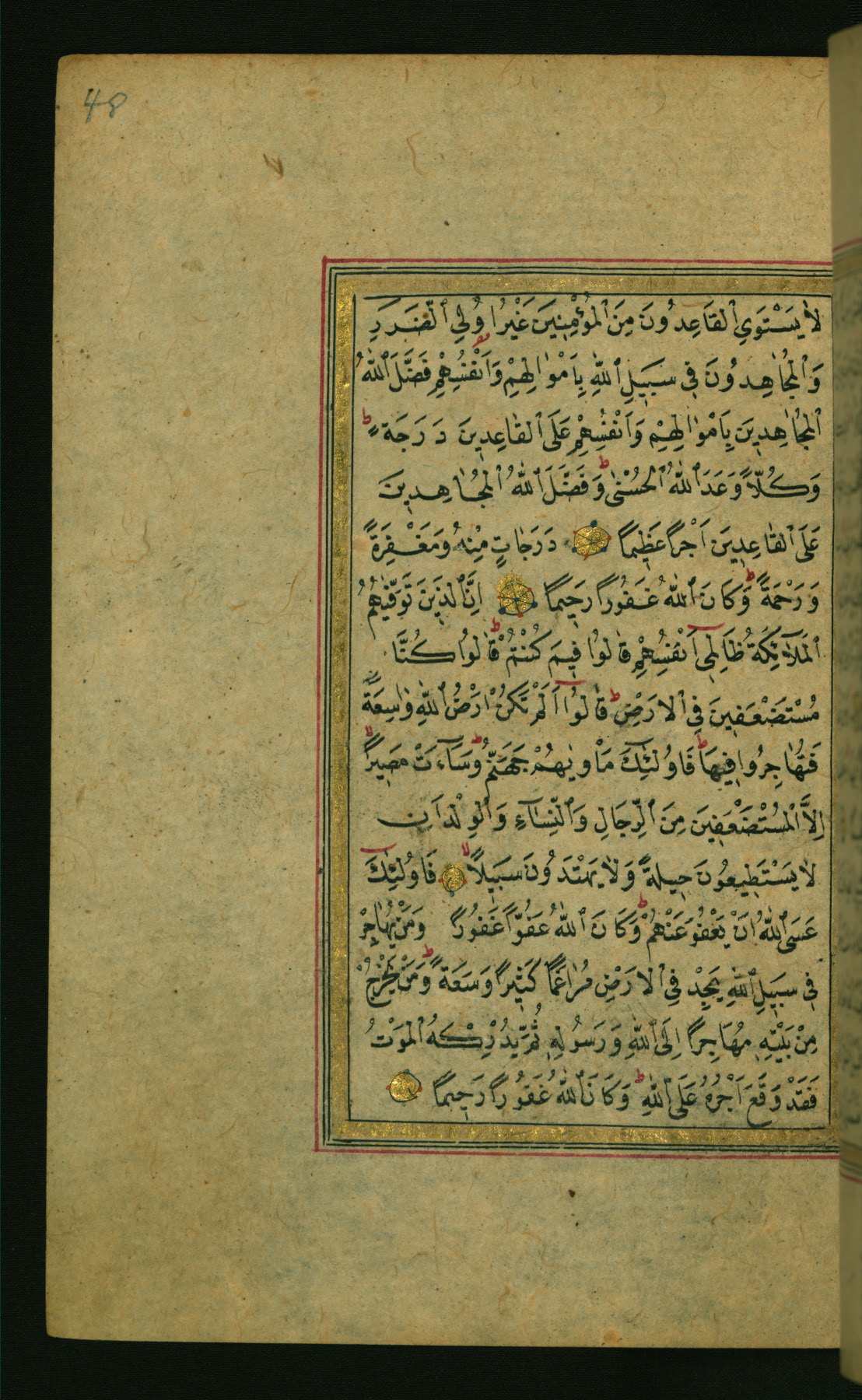 This small, illuminated single-volume copy of the Qurʾan was produced in Ottoman Turkey in 1282 AH / 1865-6 CE by Muḥammad ibn Muṣṭafá Izmīrī, a pupil of al-Rudūsī. The colophon in ijāzah script indicates that the present codex is the twenty-first copy executed by him (fol. 304b). The manuscript opens with an illuminated double-page incipit with the verses of chapters 1 (Sūrat al-fātiḥah) and 2 (Sūrat al-baqarah) (fols. 1b-2a). The text is written in naskh script in black ink with reading marks in red. Verses are separated by illuminated discs with colored dots and chapter headings are in riqāʿ script in white ink. Polychrome medallions in the margins indicate textual divisions and prostration. The binding of black leather is contemporary with the manuscript and decorated with a tooled and gold-painted geometric design enclosed by gold frames on the upper and lower boards.