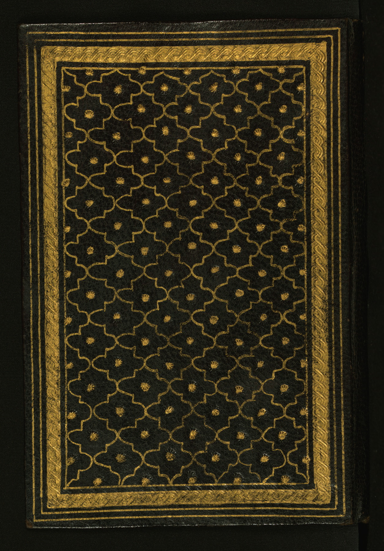 - Label: This nineteenth-century Ottoman Turkish black leather binding is decorated with a tooled and gold-painted geometric design enclosed by frames, including a wide frame with tooled chain-link design.