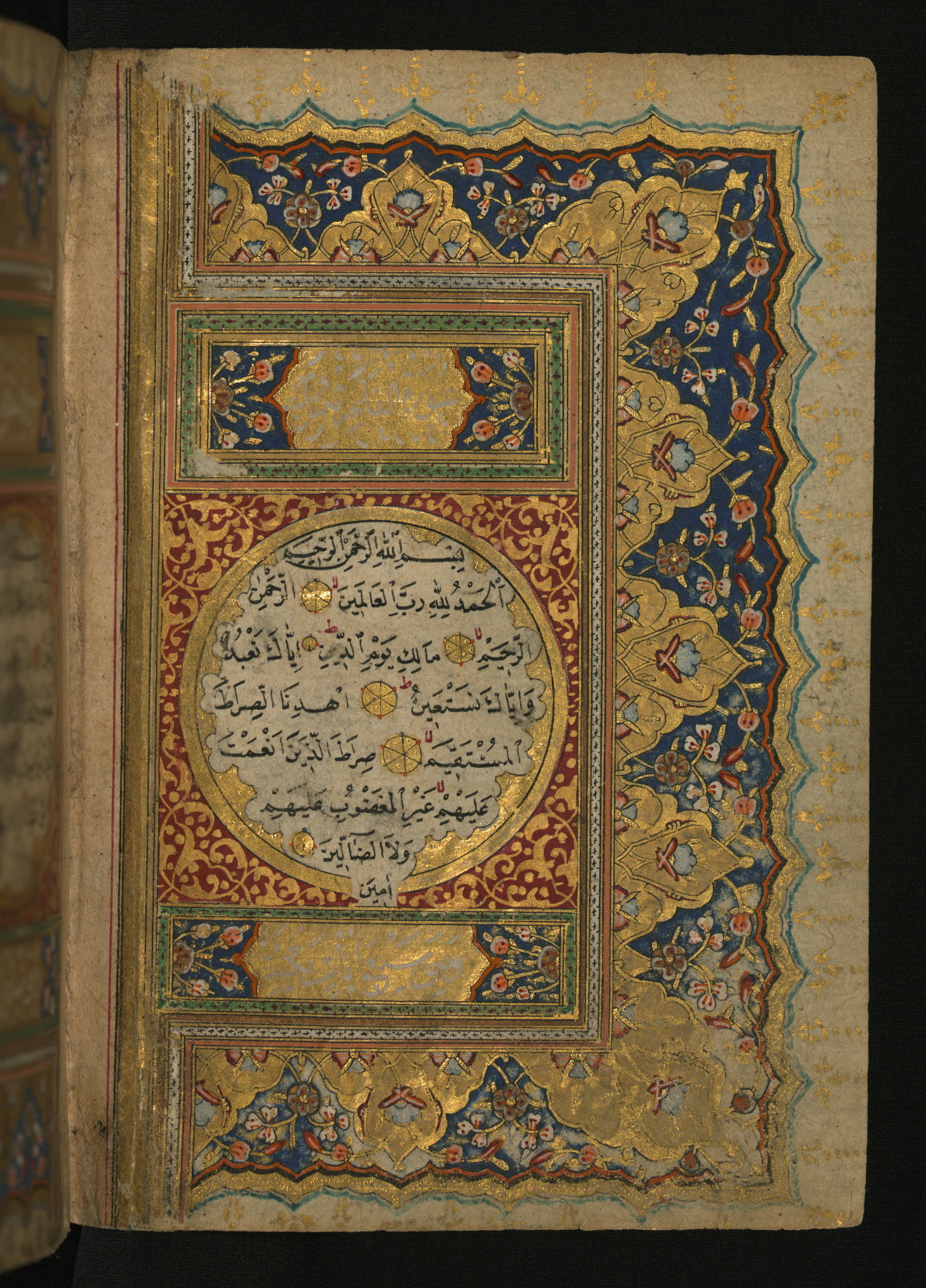 - Label: The right side of this illuminated double-page incipit is the incipit for chapter 1 (Sūrat al-fātiḥah). The page is divided into three compartments: an upper and lower panel flanking a central area. In the upper and lower panels the chapter title and number of verses are inscribed in headings in riqāʿ script in white ink. In the central area the Qur'anic verses are written in vocalized naskh script in black ink with reading marks in red. The border contains polychrome trefoils and floral scroll work on a blue ground.