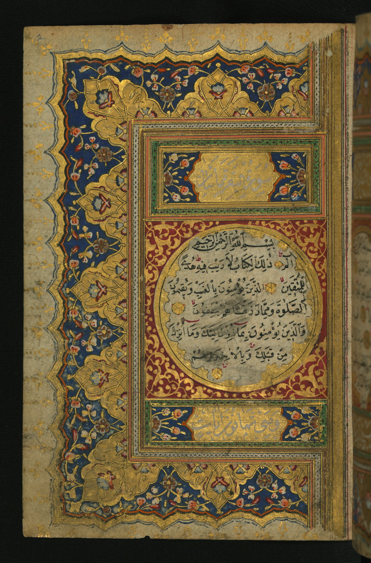 - Label: The left side of this illuminated double-page incipit is the incipit for chapter 2 (Sūrat al-baqarah). The page is divided into three compartments: an upper and lower panel flanking a central area. In the upper and lower panels the chapter title and number of verses are inscribed in headings in riqāʿ script in white ink. In the central area the Qur'anic verses are written in vocalized naskh script in black ink with reading marks in red. The border contains polychrome trefoils and floral scroll work on a blue ground.