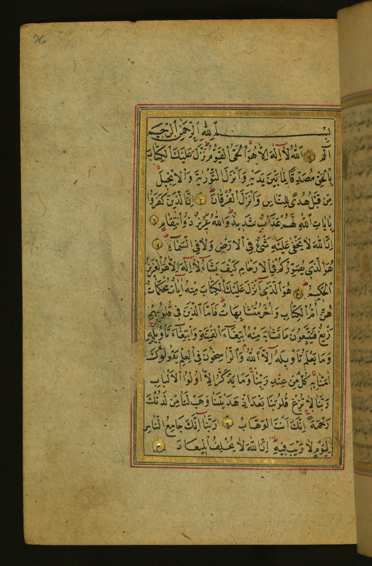 - Label: On this text page are the initial verses of chapter 3 (Sūrat al-'imrān). The text is written in naskh script in black ink with reading marks in red. Illuminated discs with colored dots separate the verses.