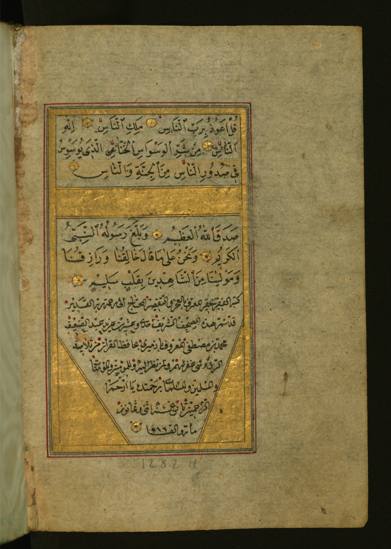 - Label: This final page of the Qur'an has a signed and dated colophon written in ijāzah script. The colophon indicates that the text was copied by Muḥammad ibn Muṣṭafá in 1282 AH / 1865-6 CE. It also indicates that this codex is the twenty-first copy made by this particular calligrapher.