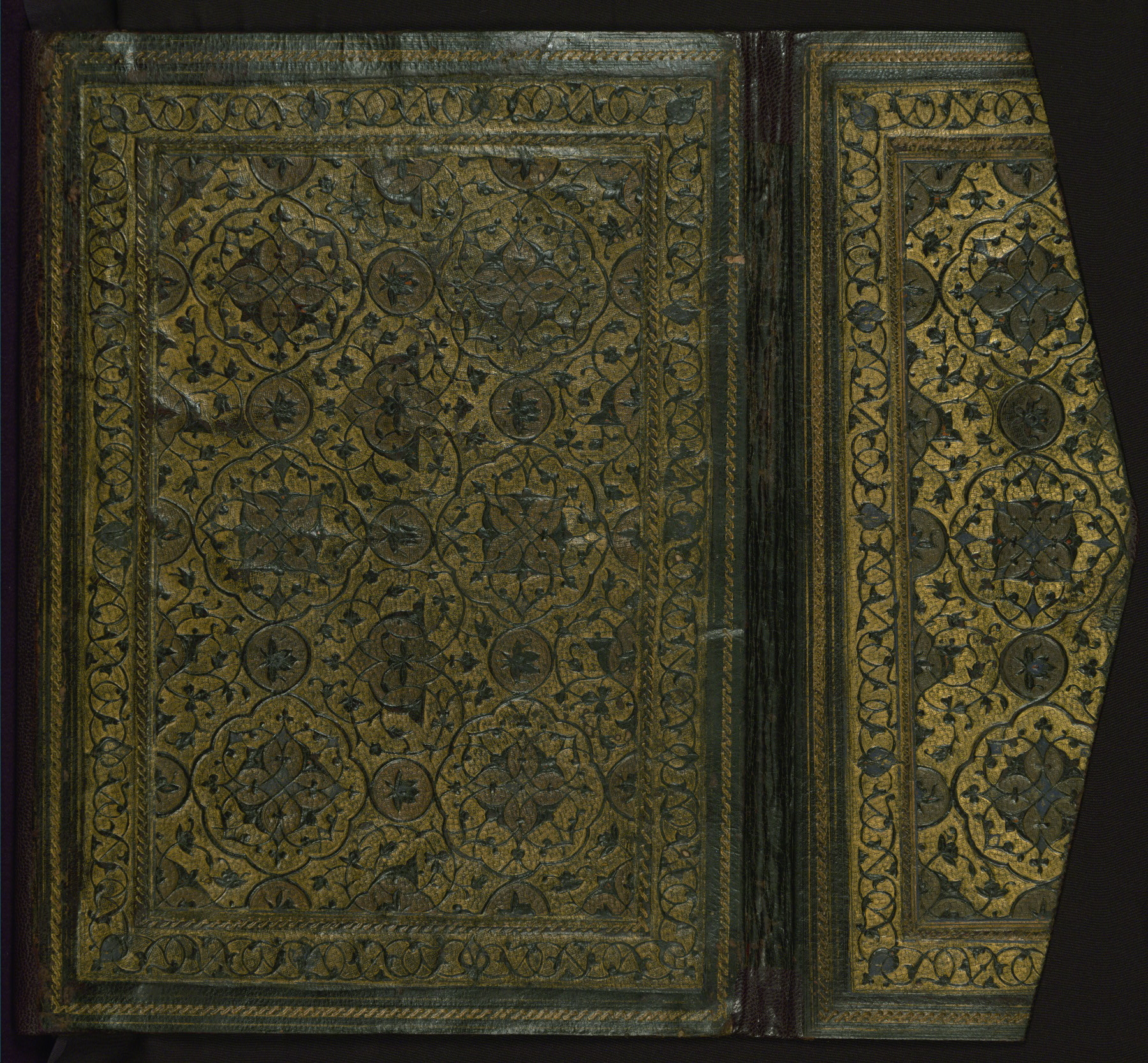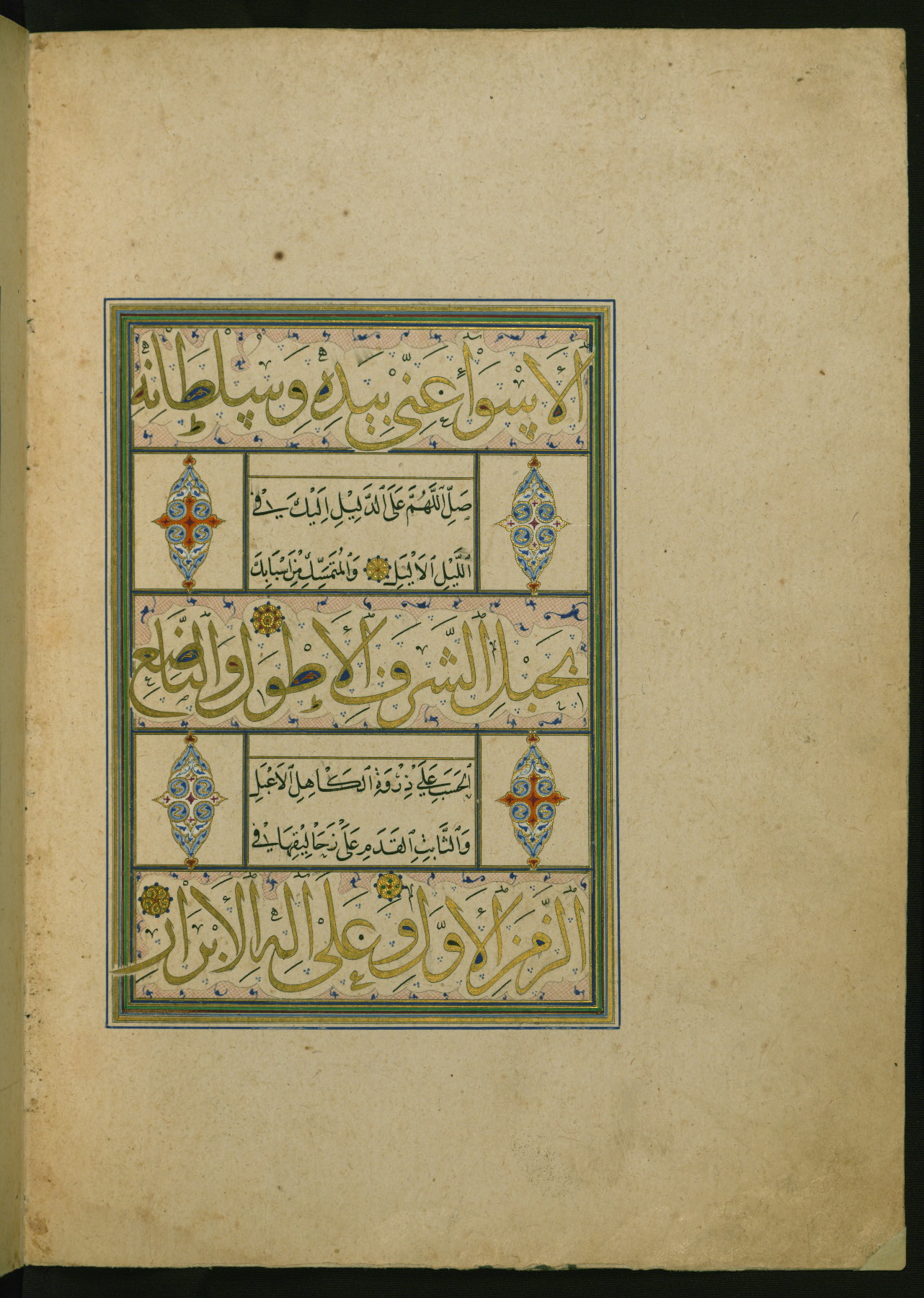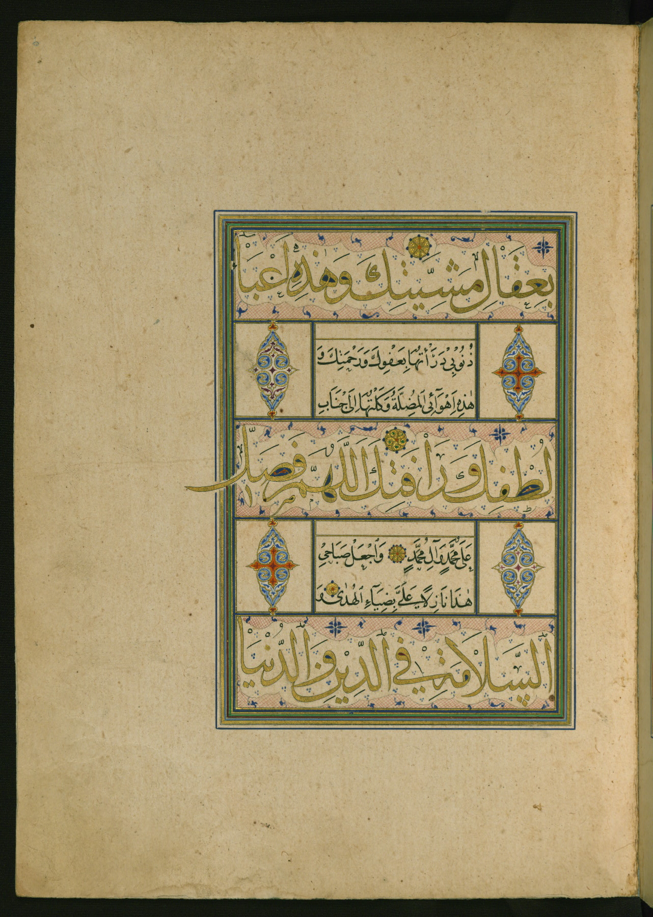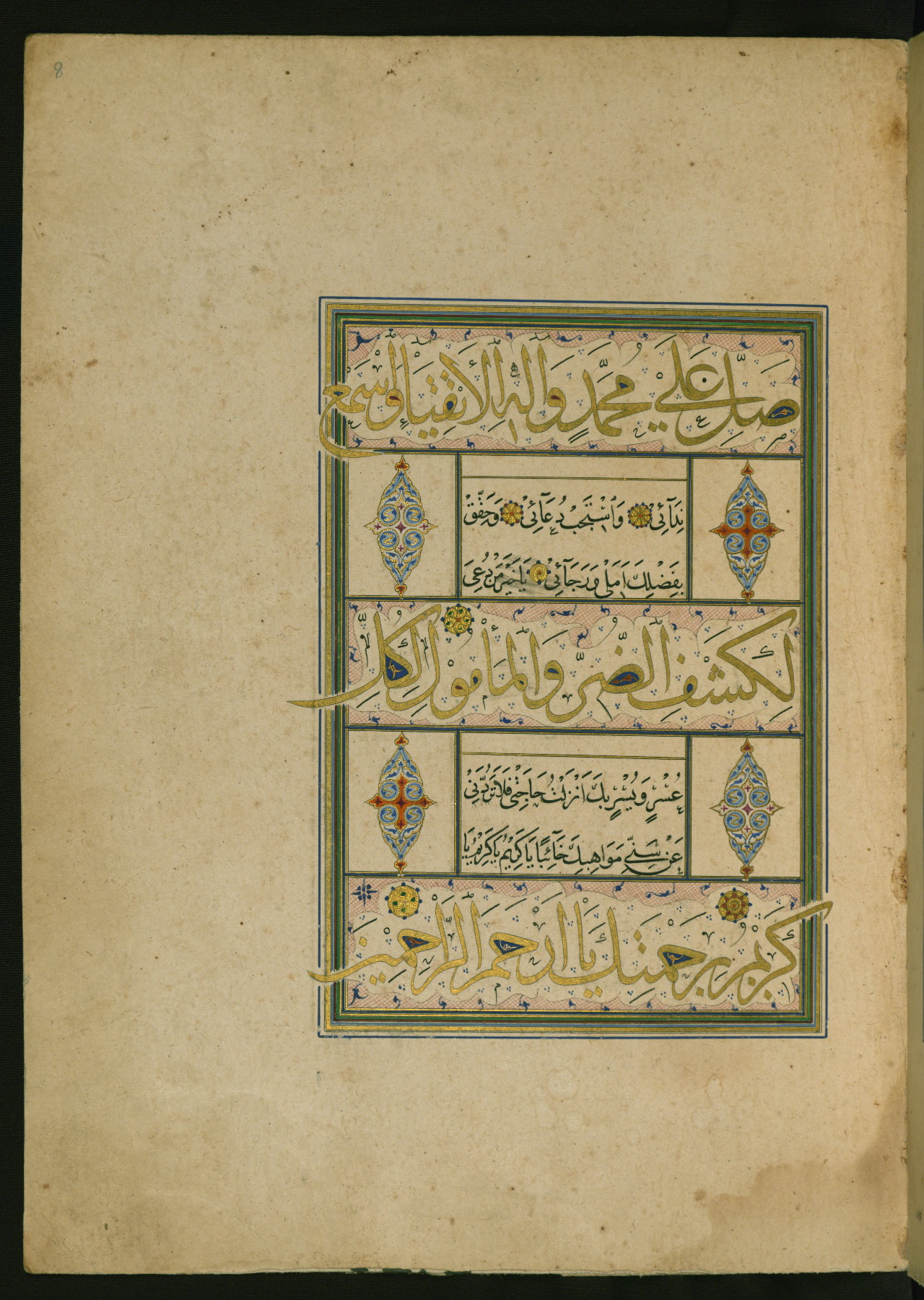 This illuminated manuscript is of a prayer (wird) called Miftāḥ al-najāḥ, attributed to ʿAlī ibn Abī Ṭālib, the fourth caliph of Islam. According to the colophon, it was completed by Shaykh Kamāl ibn ʿAbd al-Ḥaqq al-Sabzawārī, the calligrapher and illuminator, in Astarabad (present-day Gorgan, Iran) in 941 AH / 1534 CE. The text, divided into five compartments, is in calligraphic vocalized naskh in black ink and vocalized thuluth in gold ink outlined in black. Illuminated rosettes with colored dots serve as verse markers. The decorated colophon (fol. 8b) is written in tawqīʿ/riqāʿ script in gold ink. Later bequest (waqf) seal impressions of the Vizier al-Shahīd ʿAlī Pāshā, dated 1130 AH / 1717 CE, appear on fols. 2a, 2b, and 3a. The brown leather binding with interconnected gold-tooled lobed medallions and discs and doublures with filigree decoration is original to the manuscript.