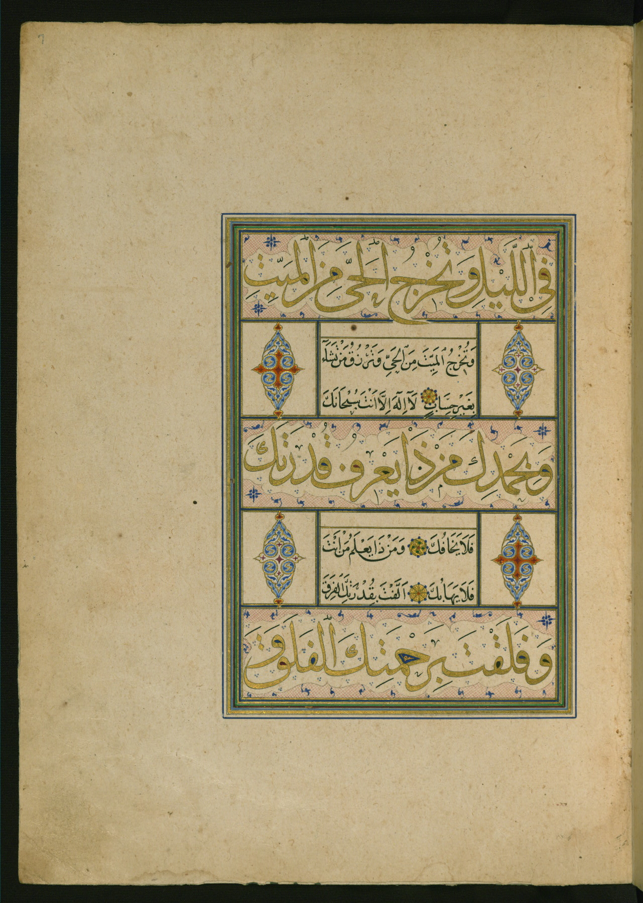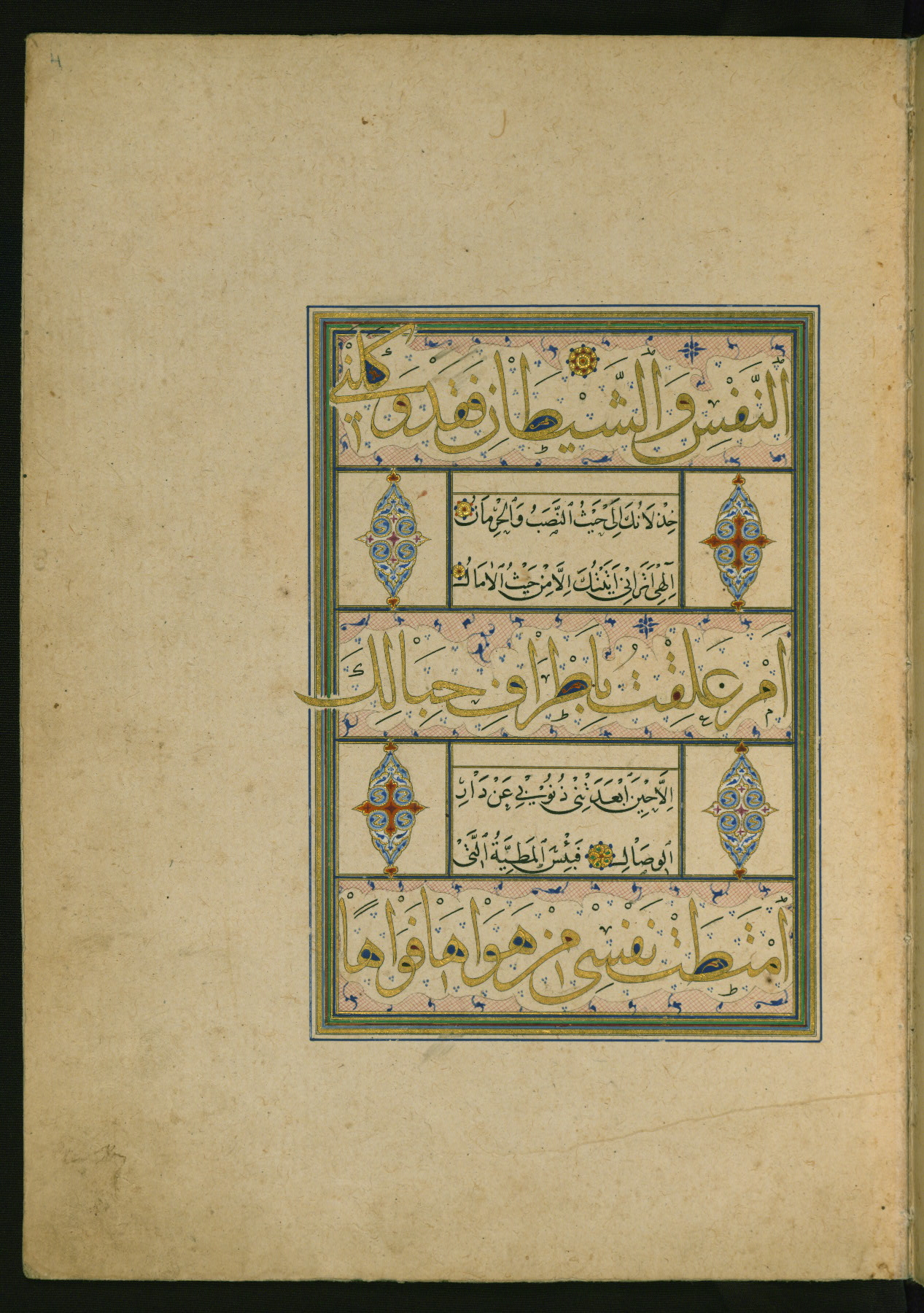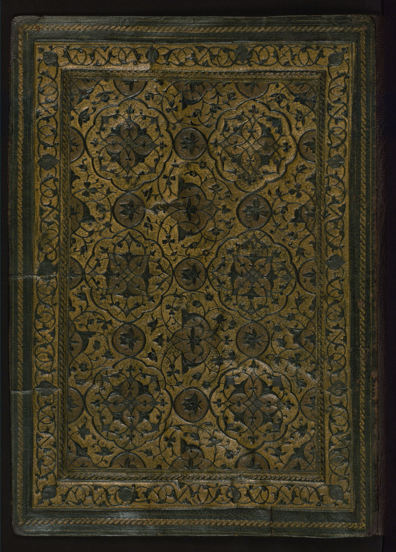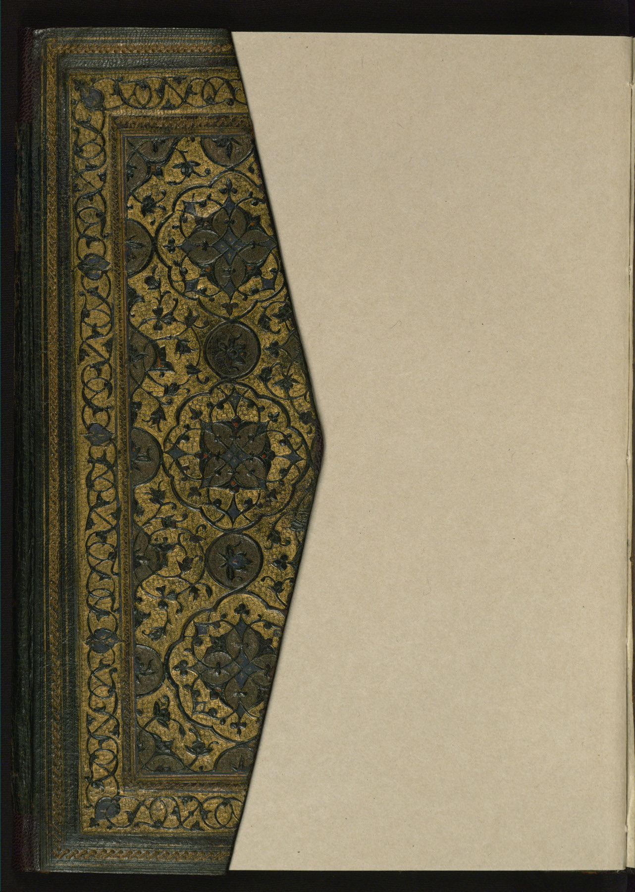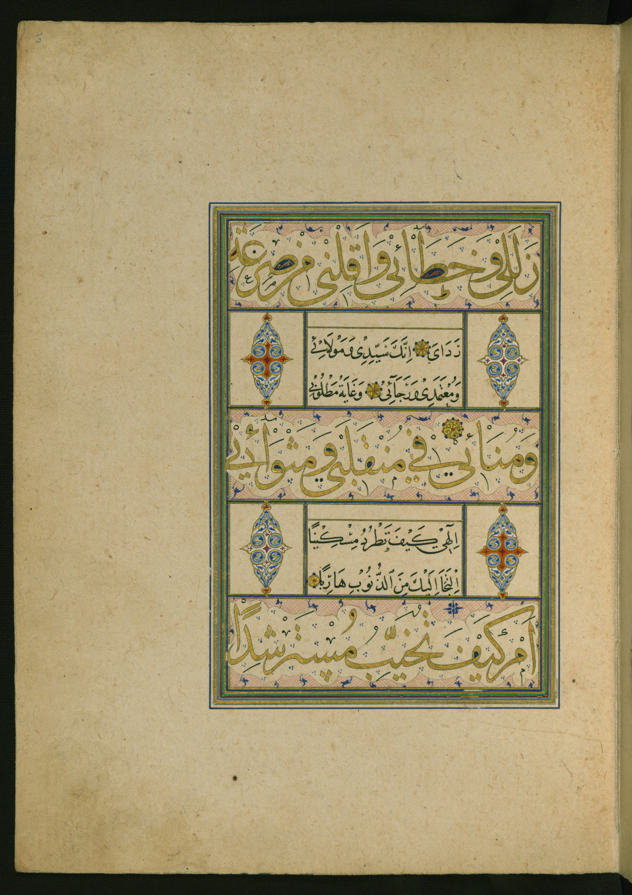 This illuminated manuscript is of a prayer (wird) called Miftāḥ al-najāḥ, attributed to ʿAlī ibn Abī Ṭālib, the fourth caliph of Islam. According to the colophon, it was completed by Shaykh Kamāl ibn ʿAbd al-Ḥaqq al-Sabzawārī, the calligrapher and illuminator, in Astarabad (present-day Gorgan, Iran) in 941 AH / 1534 CE. The text, divided into five compartments, is in calligraphic vocalized naskh in black ink and vocalized thuluth in gold ink outlined in black. Illuminated rosettes with colored dots serve as verse markers. The decorated colophon (fol. 8b) is written in tawqīʿ/riqāʿ script in gold ink. Later bequest (waqf) seal impressions of the Vizier al-Shahīd ʿAlī Pāshā, dated 1130 AH / 1717 CE, appear on fols. 2a, 2b, and 3a. The brown leather binding with interconnected gold-tooled lobed medallions and discs and doublures with filigree decoration is original to the manuscript.