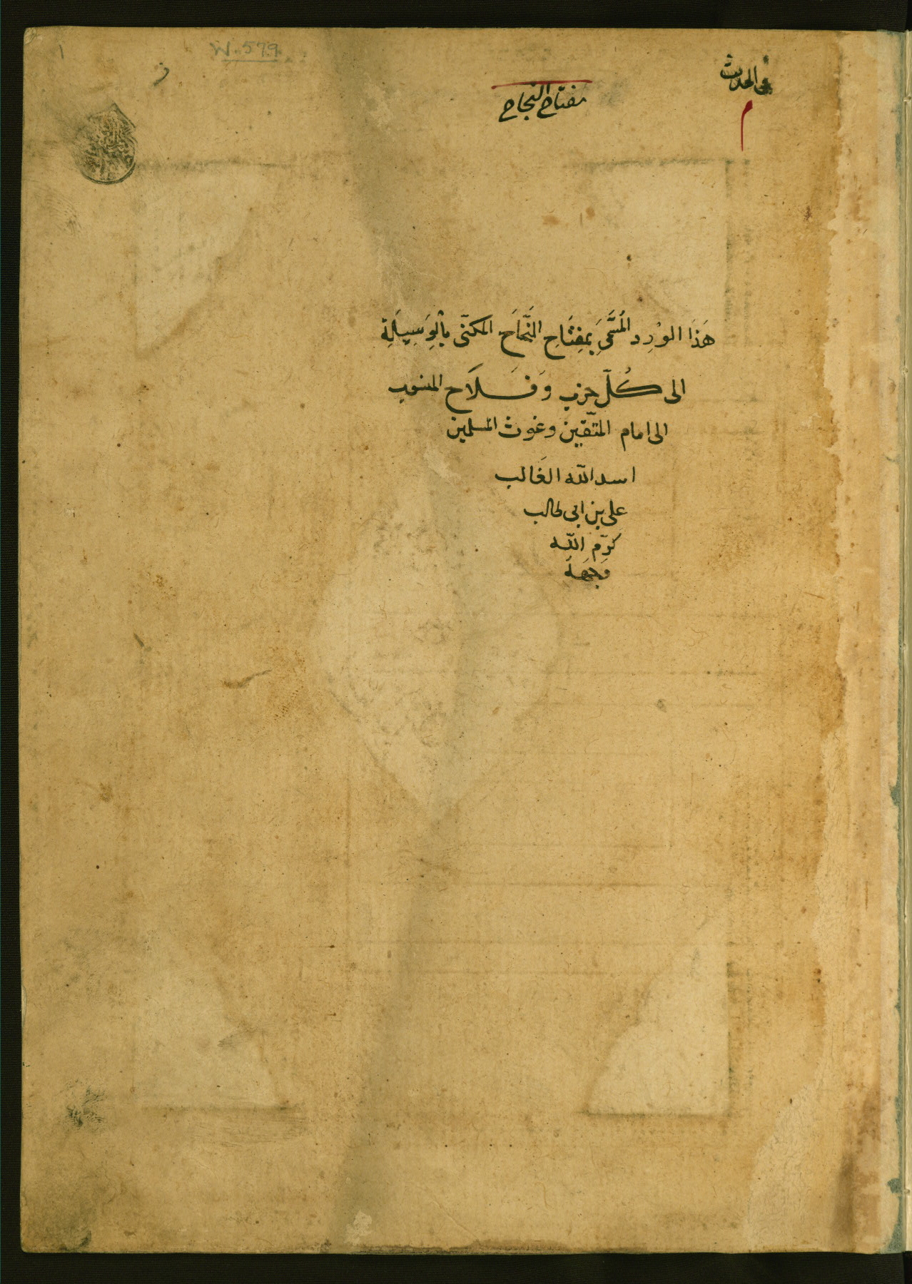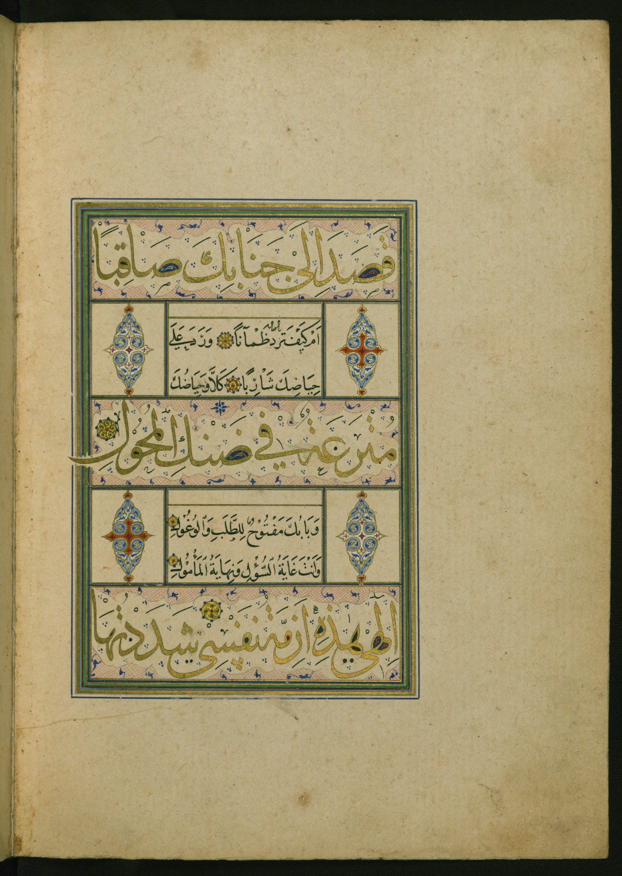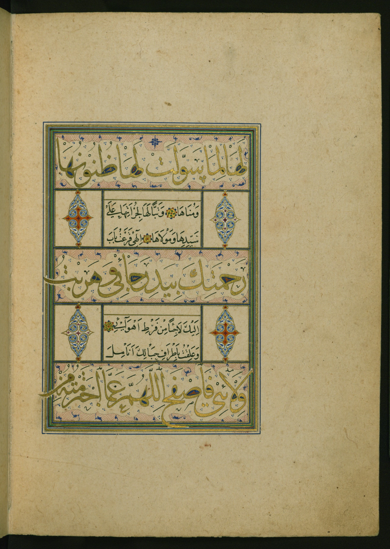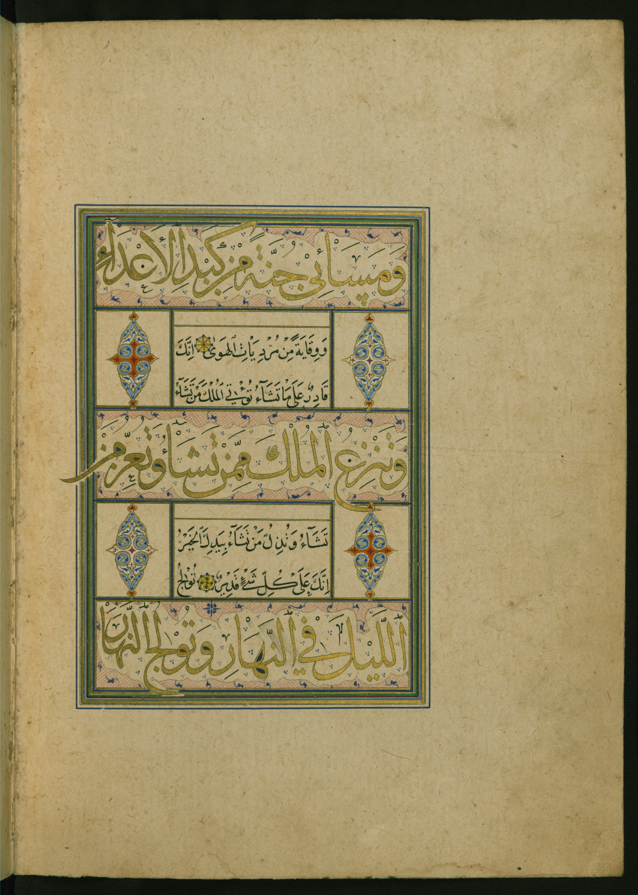 This illuminated manuscript is of a prayer (wird) called Miftāḥ al-najāḥ, attributed to ʿAlī ibn Abī Ṭālib, the fourth caliph of Islam. According to the colophon, it was completed by Shaykh Kamāl ibn ʿAbd al-Ḥaqq al-Sabzawārī, the calligrapher and illuminator, in Astarabad (present-day Gorgan, Iran) in 941 AH / 1534 CE. The text, divided into five compartments, is in calligraphic vocalized naskh in black ink and vocalized thuluth in gold ink outlined in black. Illuminated rosettes with colored dots serve as verse markers. The decorated colophon (fol. 8b) is written in tawqīʿ/riqāʿ script in gold ink. Later bequest (waqf) seal impressions of the Vizier al-Shahīd ʿAlī Pāshā, dated 1130 AH / 1717 CE, appear on fols. 2a, 2b, and 3a. The brown leather binding with interconnected gold-tooled lobed medallions and discs and doublures with filigree decoration is original to the manuscript.