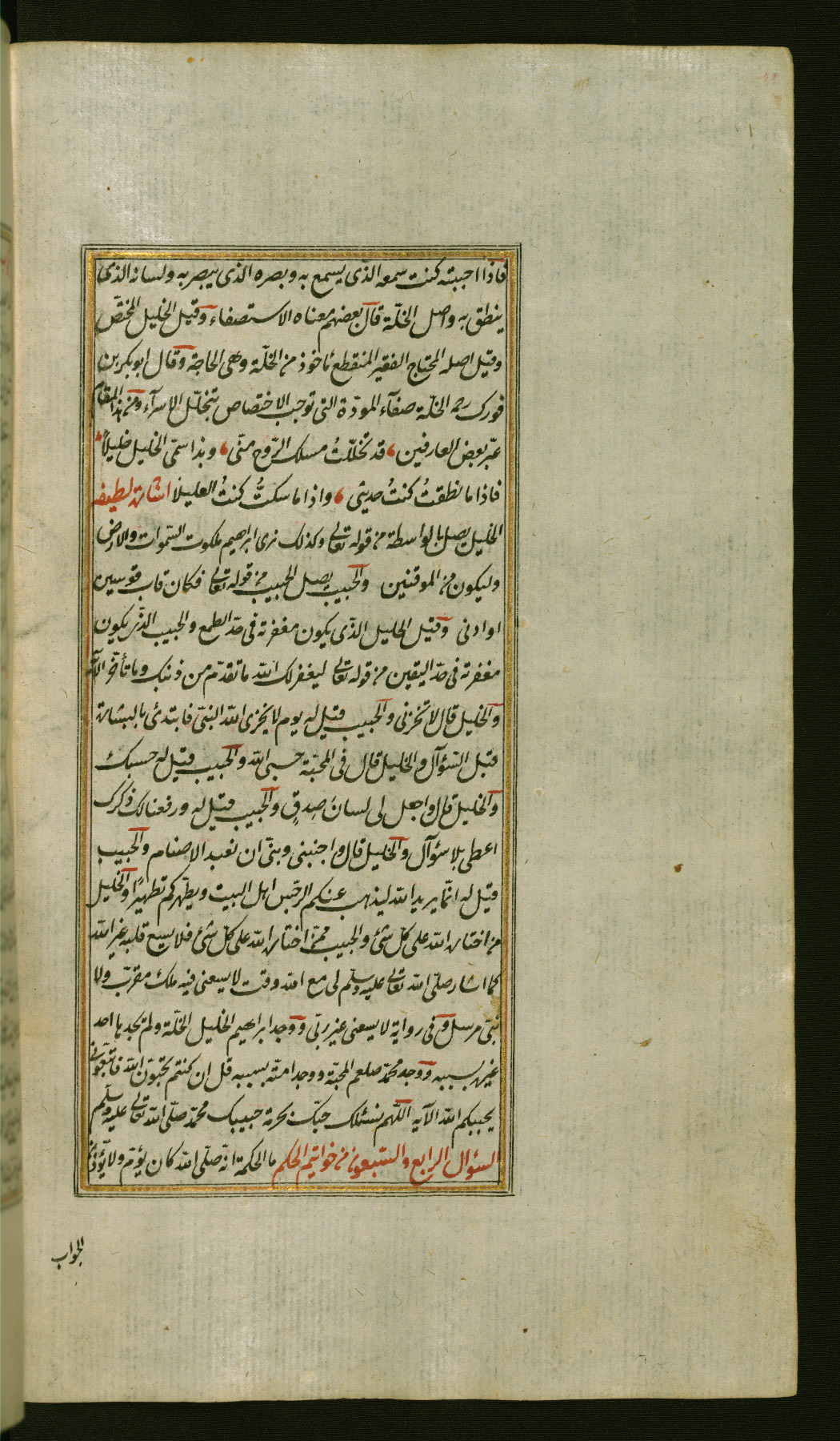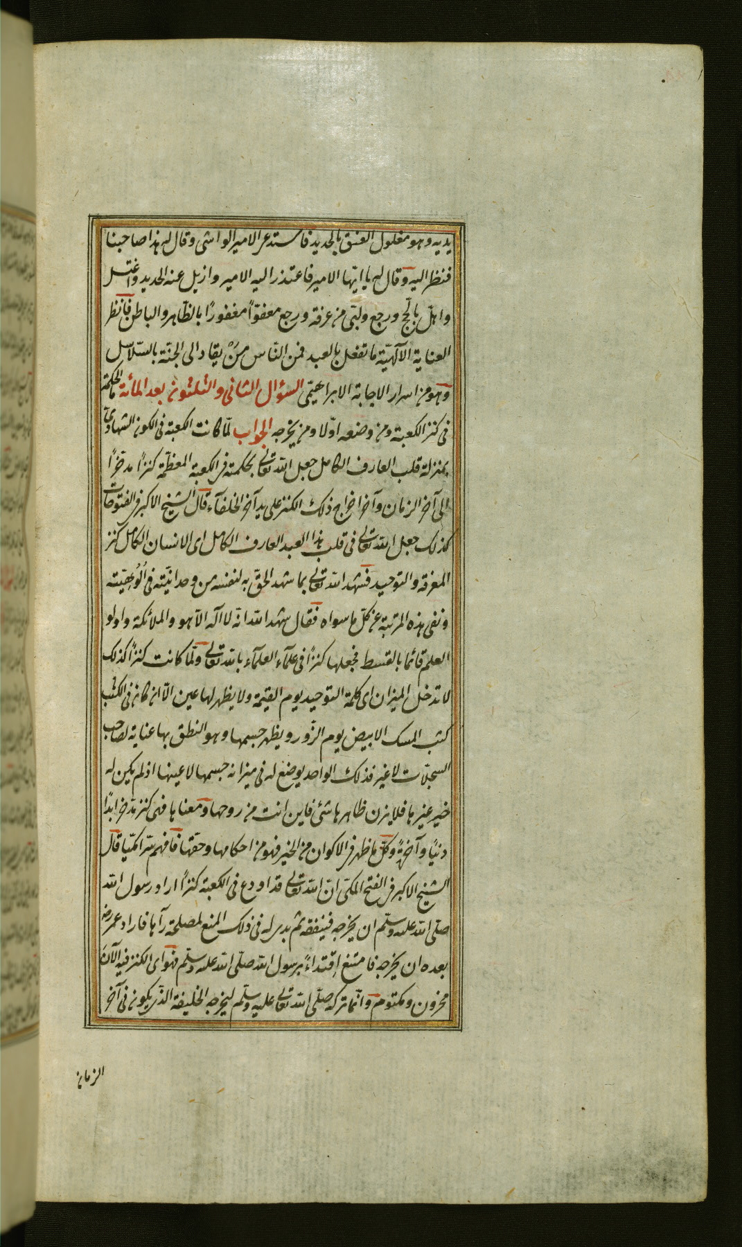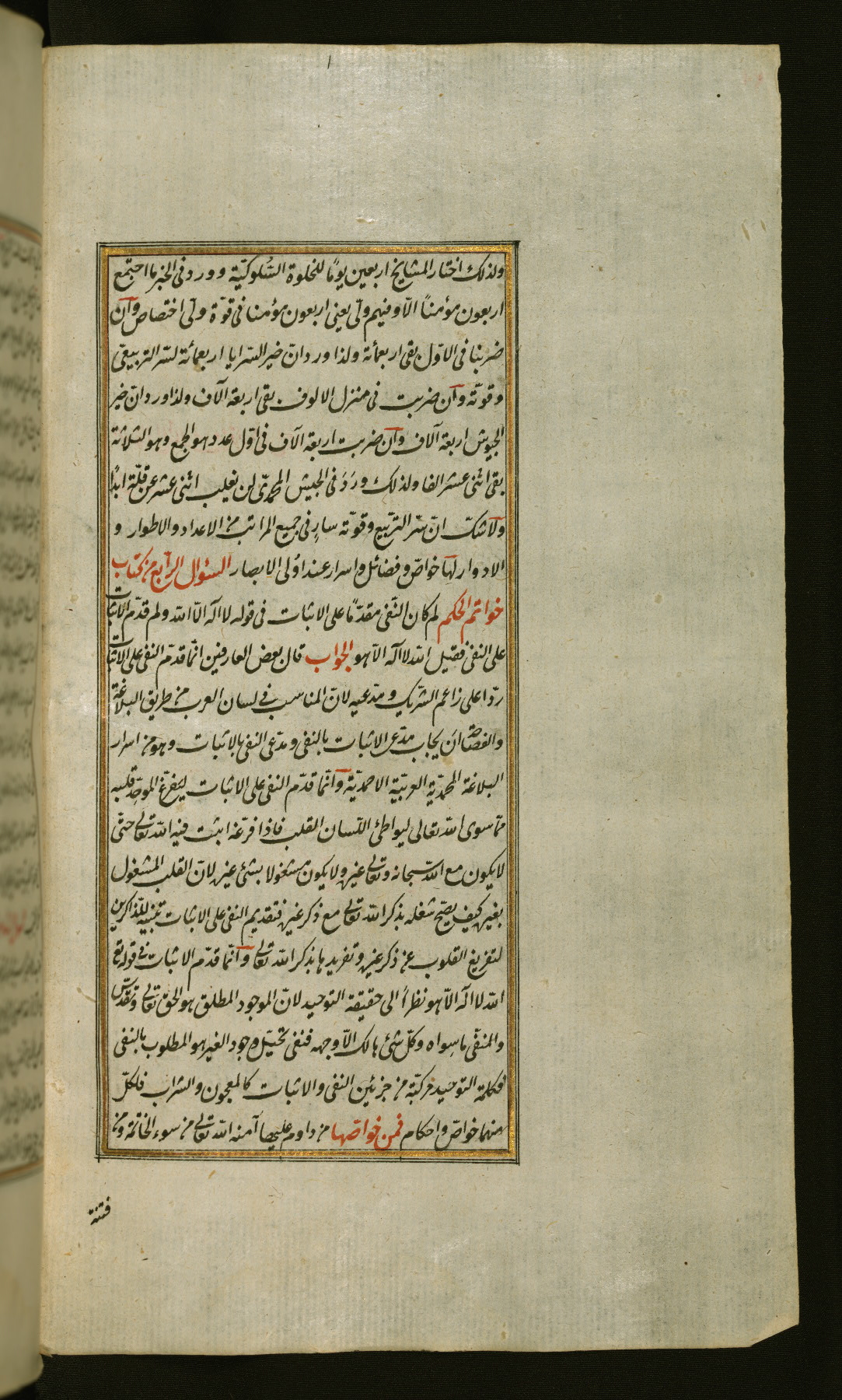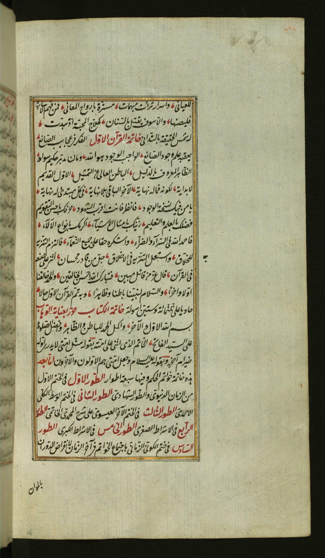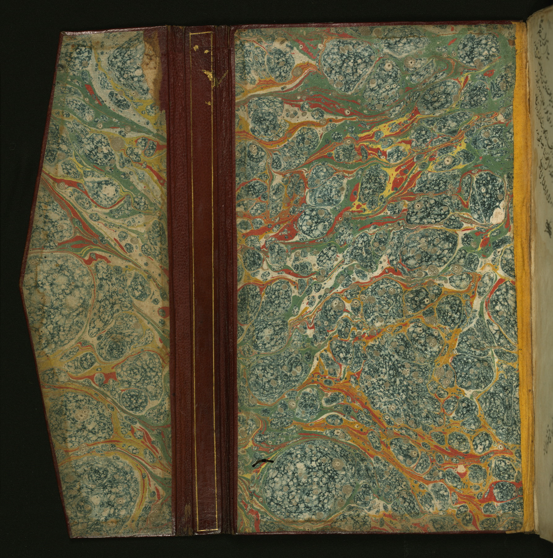 This work on Sufism in the form of questions entitled Khawātim al-ḥikam is by ʿAlī Dede al-Būsnawī (d. 1007 AH / 1598 CE). This particular Ottoman copy was written in nastaʿlīq script by Muṣṭafá ibn al-Ḥājj Muḥammad in 1081 AH / 1670 CE. The Arabic text begins with an illuminated headpiece (fol. 1b). The red leather binding with central lobed oval with arabesques on a gold ground is contemporary with the manuscript.