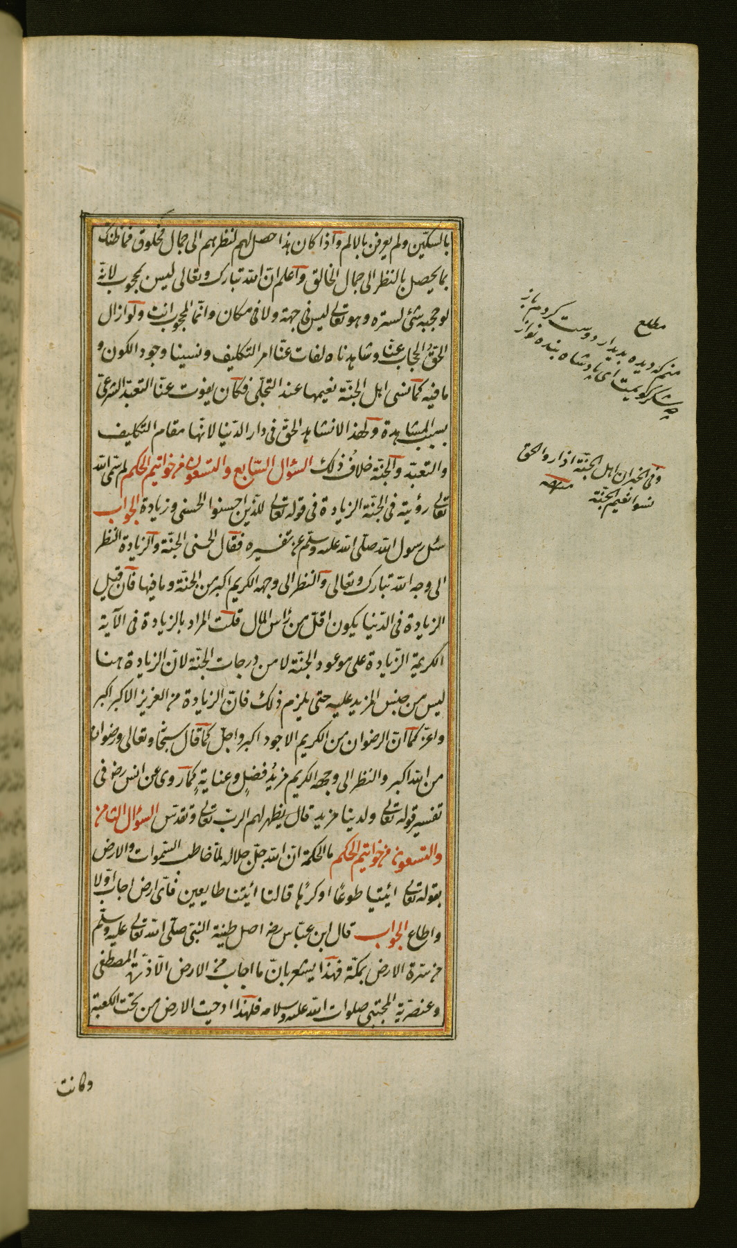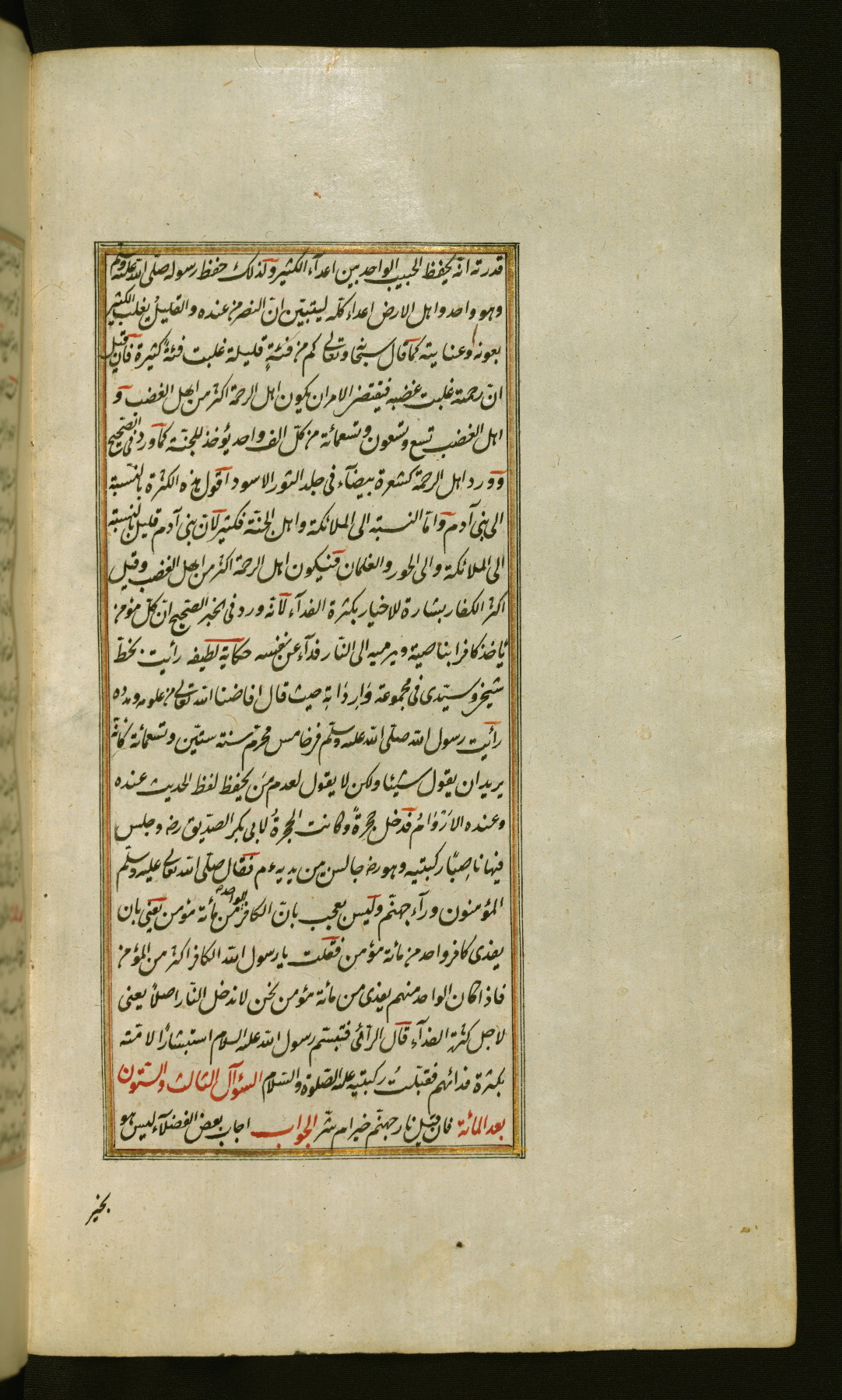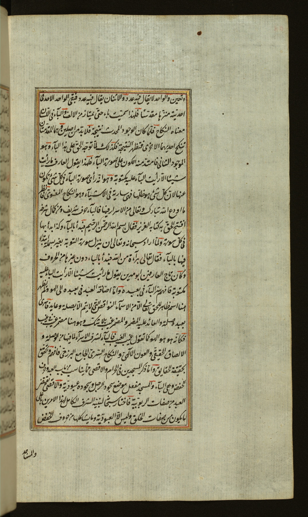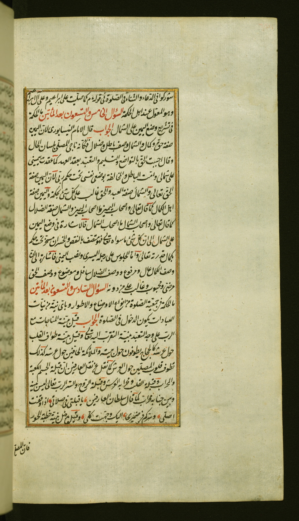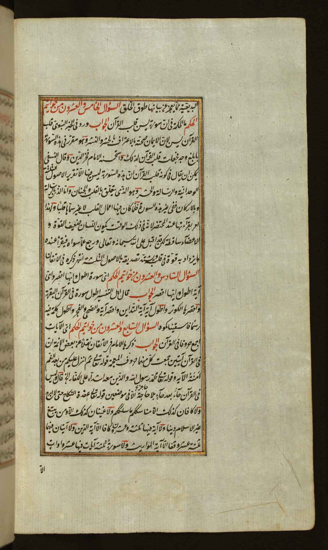 This work on Sufism in the form of questions entitled Khawātim al-ḥikam is by ʿAlī Dede al-Būsnawī (d. 1007 AH / 1598 CE). This particular Ottoman copy was written in nastaʿlīq script by Muṣṭafá ibn al-Ḥājj Muḥammad in 1081 AH / 1670 CE. The Arabic text begins with an illuminated headpiece (fol. 1b). The red leather binding with central lobed oval with arabesques on a gold ground is contemporary with the manuscript.