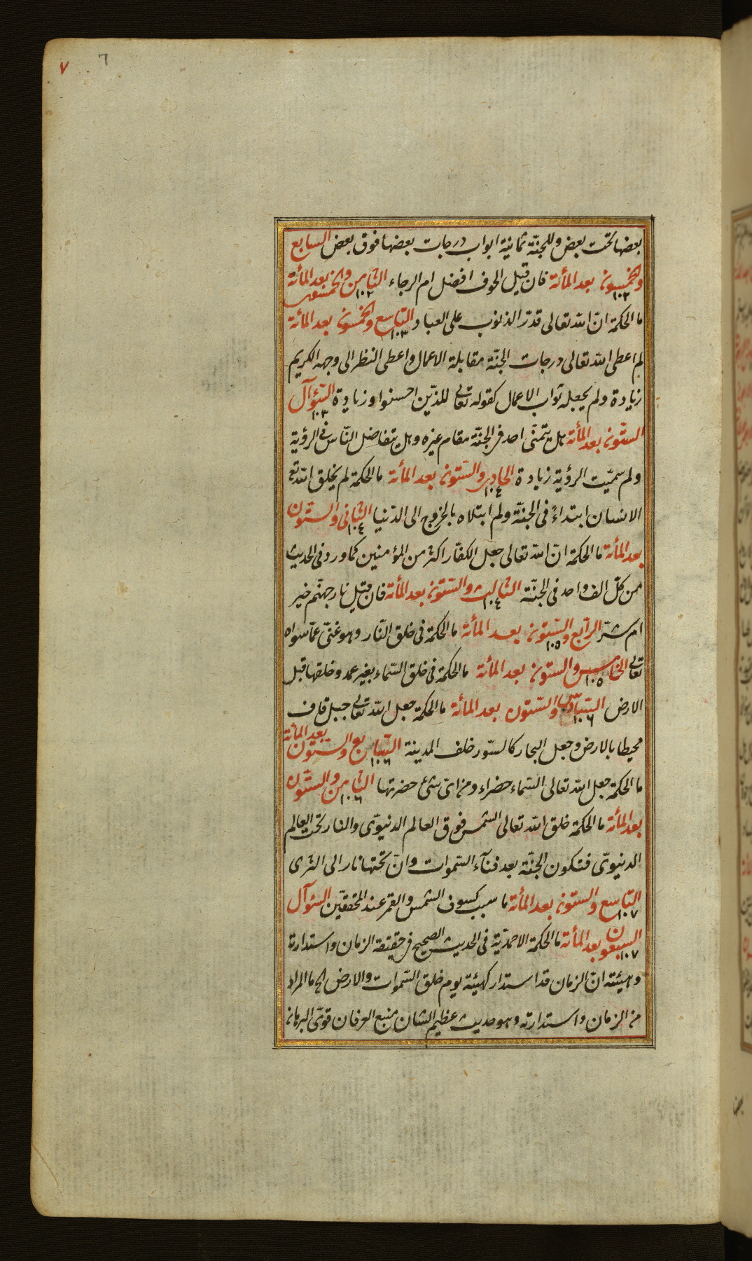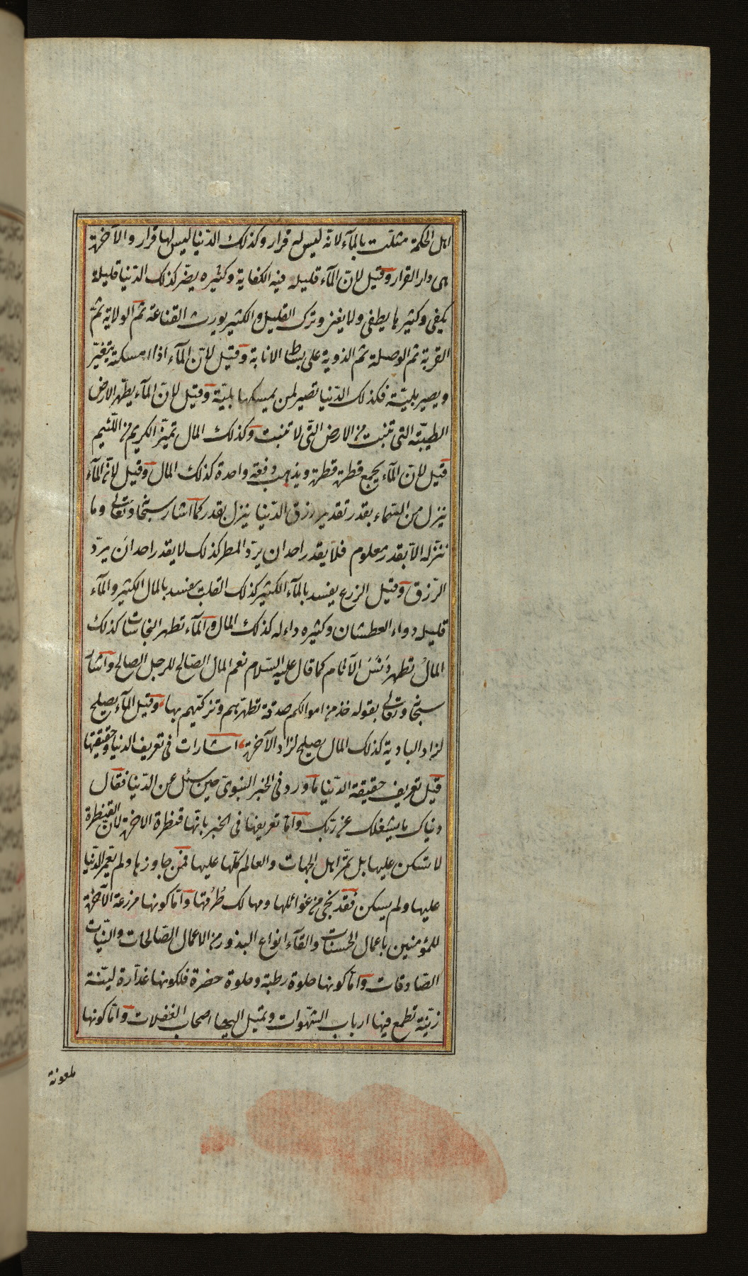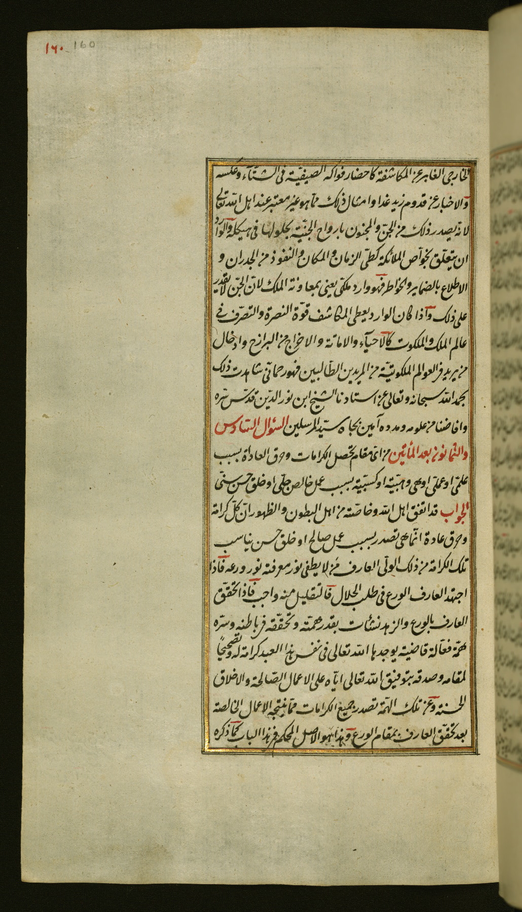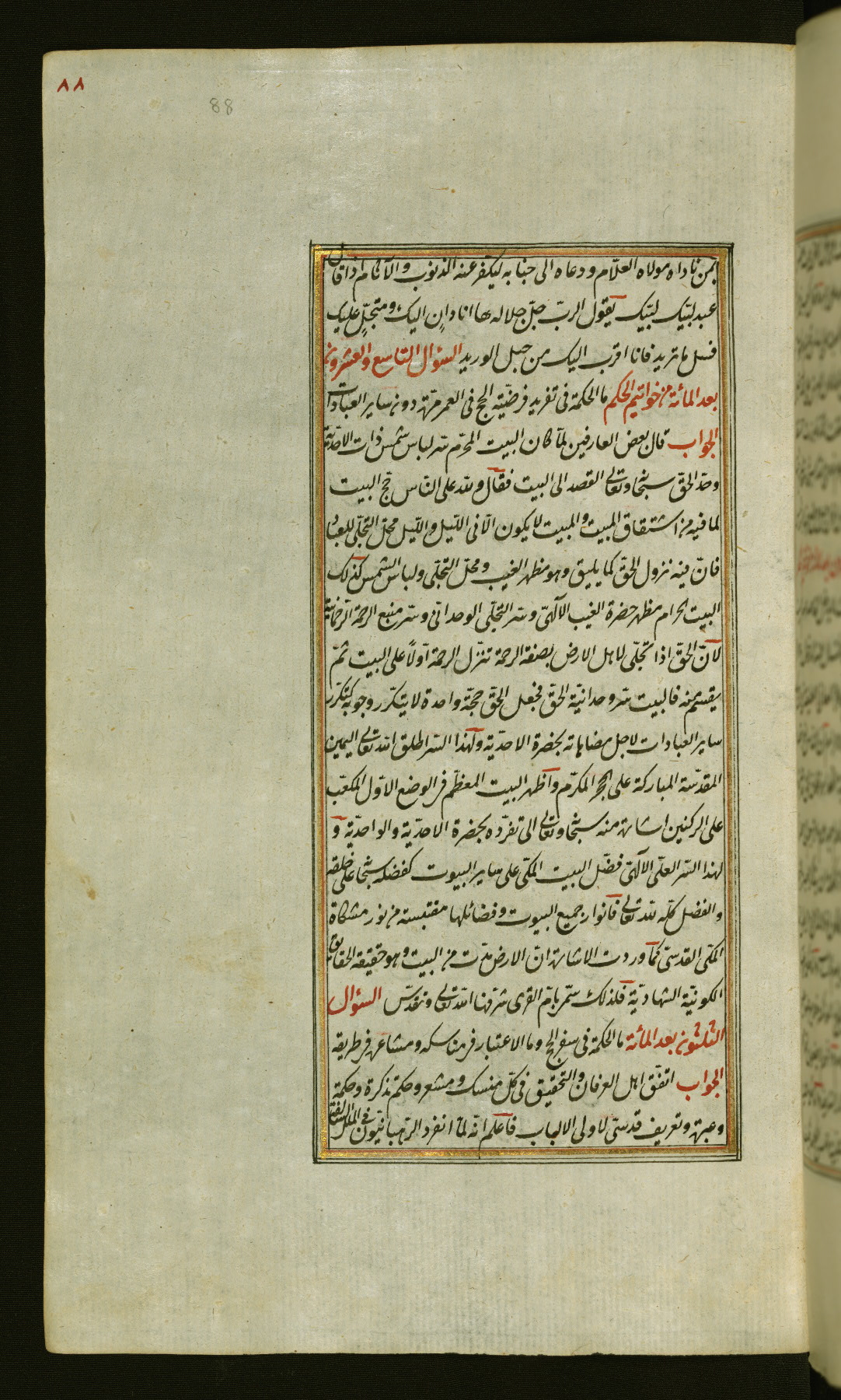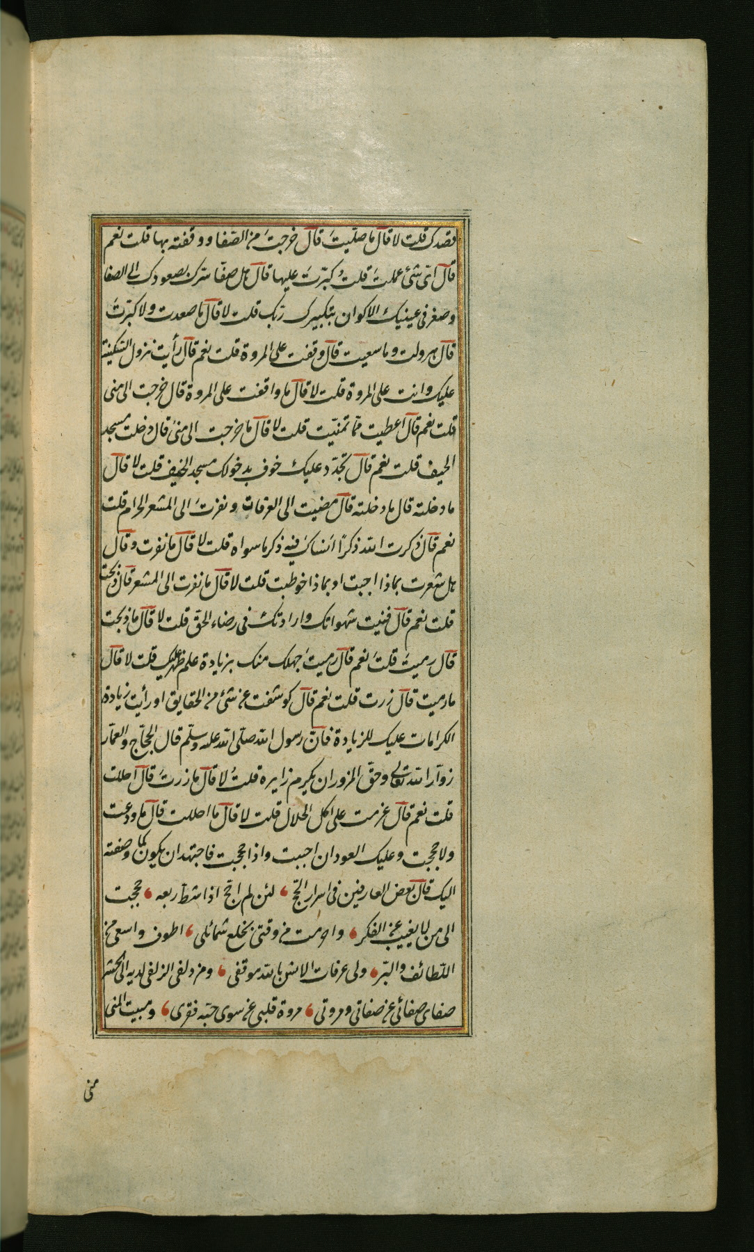 This work on Sufism in the form of questions entitled Khawātim al-ḥikam is by ʿAlī Dede al-Būsnawī (d. 1007 AH / 1598 CE). This particular Ottoman copy was written in nastaʿlīq script by Muṣṭafá ibn al-Ḥājj Muḥammad in 1081 AH / 1670 CE. The Arabic text begins with an illuminated headpiece (fol. 1b). The red leather binding with central lobed oval with arabesques on a gold ground is contemporary with the manuscript.