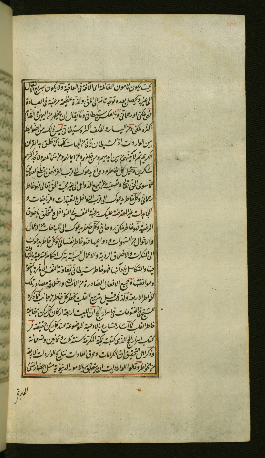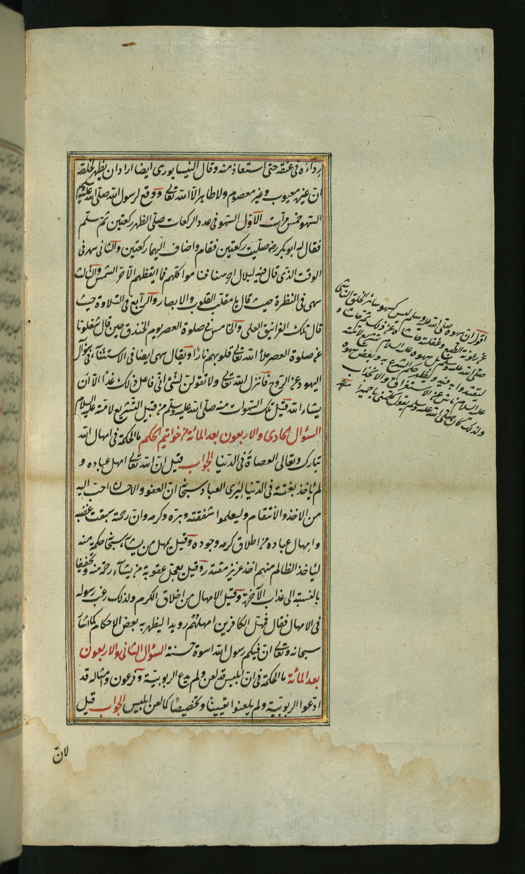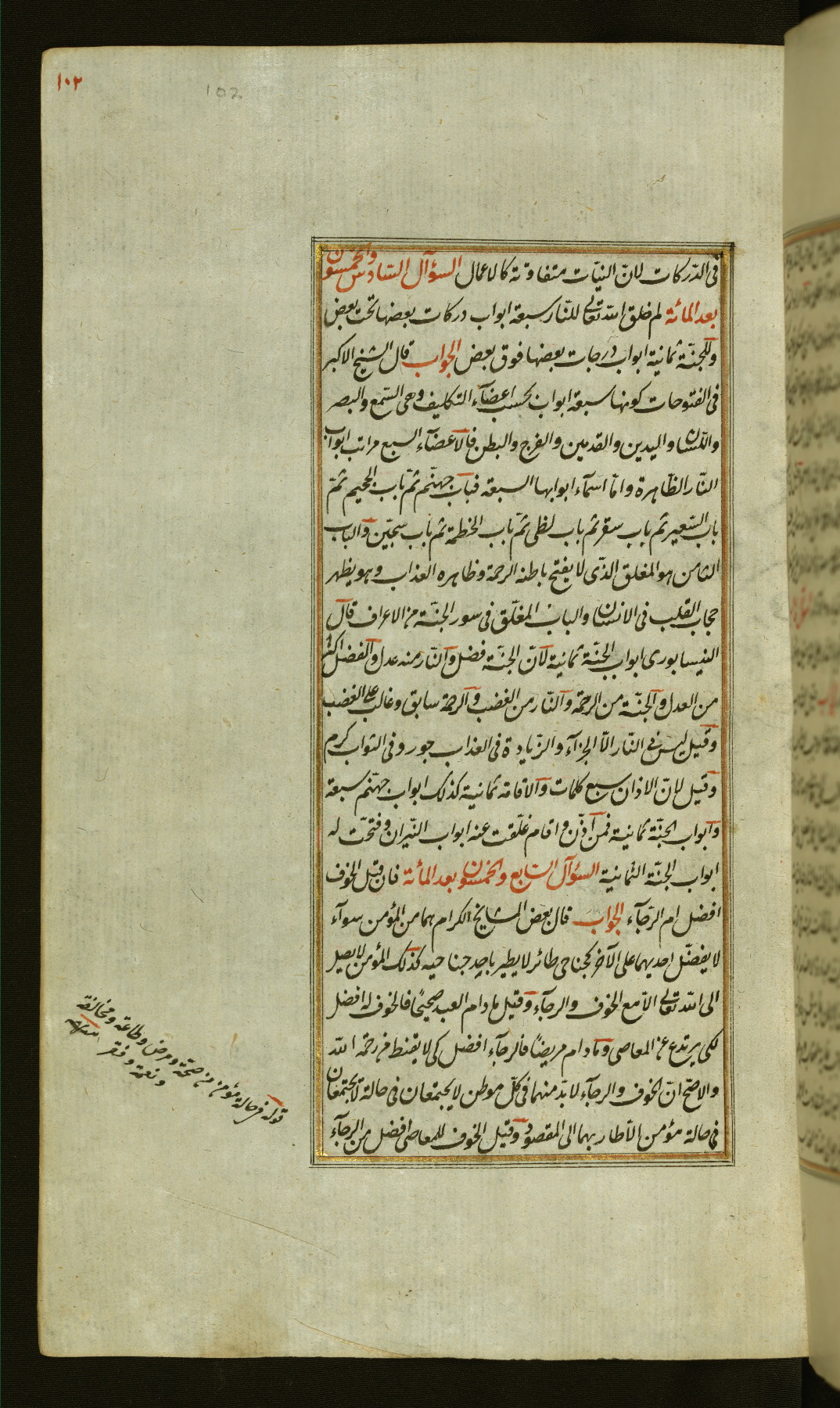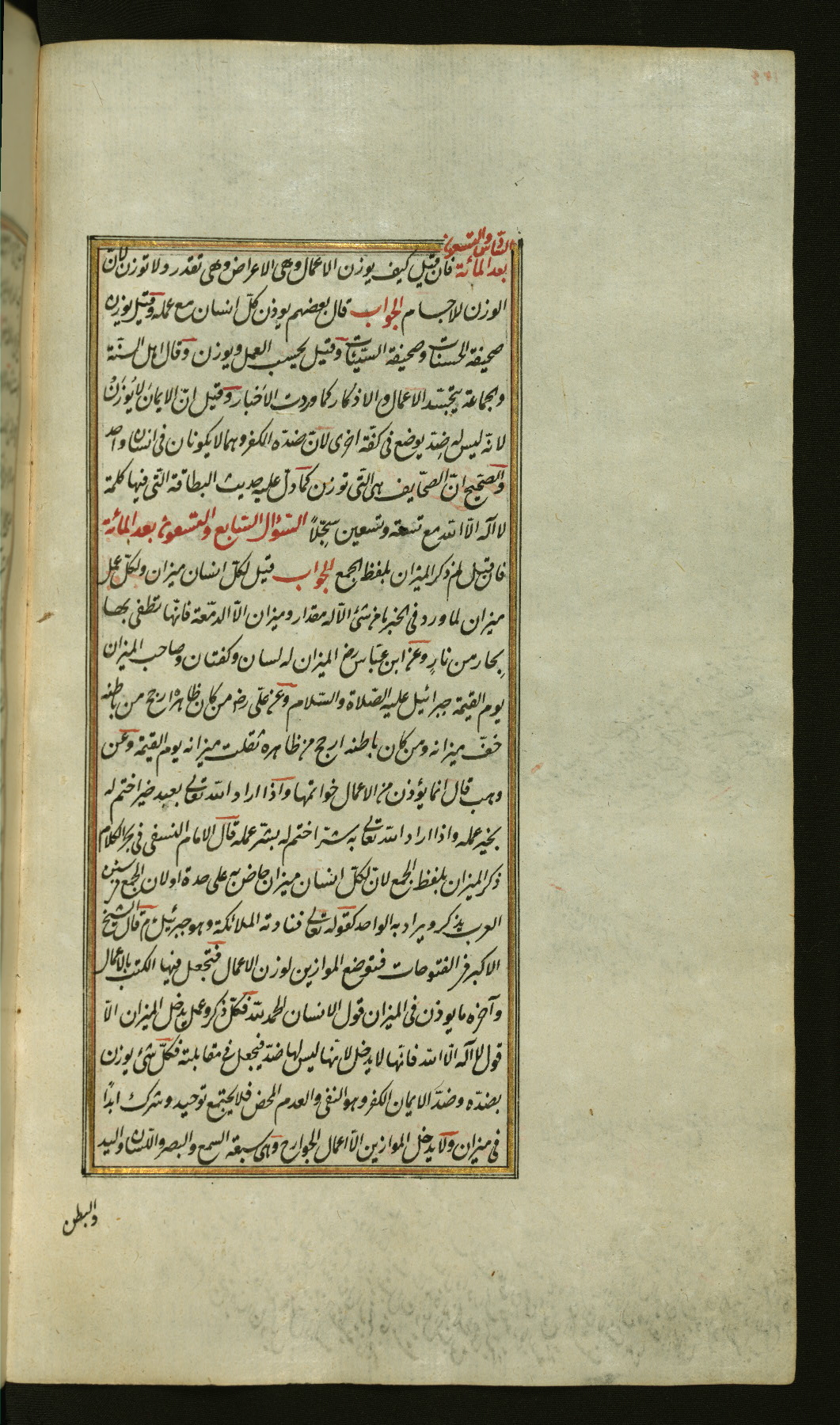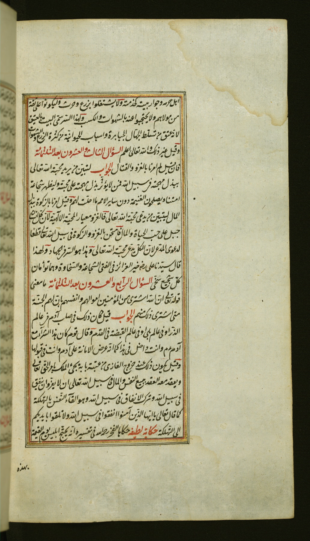 This work on Sufism in the form of questions entitled Khawātim al-ḥikam is by ʿAlī Dede al-Būsnawī (d. 1007 AH / 1598 CE). This particular Ottoman copy was written in nastaʿlīq script by Muṣṭafá ibn al-Ḥājj Muḥammad in 1081 AH / 1670 CE. The Arabic text begins with an illuminated headpiece (fol. 1b). The red leather binding with central lobed oval with arabesques on a gold ground is contemporary with the manuscript.