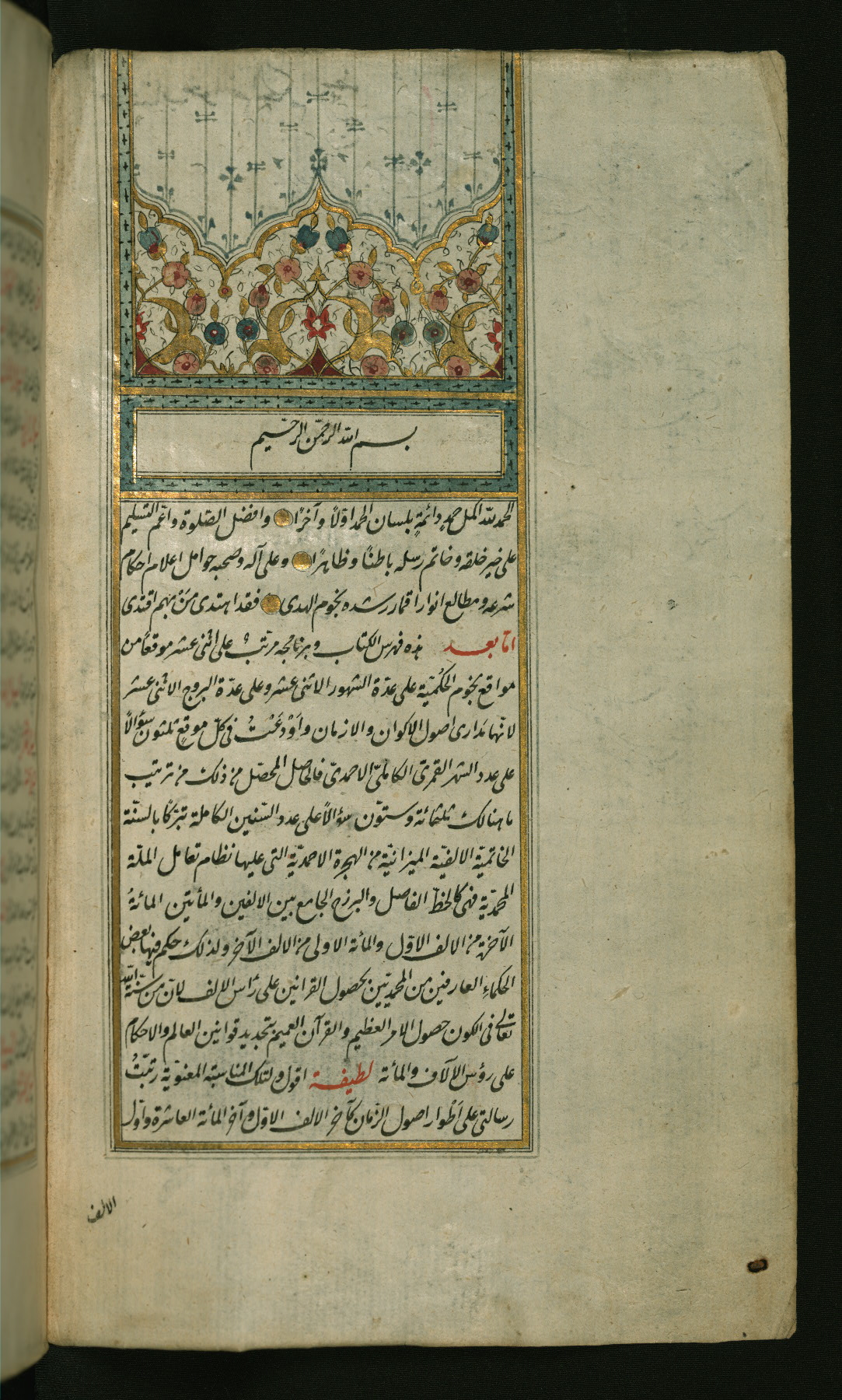 This work on Sufism in the form of questions entitled Khawātim al-ḥikam is by ʿAlī Dede al-Būsnawī (d. 1007 AH / 1598 CE). This particular Ottoman copy was written in nastaʿlīq script by Muṣṭafá ibn al-Ḥājj Muḥammad in 1081 AH / 1670 CE. The Arabic text begins with an illuminated headpiece (fol. 1b). The red leather binding with central lobed oval with arabesques on a gold ground is contemporary with the manuscript.