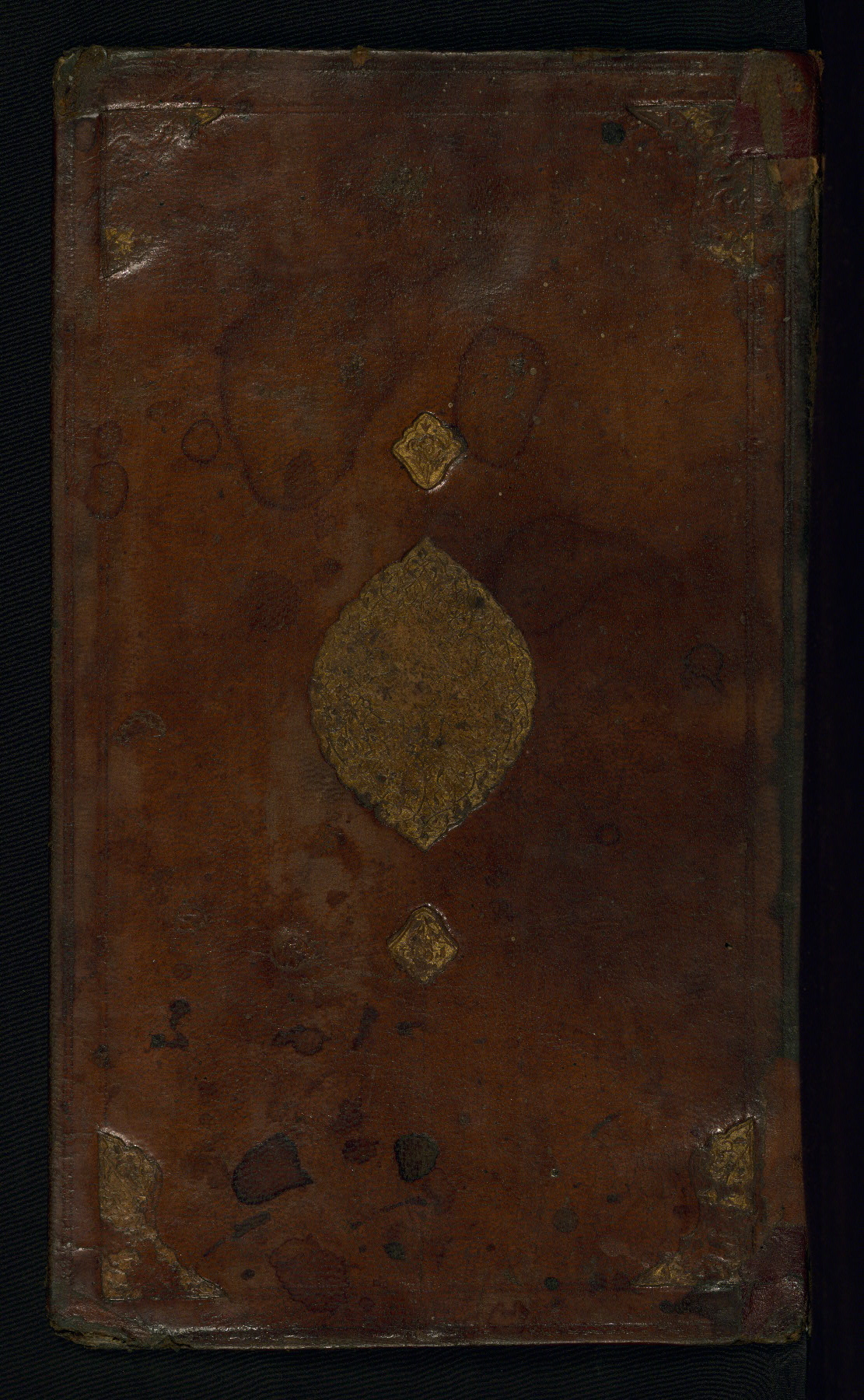 - Label: This light brown goatskin binding with flap is contemporary with the manuscript and is decorated with gold-tooled oval central medallion, pendants, and cornerpieces.