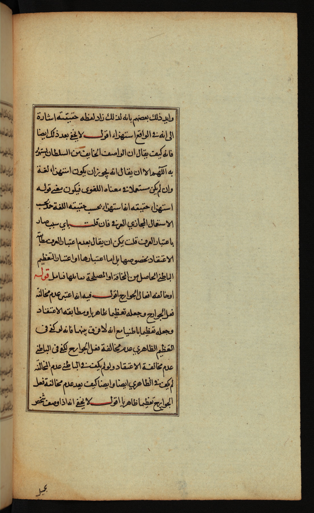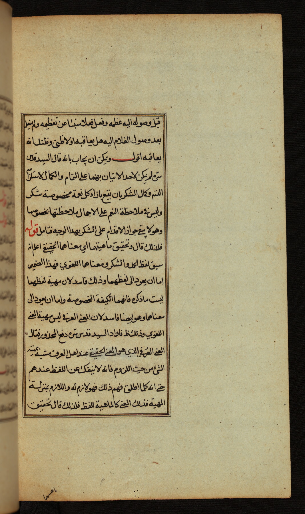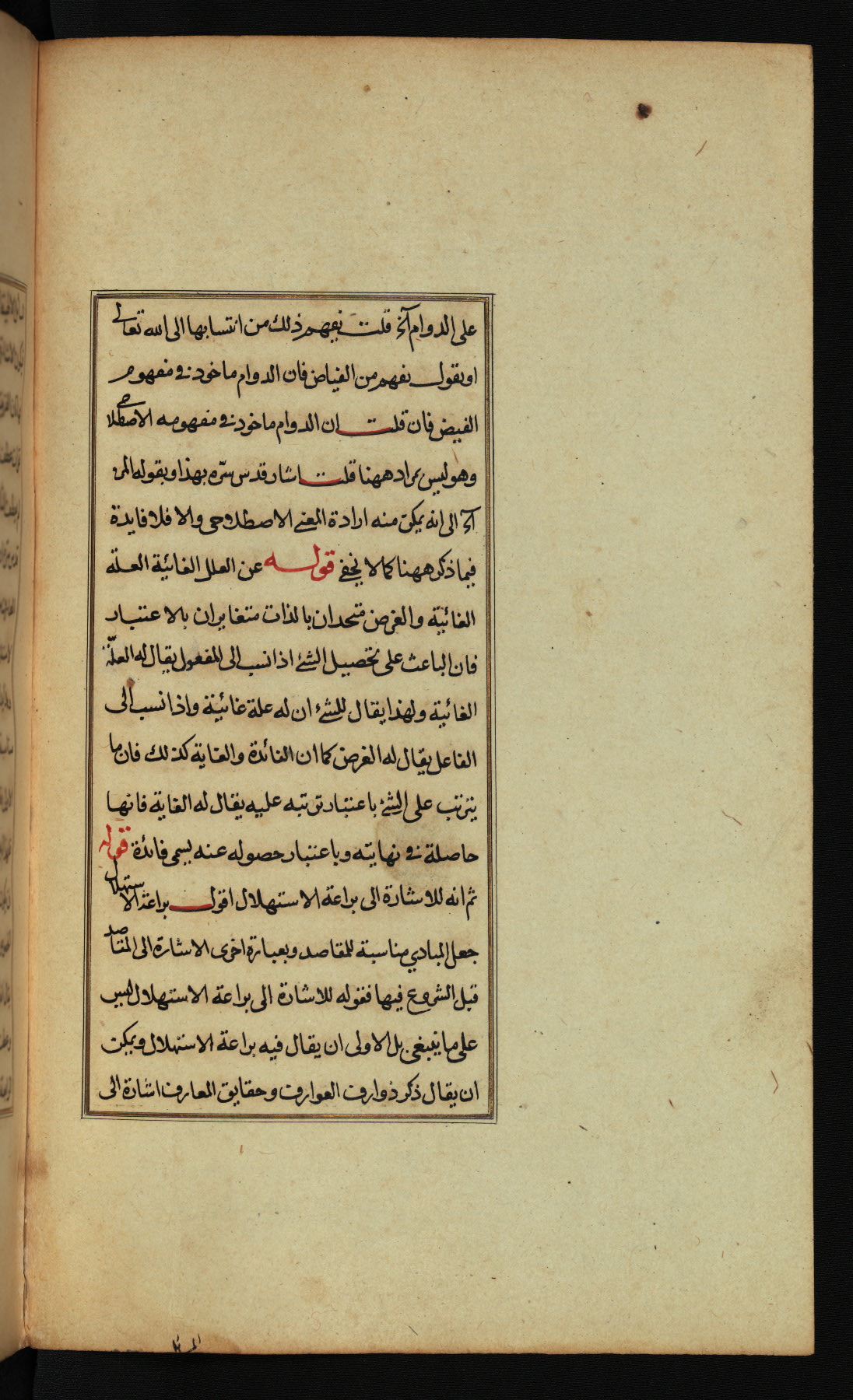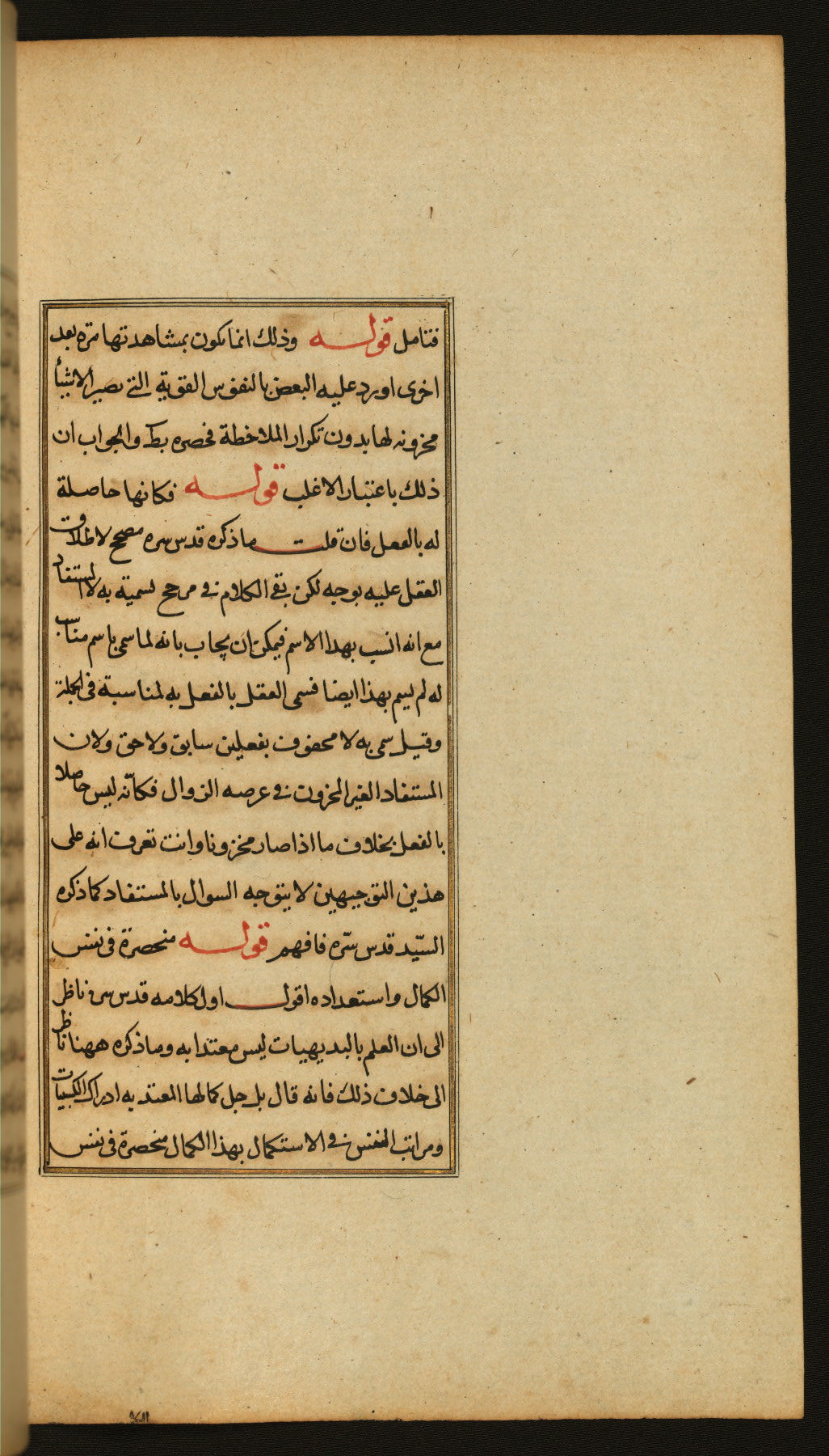 The present work is a supergloss on the gloss (ḥāshiyah) by al-Sayyid al-Sharīf al-Jurjānī (d. 816 AH / 1413 CE) on the Lawāmiʿ al-asrār by Qutb al-Dīn al-Taḥtānī al-Rāzī (d. 766 AH / 1364 CE), being in turn a commentary on a book of logic entitled Maṭāliʿ al-anwār by Sirāj al-Dīn Maḥmūd al-Urmawī (d. 682 AH / 1283 CE). Written for the library of the Ottoman Sultan Selim I, it was completed in Bursa in 918 AH / 1512 CE, the year of that ruler's accession to the throne. The text, which opens with an illuminated headpiece (fol. 1b), is written in naskh script mostly in black ink with certain words, such as qawluhu and aqūlu, in red. It is possible that the scribe is also the author of this work. The brown goatskin binding with central lobed oval and pendants with arabesque designs is contemporary with the manuscript.