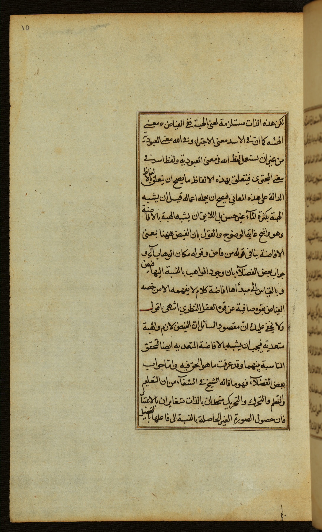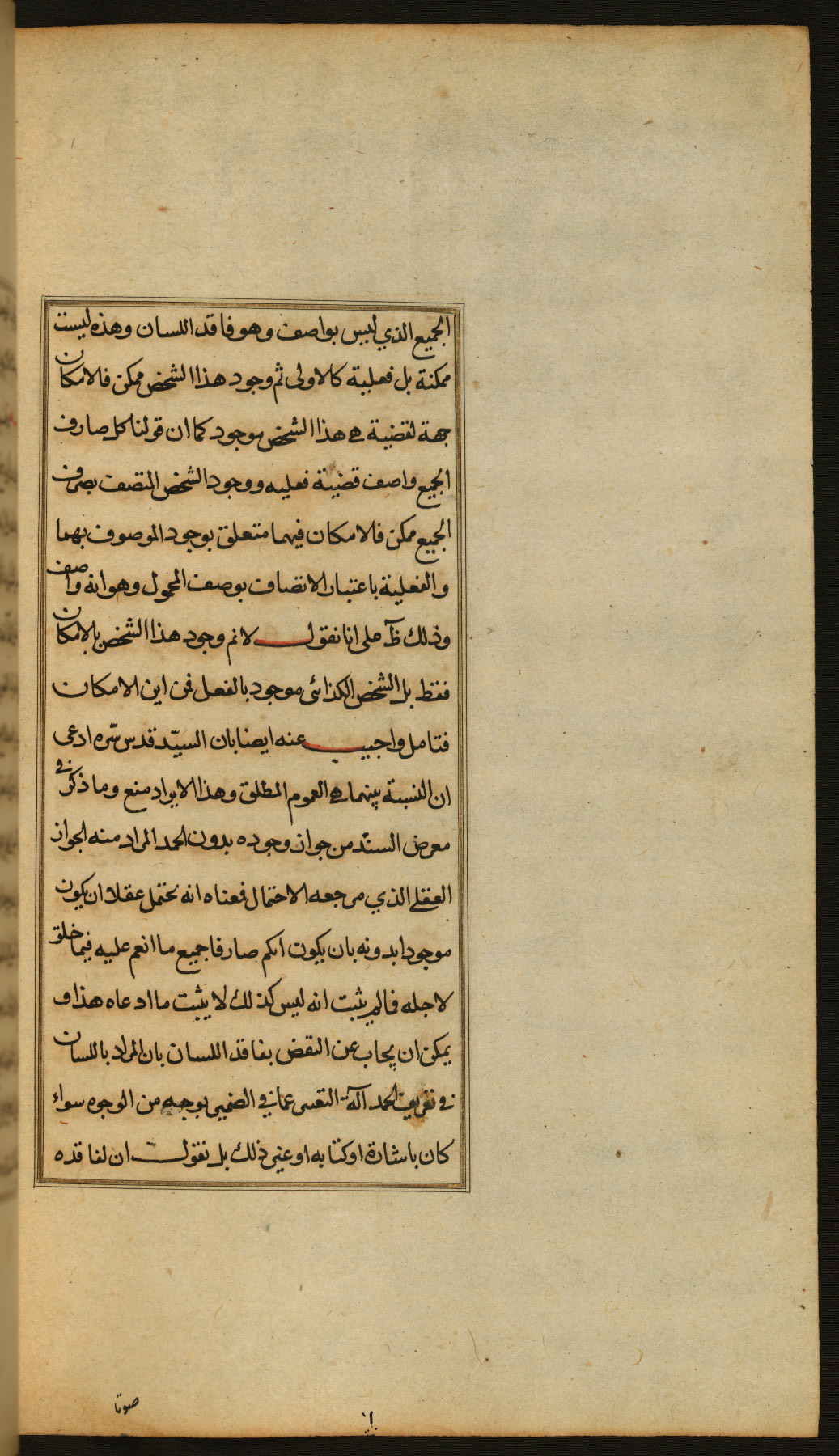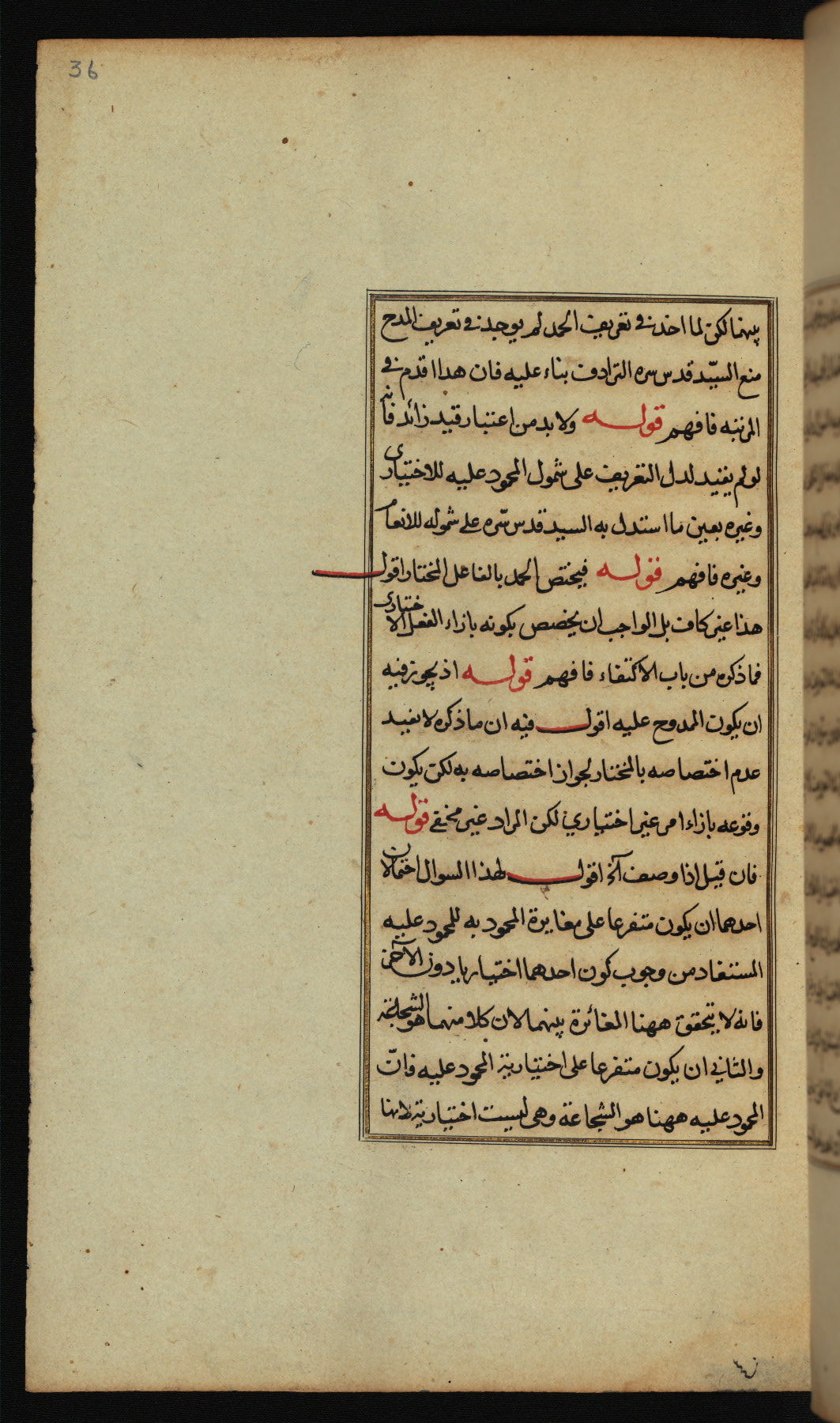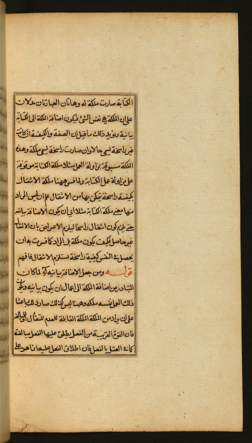 The present work is a supergloss on the gloss (ḥāshiyah) by al-Sayyid al-Sharīf al-Jurjānī (d. 816 AH / 1413 CE) on the Lawāmiʿ al-asrār by Qutb al-Dīn al-Taḥtānī al-Rāzī (d. 766 AH / 1364 CE), being in turn a commentary on a book of logic entitled Maṭāliʿ al-anwār by Sirāj al-Dīn Maḥmūd al-Urmawī (d. 682 AH / 1283 CE). Written for the library of the Ottoman Sultan Selim I, it was completed in Bursa in 918 AH / 1512 CE, the year of that ruler's accession to the throne. The text, which opens with an illuminated headpiece (fol. 1b), is written in naskh script mostly in black ink with certain words, such as qawluhu and aqūlu, in red. It is possible that the scribe is also the author of this work. The brown goatskin binding with central lobed oval and pendants with arabesque designs is contemporary with the manuscript.