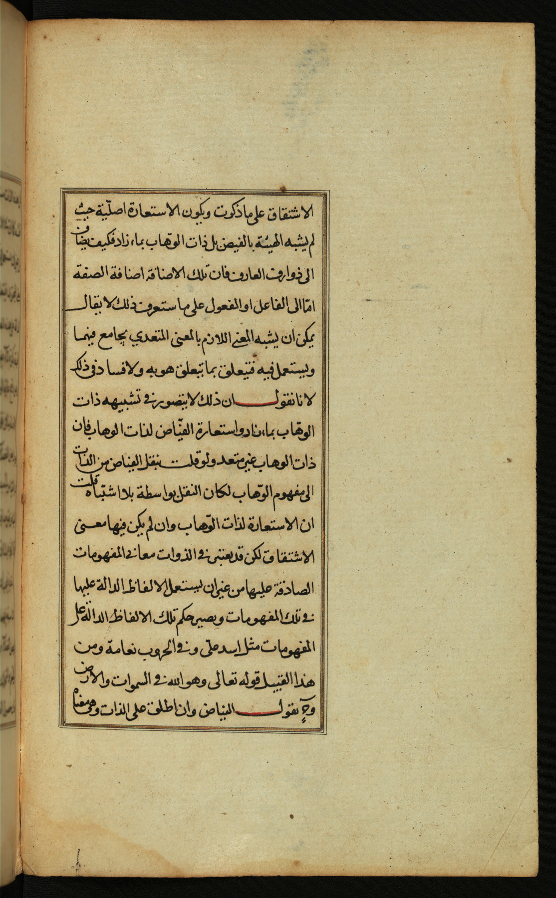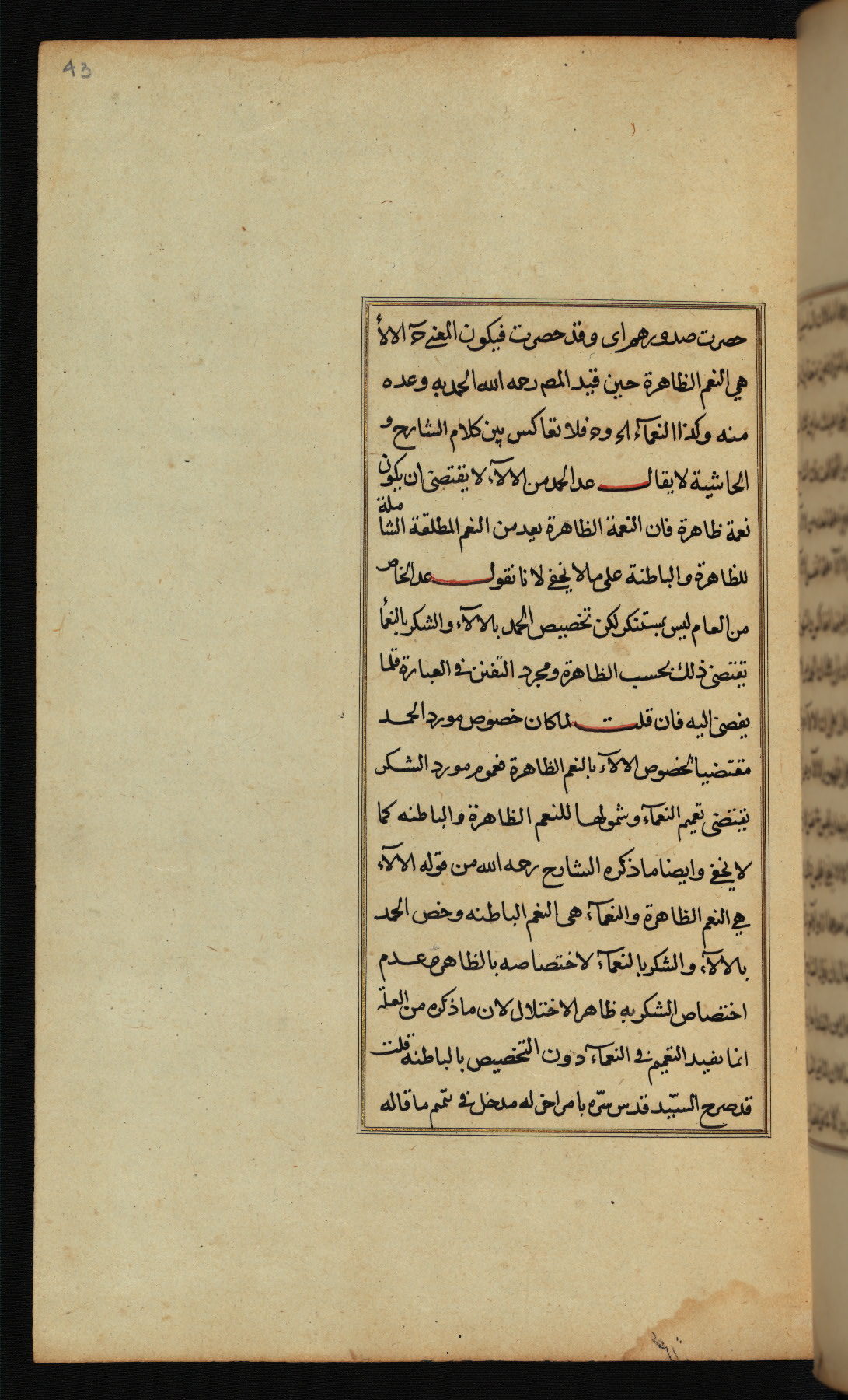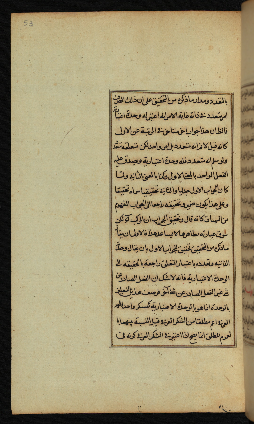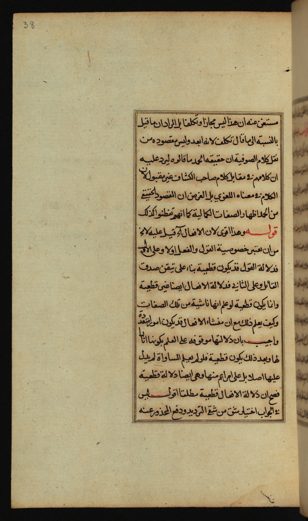 The present work is a supergloss on the gloss (ḥāshiyah) by al-Sayyid al-Sharīf al-Jurjānī (d. 816 AH / 1413 CE) on the Lawāmiʿ al-asrār by Qutb al-Dīn al-Taḥtānī al-Rāzī (d. 766 AH / 1364 CE), being in turn a commentary on a book of logic entitled Maṭāliʿ al-anwār by Sirāj al-Dīn Maḥmūd al-Urmawī (d. 682 AH / 1283 CE). Written for the library of the Ottoman Sultan Selim I, it was completed in Bursa in 918 AH / 1512 CE, the year of that ruler's accession to the throne. The text, which opens with an illuminated headpiece (fol. 1b), is written in naskh script mostly in black ink with certain words, such as qawluhu and aqūlu, in red. It is possible that the scribe is also the author of this work. The brown goatskin binding with central lobed oval and pendants with arabesque designs is contemporary with the manuscript.