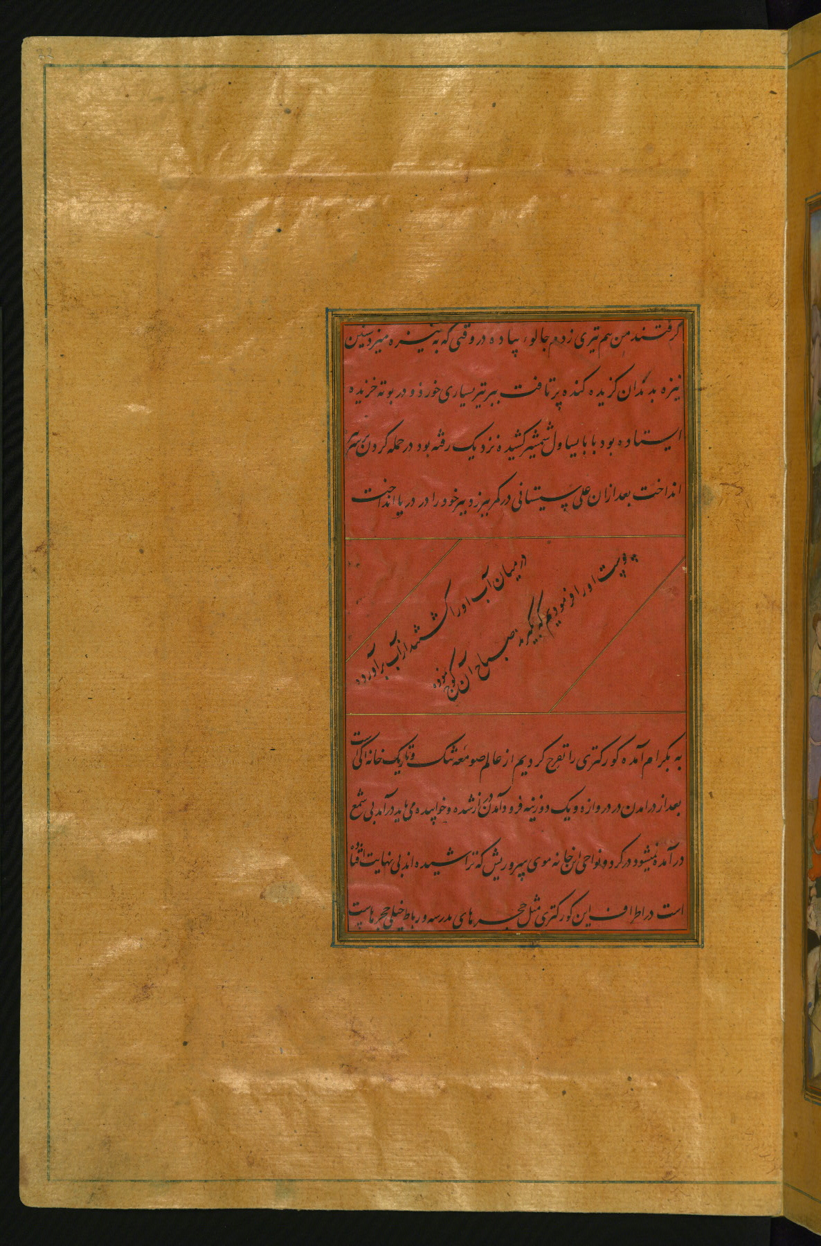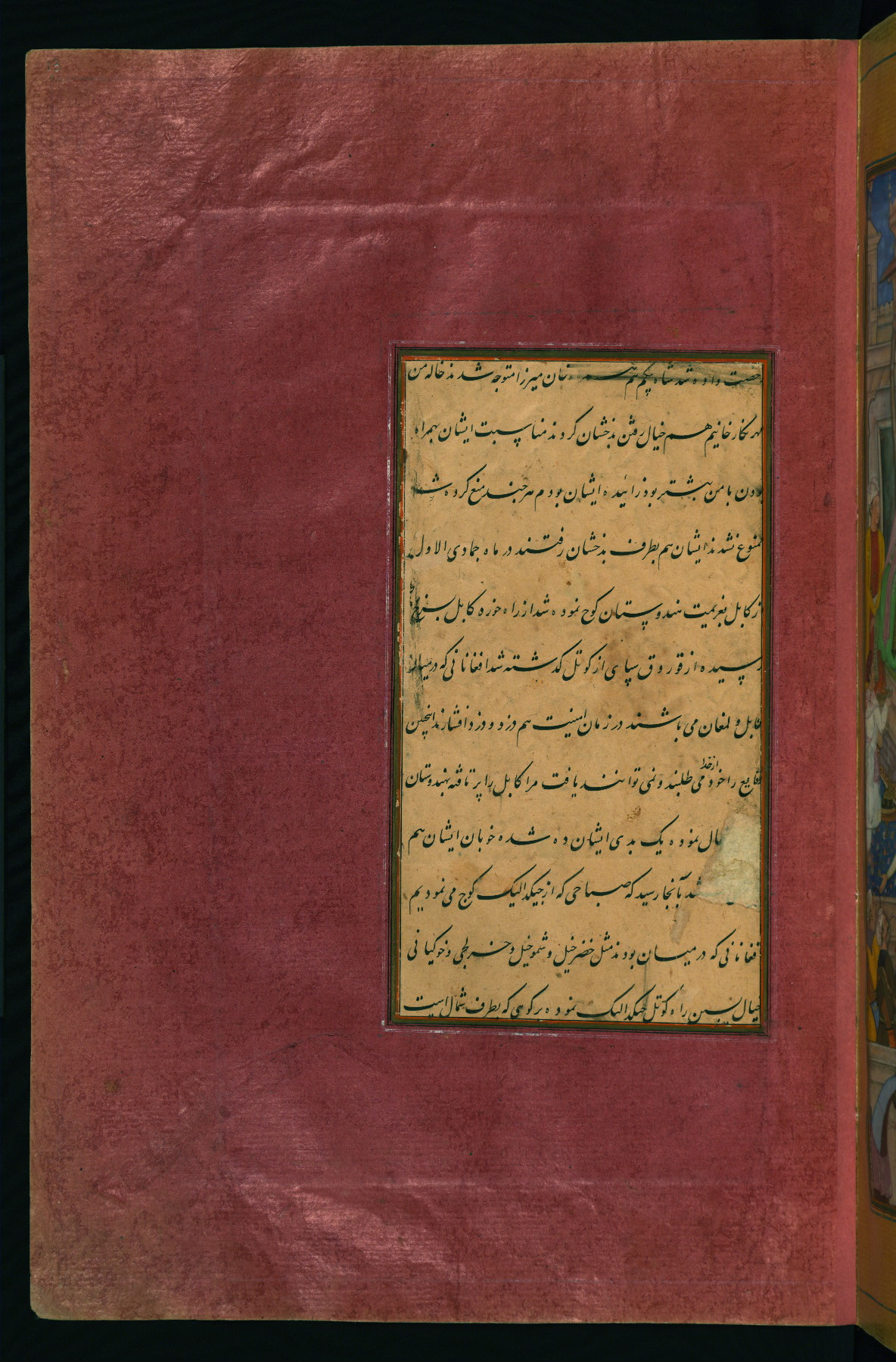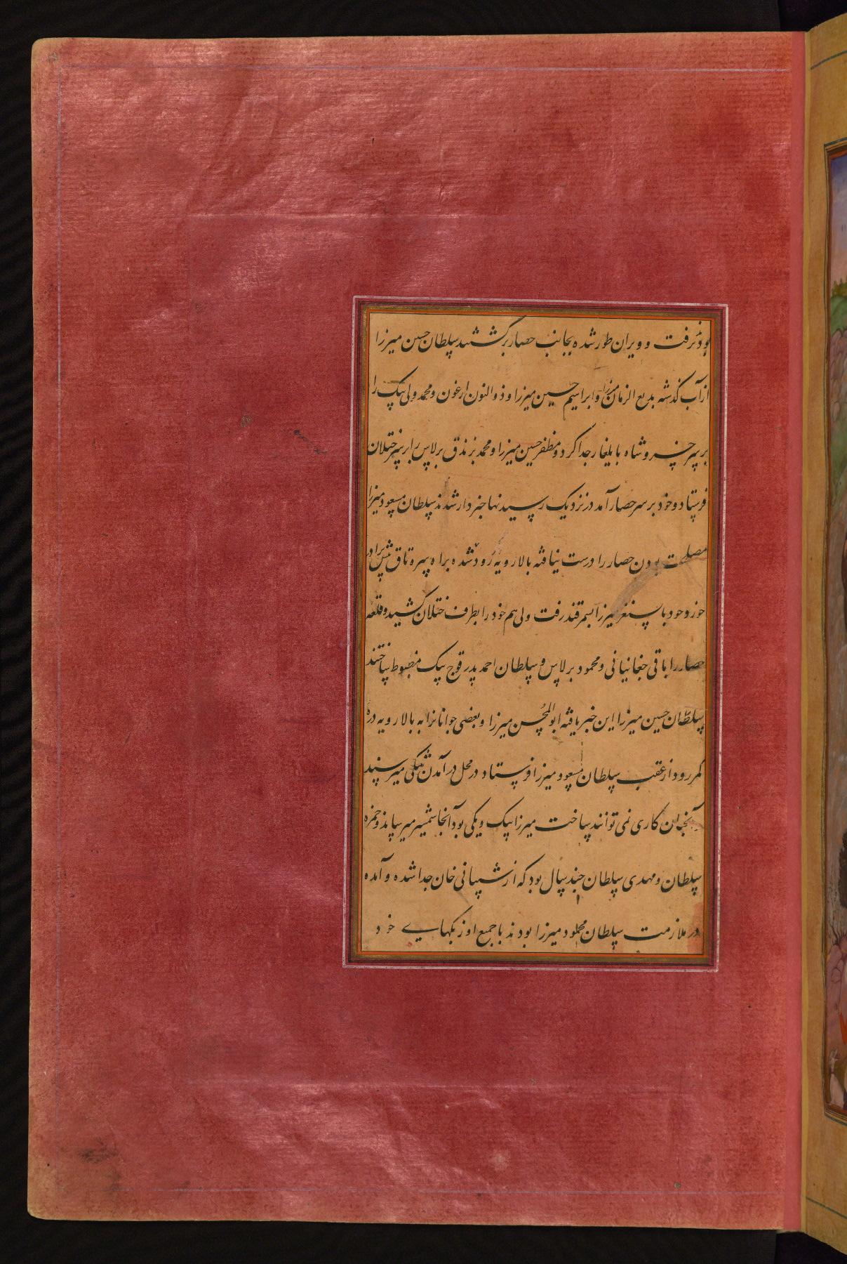 Recognized as one of the world’s great autobiographical memoirs, the Bāburnāmah is the story of Ẓahīr al-Dīn Muḥammad Bābur (866 AH / 1483 CE -- 937 AH / 1530 CE), who conquered northern India and established the Mughal Empire (or Timurid-Mughal empire). Born in Fergana (Central Asia), Babur was a patrilineal Timurid and matrilineal Chingizid. Babur wrote his memoir in Chaghatay Turkish, which he referred to as Turkic, and it was later translated into Persian and repeatedly copied and illustrated under his Mughal successors. The present copy in Persian, written in nastaʿlīq script, is a fragment of a dispersed manuscript that was executed in the late tenth century AH / sixteenth CE. The ordering of the folios as found here does not follow the narrative of the text. The Walters' fragment contains thirty mostly full-page paintings that are representative of the Mughal court style under the Mughal Emperor Akbar (r. 963 AH / 1556 CE -- 1014 AH / 1605 CE). Another major fragment of this work containing fifty-seven folios is in the State Museum of Eastern Cultures, Moscow. The dark green leather binding, which is not original to the manuscript, dates to the late thirteenth century AH / nineteenth CE or early fourteenth century AH / twentieth CE.