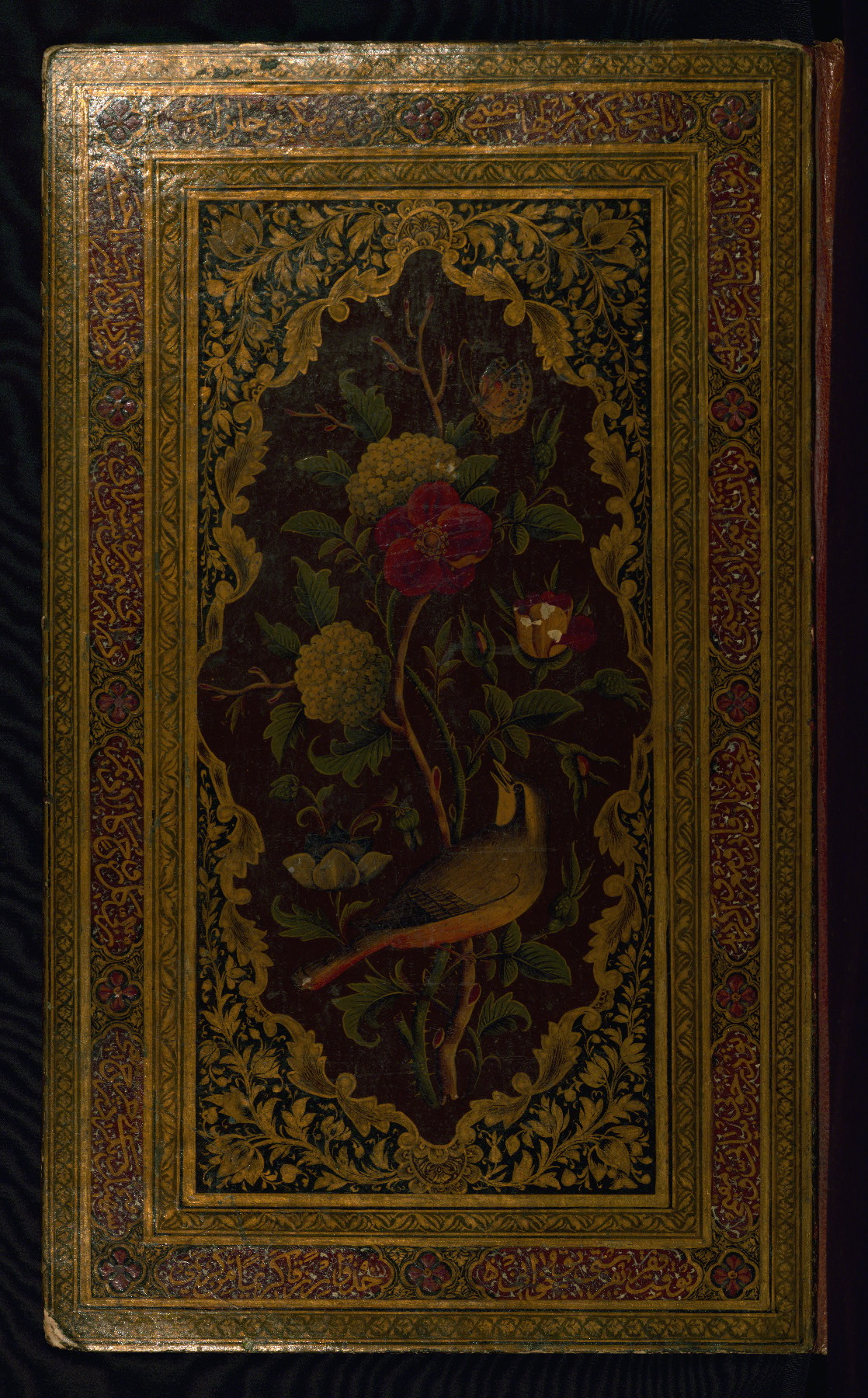 - Label: This lacquer binding, decorated with floral motifs, a bird, and inscriptions around the outer frame, dates to the thirteenth century AH / nineteenth CE.